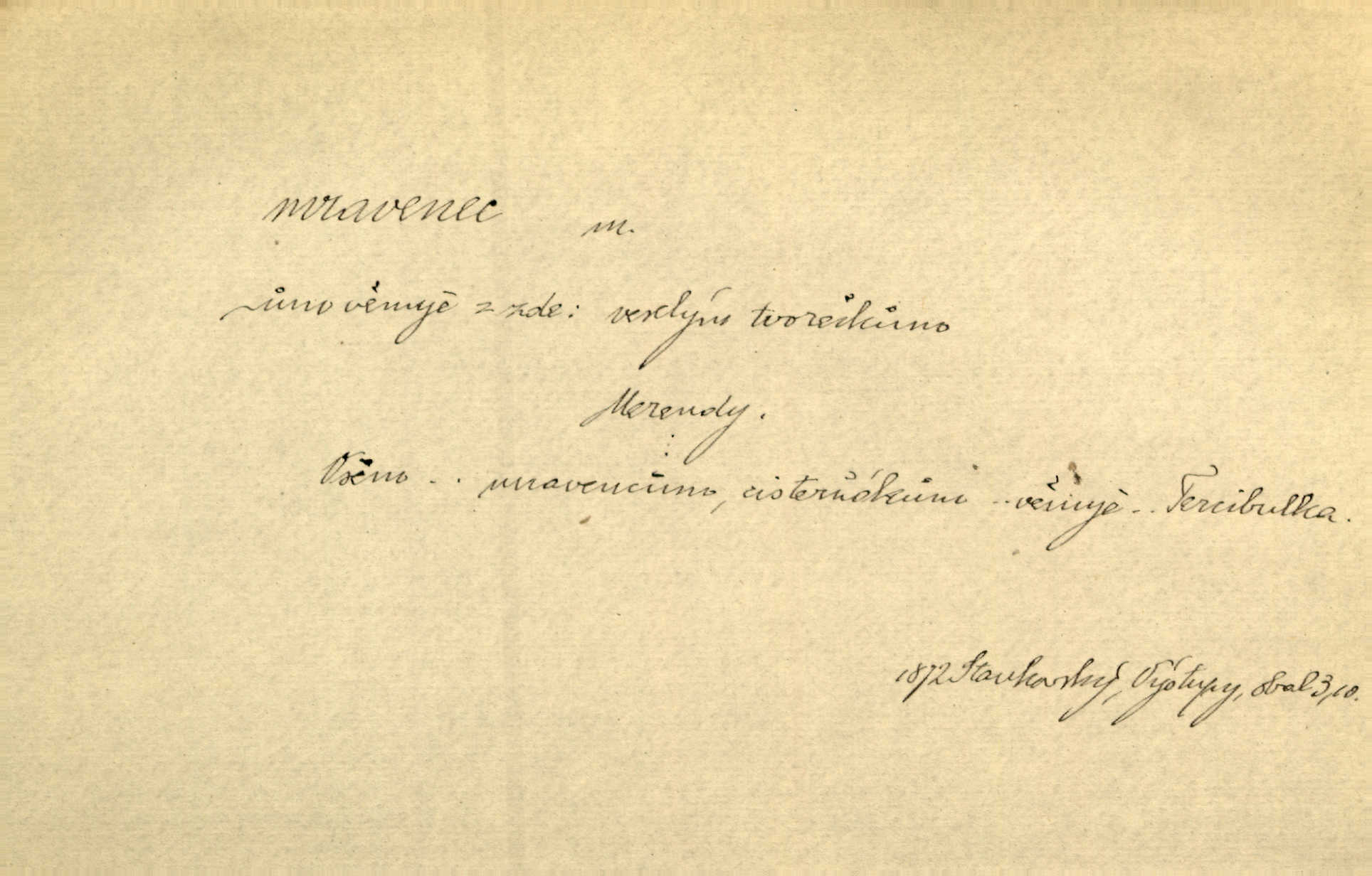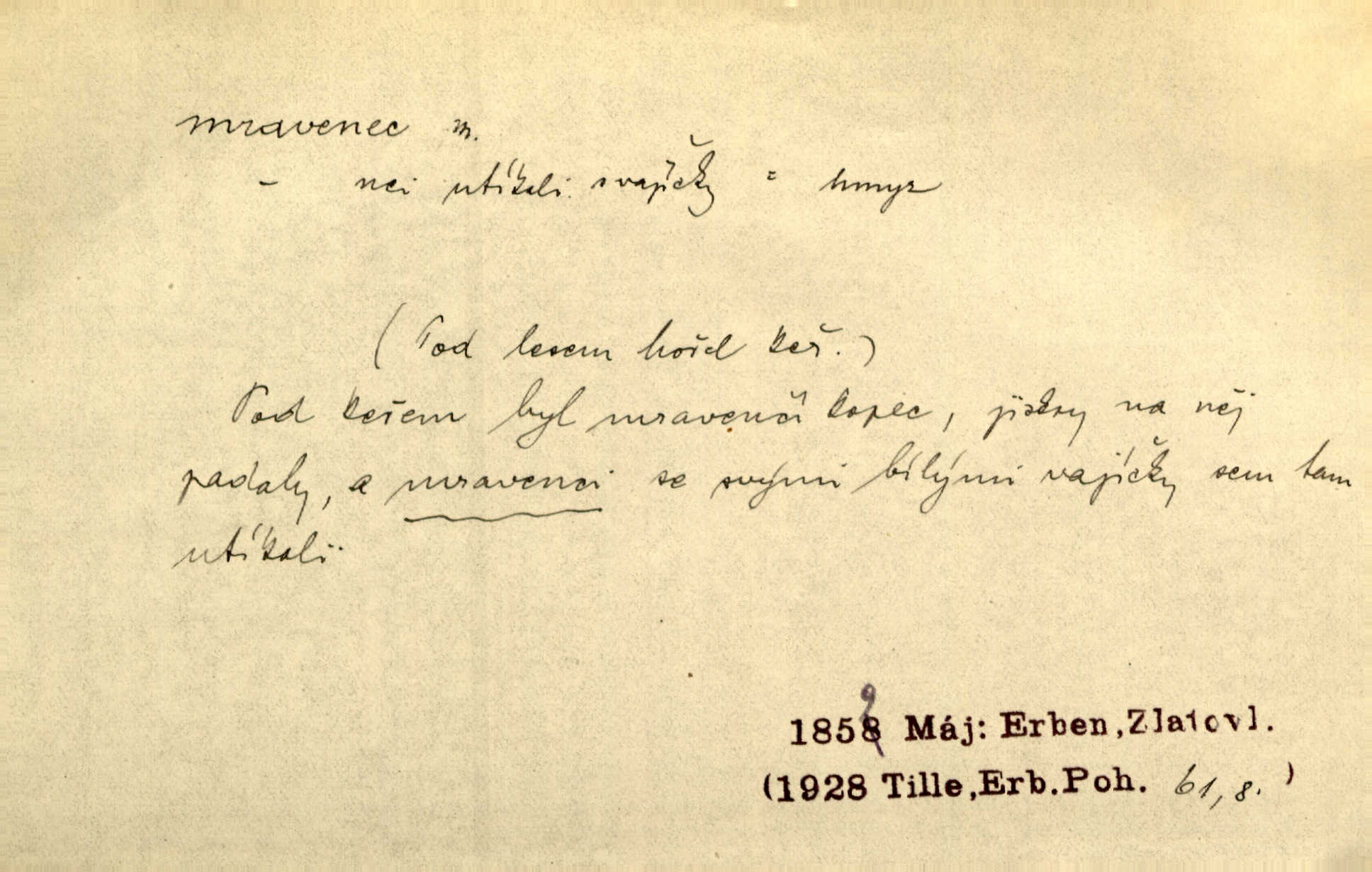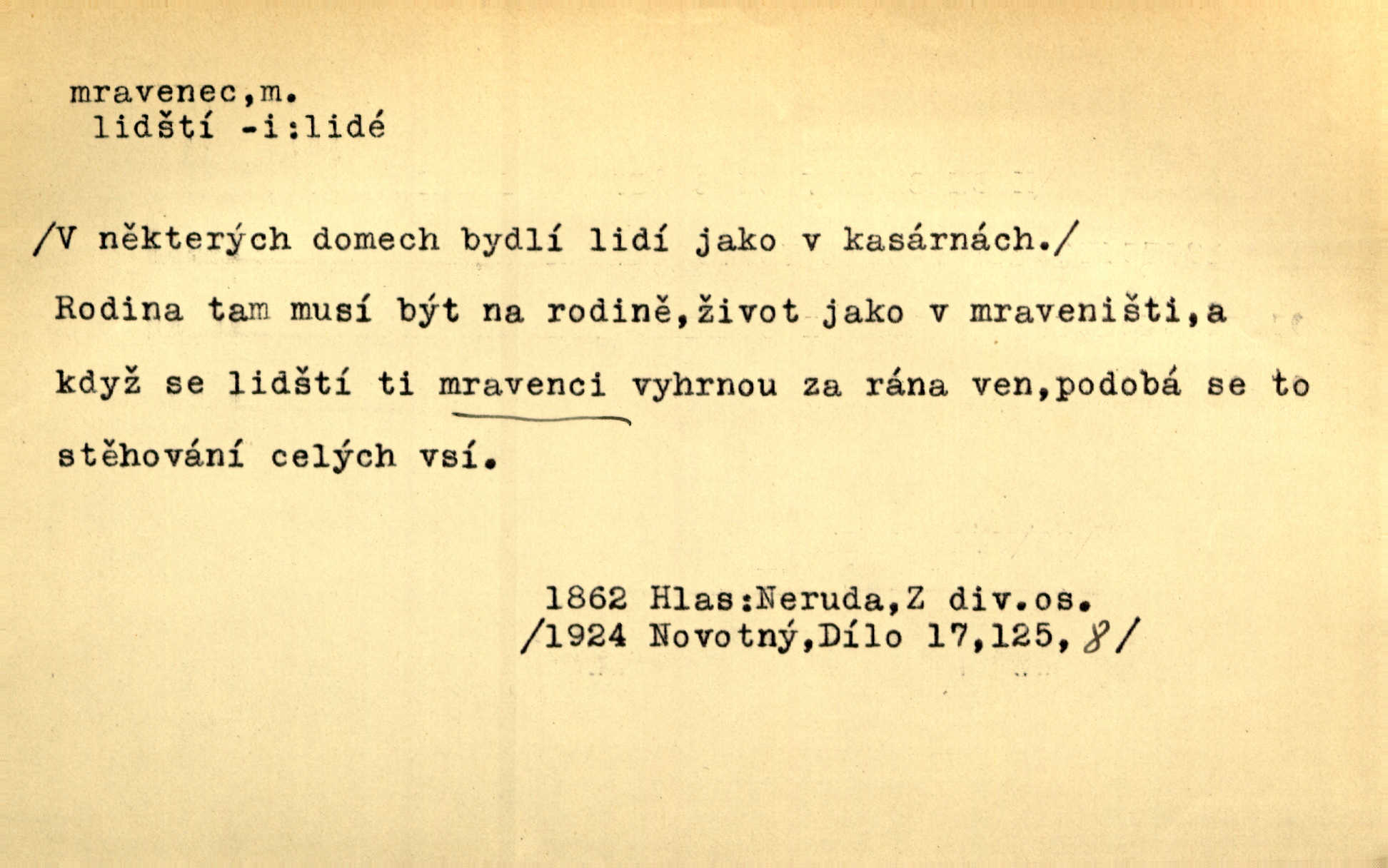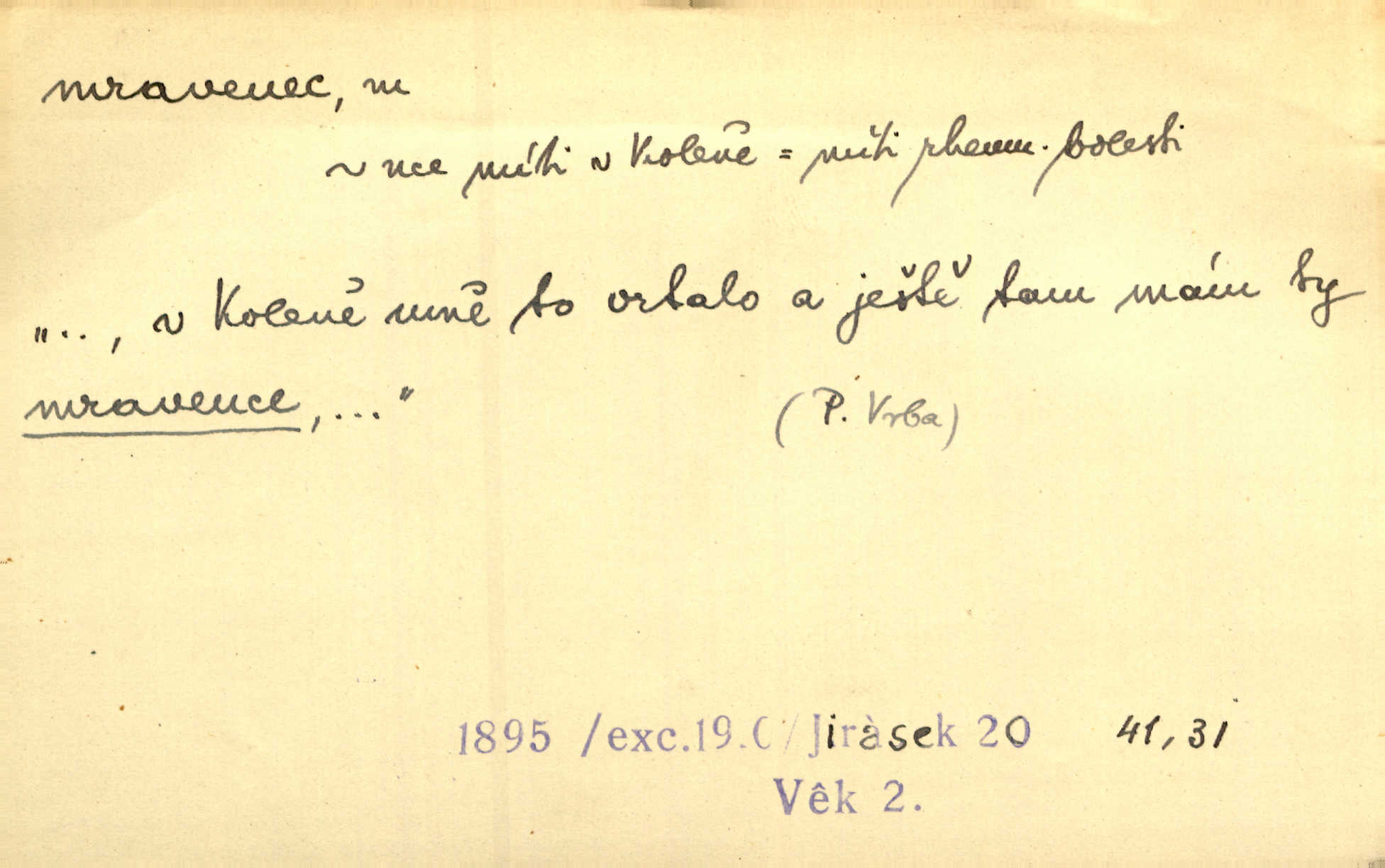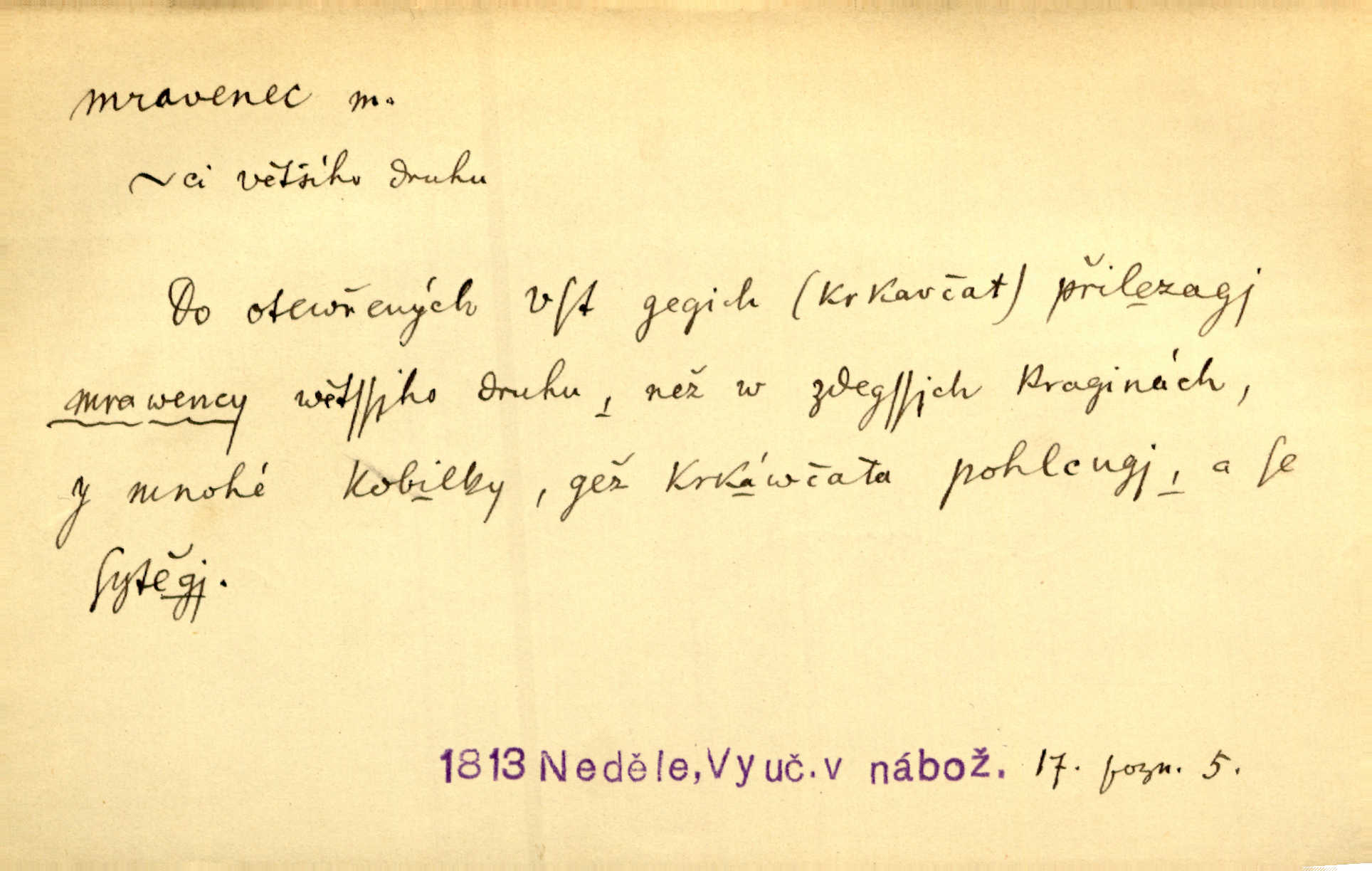 - mravenec, -nce m. drobný blanokřídlý hmyz hromadně žijící. Zool. mravenci Formicidae. Mravenci se svými bílými vajíčky sem tam utíkali. Erb. Nesmírný ruch panoval jak mezi mravenci po celém ležení. Zey. Už není [nadporučík] tak červený jako mravenec. Jir. Hemžili se [lidé] mezi koly na bělidle jako mravenci. Rais. D o někom malém, nepatrném, bezvýznamném. Řím velký jest a to ví každý z nás [židů]‚ my [jsme] mravenci. Vrch. D Přen. o brnivém n. mrazivém pocitu. V nohách mu [pantátovi] zase projížděli mravenci. Rais. Hochovi mravenci pobíhali po zádech, když slyšel, kterak ženky napadnou člověka samotného v lese. Sez. V koleně mně to vrtalo a ještě tam mám ty mravence. Jir.