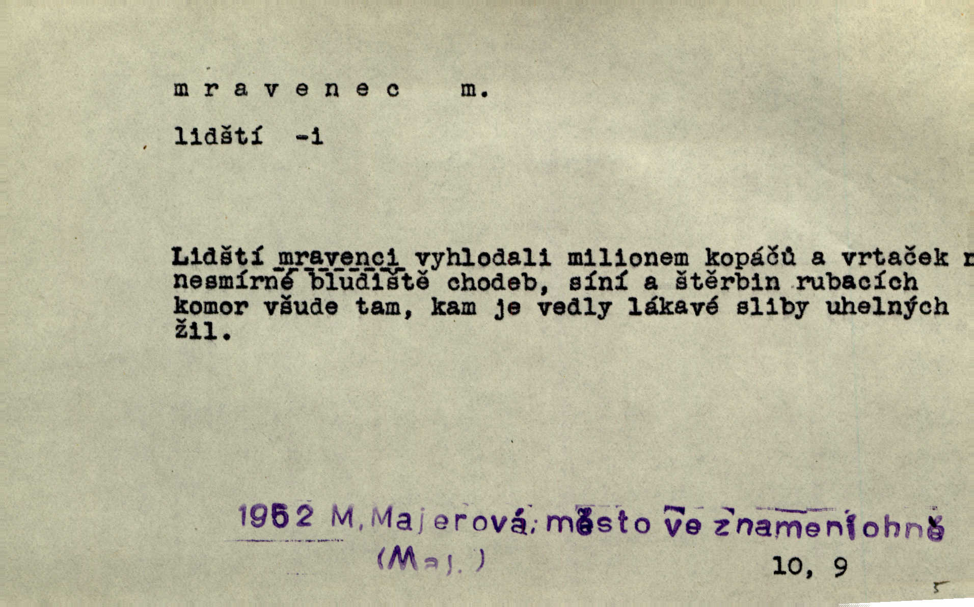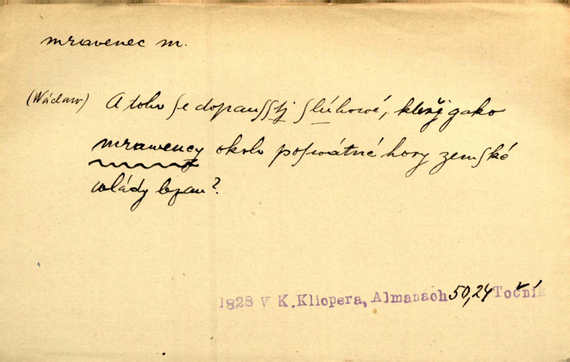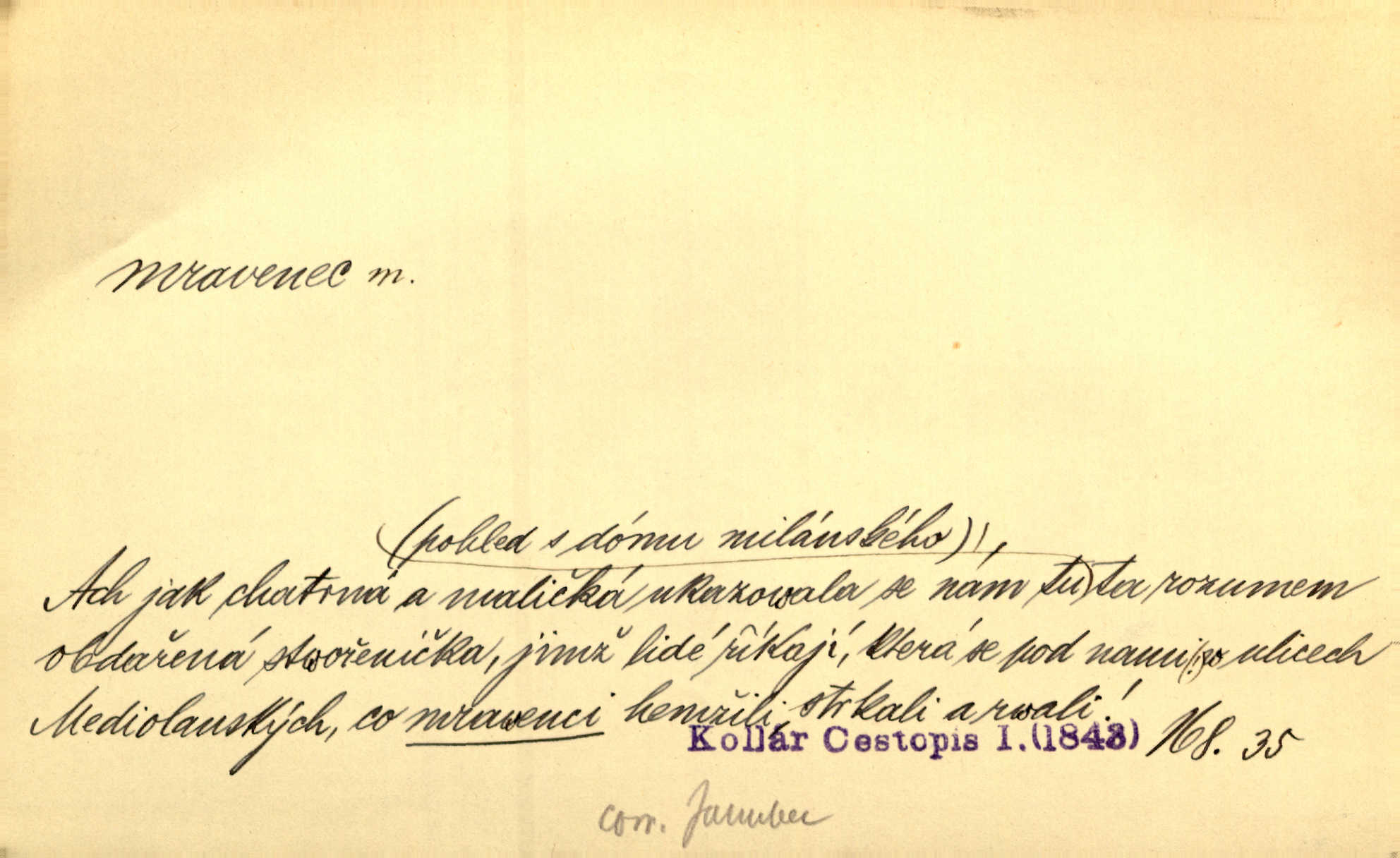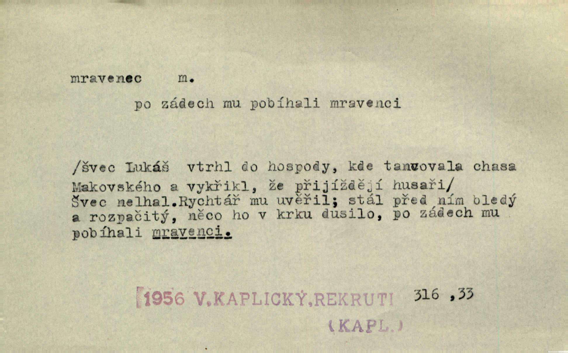 - mravenec, -nce m. drobný blanokřídlý hmyz hromadně žijící. Zool. mravenci Formicidae. Mravenci se svými bílými vajíčky sem tam utíkali. Erb. Nesmírný ruch panoval jak mezi mravenci po celém ležení. Zey. Už není [nadporučík] tak červený jako mravenec. Jir. Hemžili se [lidé] mezi koly na bělidle jako mravenci. Rais. D o někom malém, nepatrném, bezvýznamném. Řím velký jest a to ví každý z nás [židů]‚ my [jsme] mravenci. Vrch. D Přen. o brnivém n. mrazivém pocitu. V nohách mu [pantátovi] zase projížděli mravenci. Rais. Hochovi mravenci pobíhali po zádech, když slyšel, kterak ženky napadnou člověka samotného v lese. Sez. V koleně mně to vrtalo a ještě tam mám ty mravence. Jir.