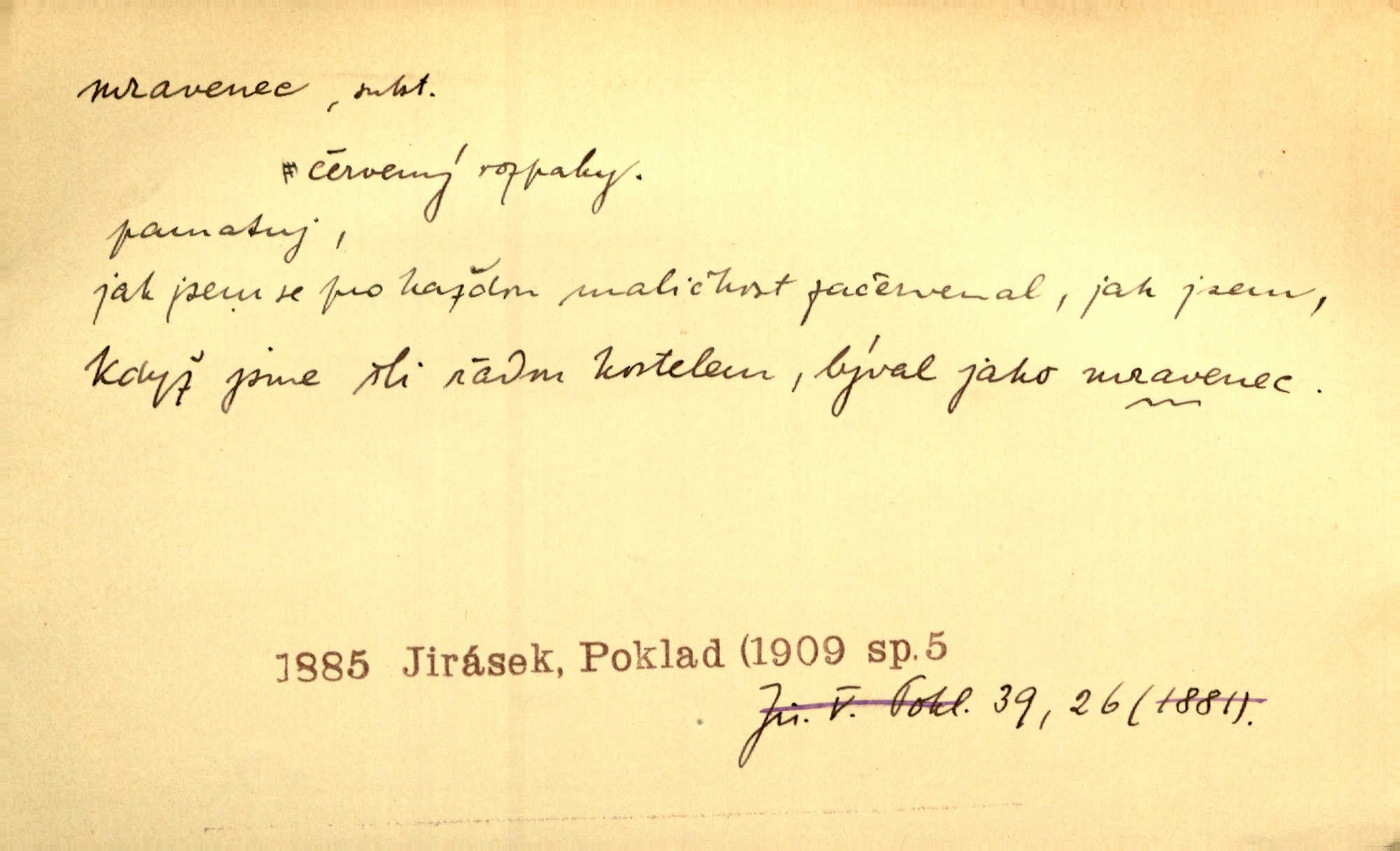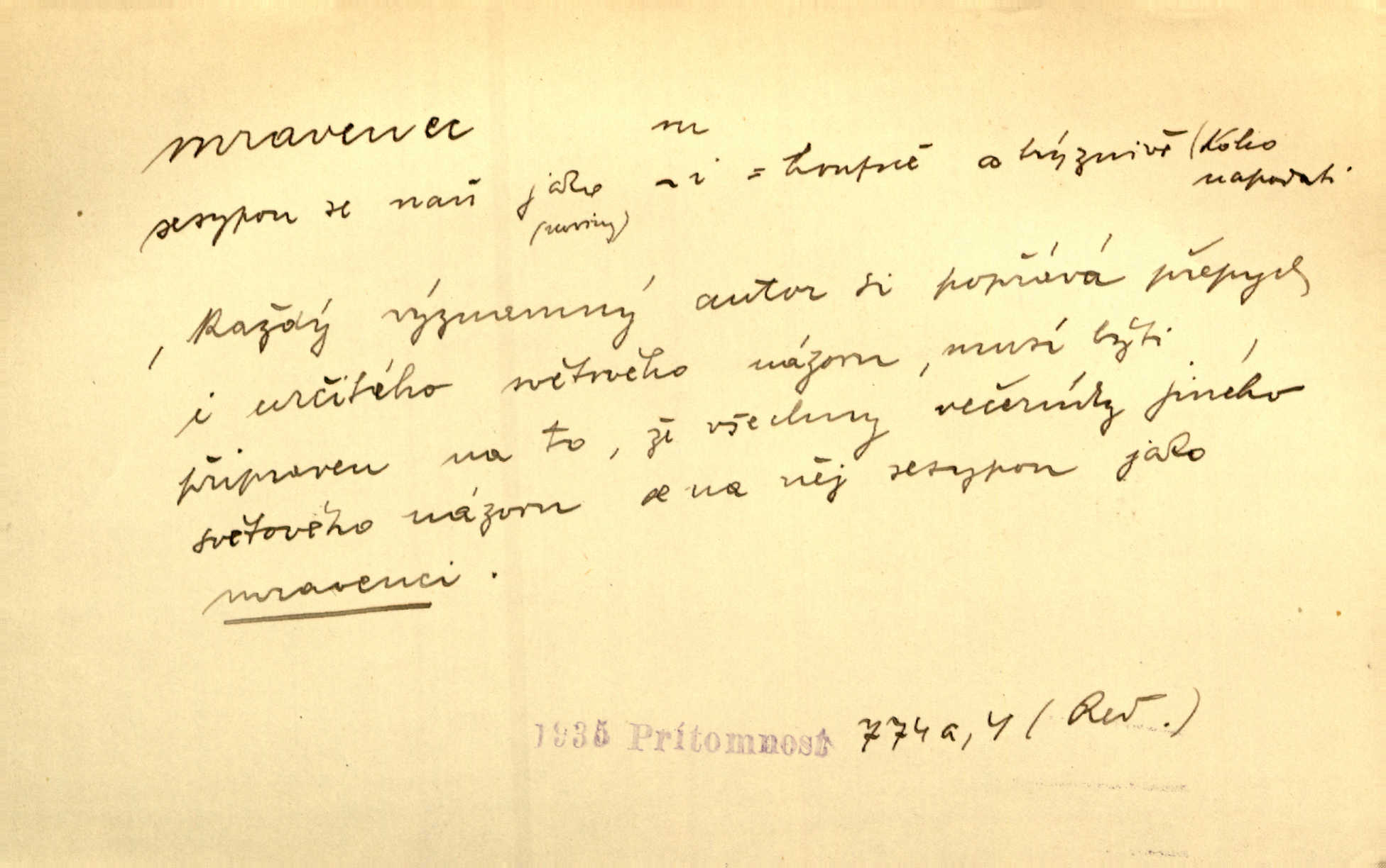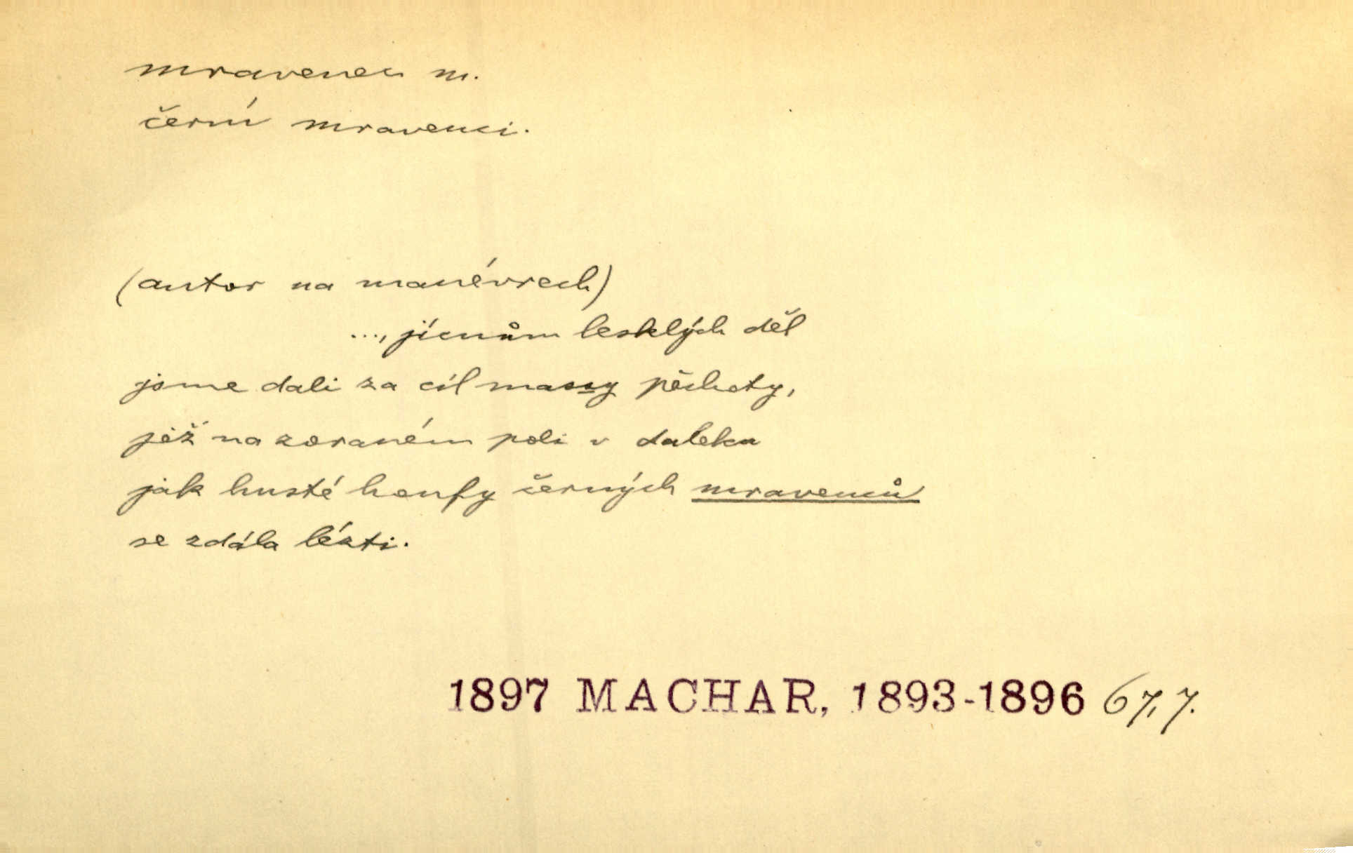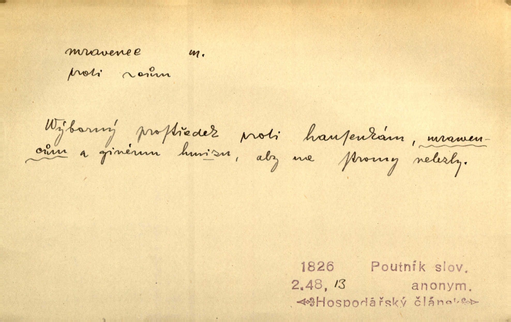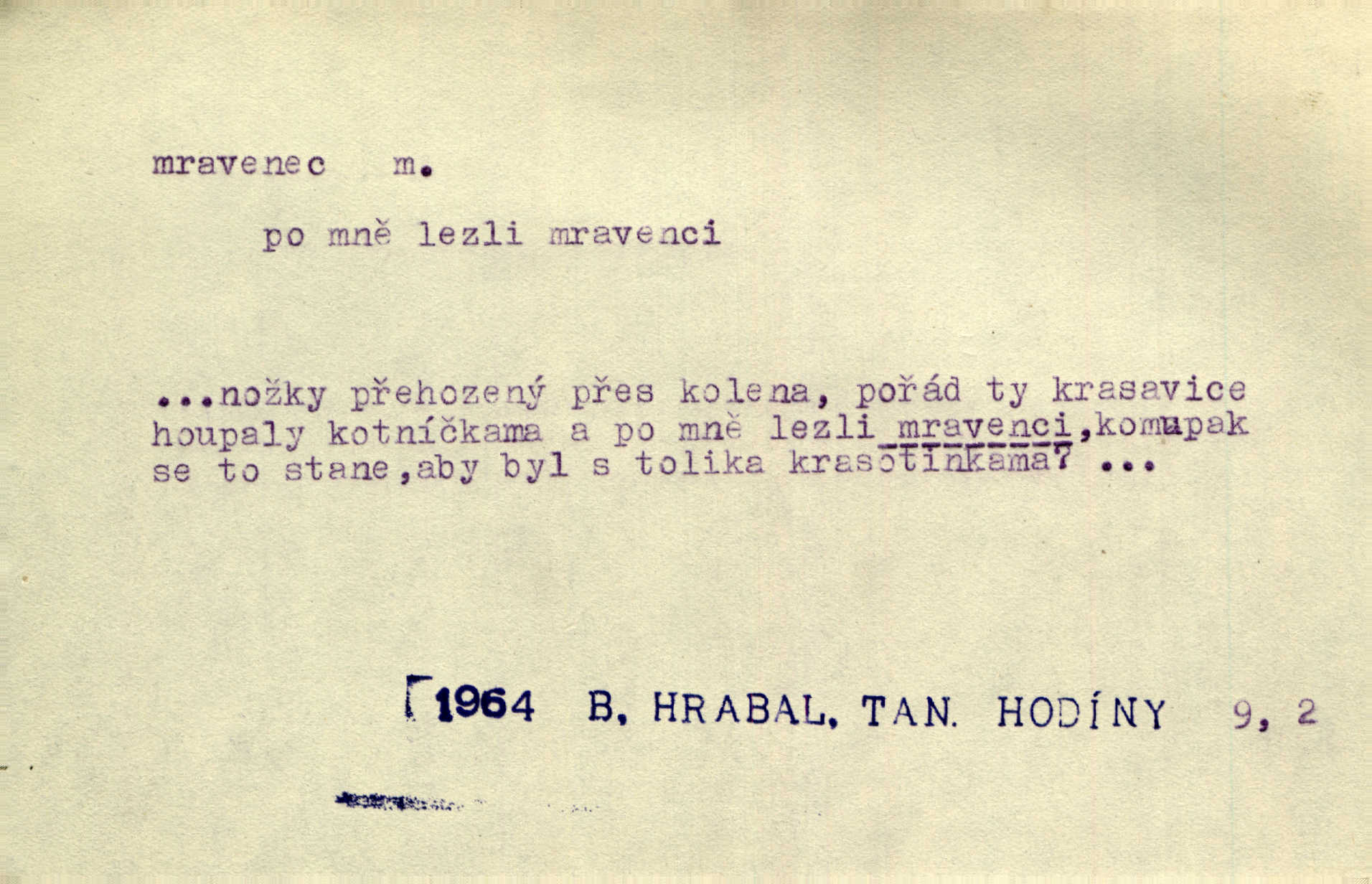- mravenec, -nce m. drobný blanokřídlý hmyz hromadně žijící. Zool. mravenci Formicidae. Mravenci se svými bílými vajíčky sem tam utíkali. Erb. Nesmírný ruch panoval jak mezi mravenci po celém ležení. Zey. Už není [nadporučík] tak červený jako mravenec. Jir. Hemžili se [lidé] mezi koly na bělidle jako mravenci. Rais. D o někom malém, nepatrném, bezvýznamném. Řím velký jest a to ví každý z nás [židů]‚ my [jsme] mravenci. Vrch. D Přen. o brnivém n. mrazivém pocitu. V nohách mu [pantátovi] zase projížděli mravenci. Rais. Hochovi mravenci pobíhali po zádech, když slyšel, kterak ženky napadnou člověka samotného v lese. Sez. V koleně mně to vrtalo a ještě tam mám ty mravence. Jir.