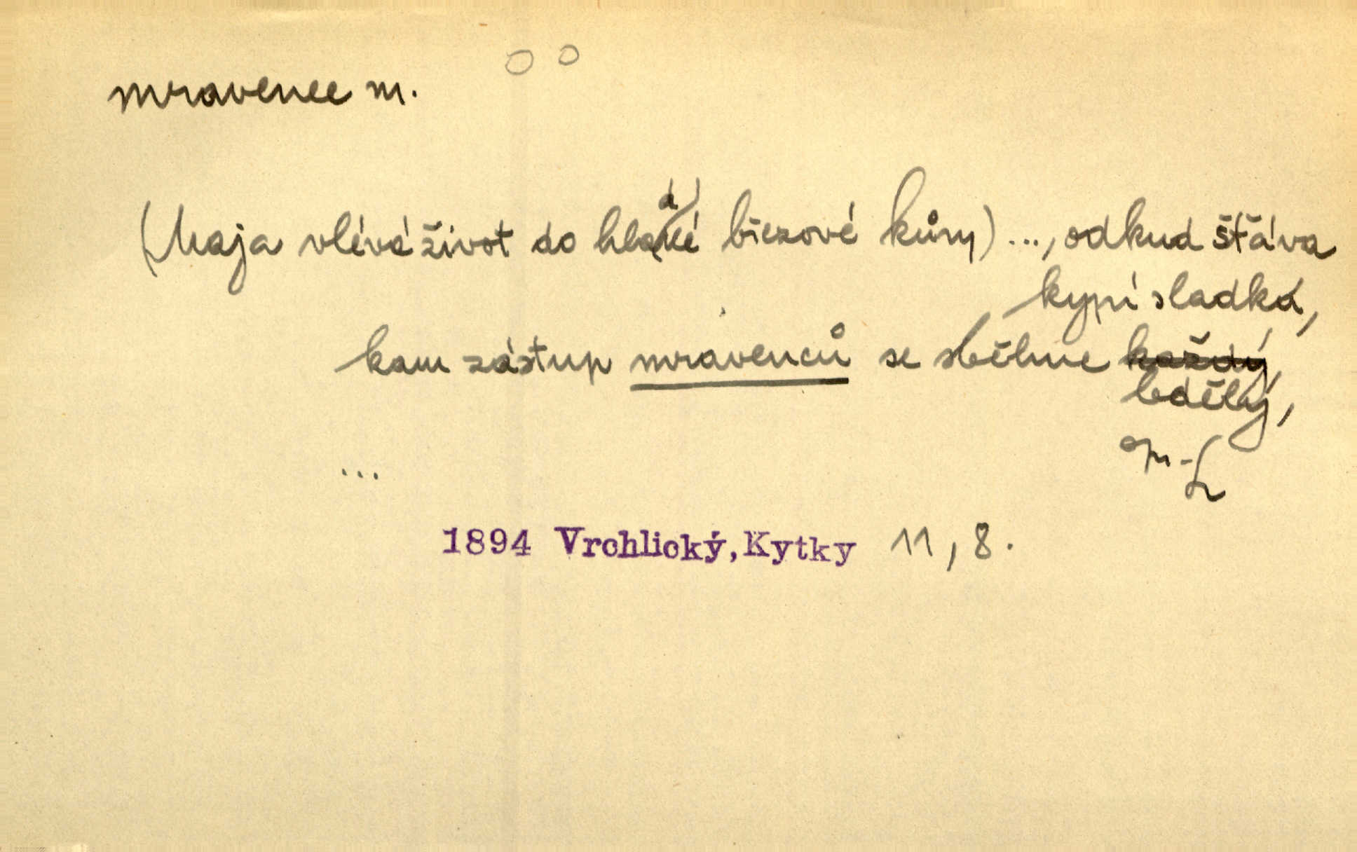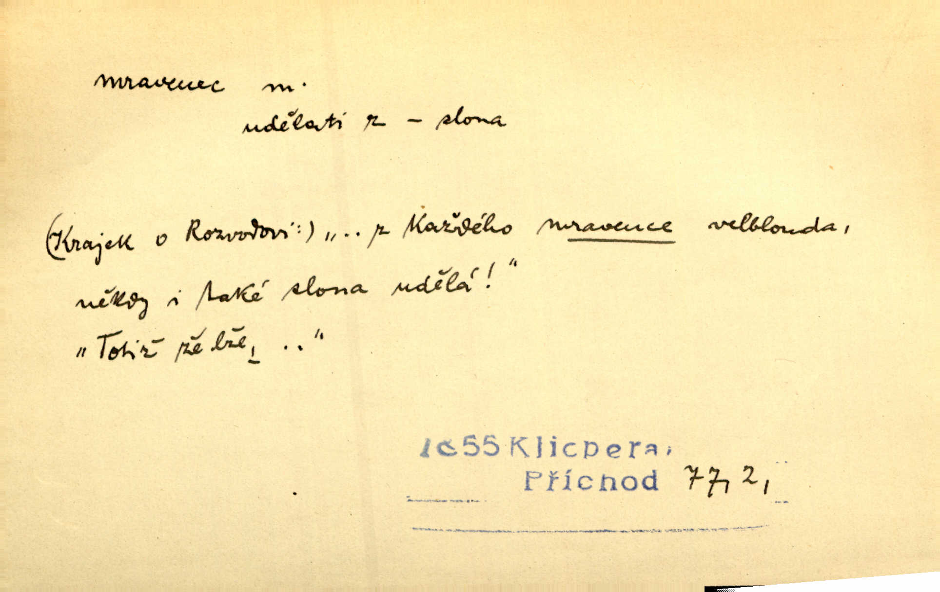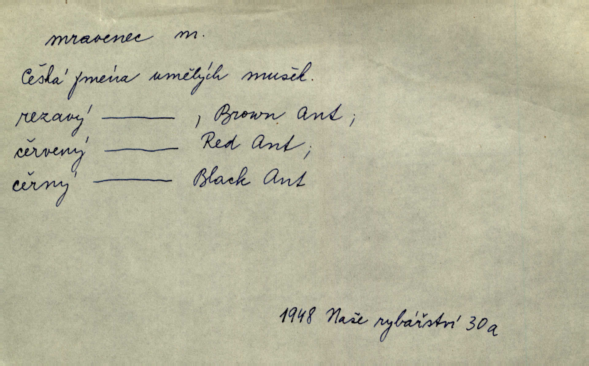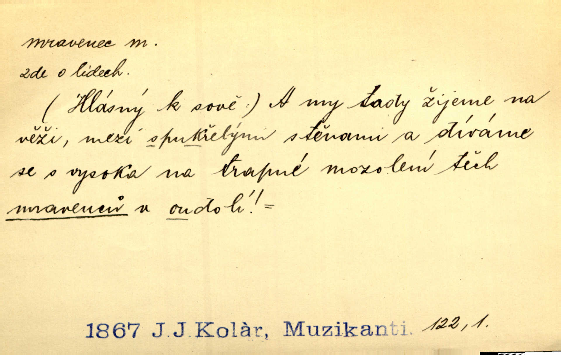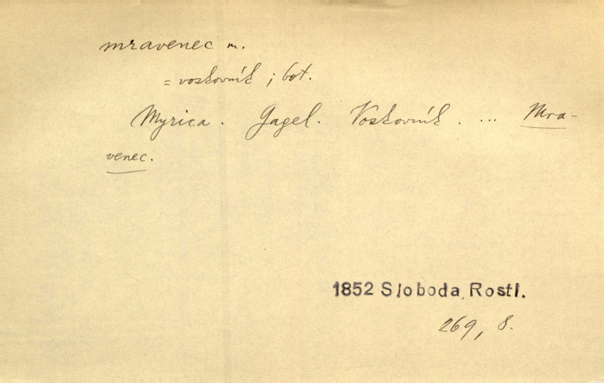 - mravenec, -nce m. drobný blanokřídlý hmyz hromadně žijící. Zool. mravenci Formicidae. Mravenci se svými bílými vajíčky sem tam utíkali. Erb. Nesmírný ruch panoval jak mezi mravenci po celém ležení. Zey. Už není [nadporučík] tak červený jako mravenec. Jir. Hemžili se [lidé] mezi koly na bělidle jako mravenci. Rais. D o někom malém, nepatrném, bezvýznamném. Řím velký jest a to ví každý z nás [židů]‚ my [jsme] mravenci. Vrch. D Přen. o brnivém n. mrazivém pocitu. V nohách mu [pantátovi] zase projížděli mravenci. Rais. Hochovi mravenci pobíhali po zádech, když slyšel, kterak ženky napadnou člověka samotného v lese. Sez. V koleně mně to vrtalo a ještě tam mám ty mravence. Jir.