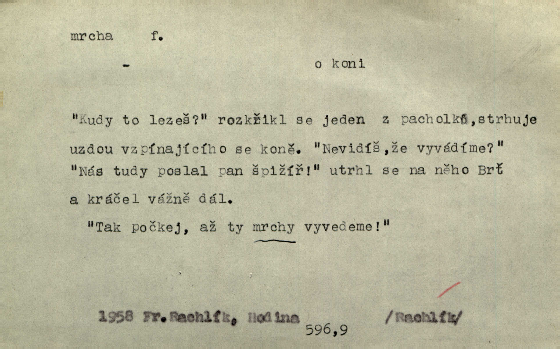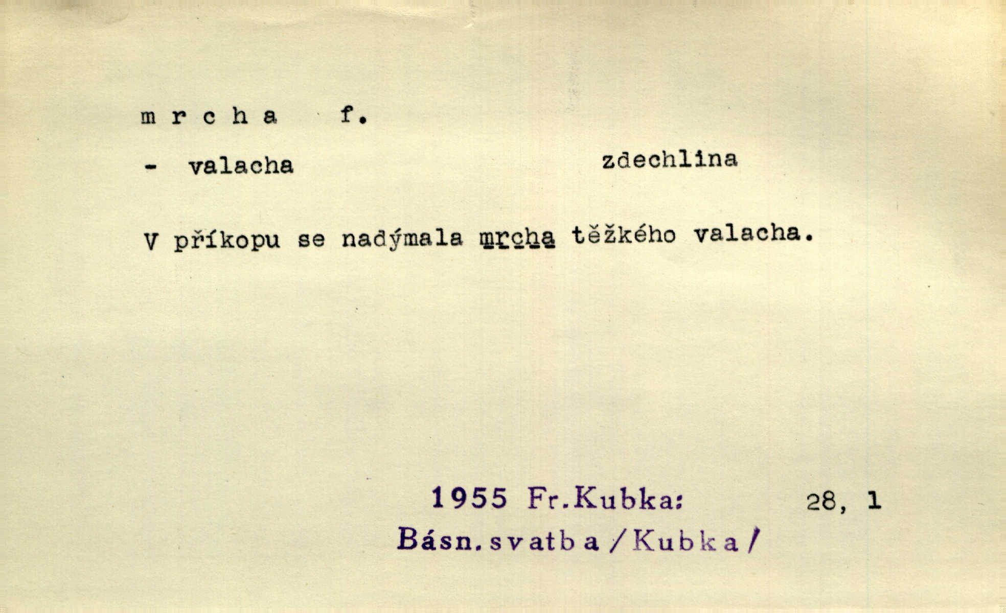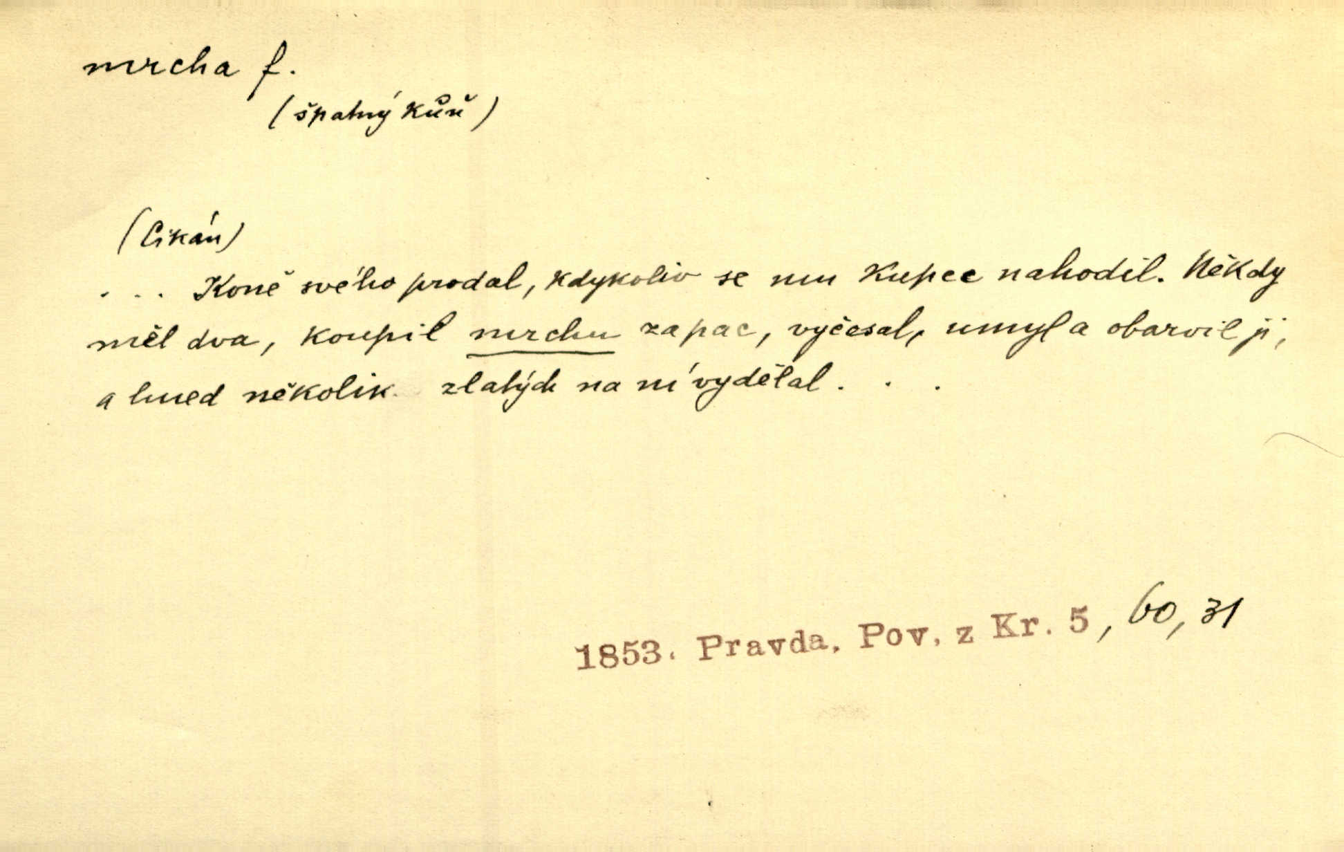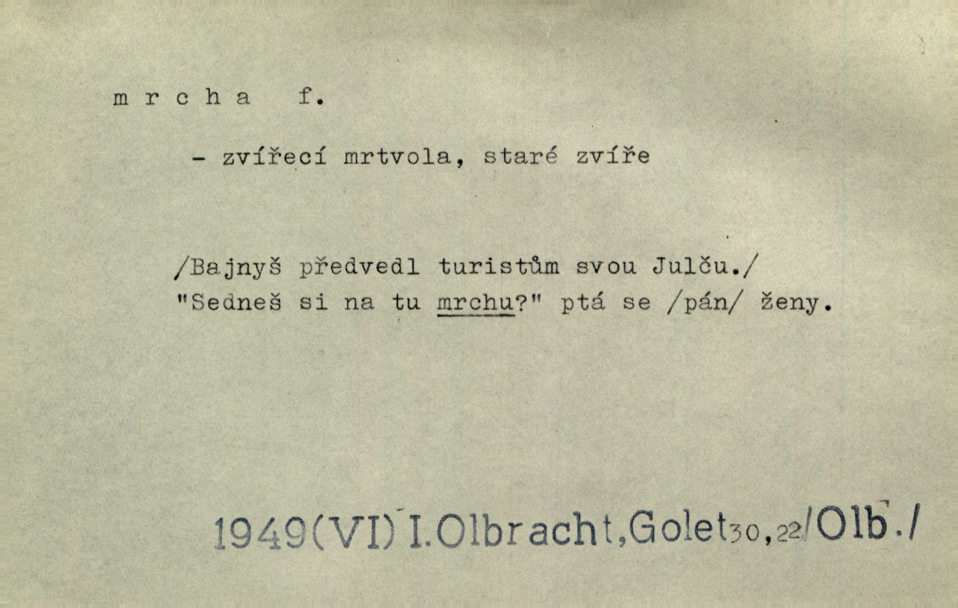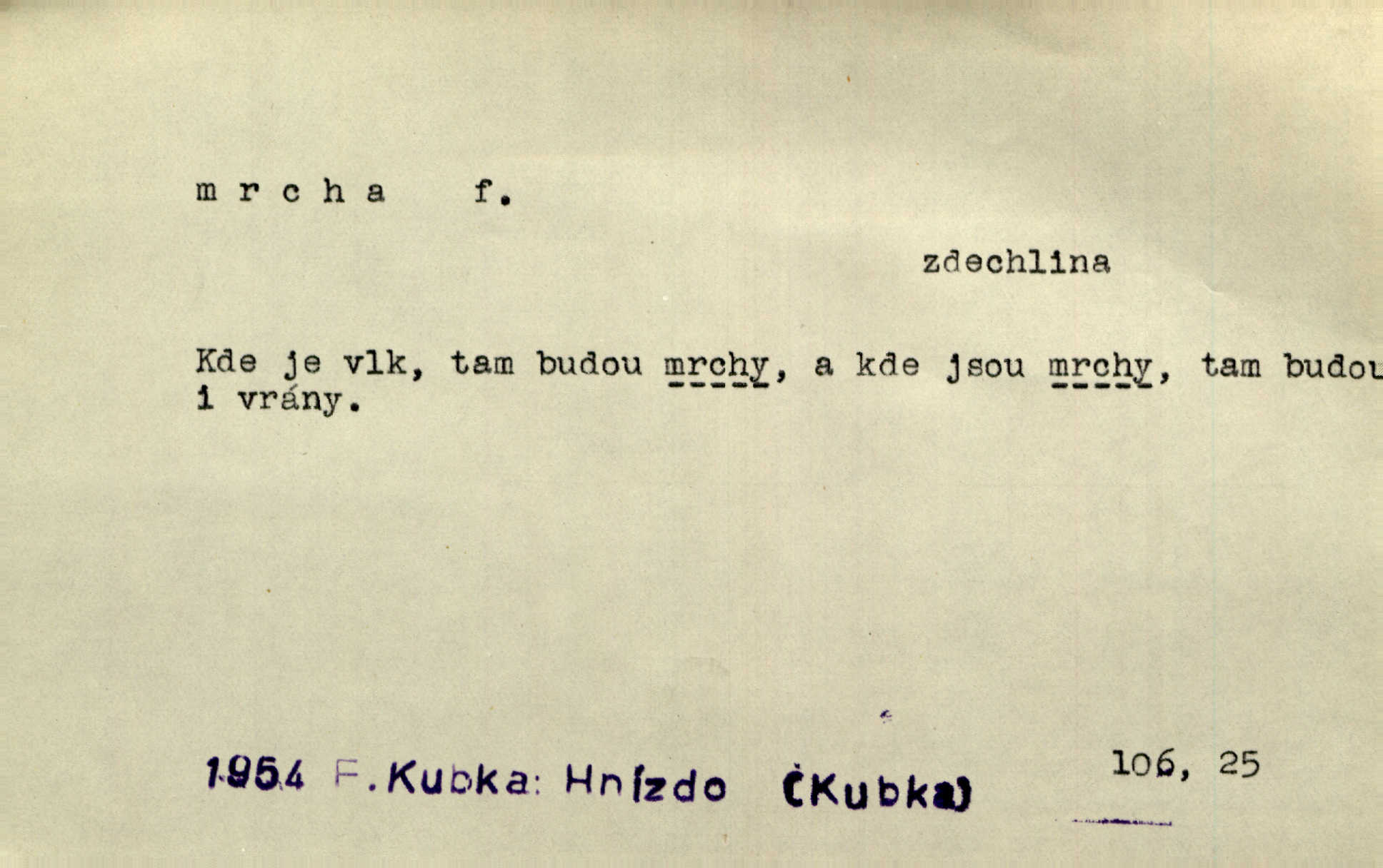 - mrcha, -y f. zvířecí mrtvola, zdechlina. Mnoho žoldnéřů meškalo ještě v poli, kde se černaly mrchy padlých koní. Jir. Přece nebudem zahrabávat lidi jako mrchy kdekoli. Baar. Sedly [vrány] na koně, držíce jej za mrchu. Něm. D Pejor. hubené zvíře, zvl. kůň. Přijel jsem v hanebné káře, tažené mrchou a ne koněm. Baar. A chrta vám měl, takovou vyzáblou mrchu, ale velikého. Jir. D Expr. nadávka někomu n. něčemu zlému, prohnanému, záludnému. Znáte špatně ženy. Každá jen se třese, ale jedna je větší mrcha druhé. Maria. Had, mrcha, vyskočil a milou princeznu uštknul. Kam. Vrabec je mrcha vyběračná. Herrm. Dobrý je to, mrcha… ještě jsem to nikdy nepil… Šrám. Náš radikál Link v tom ohledu je mrcha a své proposice má již hotovy. Šlej. Dial. též jako nesklonný přívlastek. Néspíš sami se řídili [hoši při zpěvu] — Mrcha, kluci! zatrolení. A. Mrš. Takové mrcha počasí nutí spát. Hol. Nestála ta salaš na místě zrovna záviděníhodném, když udeří mrcha čas. Knap.