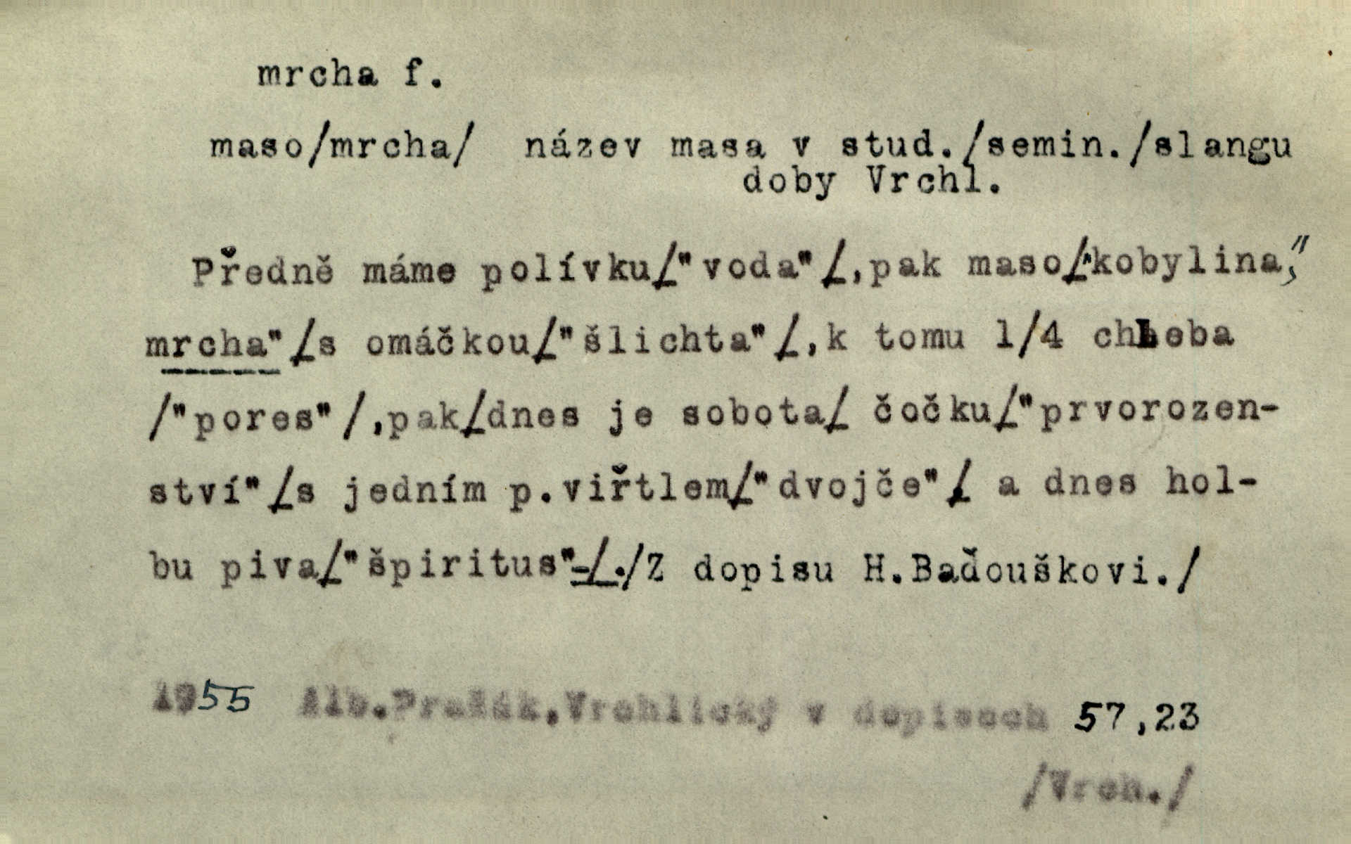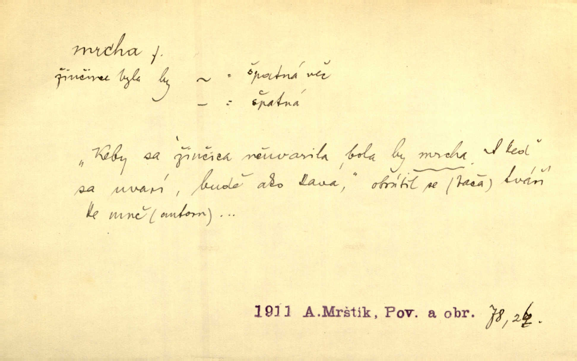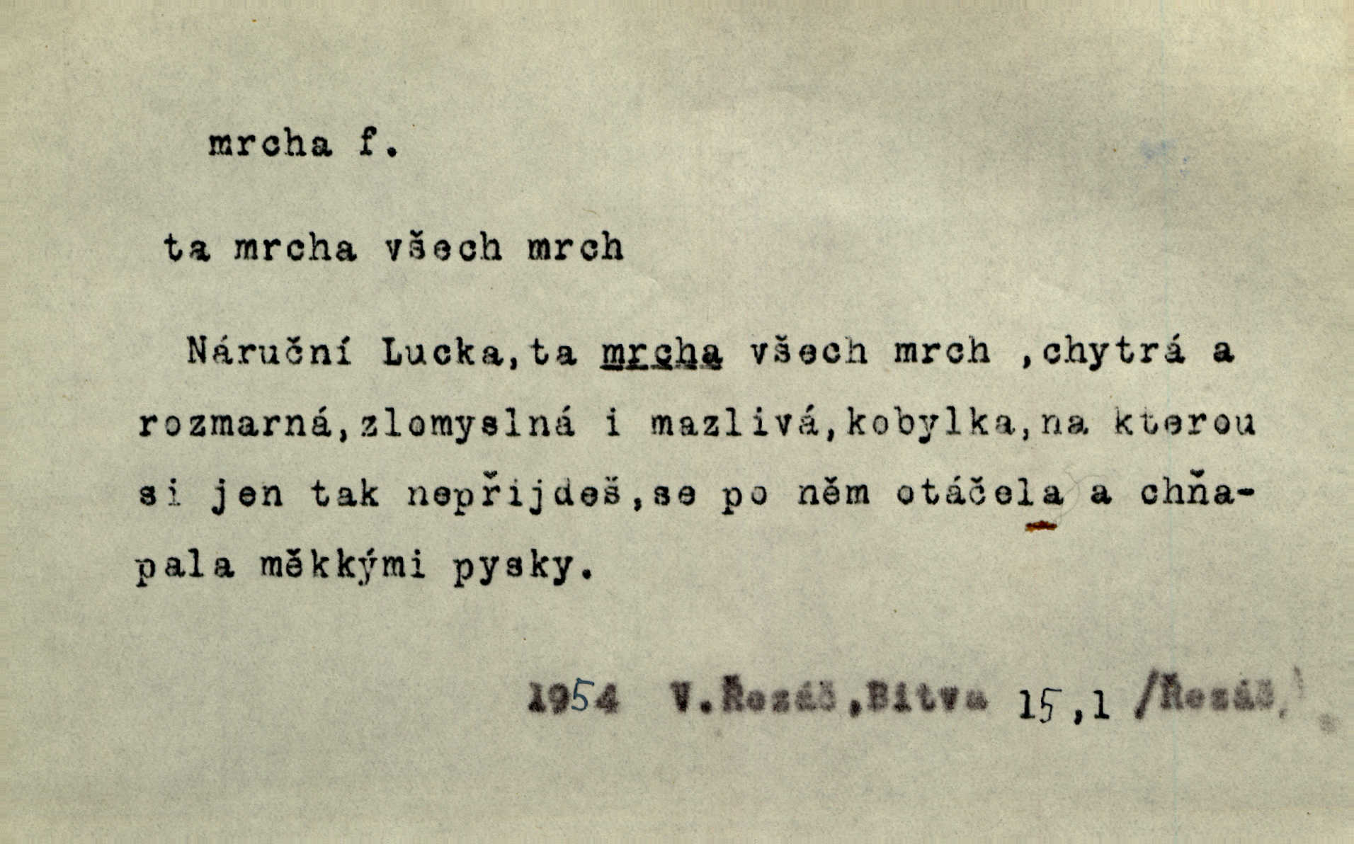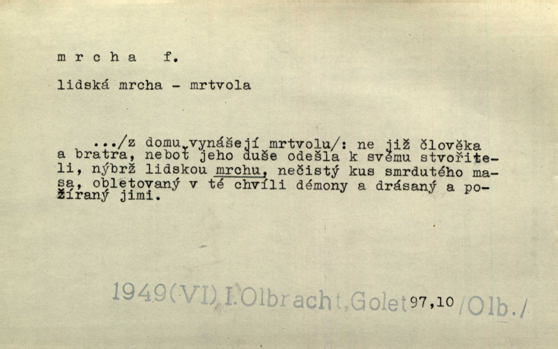 - mrcha, -y f. zvířecí mrtvola, zdechlina. Mnoho žoldnéřů meškalo ještě v poli, kde se černaly mrchy padlých koní. Jir. Přece nebudem zahrabávat lidi jako mrchy kdekoli. Baar. Sedly [vrány] na koně, držíce jej za mrchu. Něm. D Pejor. hubené zvíře, zvl. kůň. Přijel jsem v hanebné káře, tažené mrchou a ne koněm. Baar. A chrta vám měl, takovou vyzáblou mrchu, ale velikého. Jir. D Expr. nadávka někomu n. něčemu zlému, prohnanému, záludnému. Znáte špatně ženy. Každá jen se třese, ale jedna je větší mrcha druhé. Maria. Had, mrcha, vyskočil a milou princeznu uštknul. Kam. Vrabec je mrcha vyběračná. Herrm. Dobrý je to, mrcha… ještě jsem to nikdy nepil… Šrám. Náš radikál Link v tom ohledu je mrcha a své proposice má již hotovy. Šlej. Dial. též jako nesklonný přívlastek. Néspíš sami se řídili [hoši při zpěvu] — Mrcha, kluci! zatrolení. A. Mrš. Takové mrcha počasí nutí spát. Hol. Nestála ta salaš na místě zrovna záviděníhodném, když udeří mrcha čas. Knap.