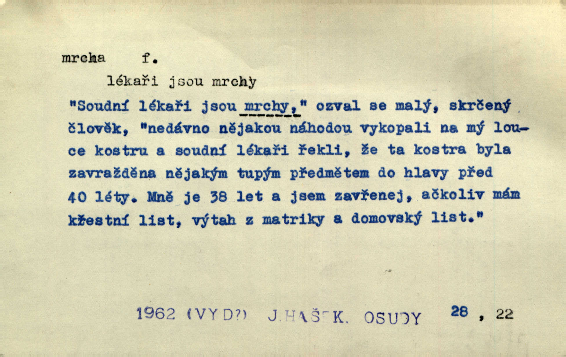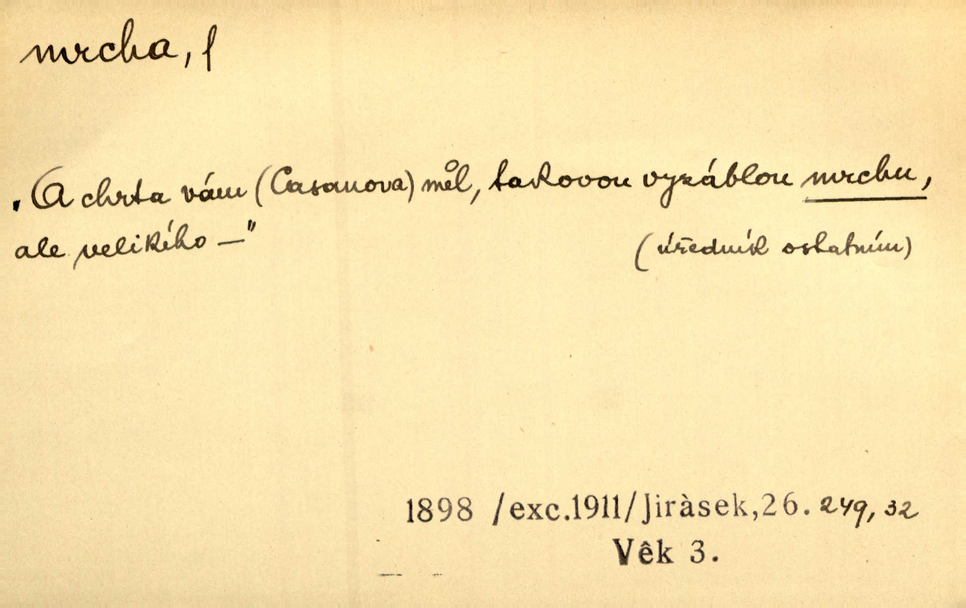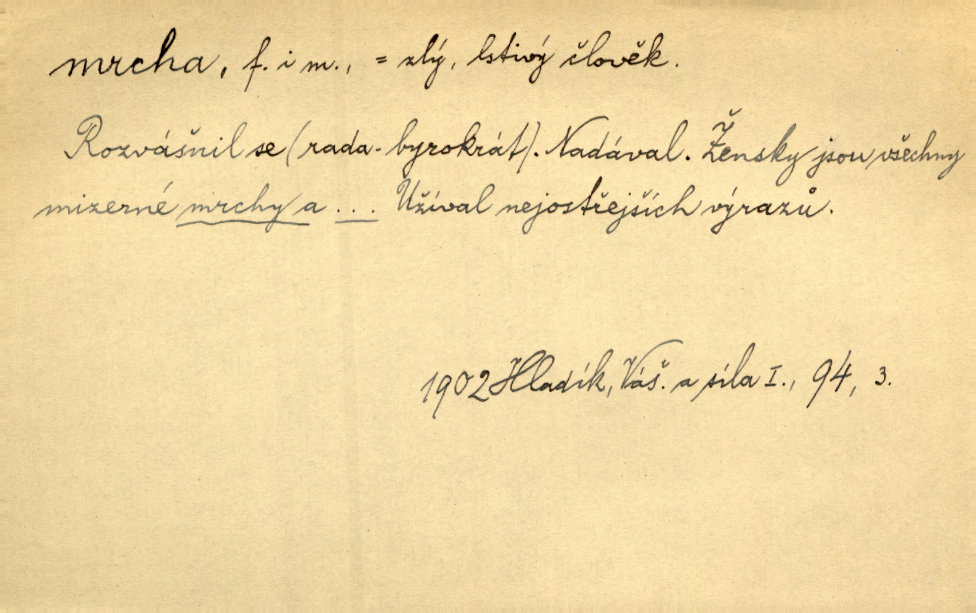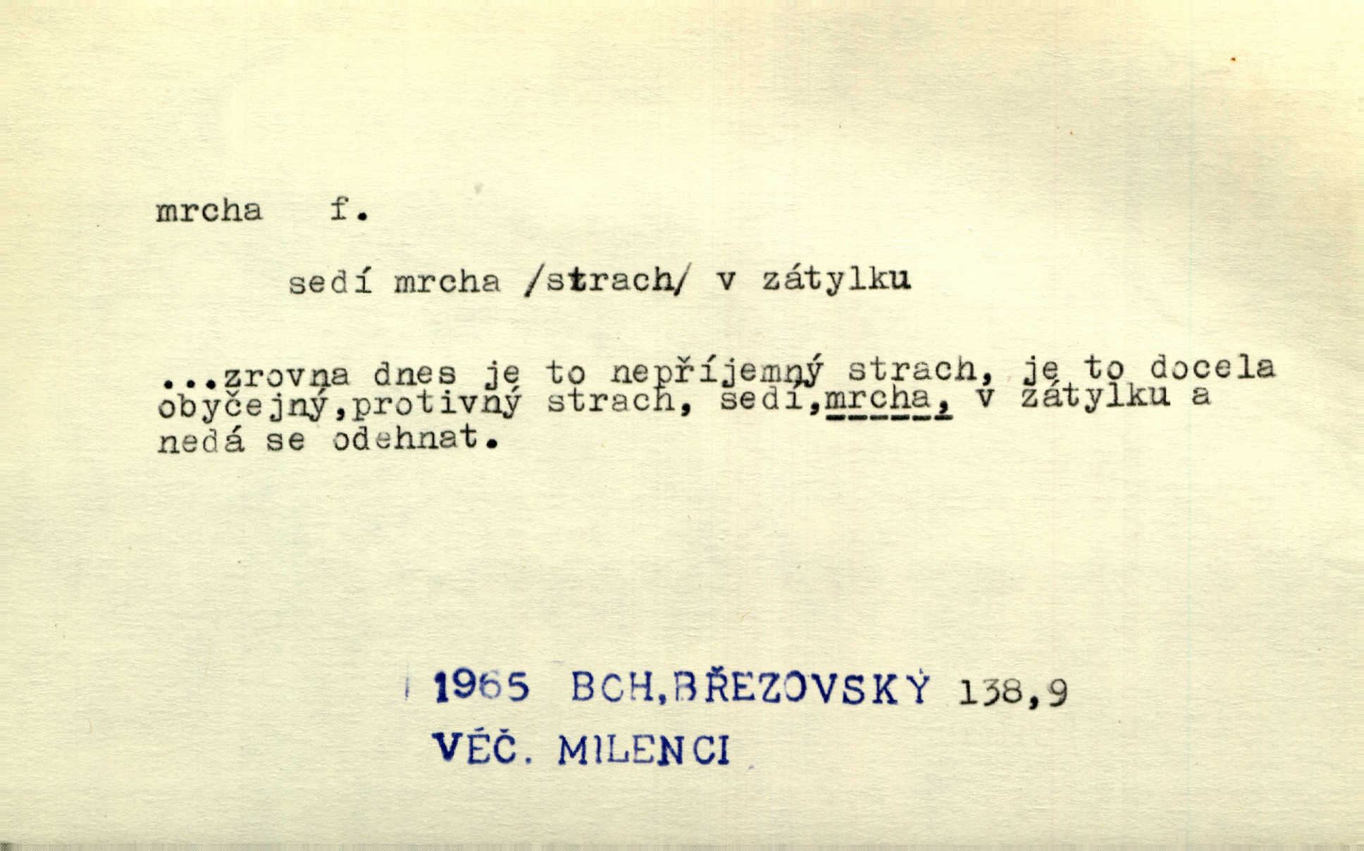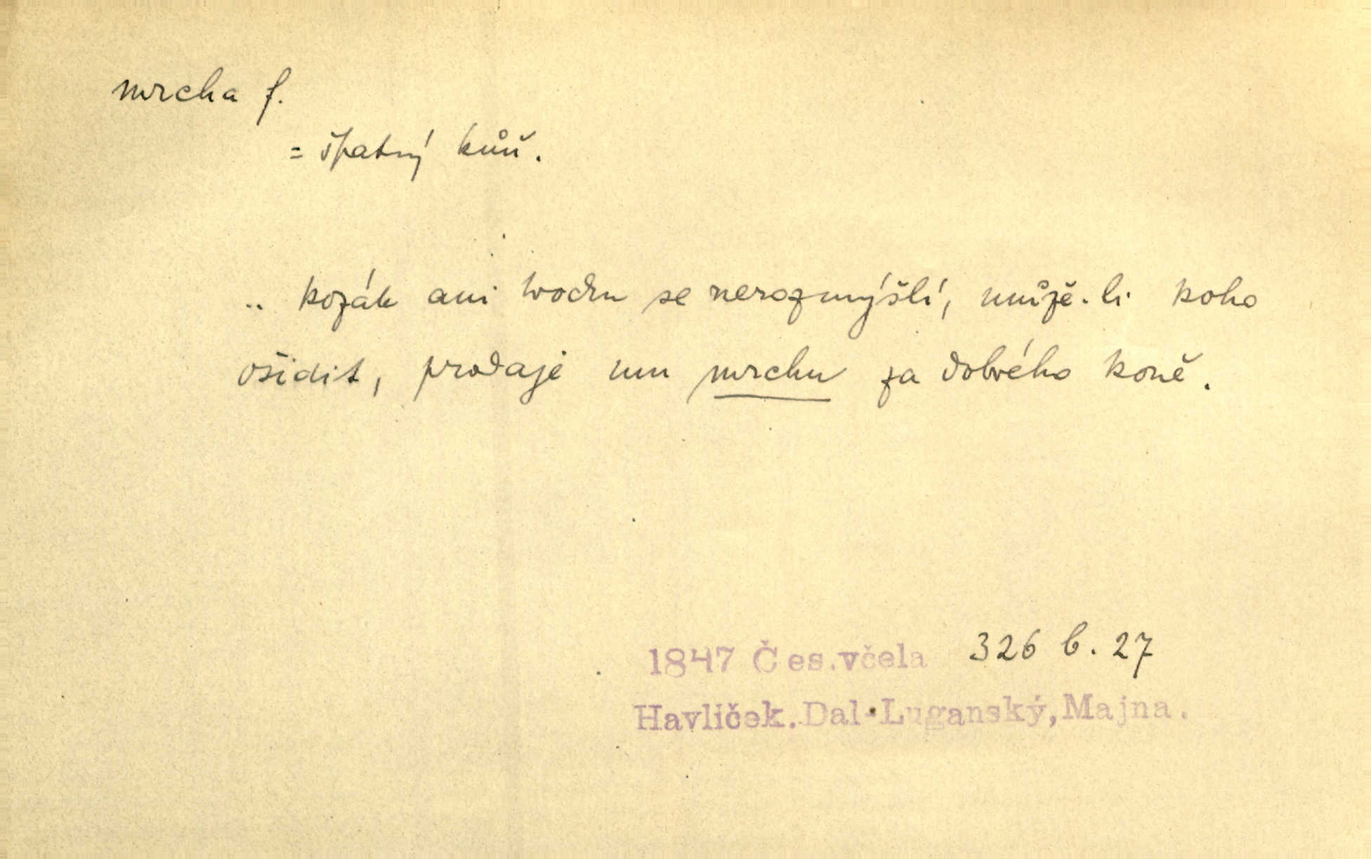 - mrcha, -y f. zvířecí mrtvola, zdechlina. Mnoho žoldnéřů meškalo ještě v poli, kde se černaly mrchy padlých koní. Jir. Přece nebudem zahrabávat lidi jako mrchy kdekoli. Baar. Sedly [vrány] na koně, držíce jej za mrchu. Něm. D Pejor. hubené zvíře, zvl. kůň. Přijel jsem v hanebné káře, tažené mrchou a ne koněm. Baar. A chrta vám měl, takovou vyzáblou mrchu, ale velikého. Jir. D Expr. nadávka někomu n. něčemu zlému, prohnanému, záludnému. Znáte špatně ženy. Každá jen se třese, ale jedna je větší mrcha druhé. Maria. Had, mrcha, vyskočil a milou princeznu uštknul. Kam. Vrabec je mrcha vyběračná. Herrm. Dobrý je to, mrcha… ještě jsem to nikdy nepil… Šrám. Náš radikál Link v tom ohledu je mrcha a své proposice má již hotovy. Šlej. Dial. též jako nesklonný přívlastek. Néspíš sami se řídili [hoši při zpěvu] — Mrcha, kluci! zatrolení. A. Mrš. Takové mrcha počasí nutí spát. Hol. Nestála ta salaš na místě zrovna záviděníhodném, když udeří mrcha čas. Knap.