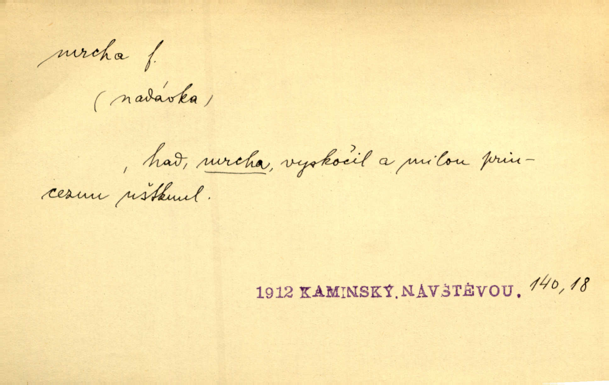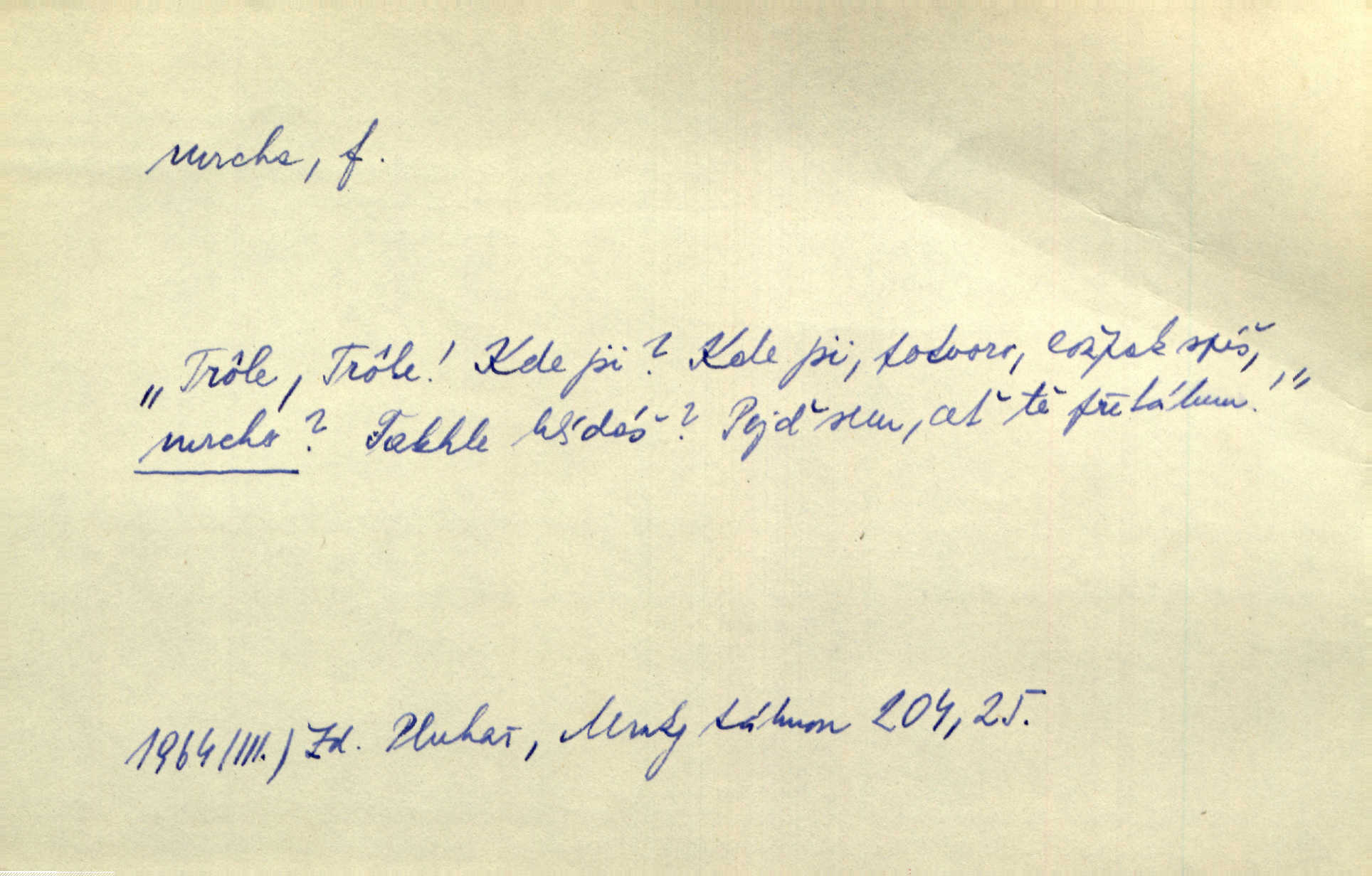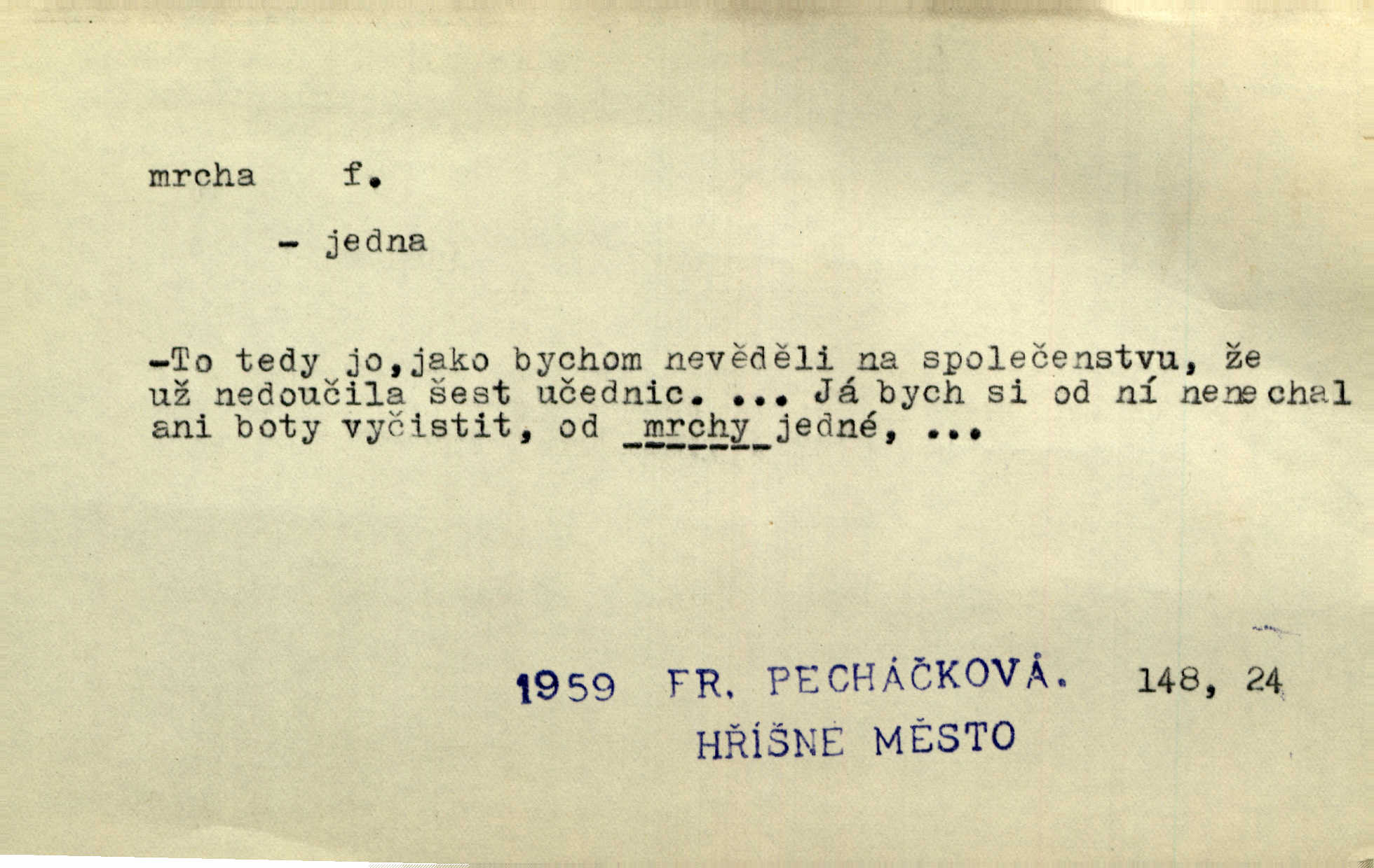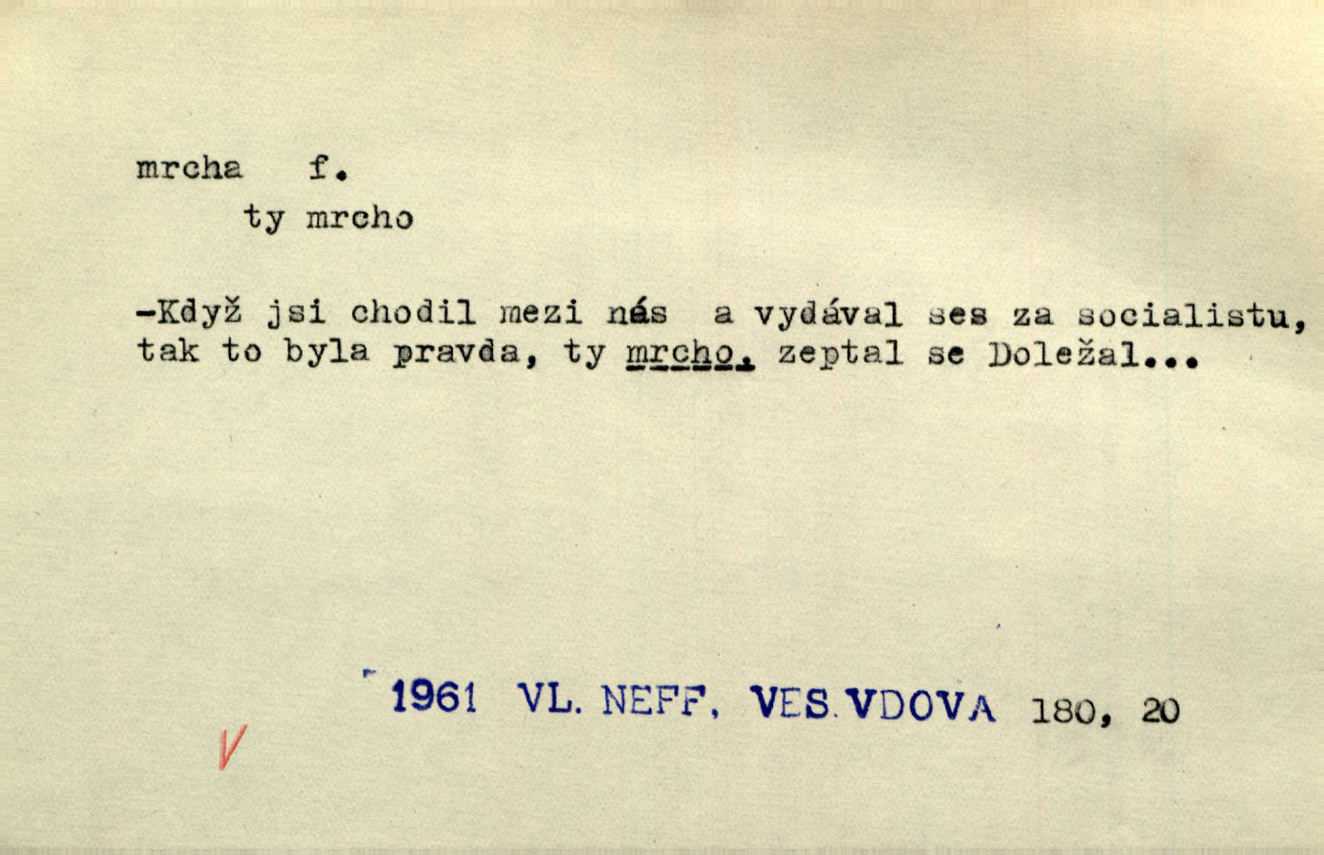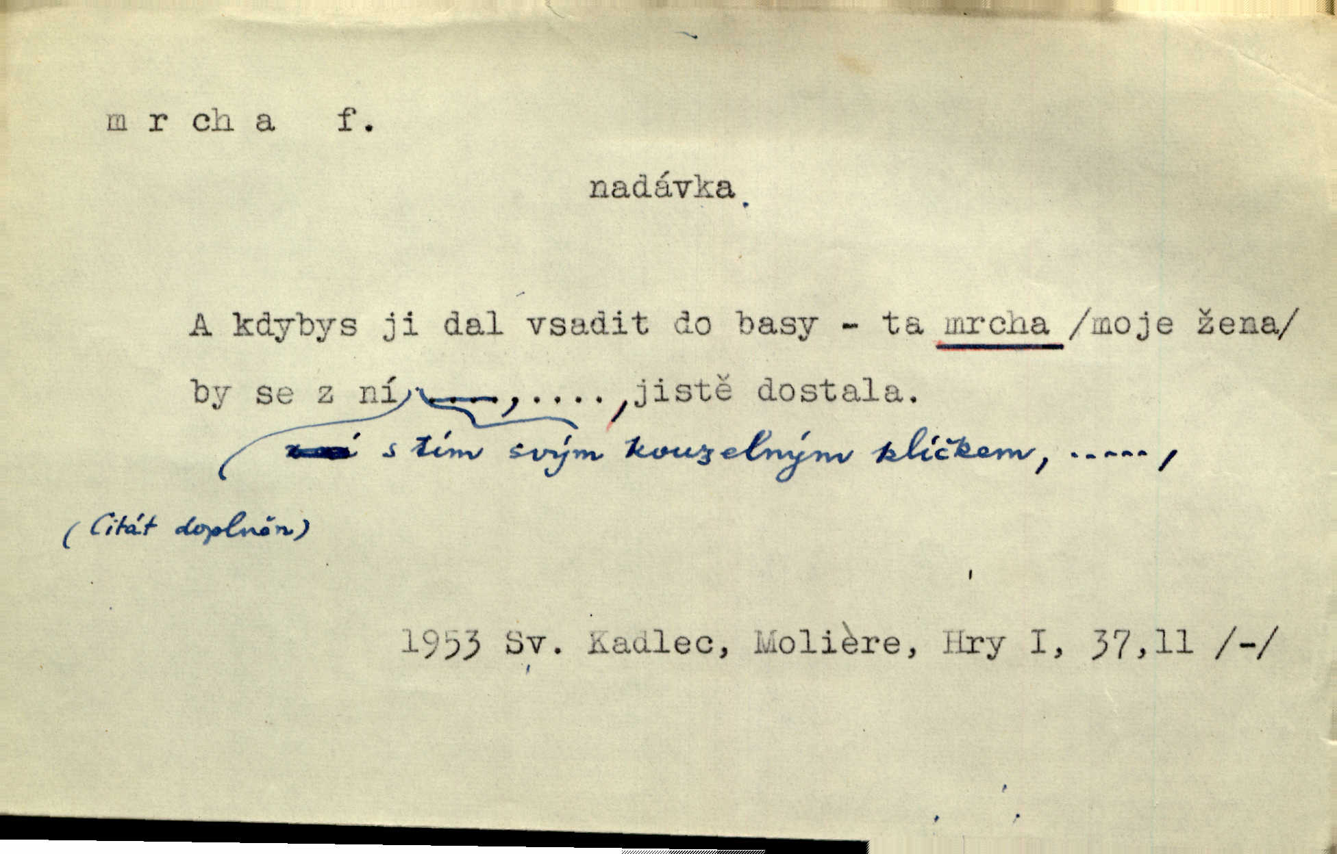 - mrcha, -y f. zvířecí mrtvola, zdechlina. Mnoho žoldnéřů meškalo ještě v poli, kde se černaly mrchy padlých koní. Jir. Přece nebudem zahrabávat lidi jako mrchy kdekoli. Baar. Sedly [vrány] na koně, držíce jej za mrchu. Něm. D Pejor. hubené zvíře, zvl. kůň. Přijel jsem v hanebné káře, tažené mrchou a ne koněm. Baar. A chrta vám měl, takovou vyzáblou mrchu, ale velikého. Jir. D Expr. nadávka někomu n. něčemu zlému, prohnanému, záludnému. Znáte špatně ženy. Každá jen se třese, ale jedna je větší mrcha druhé. Maria. Had, mrcha, vyskočil a milou princeznu uštknul. Kam. Vrabec je mrcha vyběračná. Herrm. Dobrý je to, mrcha… ještě jsem to nikdy nepil… Šrám. Náš radikál Link v tom ohledu je mrcha a své proposice má již hotovy. Šlej. Dial. též jako nesklonný přívlastek. Néspíš sami se řídili [hoši při zpěvu] — Mrcha, kluci! zatrolení. A. Mrš. Takové mrcha počasí nutí spát. Hol. Nestála ta salaš na místě zrovna záviděníhodném, když udeří mrcha čas. Knap.