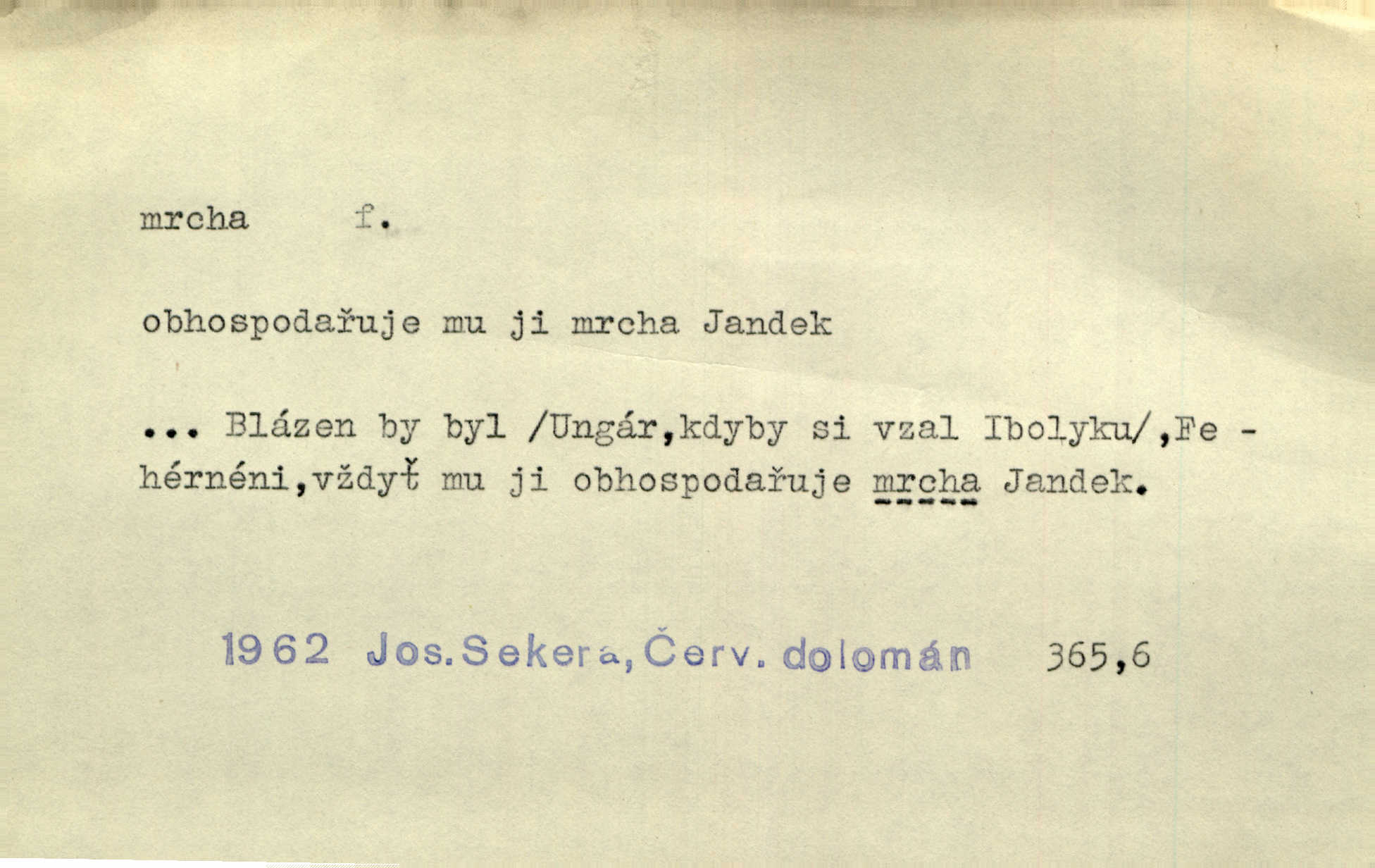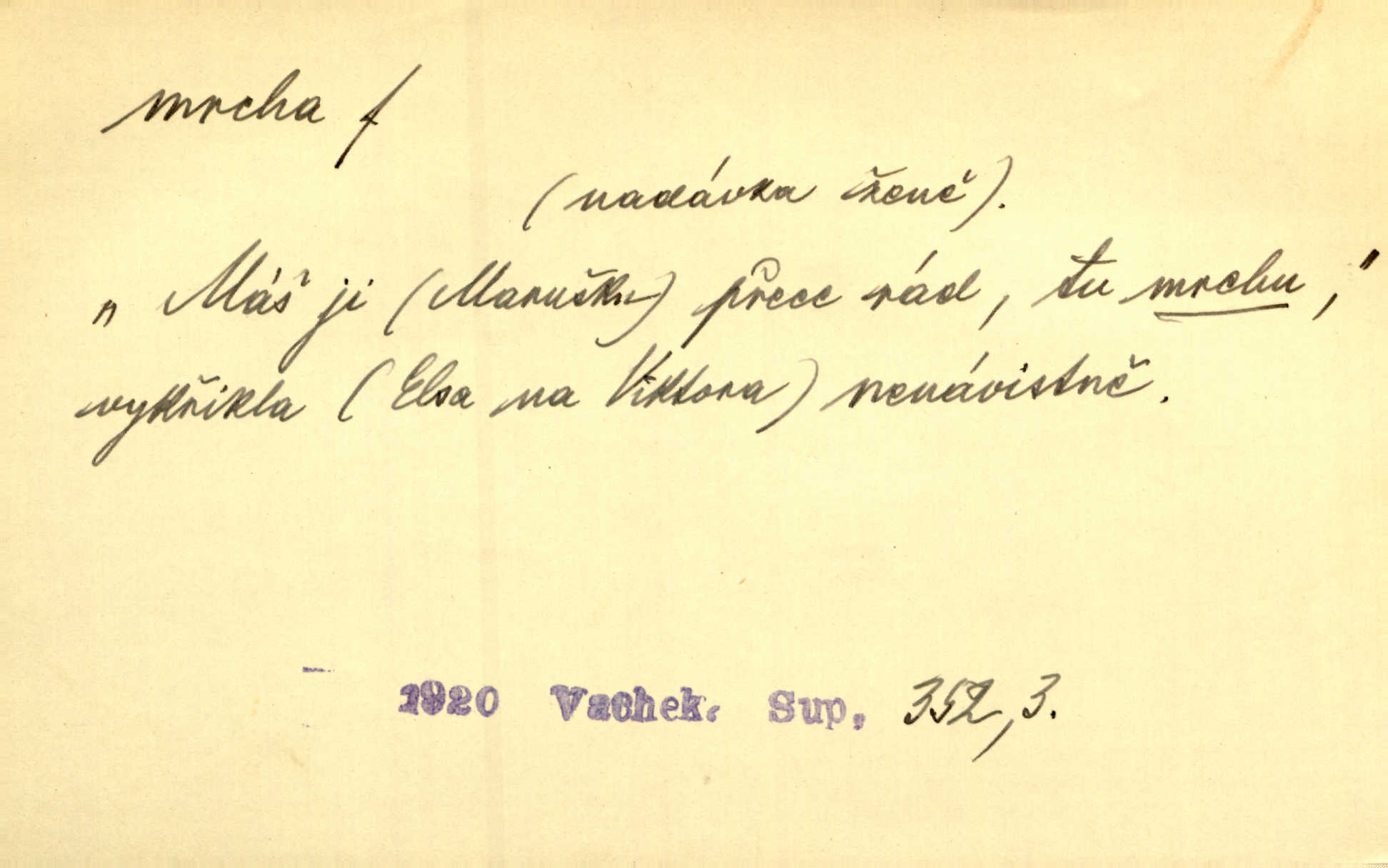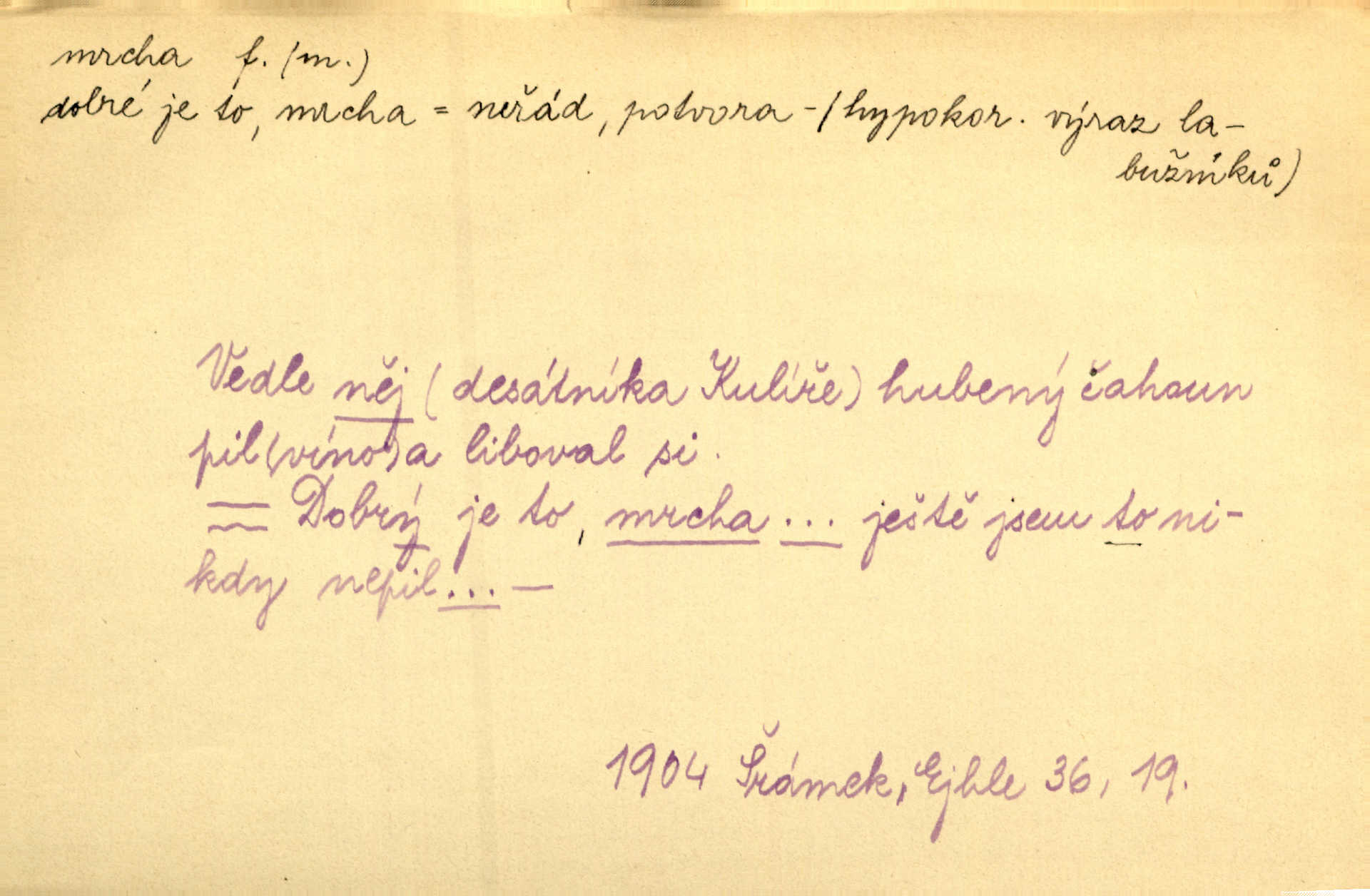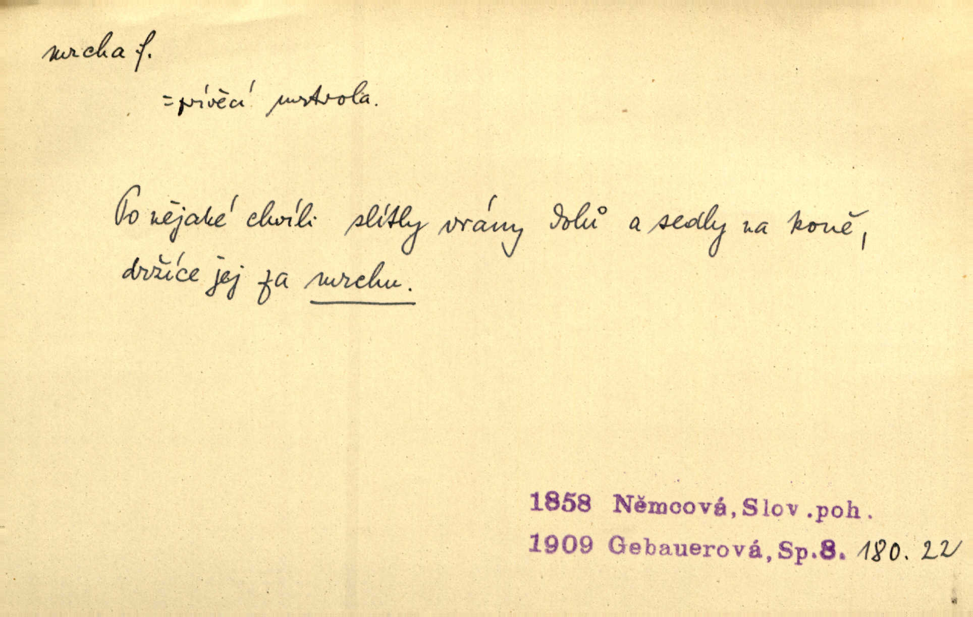 - mrcha, -y f. zvířecí mrtvola, zdechlina. Mnoho žoldnéřů meškalo ještě v poli, kde se černaly mrchy padlých koní. Jir. Přece nebudem zahrabávat lidi jako mrchy kdekoli. Baar. Sedly [vrány] na koně, držíce jej za mrchu. Něm. D Pejor. hubené zvíře, zvl. kůň. Přijel jsem v hanebné káře, tažené mrchou a ne koněm. Baar. A chrta vám měl, takovou vyzáblou mrchu, ale velikého. Jir. D Expr. nadávka někomu n. něčemu zlému, prohnanému, záludnému. Znáte špatně ženy. Každá jen se třese, ale jedna je větší mrcha druhé. Maria. Had, mrcha, vyskočil a milou princeznu uštknul. Kam. Vrabec je mrcha vyběračná. Herrm. Dobrý je to, mrcha… ještě jsem to nikdy nepil… Šrám. Náš radikál Link v tom ohledu je mrcha a své proposice má již hotovy. Šlej. Dial. též jako nesklonný přívlastek. Néspíš sami se řídili [hoši při zpěvu] — Mrcha, kluci! zatrolení. A. Mrš. Takové mrcha počasí nutí spát. Hol. Nestála ta salaš na místě zrovna záviděníhodném, když udeří mrcha čas. Knap.
