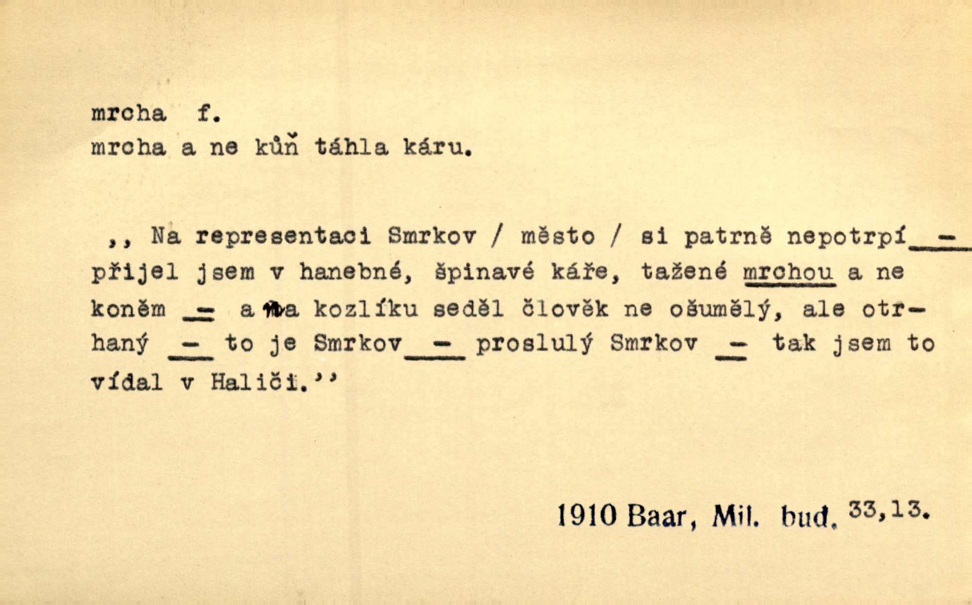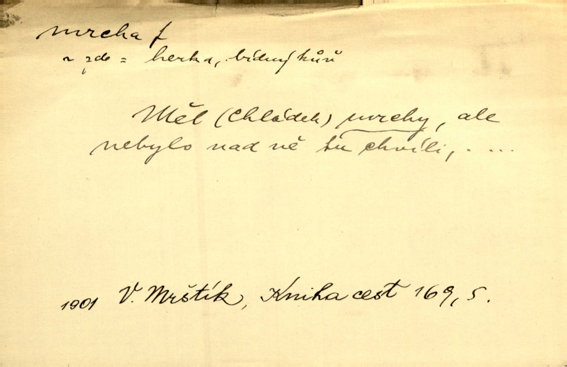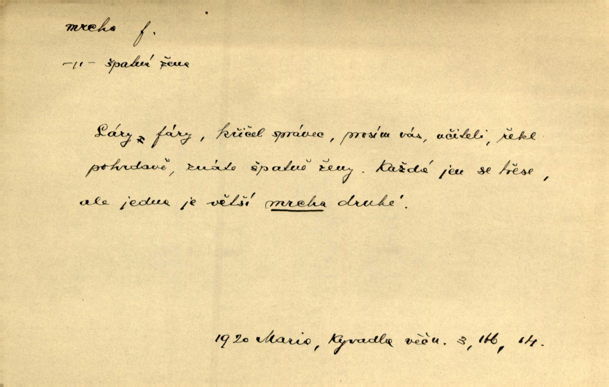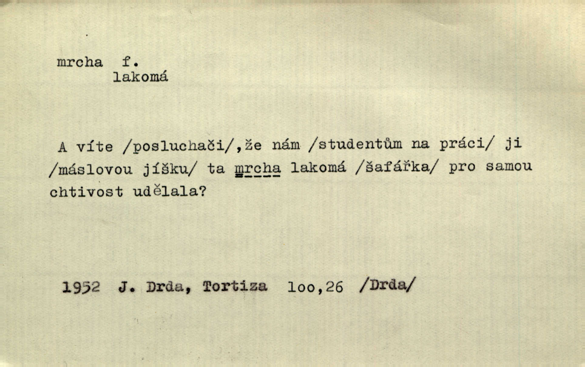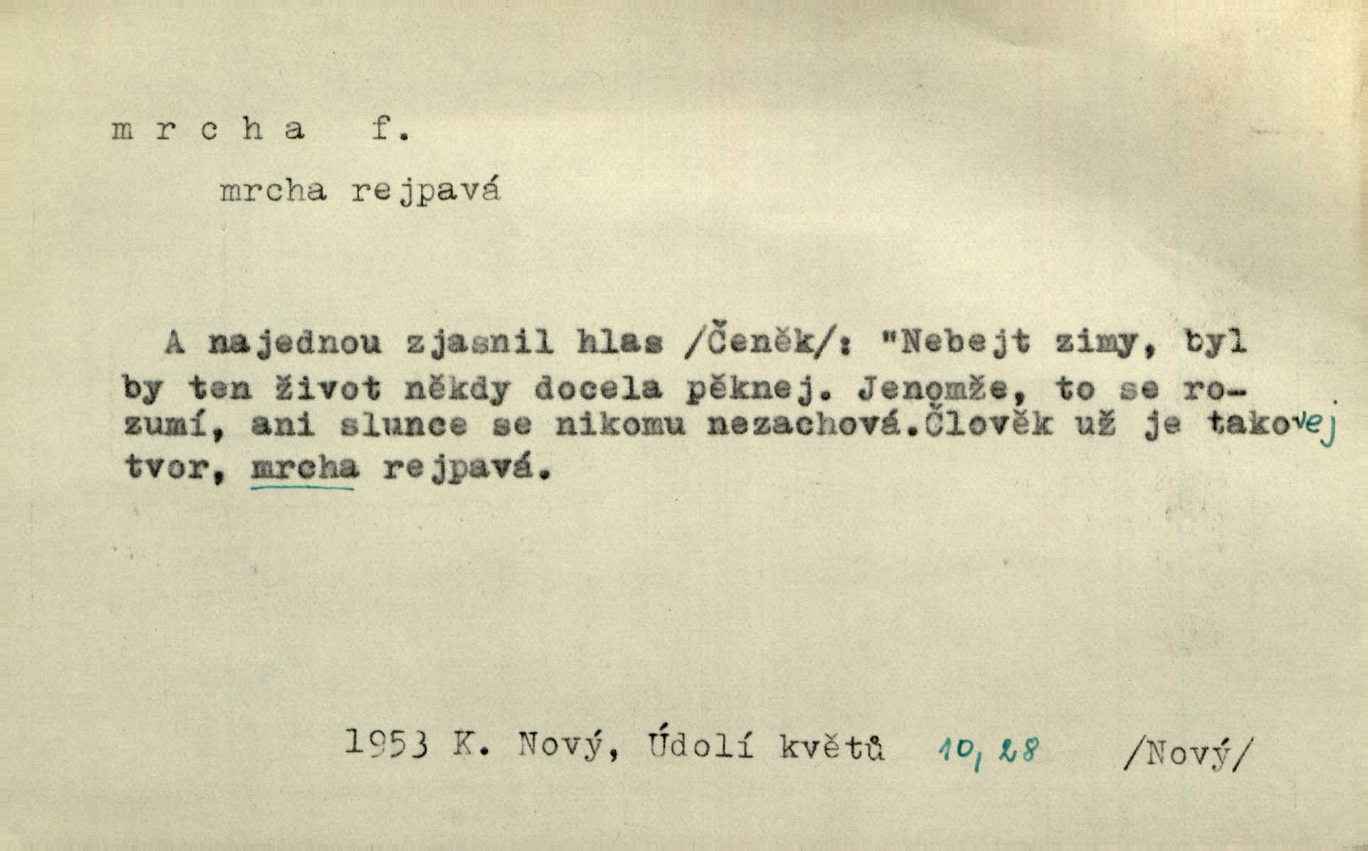- mrcha, -y f. zvířecí mrtvola, zdechlina. Mnoho žoldnéřů meškalo ještě v poli, kde se černaly mrchy padlých koní. Jir. Přece nebudem zahrabávat lidi jako mrchy kdekoli. Baar. Sedly [vrány] na koně, držíce jej za mrchu. Něm. D Pejor. hubené zvíře, zvl. kůň. Přijel jsem v hanebné káře, tažené mrchou a ne koněm. Baar. A chrta vám měl, takovou vyzáblou mrchu, ale velikého. Jir. D Expr. nadávka někomu n. něčemu zlému, prohnanému, záludnému. Znáte špatně ženy. Každá jen se třese, ale jedna je větší mrcha druhé. Maria. Had, mrcha, vyskočil a milou princeznu uštknul. Kam. Vrabec je mrcha vyběračná. Herrm. Dobrý je to, mrcha… ještě jsem to nikdy nepil… Šrám. Náš radikál Link v tom ohledu je mrcha a své proposice má již hotovy. Šlej. Dial. též jako nesklonný přívlastek. Néspíš sami se řídili [hoši při zpěvu] — Mrcha, kluci! zatrolení. A. Mrš. Takové mrcha počasí nutí spát. Hol. Nestála ta salaš na místě zrovna záviděníhodném, když udeří mrcha čas. Knap.