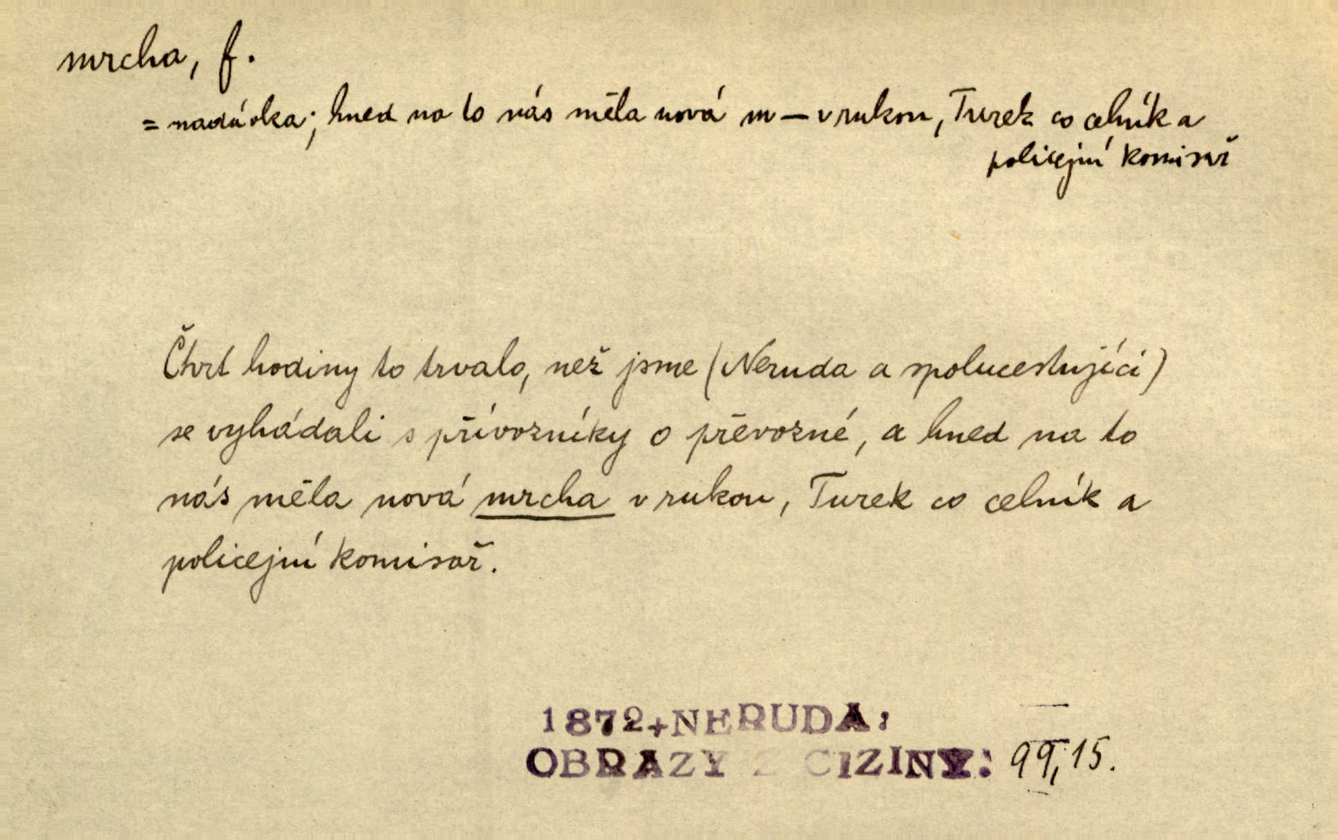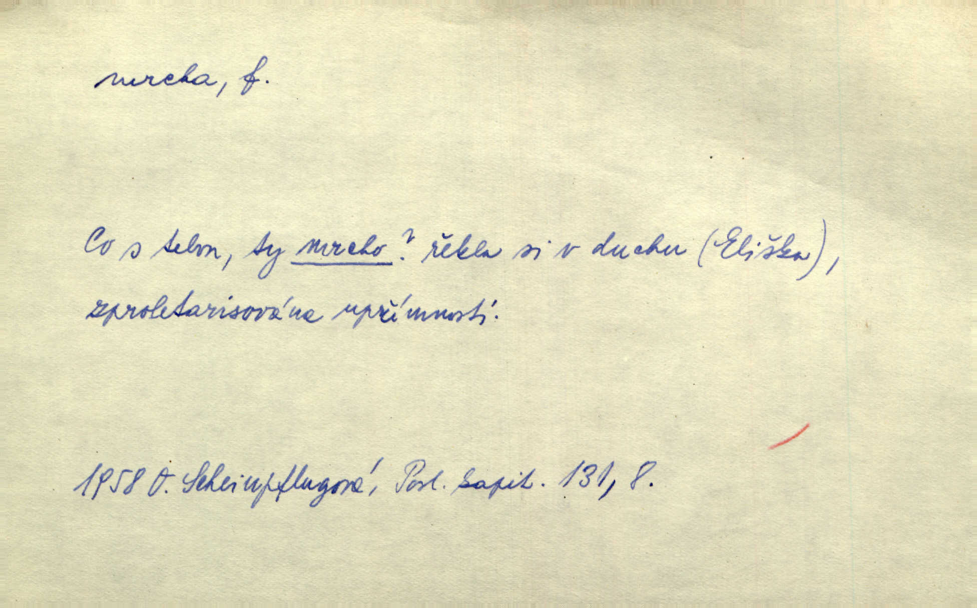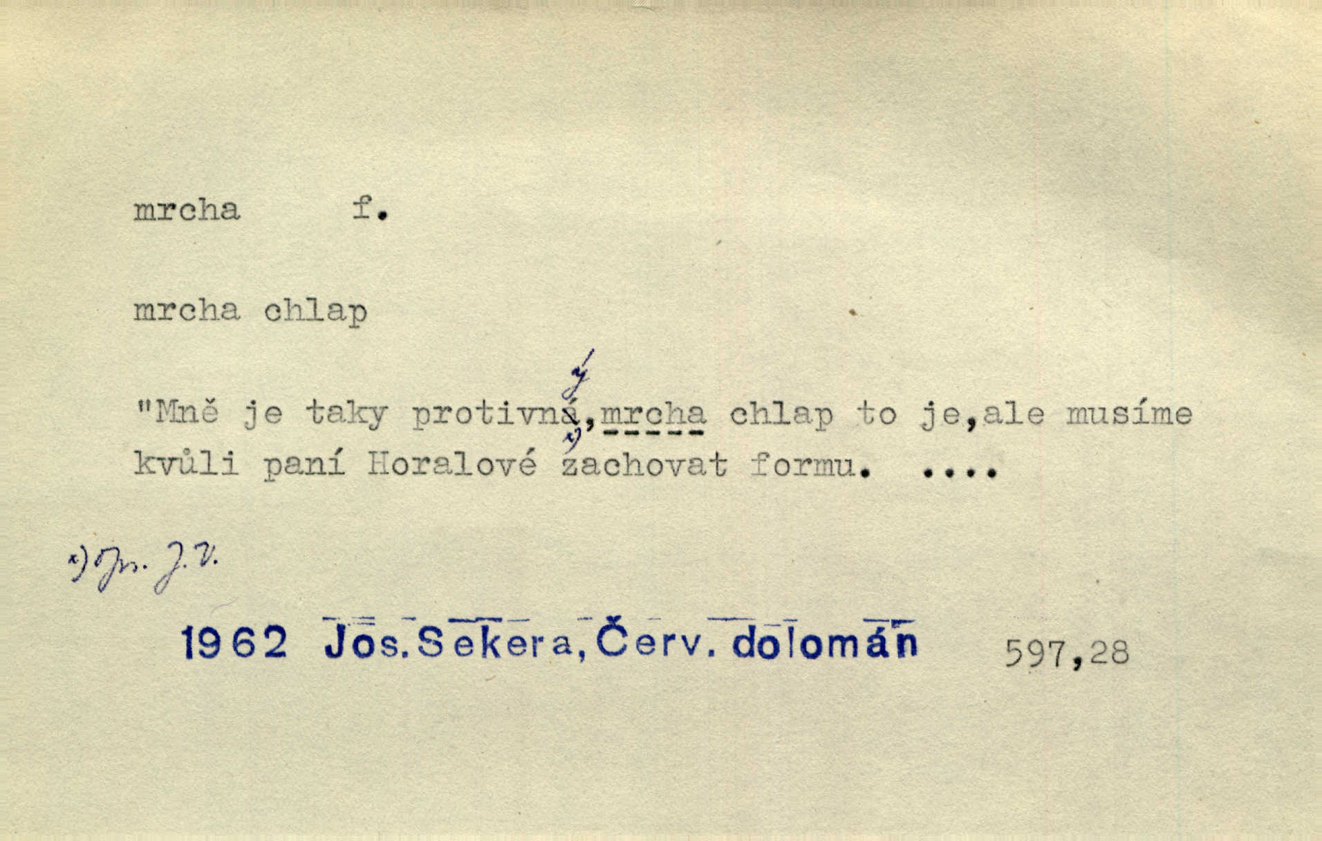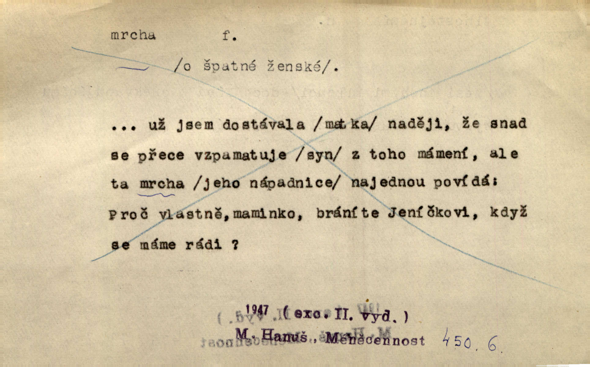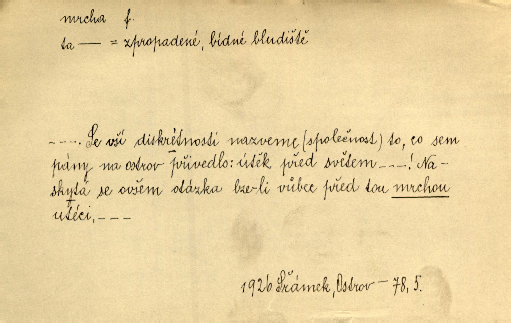 - mrcha, -y f. zvířecí mrtvola, zdechlina. Mnoho žoldnéřů meškalo ještě v poli, kde se černaly mrchy padlých koní. Jir. Přece nebudem zahrabávat lidi jako mrchy kdekoli. Baar. Sedly [vrány] na koně, držíce jej za mrchu. Něm. D Pejor. hubené zvíře, zvl. kůň. Přijel jsem v hanebné káře, tažené mrchou a ne koněm. Baar. A chrta vám měl, takovou vyzáblou mrchu, ale velikého. Jir. D Expr. nadávka někomu n. něčemu zlému, prohnanému, záludnému. Znáte špatně ženy. Každá jen se třese, ale jedna je větší mrcha druhé. Maria. Had, mrcha, vyskočil a milou princeznu uštknul. Kam. Vrabec je mrcha vyběračná. Herrm. Dobrý je to, mrcha… ještě jsem to nikdy nepil… Šrám. Náš radikál Link v tom ohledu je mrcha a své proposice má již hotovy. Šlej. Dial. též jako nesklonný přívlastek. Néspíš sami se řídili [hoši při zpěvu] — Mrcha, kluci! zatrolení. A. Mrš. Takové mrcha počasí nutí spát. Hol. Nestála ta salaš na místě zrovna záviděníhodném, když udeří mrcha čas. Knap.