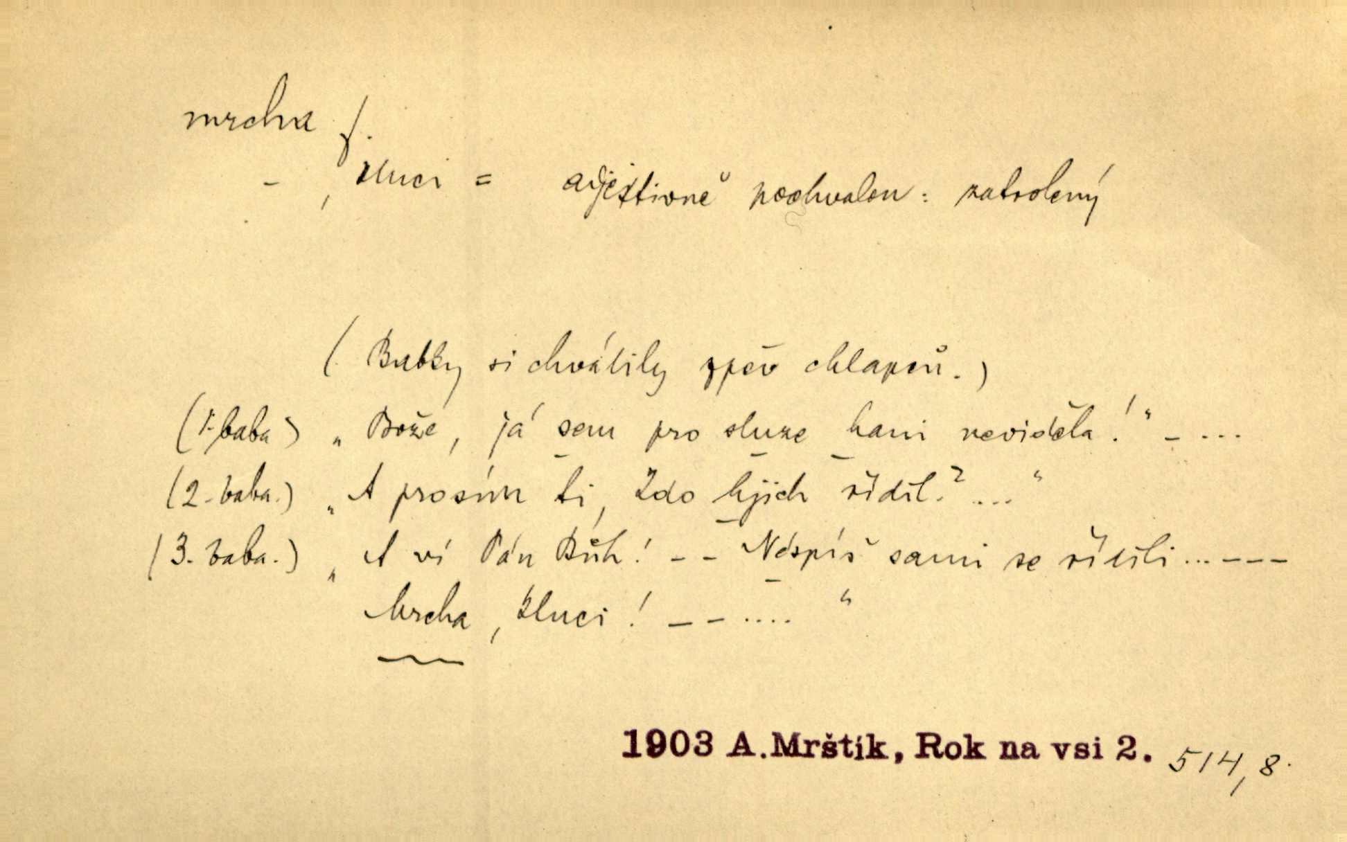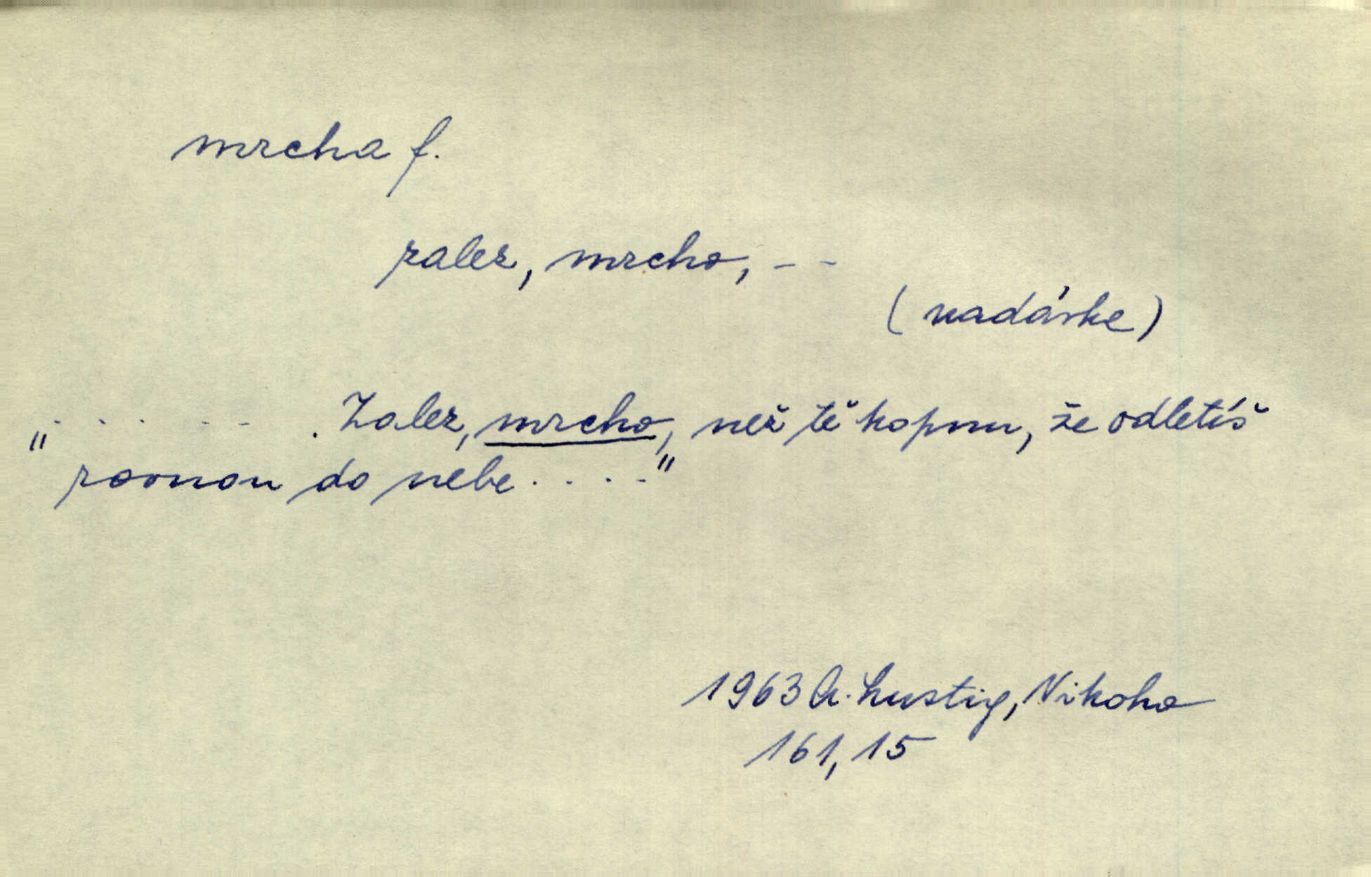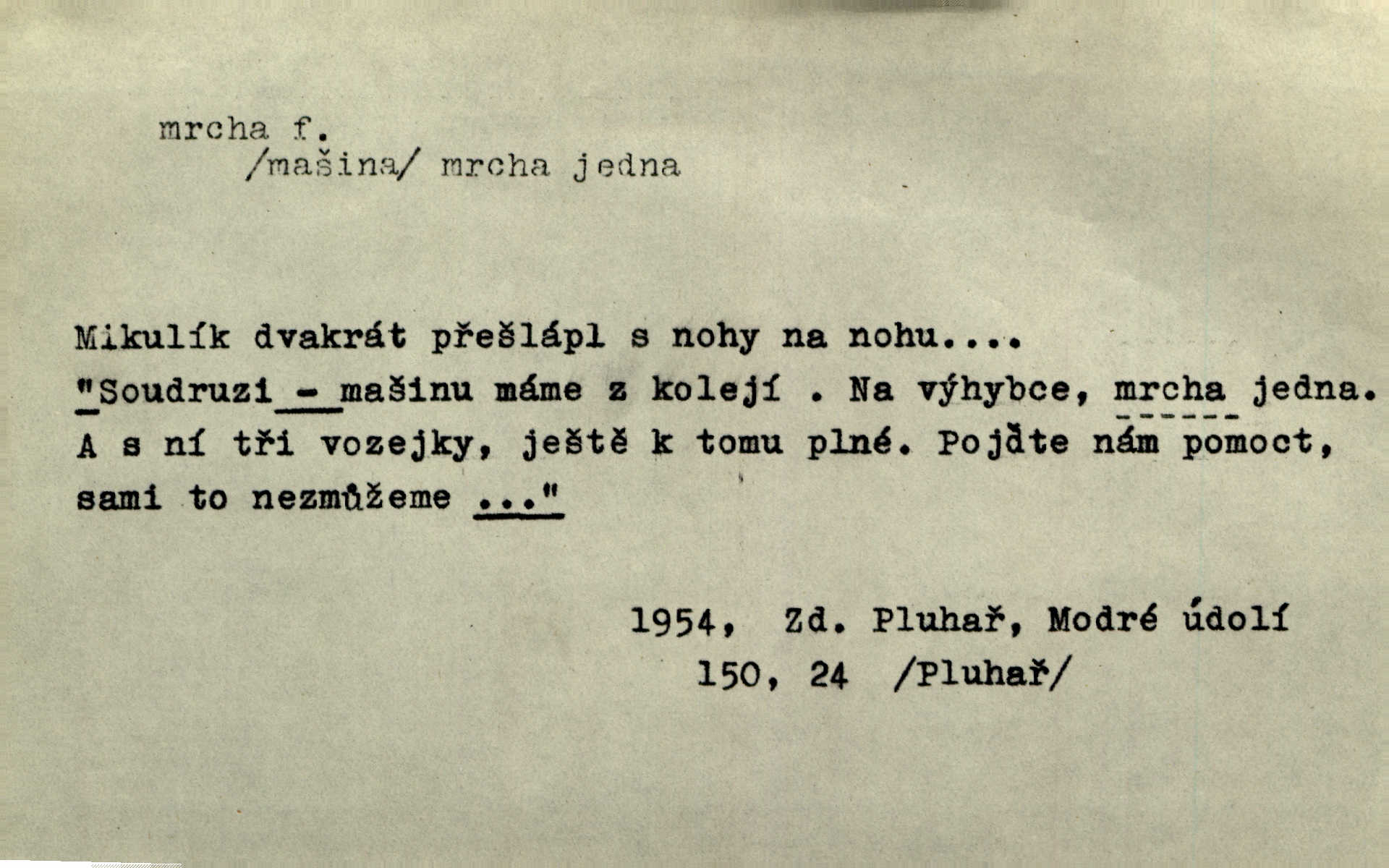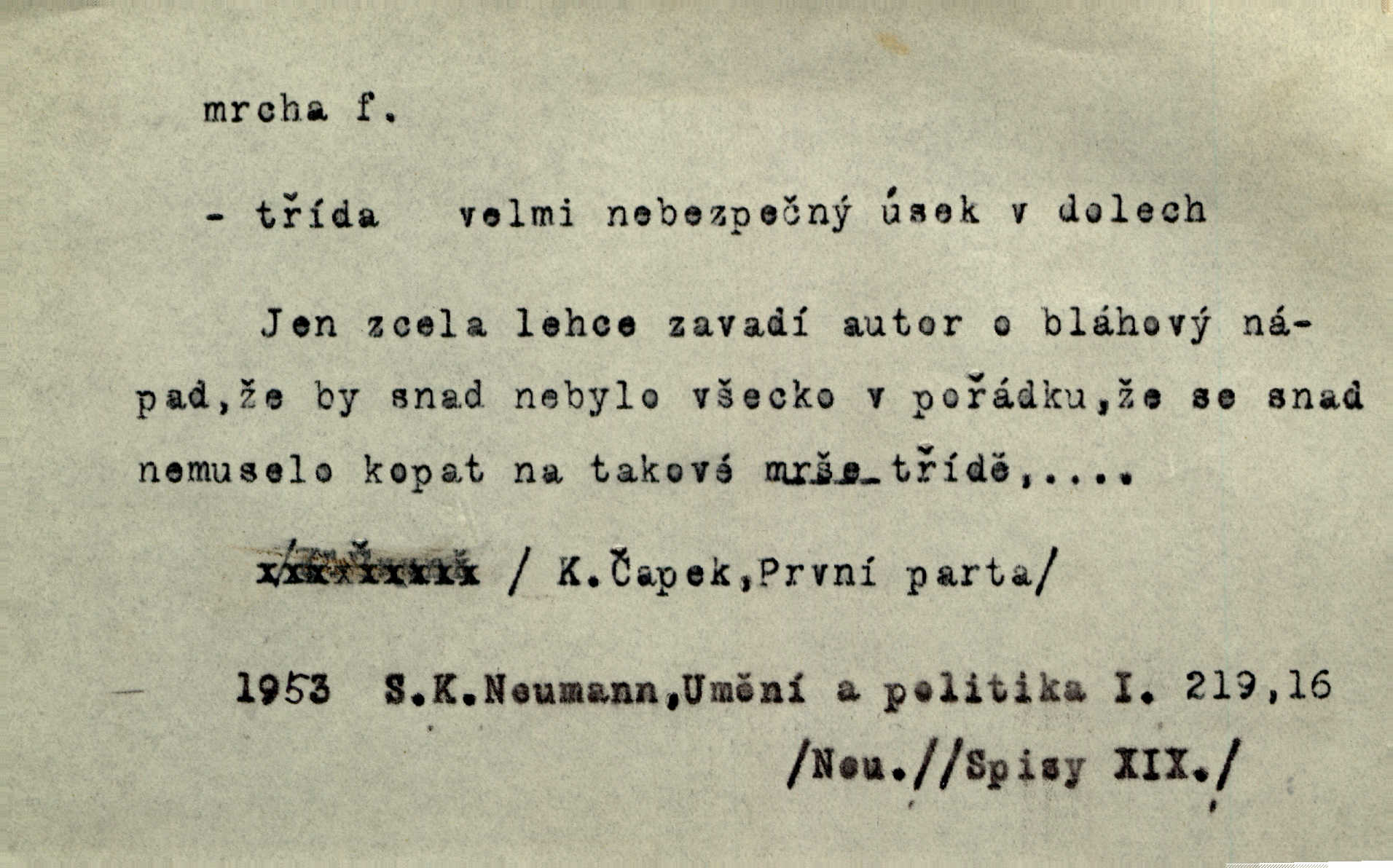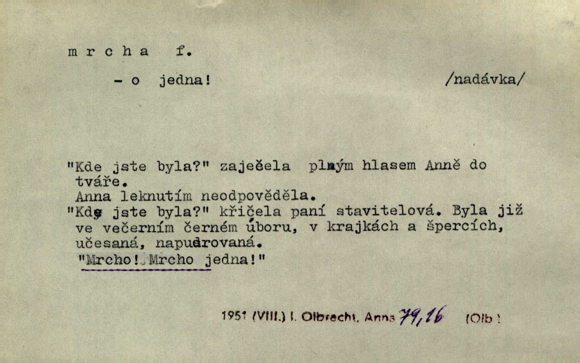 - mrcha, -y f. zvířecí mrtvola, zdechlina. Mnoho žoldnéřů meškalo ještě v poli, kde se černaly mrchy padlých koní. Jir. Přece nebudem zahrabávat lidi jako mrchy kdekoli. Baar. Sedly [vrány] na koně, držíce jej za mrchu. Něm. D Pejor. hubené zvíře, zvl. kůň. Přijel jsem v hanebné káře, tažené mrchou a ne koněm. Baar. A chrta vám měl, takovou vyzáblou mrchu, ale velikého. Jir. D Expr. nadávka někomu n. něčemu zlému, prohnanému, záludnému. Znáte špatně ženy. Každá jen se třese, ale jedna je větší mrcha druhé. Maria. Had, mrcha, vyskočil a milou princeznu uštknul. Kam. Vrabec je mrcha vyběračná. Herrm. Dobrý je to, mrcha… ještě jsem to nikdy nepil… Šrám. Náš radikál Link v tom ohledu je mrcha a své proposice má již hotovy. Šlej. Dial. též jako nesklonný přívlastek. Néspíš sami se řídili [hoši při zpěvu] — Mrcha, kluci! zatrolení. A. Mrš. Takové mrcha počasí nutí spát. Hol. Nestála ta salaš na místě zrovna záviděníhodném, když udeří mrcha čas. Knap.