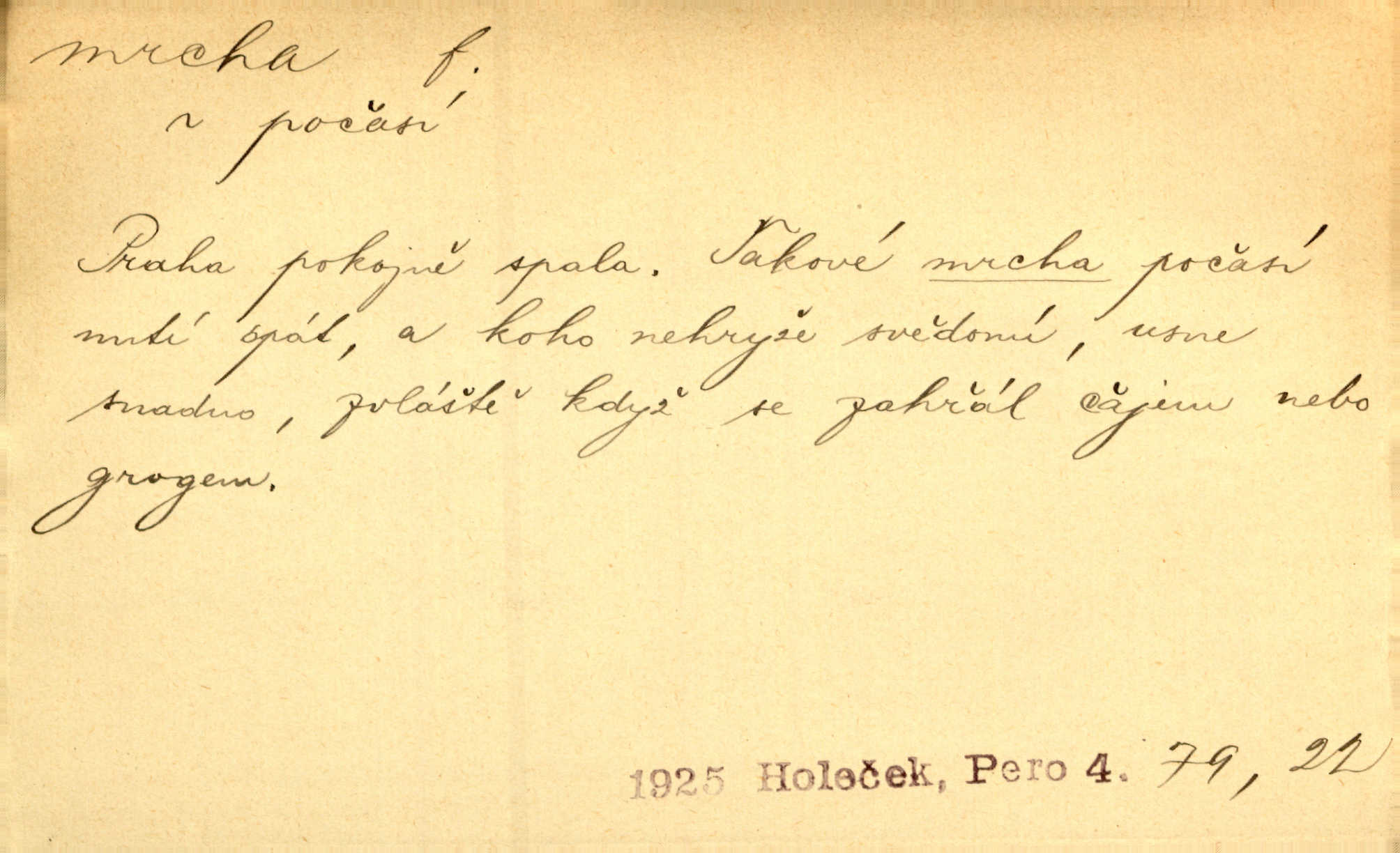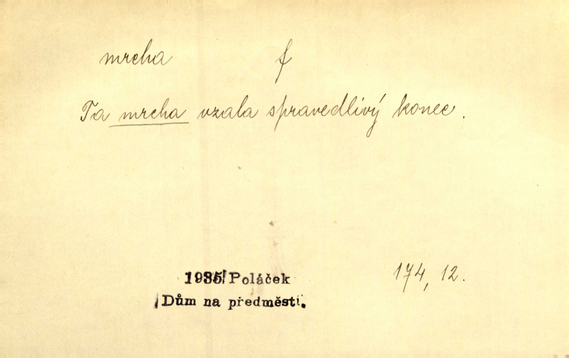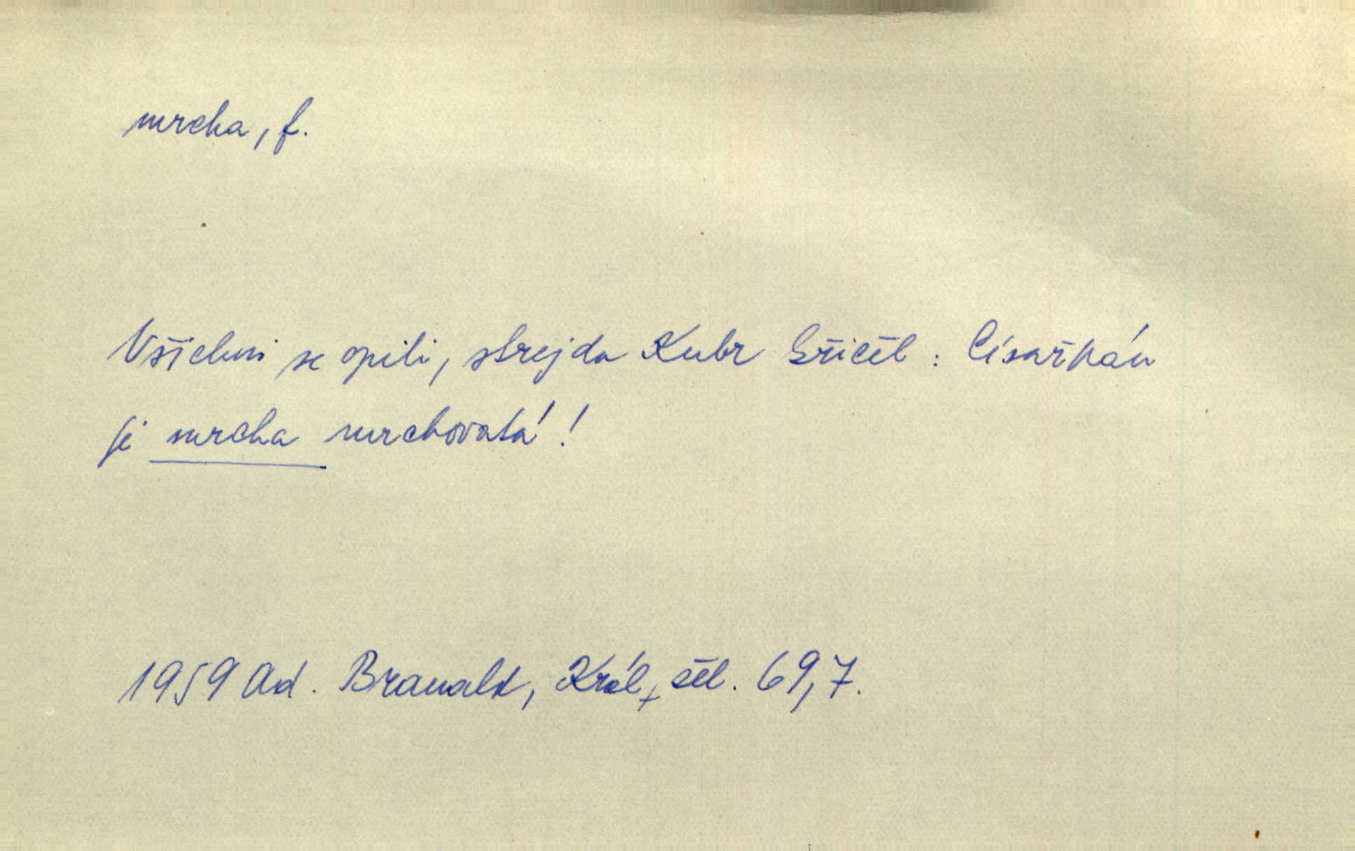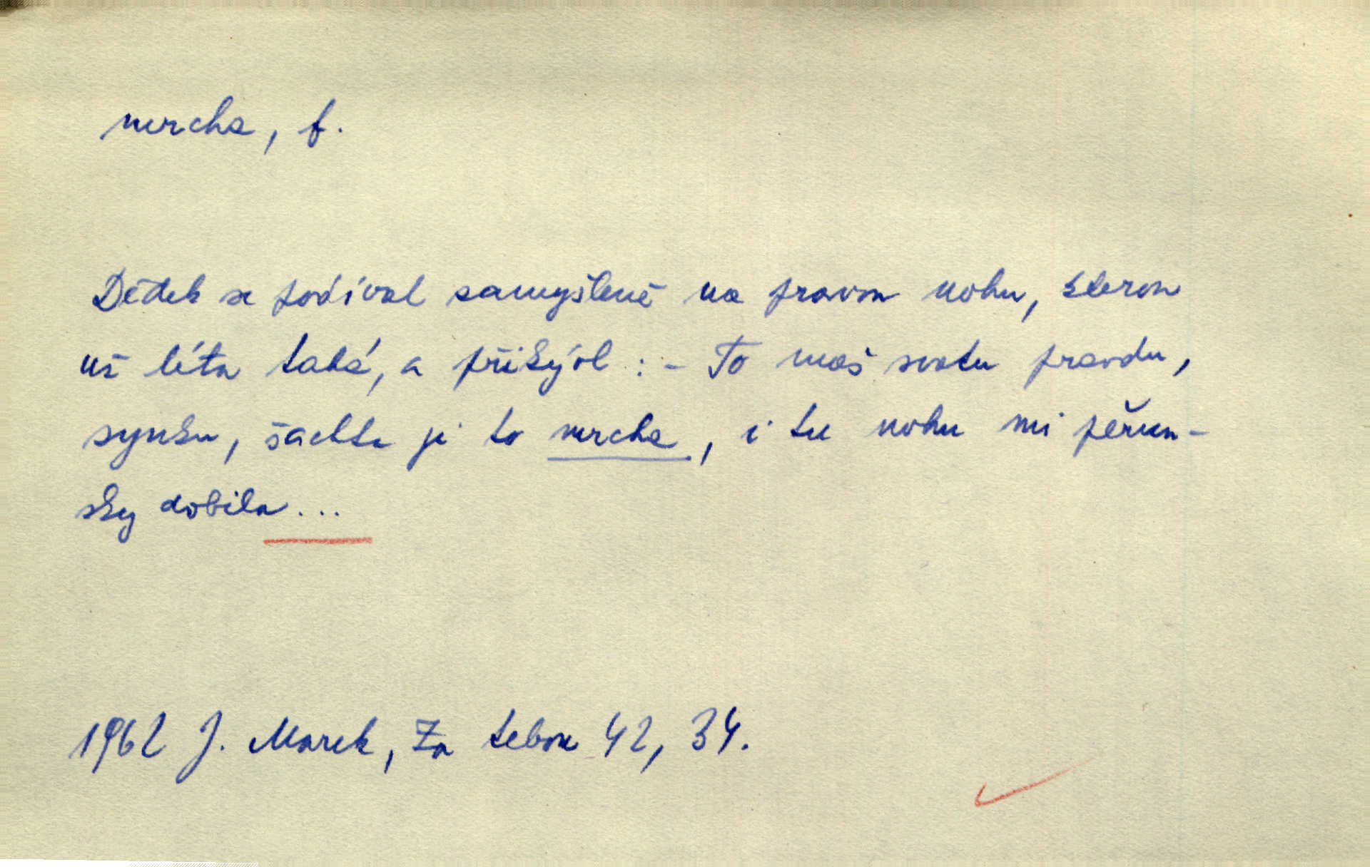 - mrcha, -y f. zvířecí mrtvola, zdechlina. Mnoho žoldnéřů meškalo ještě v poli, kde se černaly mrchy padlých koní. Jir. Přece nebudem zahrabávat lidi jako mrchy kdekoli. Baar. Sedly [vrány] na koně, držíce jej za mrchu. Něm. D Pejor. hubené zvíře, zvl. kůň. Přijel jsem v hanebné káře, tažené mrchou a ne koněm. Baar. A chrta vám měl, takovou vyzáblou mrchu, ale velikého. Jir. D Expr. nadávka někomu n. něčemu zlému, prohnanému, záludnému. Znáte špatně ženy. Každá jen se třese, ale jedna je větší mrcha druhé. Maria. Had, mrcha, vyskočil a milou princeznu uštknul. Kam. Vrabec je mrcha vyběračná. Herrm. Dobrý je to, mrcha… ještě jsem to nikdy nepil… Šrám. Náš radikál Link v tom ohledu je mrcha a své proposice má již hotovy. Šlej. Dial. též jako nesklonný přívlastek. Néspíš sami se řídili [hoši při zpěvu] — Mrcha, kluci! zatrolení. A. Mrš. Takové mrcha počasí nutí spát. Hol. Nestála ta salaš na místě zrovna záviděníhodném, když udeří mrcha čas. Knap.