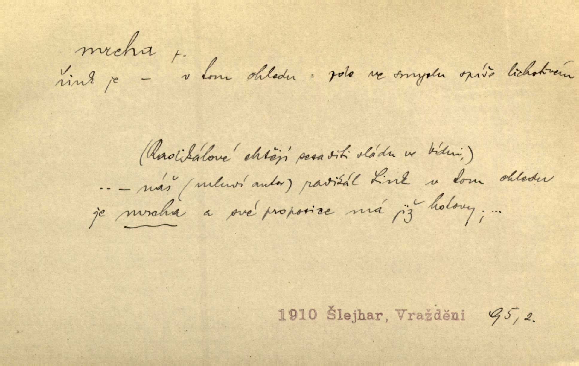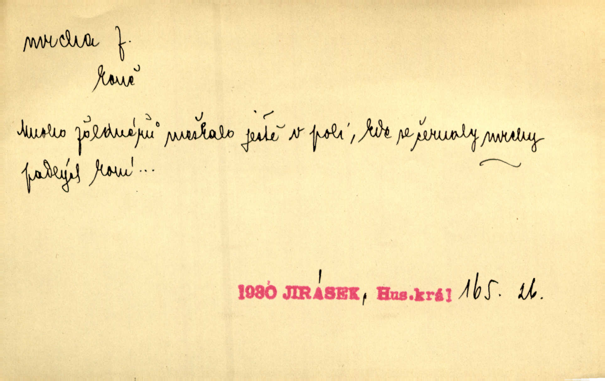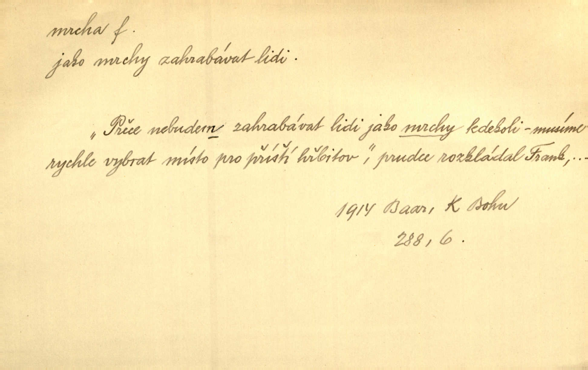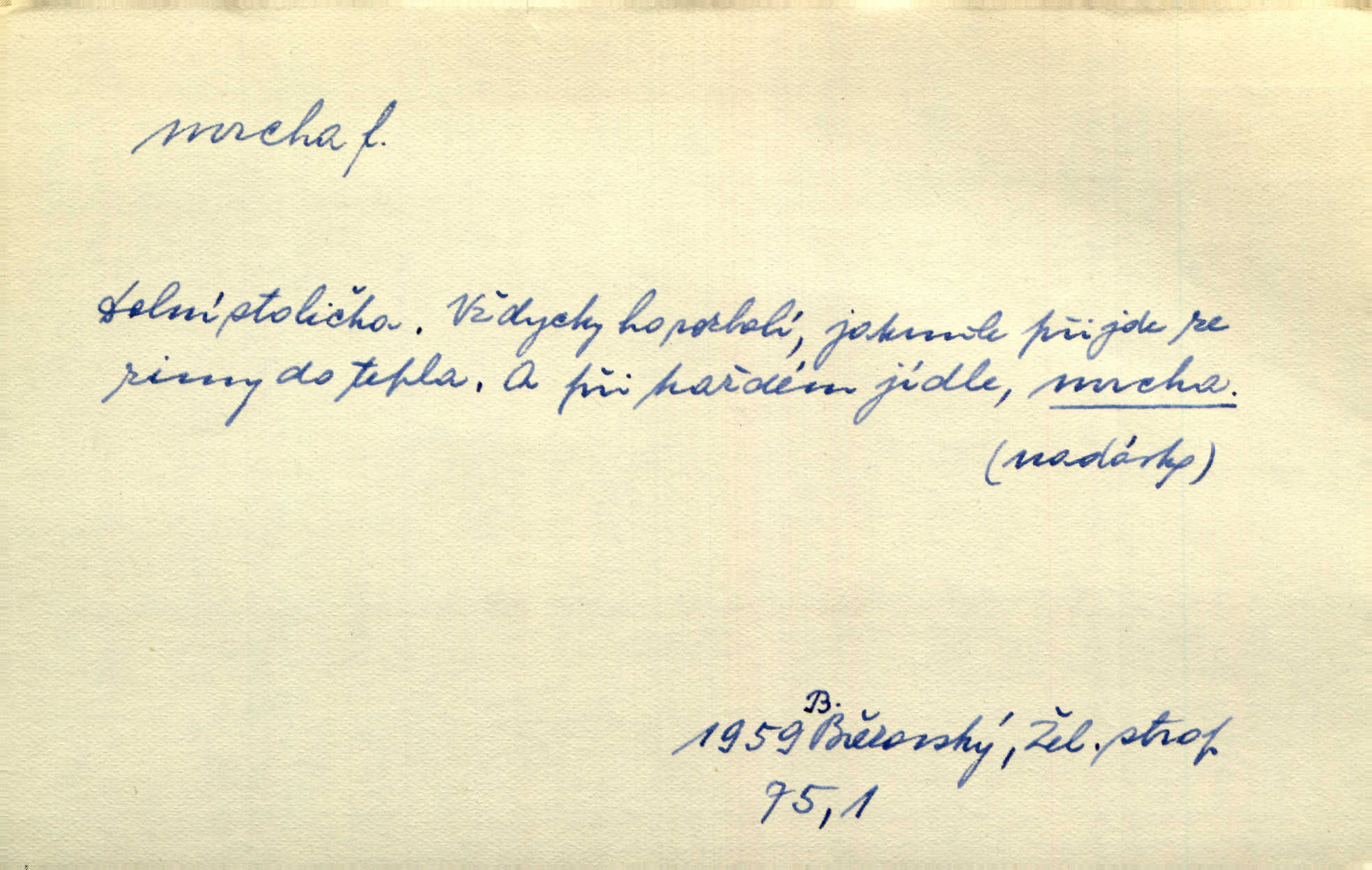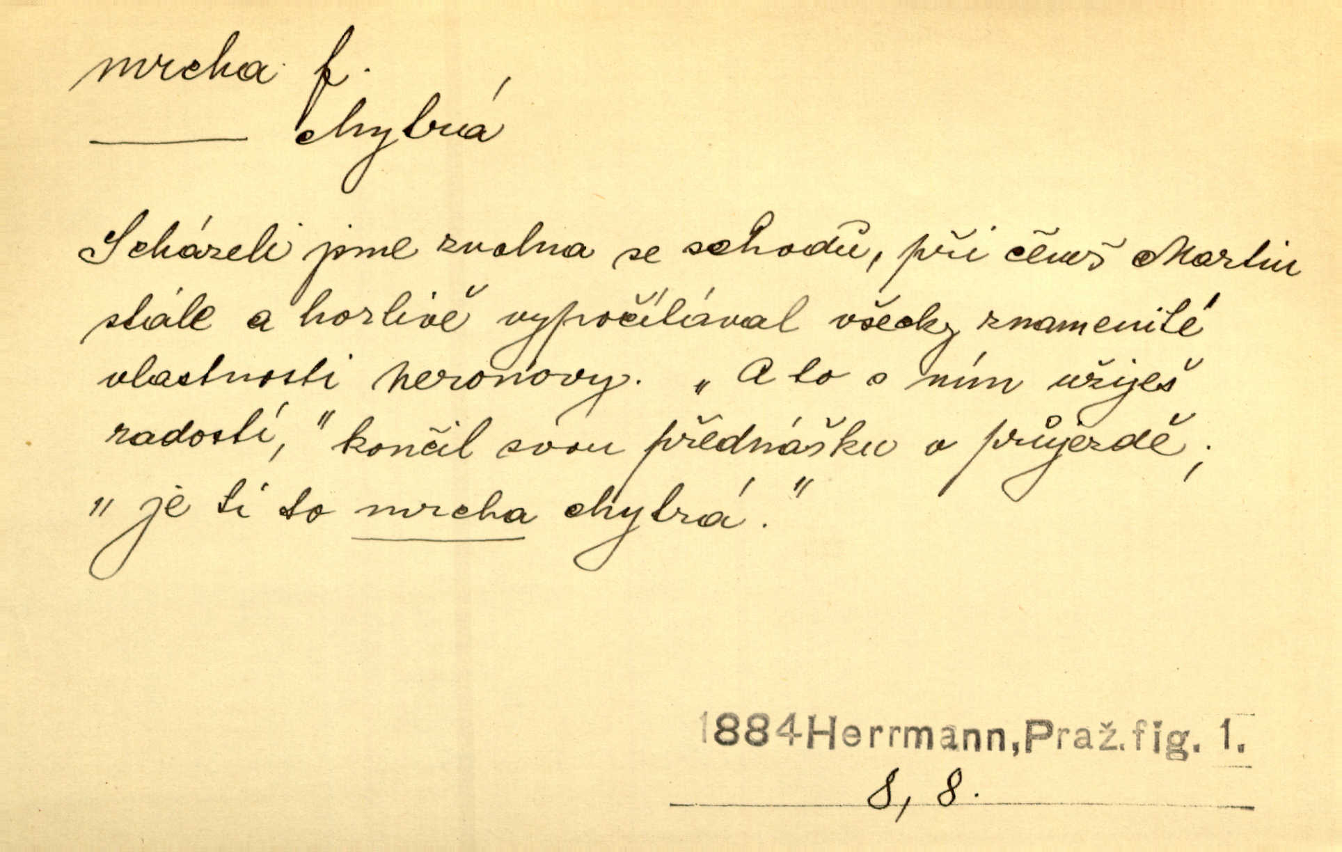 - mrcha, -y f. zvířecí mrtvola, zdechlina. Mnoho žoldnéřů meškalo ještě v poli, kde se černaly mrchy padlých koní. Jir. Přece nebudem zahrabávat lidi jako mrchy kdekoli. Baar. Sedly [vrány] na koně, držíce jej za mrchu. Něm. D Pejor. hubené zvíře, zvl. kůň. Přijel jsem v hanebné káře, tažené mrchou a ne koněm. Baar. A chrta vám měl, takovou vyzáblou mrchu, ale velikého. Jir. D Expr. nadávka někomu n. něčemu zlému, prohnanému, záludnému. Znáte špatně ženy. Každá jen se třese, ale jedna je větší mrcha druhé. Maria. Had, mrcha, vyskočil a milou princeznu uštknul. Kam. Vrabec je mrcha vyběračná. Herrm. Dobrý je to, mrcha… ještě jsem to nikdy nepil… Šrám. Náš radikál Link v tom ohledu je mrcha a své proposice má již hotovy. Šlej. Dial. též jako nesklonný přívlastek. Néspíš sami se řídili [hoši při zpěvu] — Mrcha, kluci! zatrolení. A. Mrš. Takové mrcha počasí nutí spát. Hol. Nestála ta salaš na místě zrovna záviděníhodném, když udeří mrcha čas. Knap.