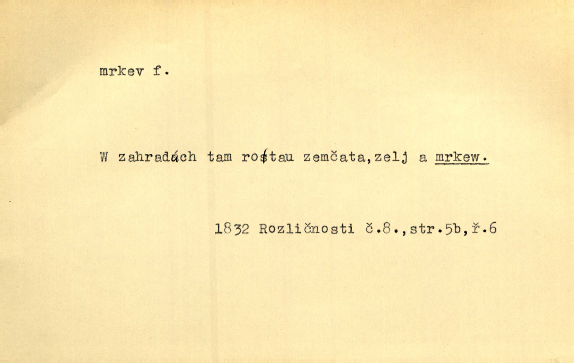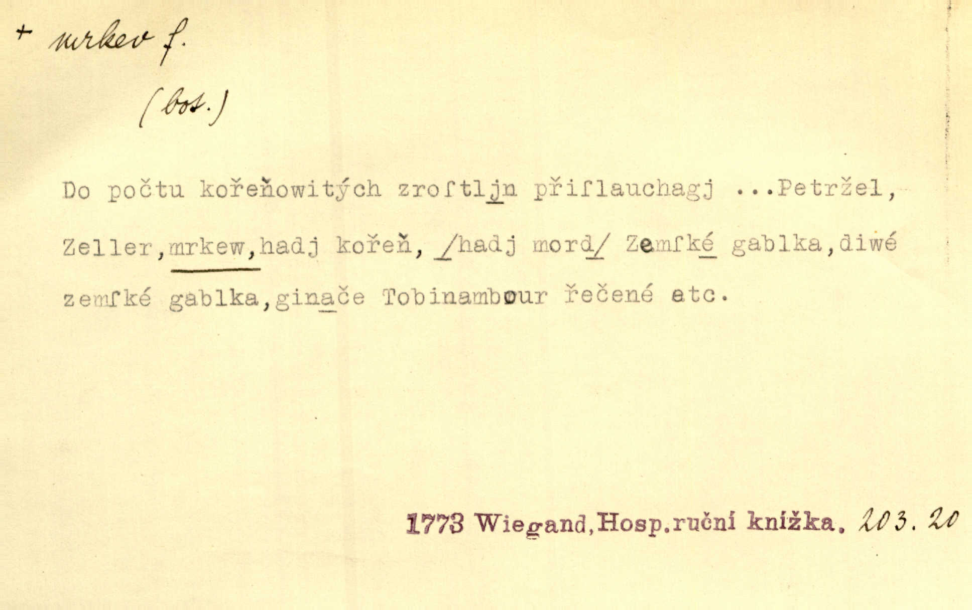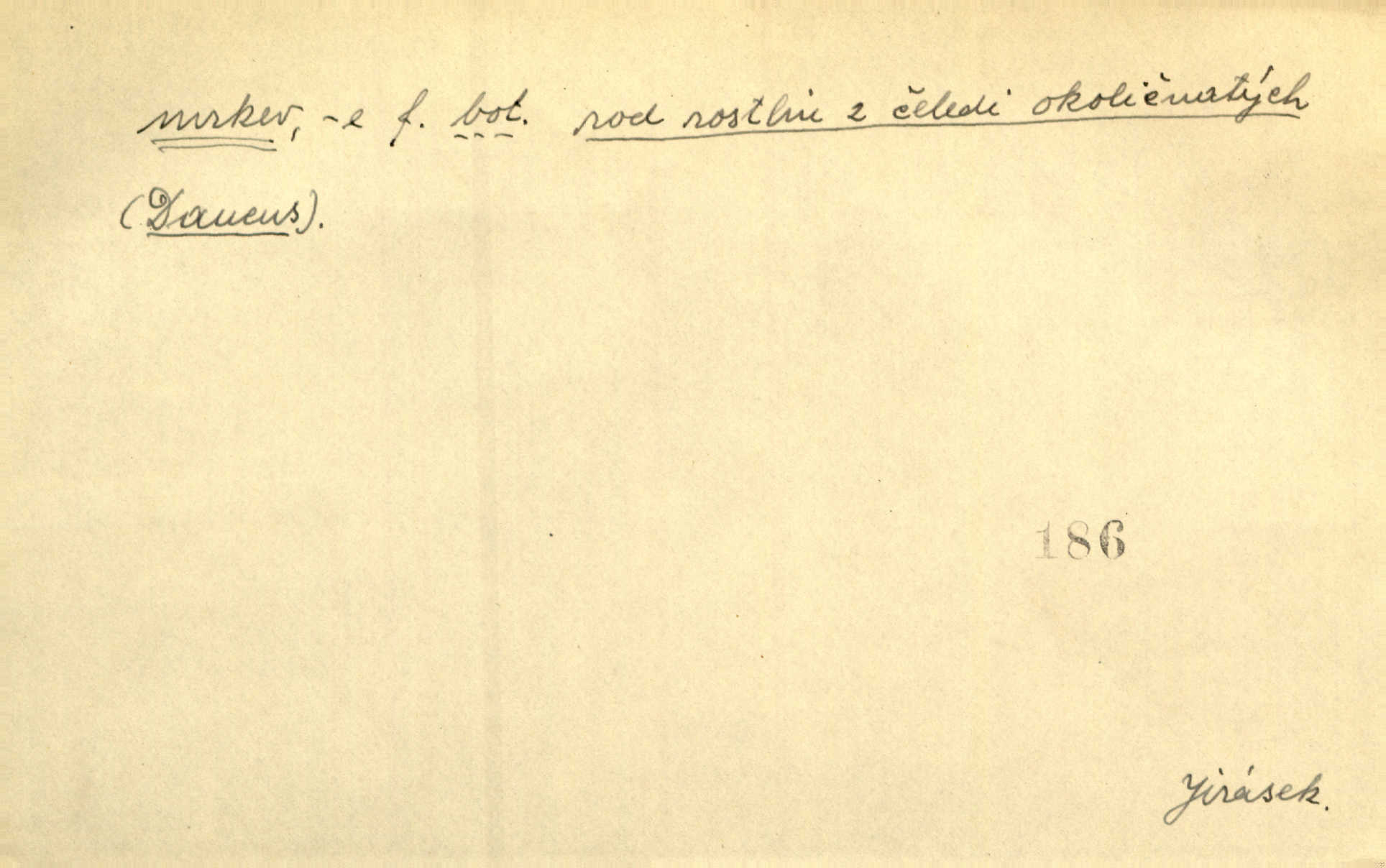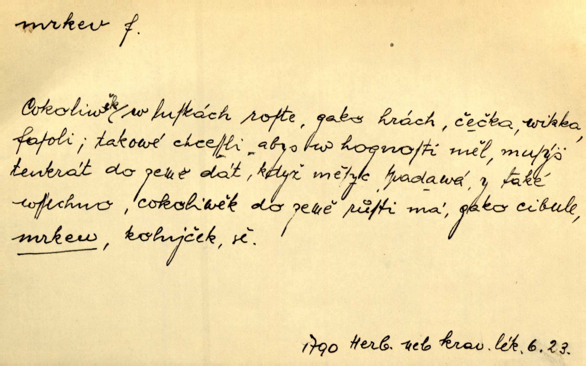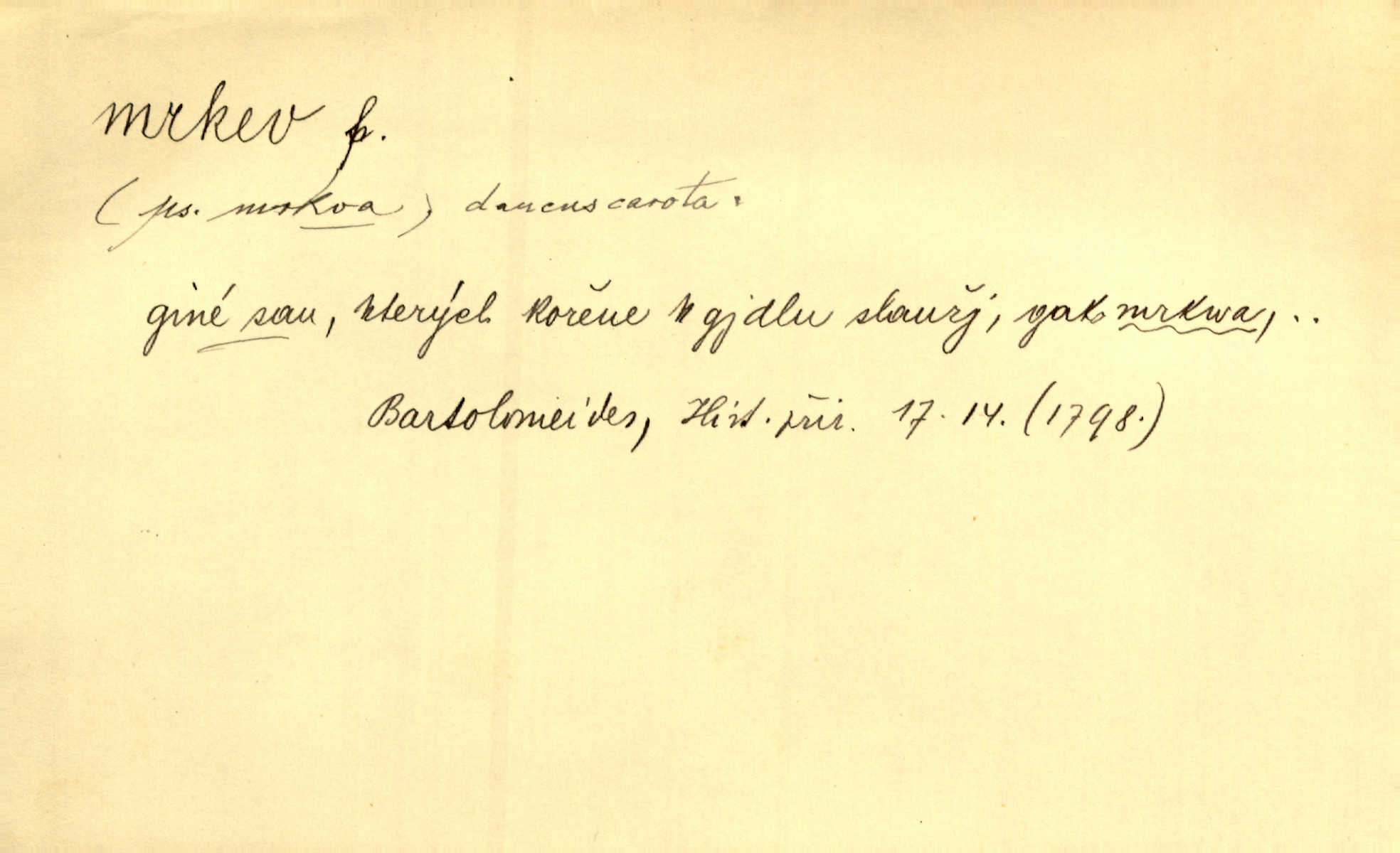 - mrkev, -kve f. druh zeleniny. Zahrady se zelím, cibulí, brambory, mrkví. Havl. Na stole se objevila vepřová s mrkví. Čap. Ch. Hoch láme těžké damascenské meče jako mrkve — kdo umí to v celé říši? Vrch. Bot. rod rostlin z čeledi okoličnatých, Daucus.