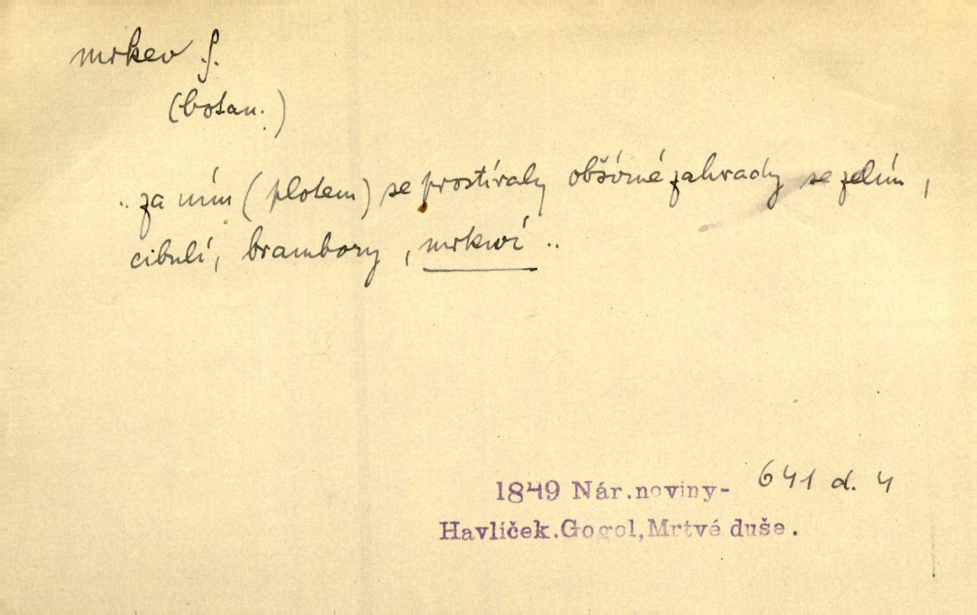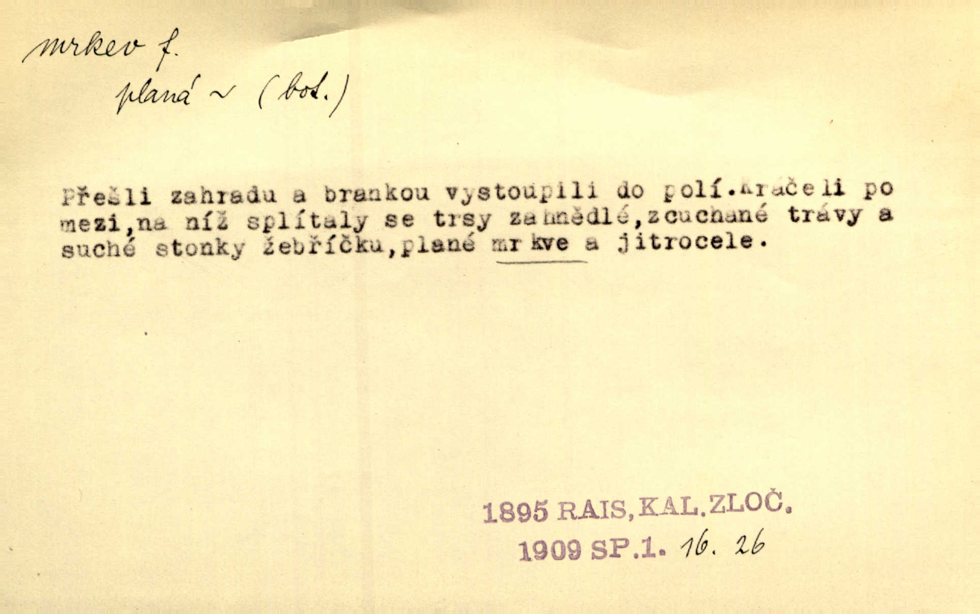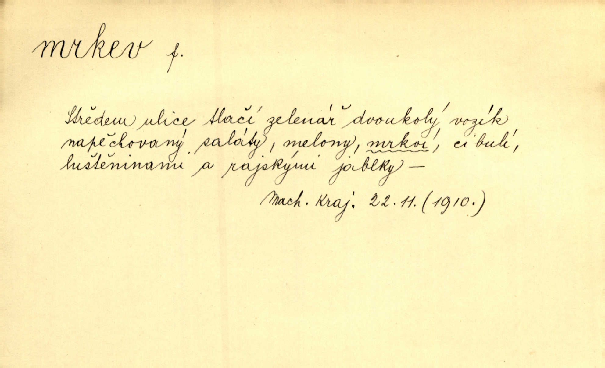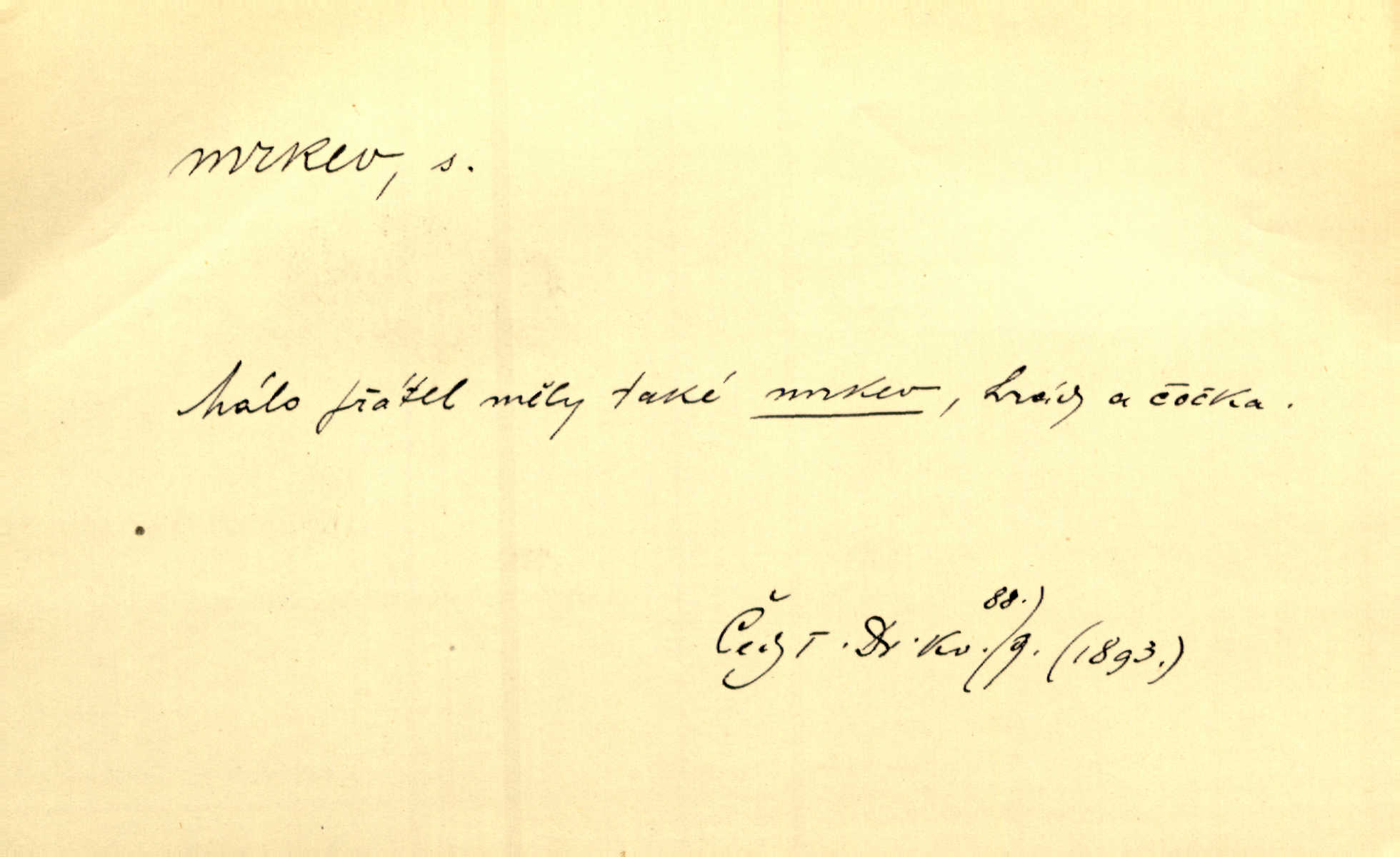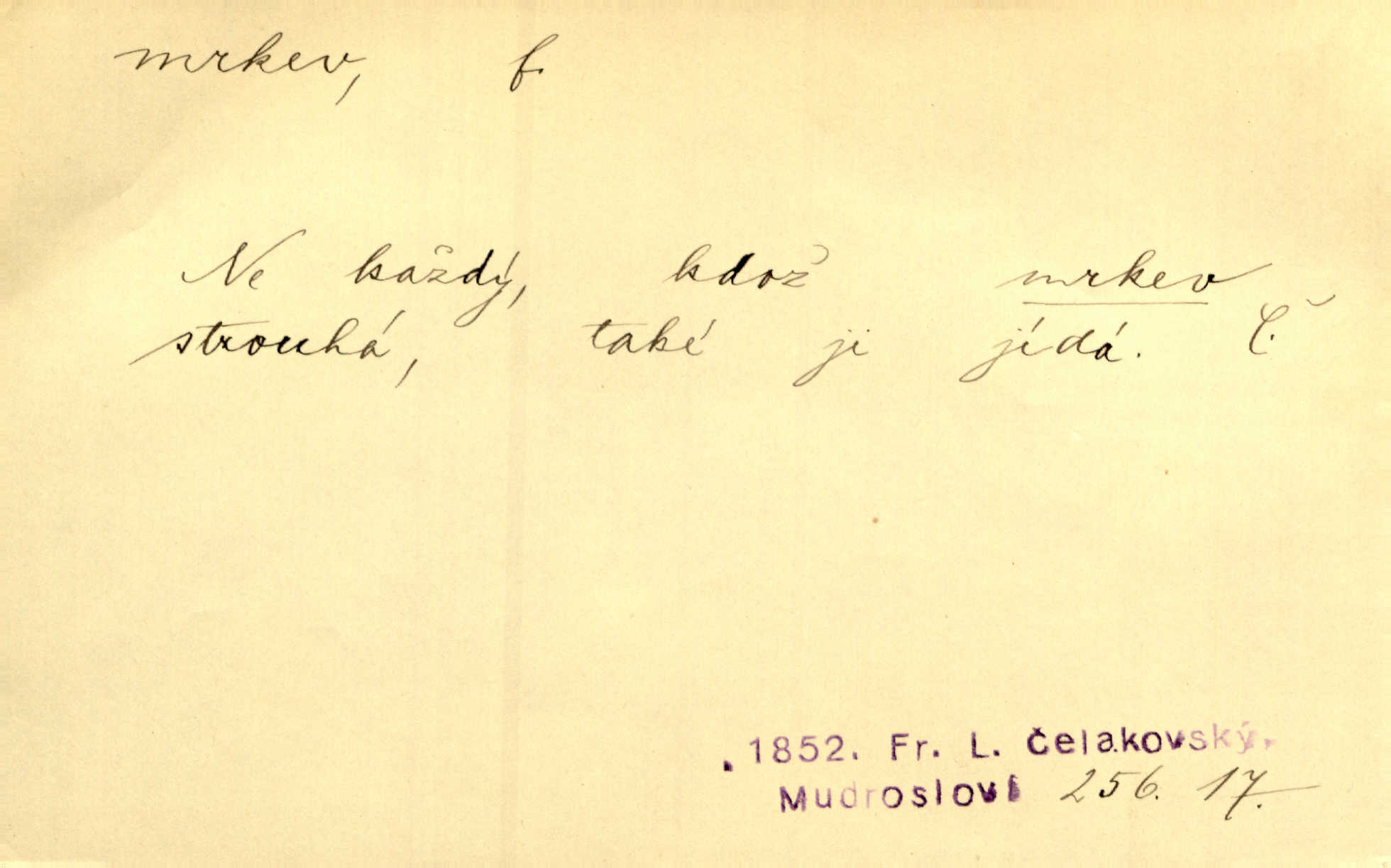 - mrkev, -kve f. druh zeleniny. Zahrady se zelím, cibulí, brambory, mrkví. Havl. Na stole se objevila vepřová s mrkví. Čap. Ch. Hoch láme těžké damascenské meče jako mrkve — kdo umí to v celé říši? Vrch. Bot. rod rostlin z čeledi okoličnatých, Daucus.