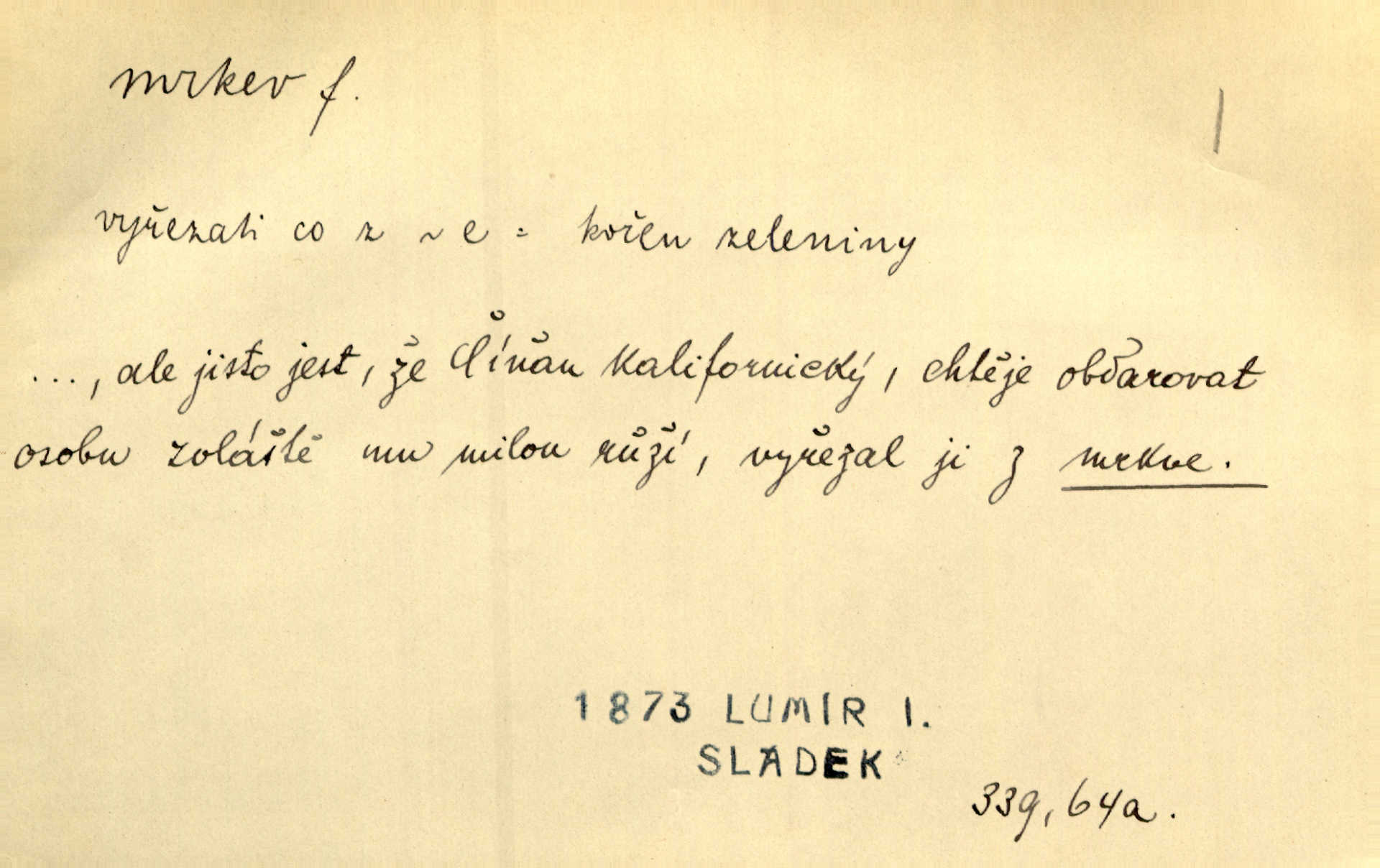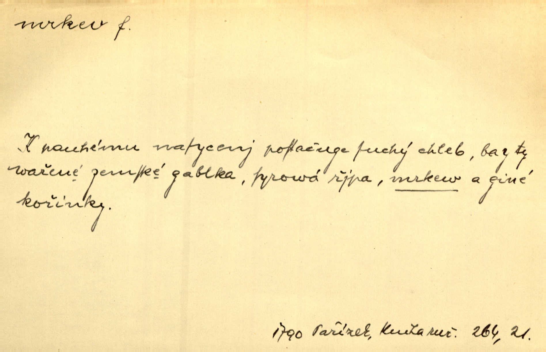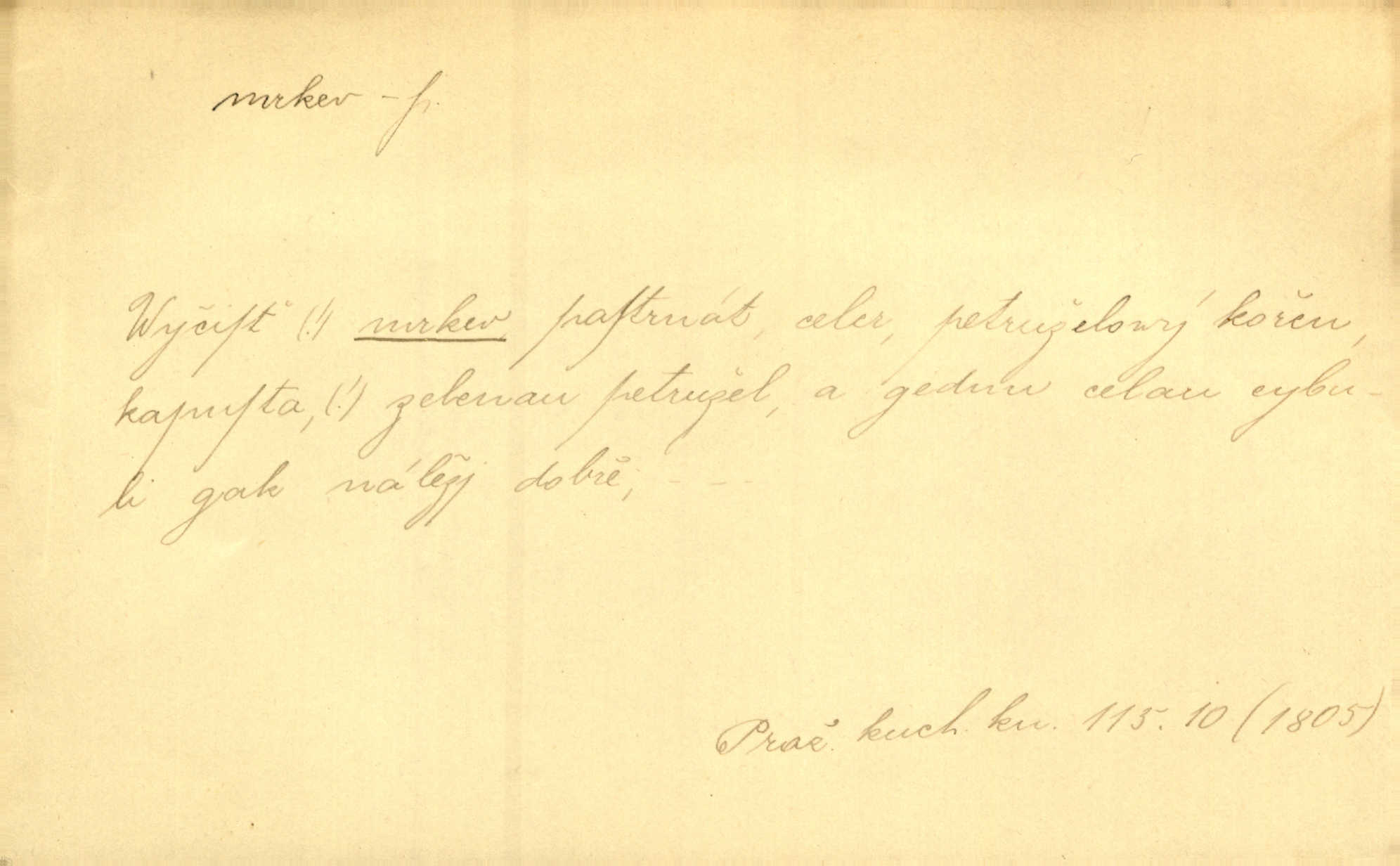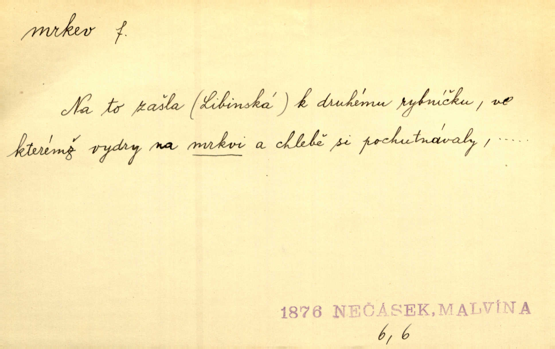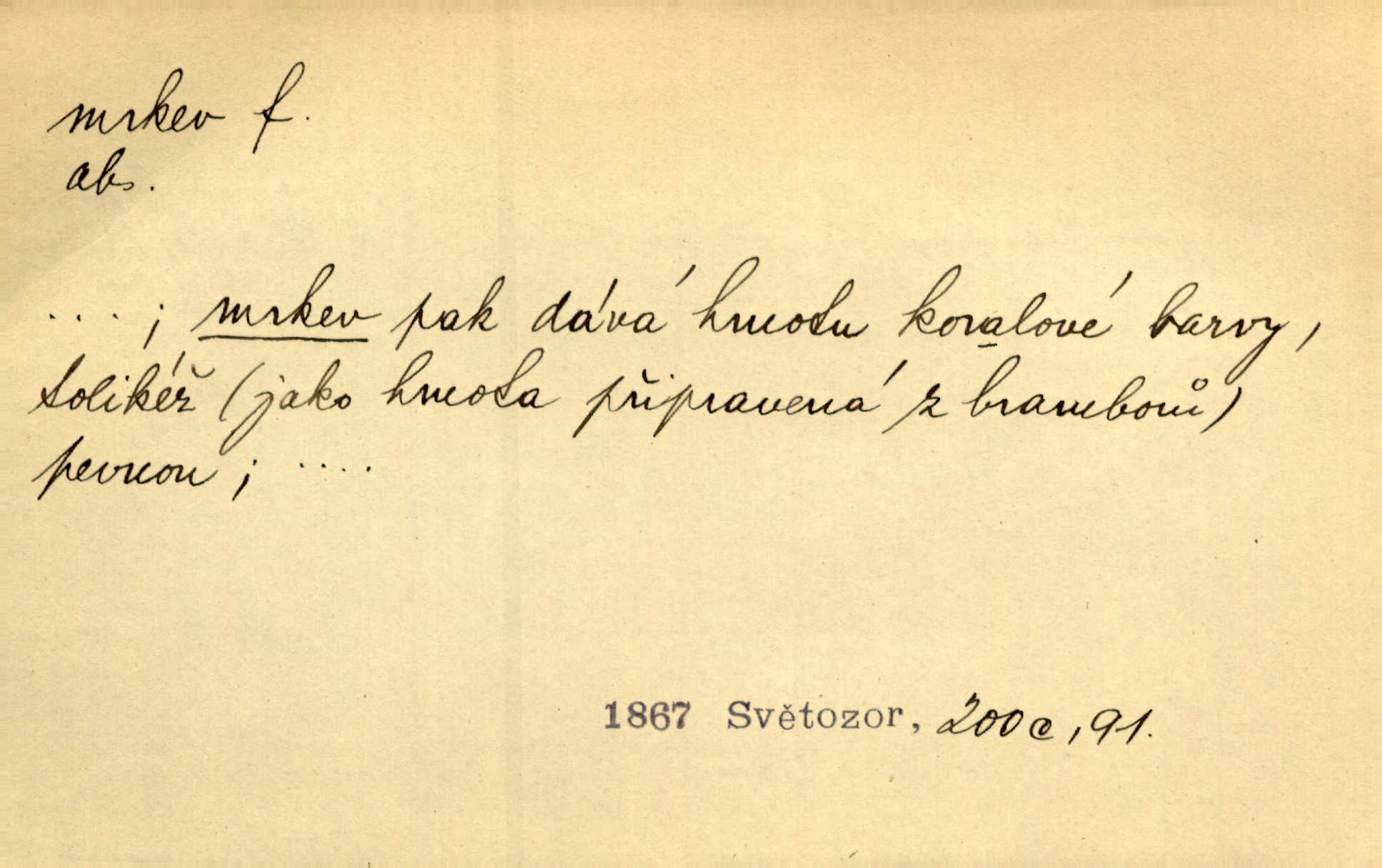 - mrkev, -kve f. druh zeleniny. Zahrady se zelím, cibulí, brambory, mrkví. Havl. Na stole se objevila vepřová s mrkví. Čap. Ch. Hoch láme těžké damascenské meče jako mrkve — kdo umí to v celé říši? Vrch. Bot. rod rostlin z čeledi okoličnatých, Daucus.