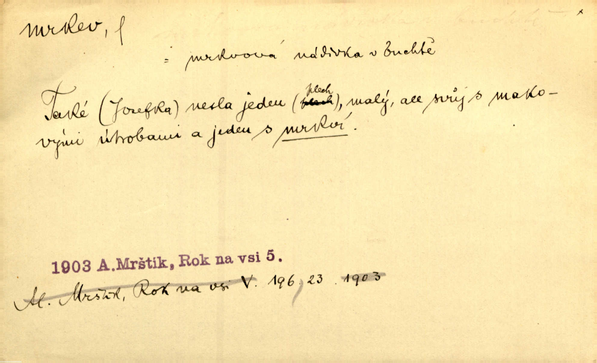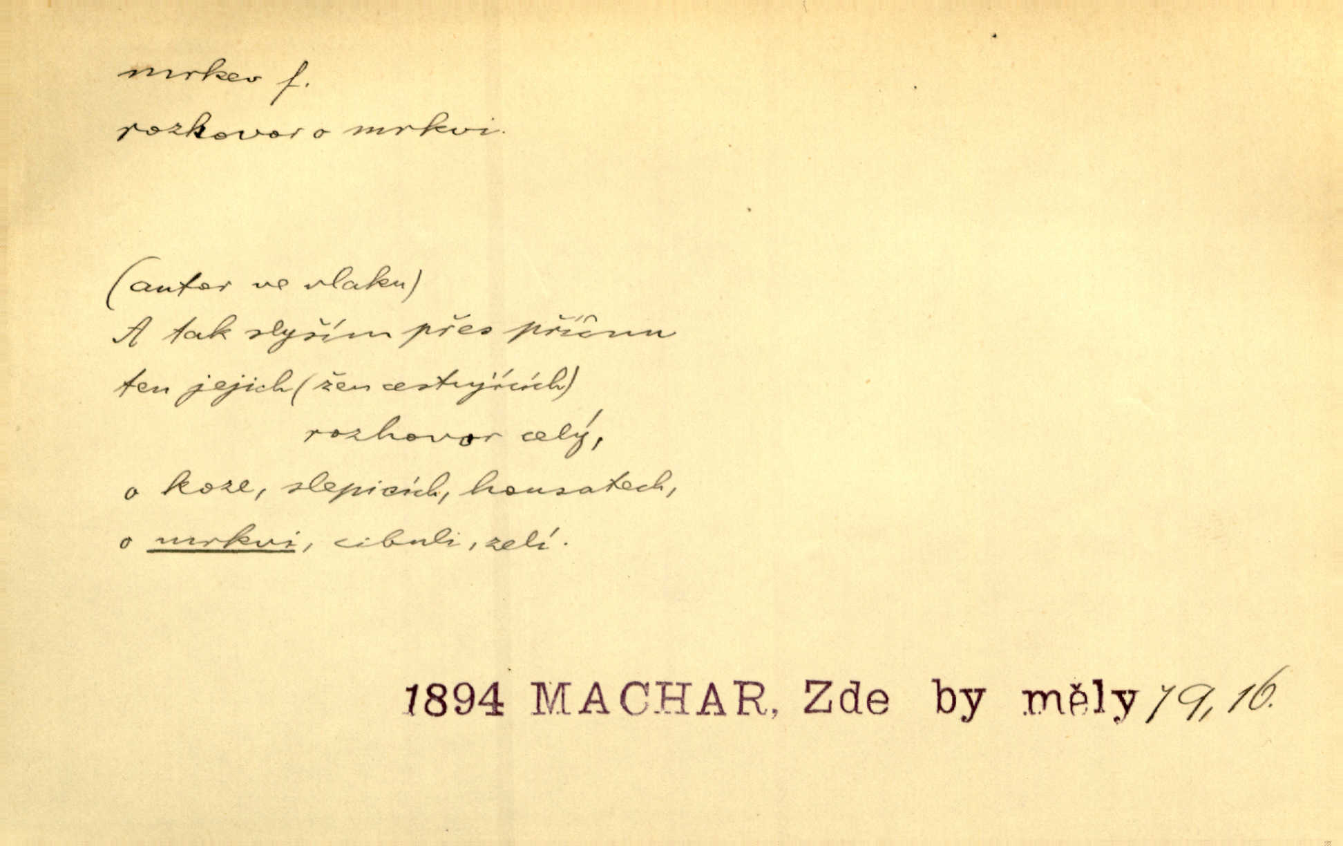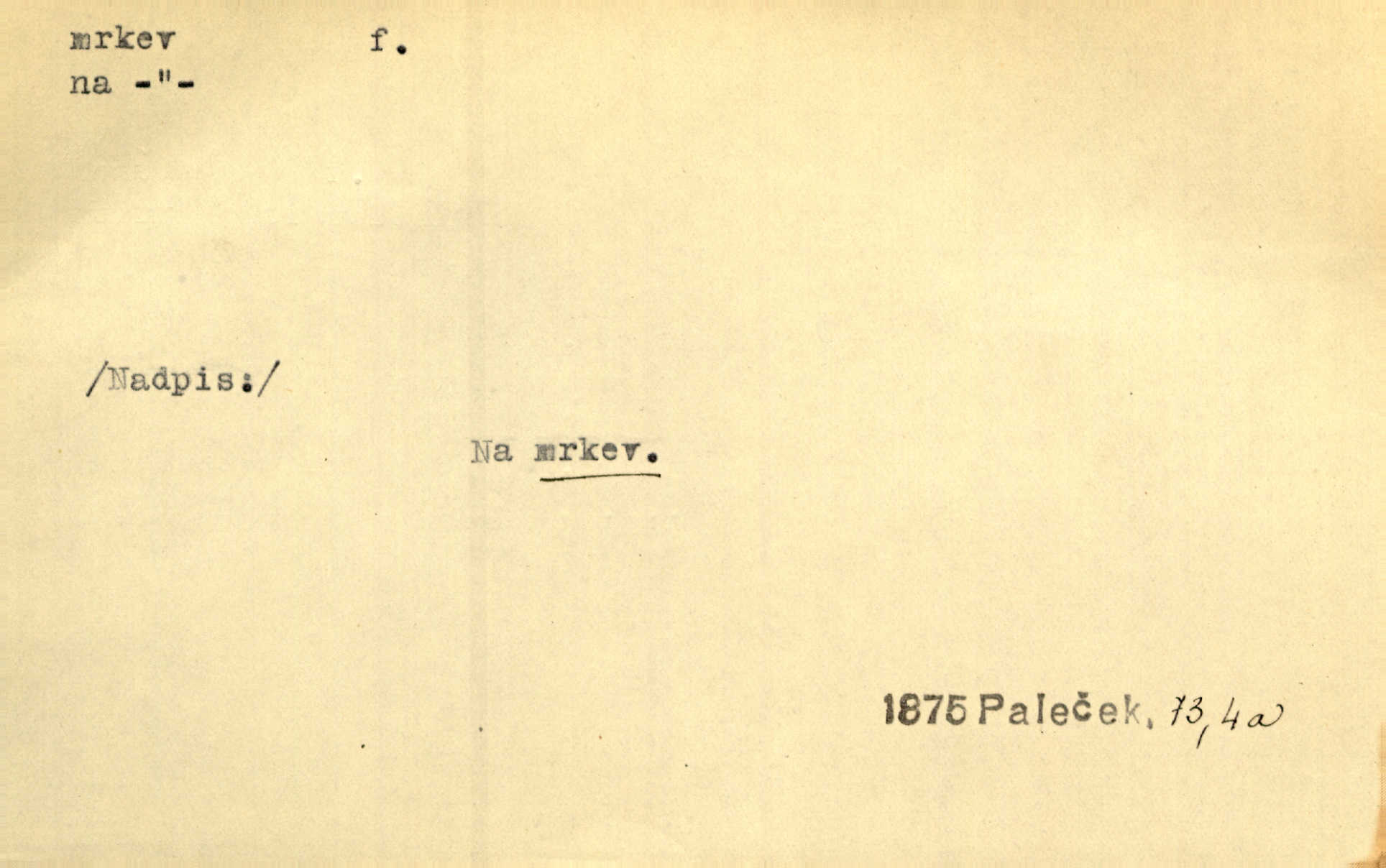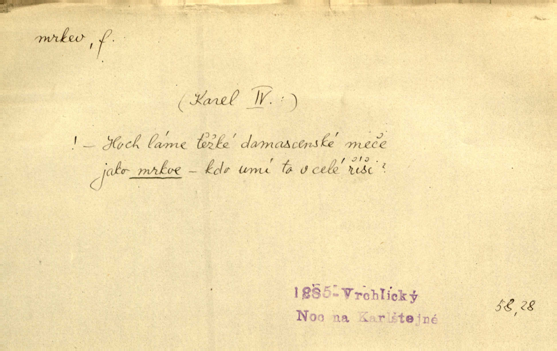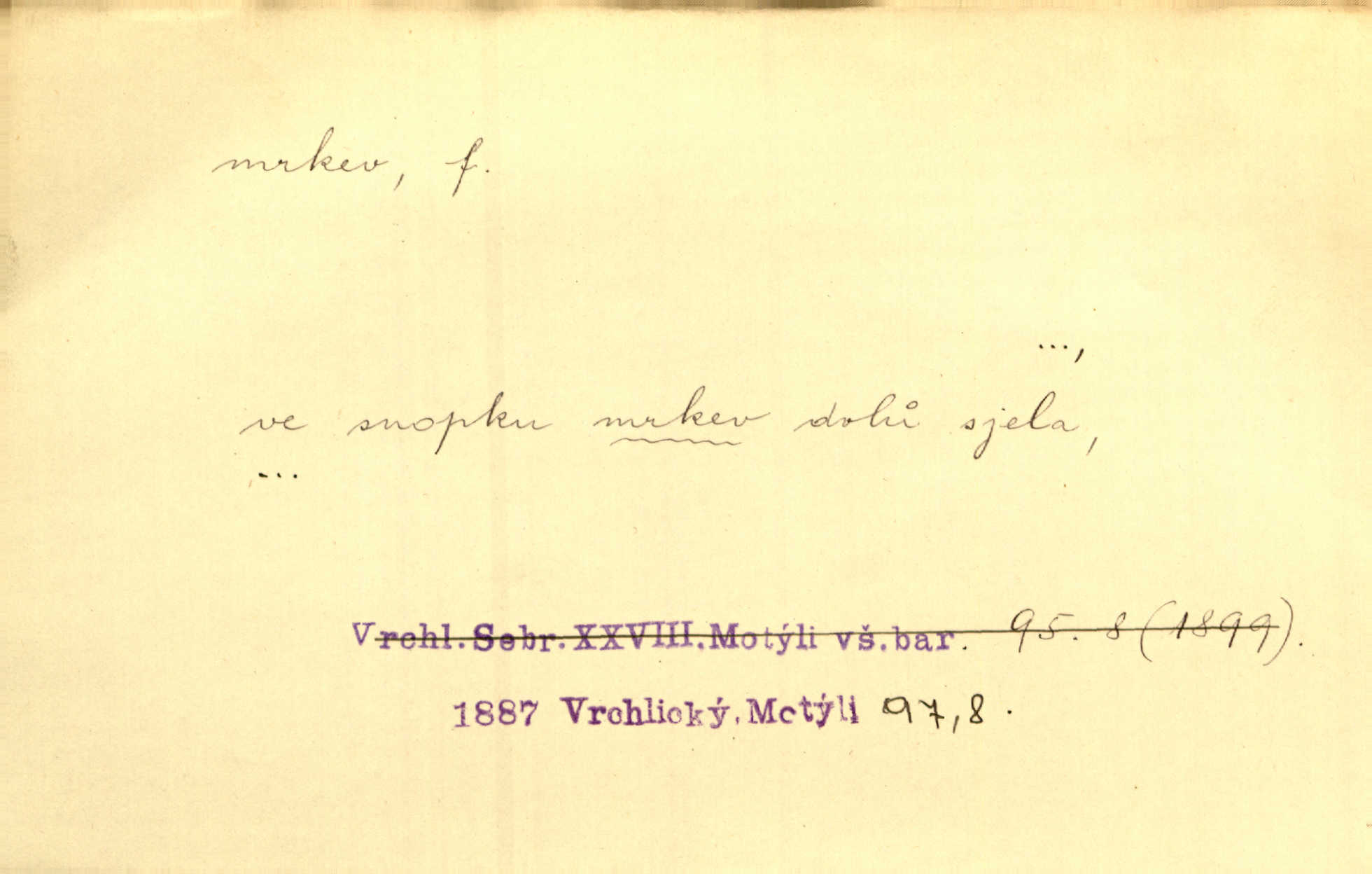 - mrkev, -kve f. druh zeleniny. Zahrady se zelím, cibulí, brambory, mrkví. Havl. Na stole se objevila vepřová s mrkví. Čap. Ch. Hoch láme těžké damascenské meče jako mrkve — kdo umí to v celé říši? Vrch. Bot. rod rostlin z čeledi okoličnatých, Daucus.