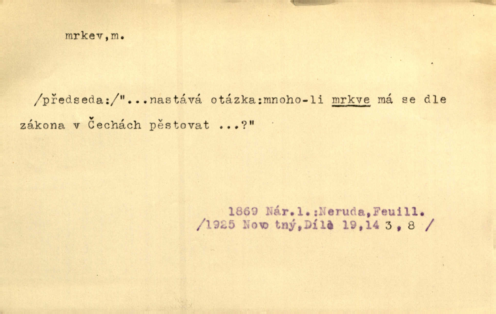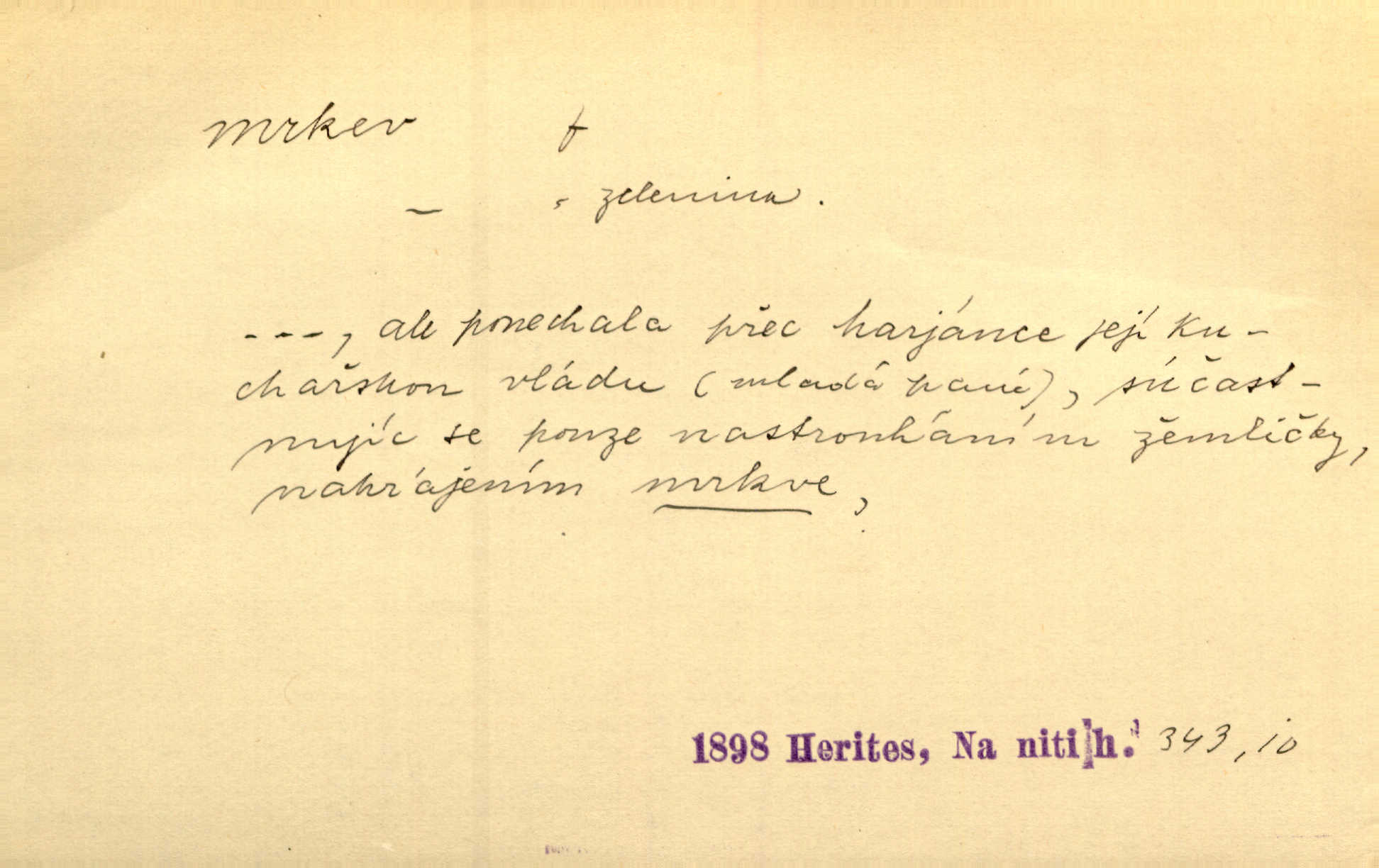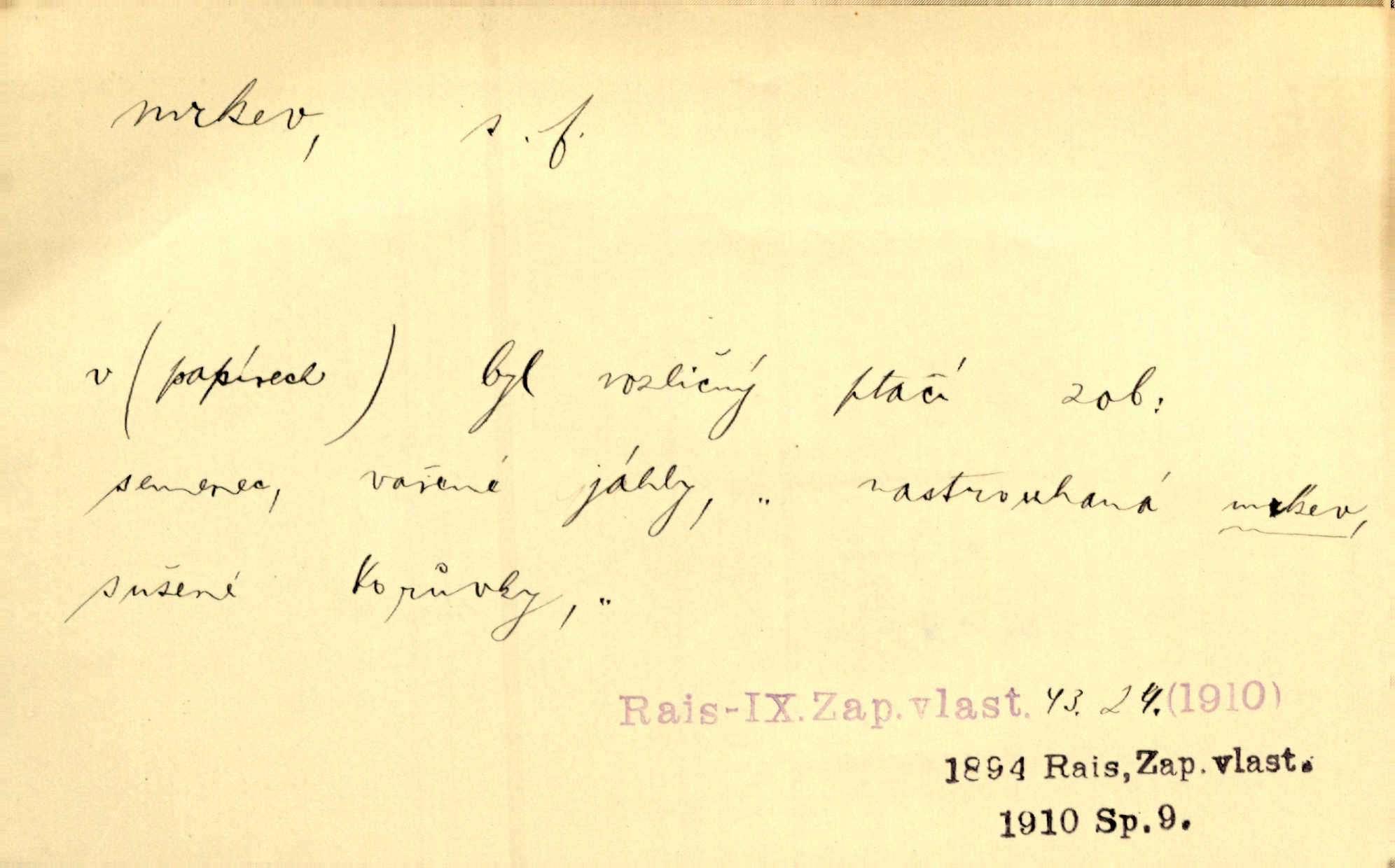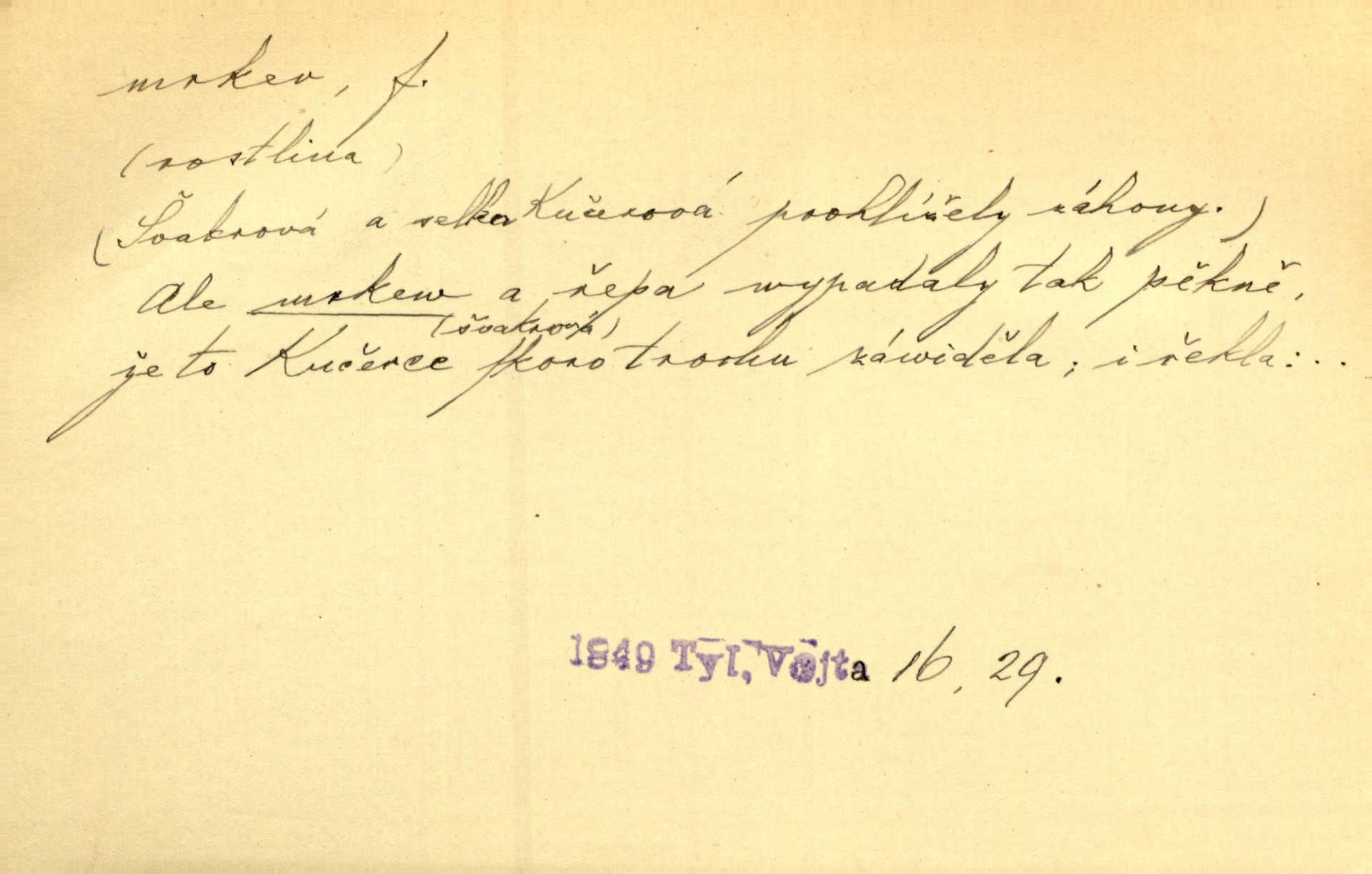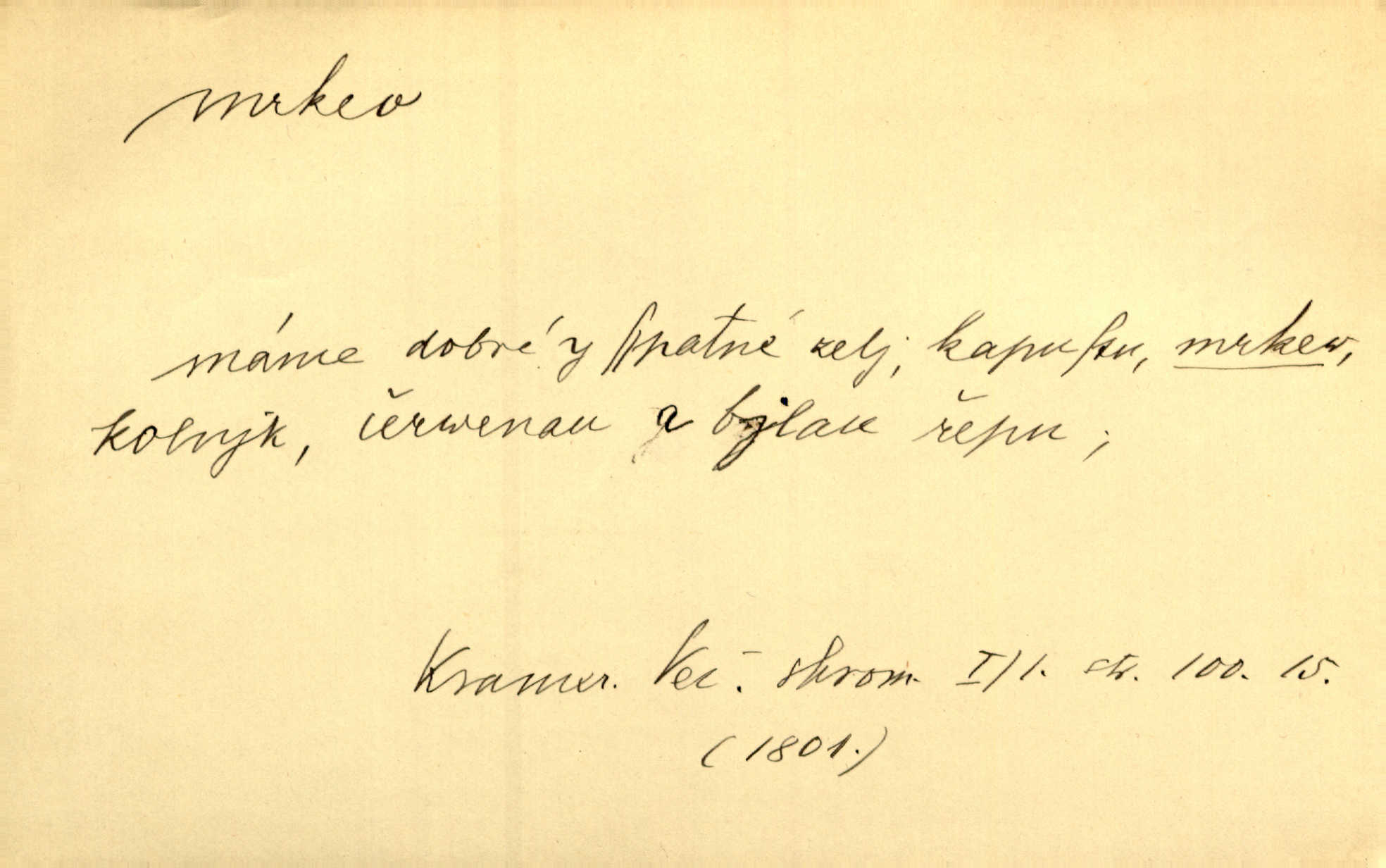 - mrkev, -kve f. druh zeleniny. Zahrady se zelím, cibulí, brambory, mrkví. Havl. Na stole se objevila vepřová s mrkví. Čap. Ch. Hoch láme těžké damascenské meče jako mrkve — kdo umí to v celé říši? Vrch. Bot. rod rostlin z čeledi okoličnatých, Daucus.