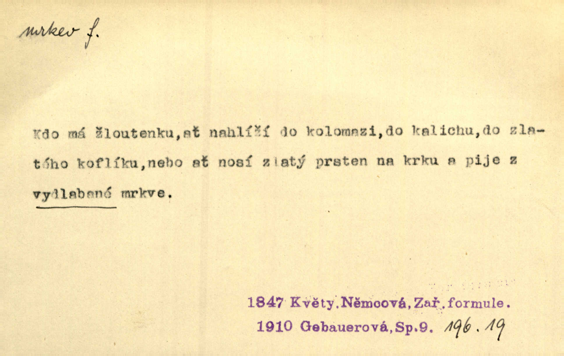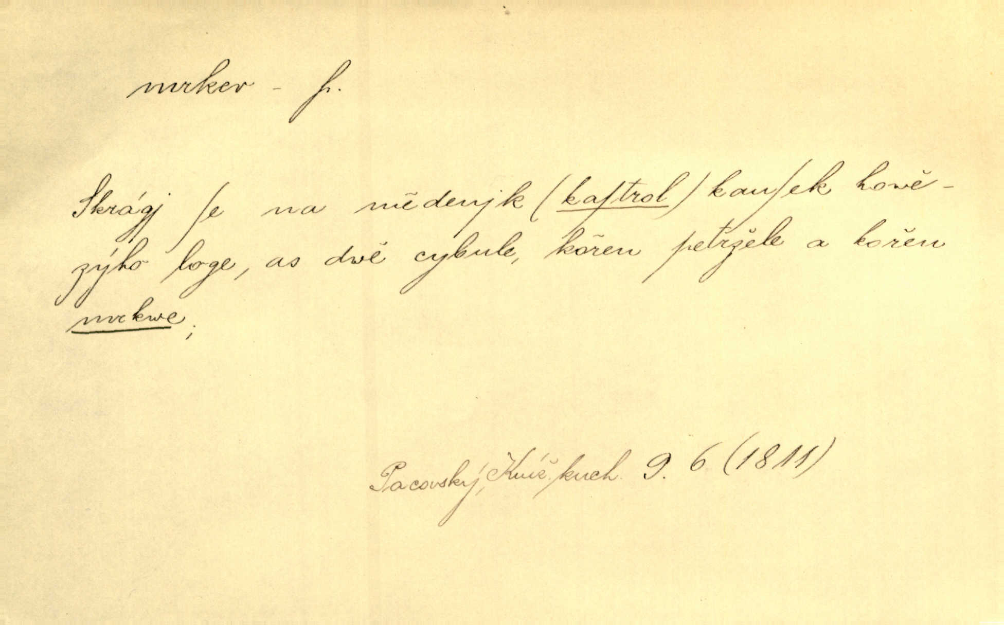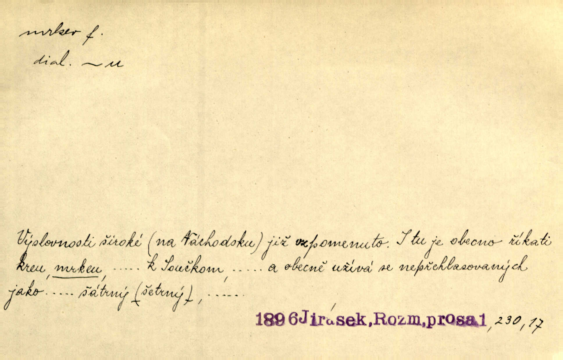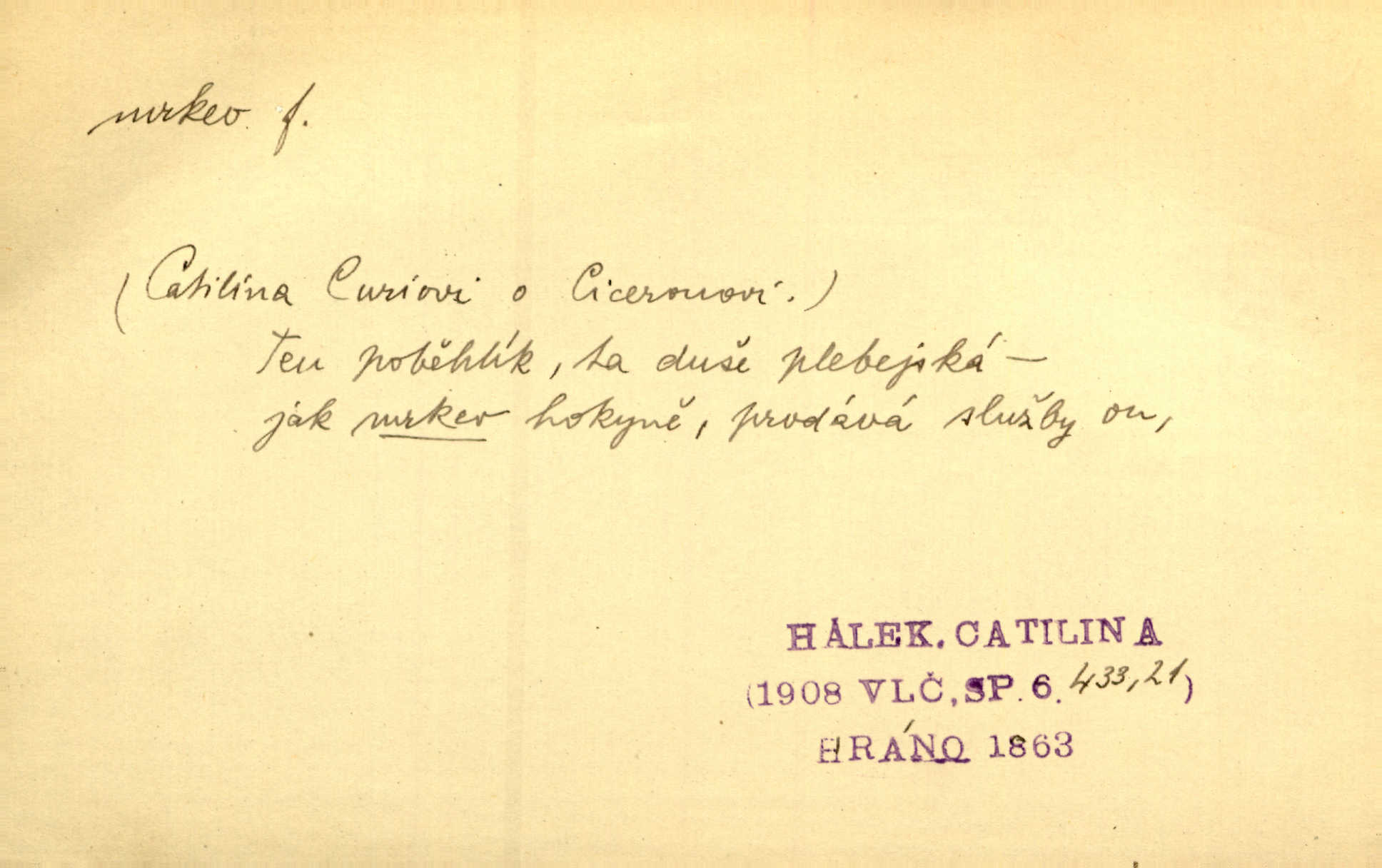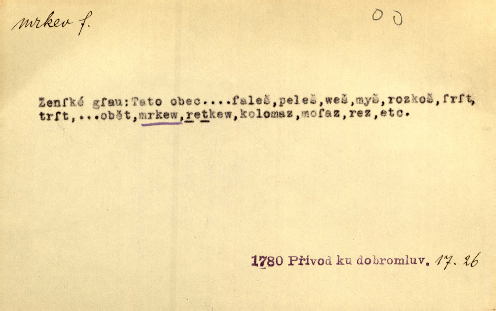 - mrkev, -kve f. druh zeleniny. Zahrady se zelím, cibulí, brambory, mrkví. Havl. Na stole se objevila vepřová s mrkví. Čap. Ch. Hoch láme těžké damascenské meče jako mrkve — kdo umí to v celé říši? Vrch. Bot. rod rostlin z čeledi okoličnatých, Daucus.