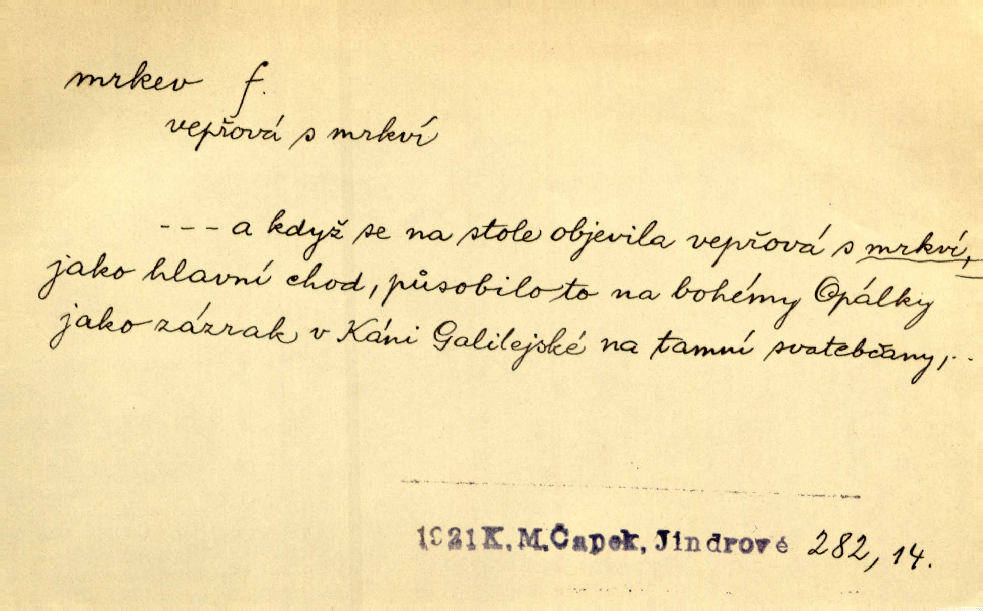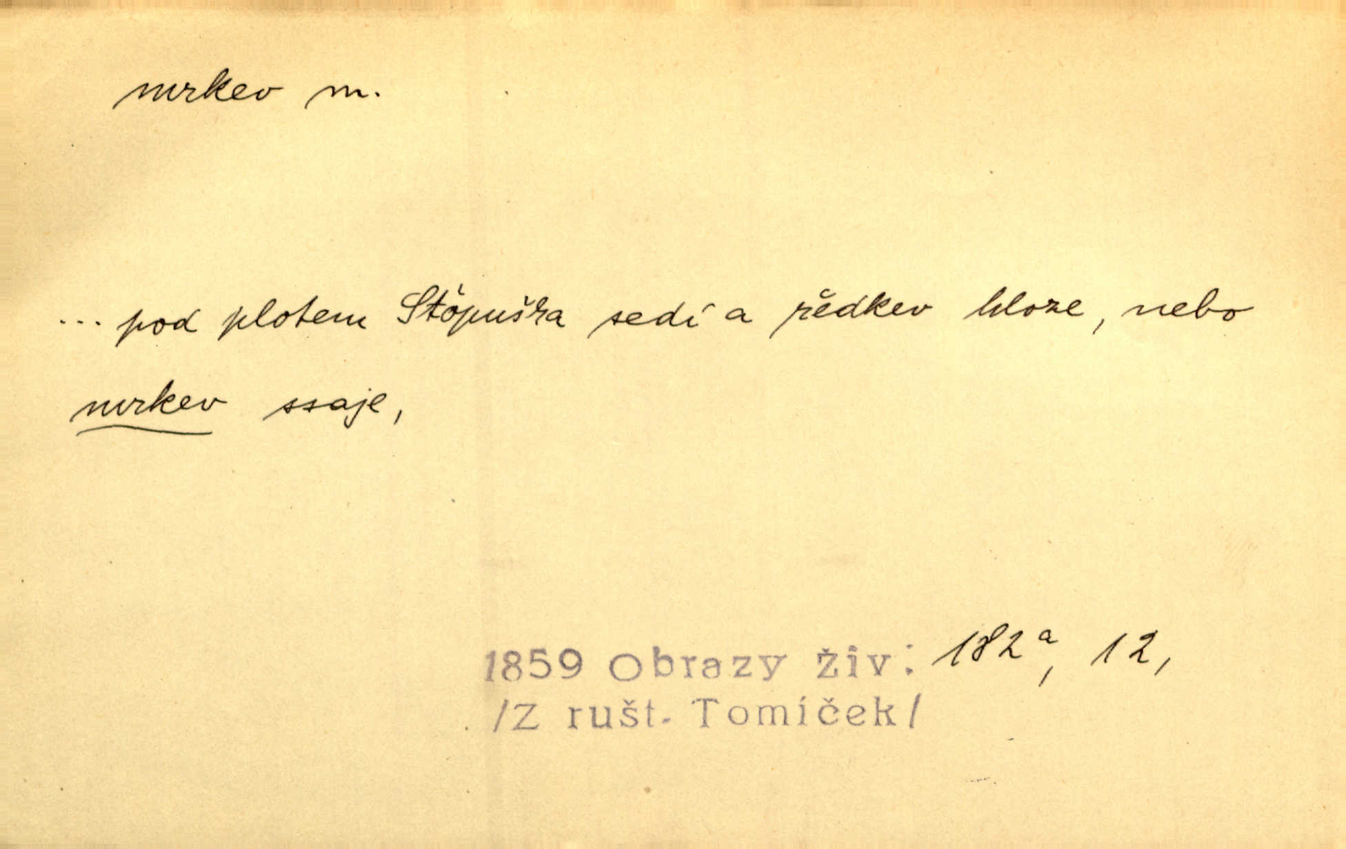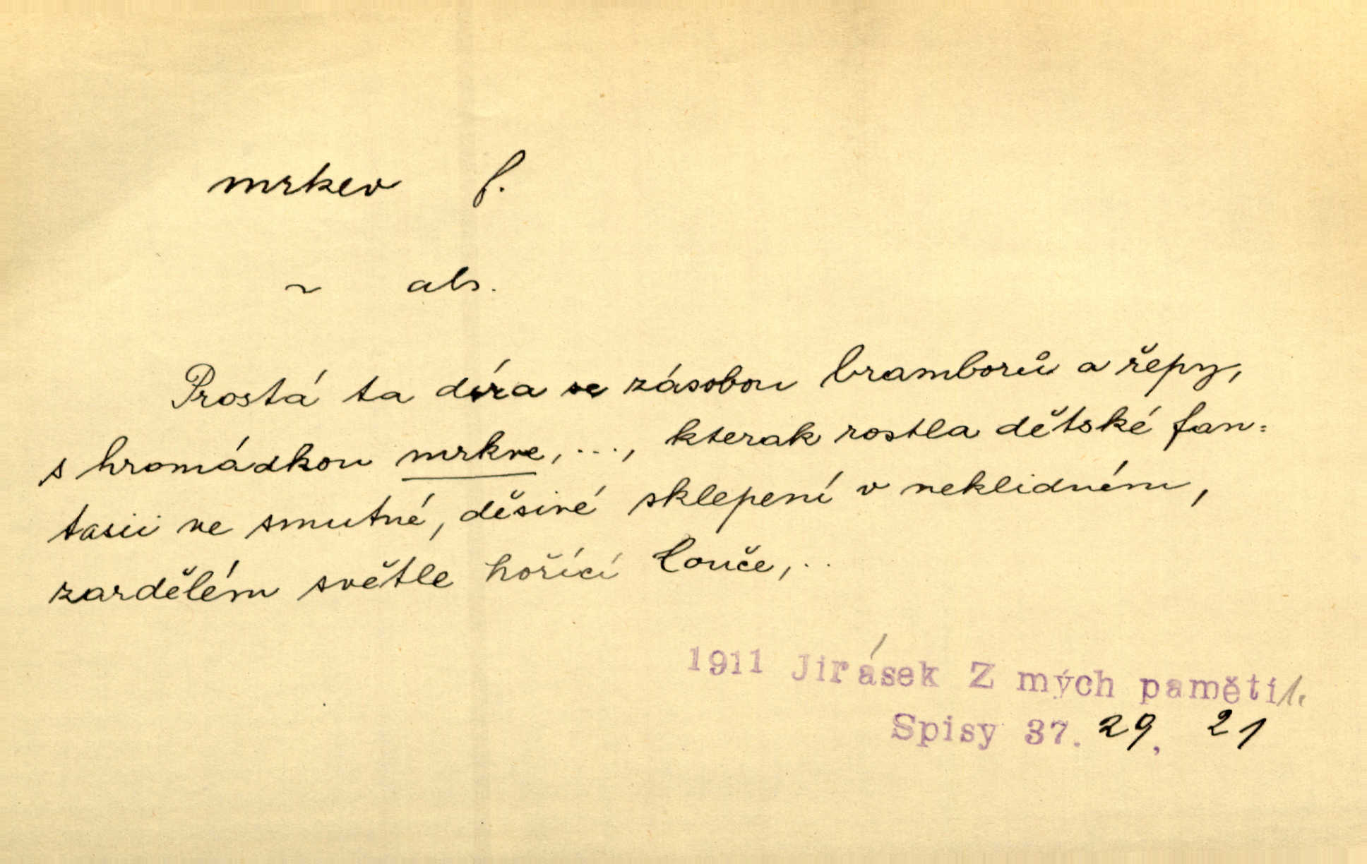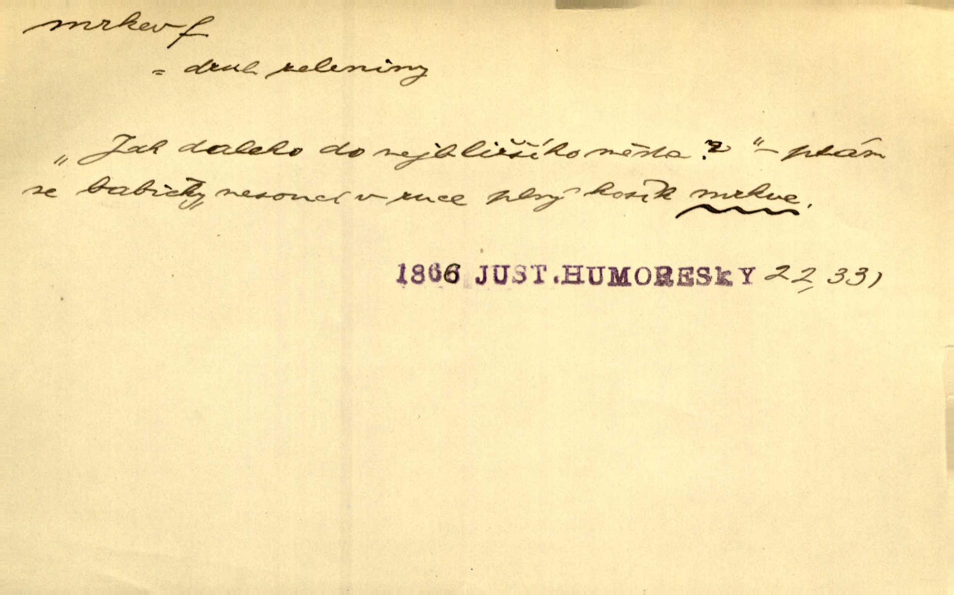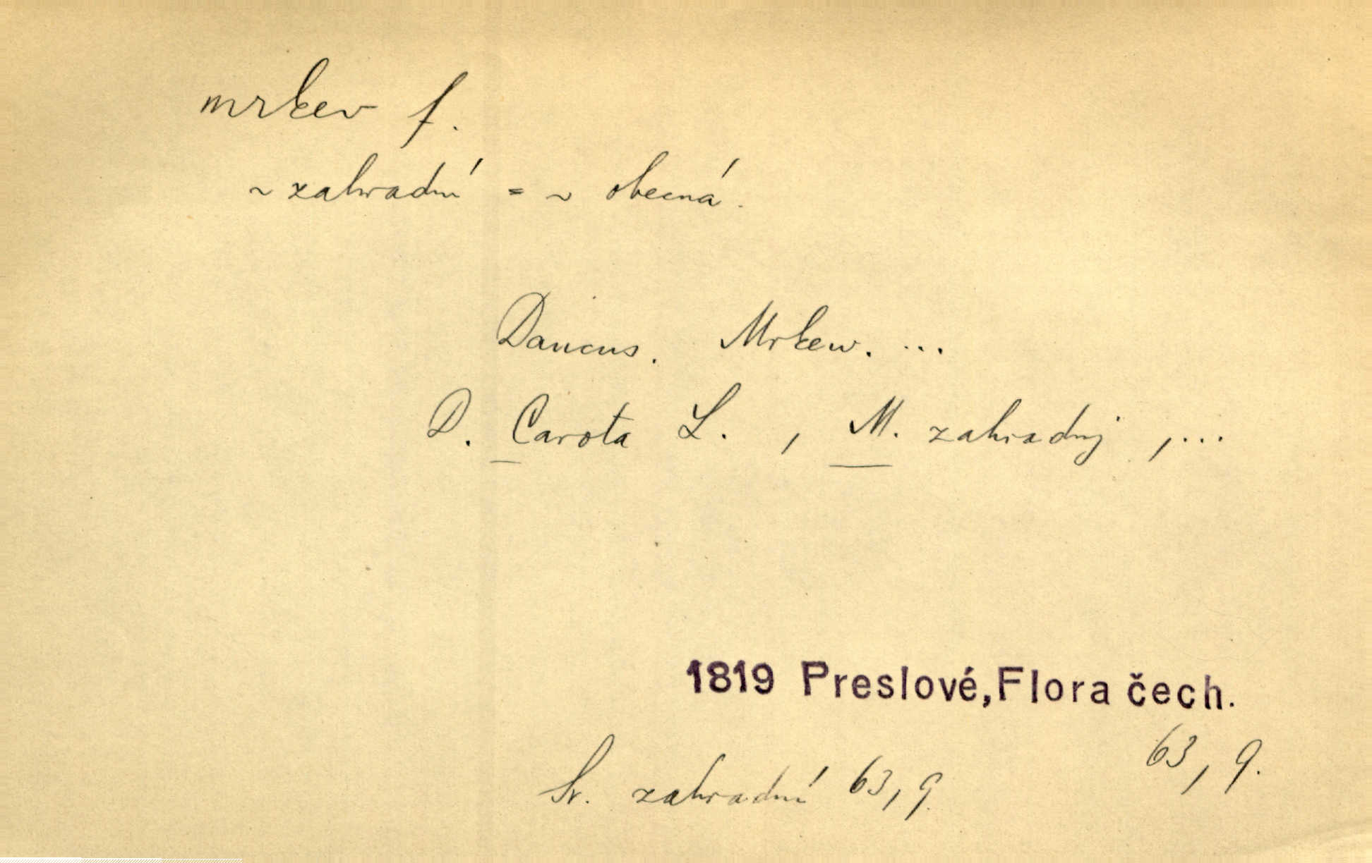 - mrkev, -kve f. druh zeleniny. Zahrady se zelím, cibulí, brambory, mrkví. Havl. Na stole se objevila vepřová s mrkví. Čap. Ch. Hoch láme těžké damascenské meče jako mrkve — kdo umí to v celé říši? Vrch. Bot. rod rostlin z čeledi okoličnatých, Daucus.