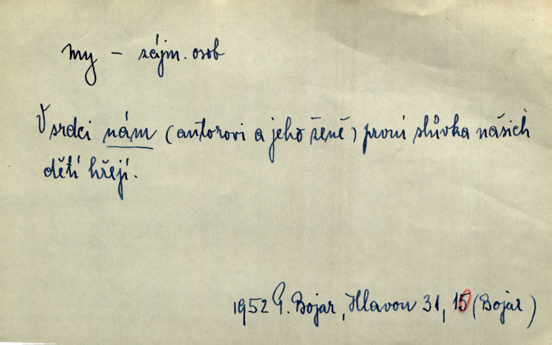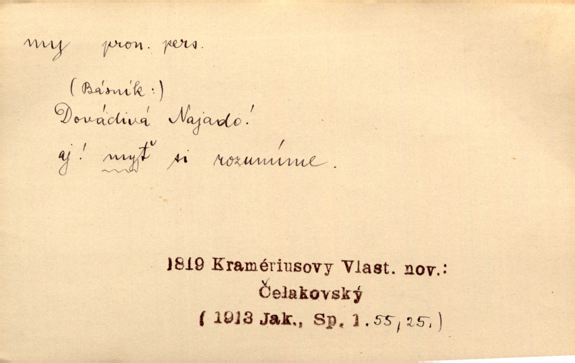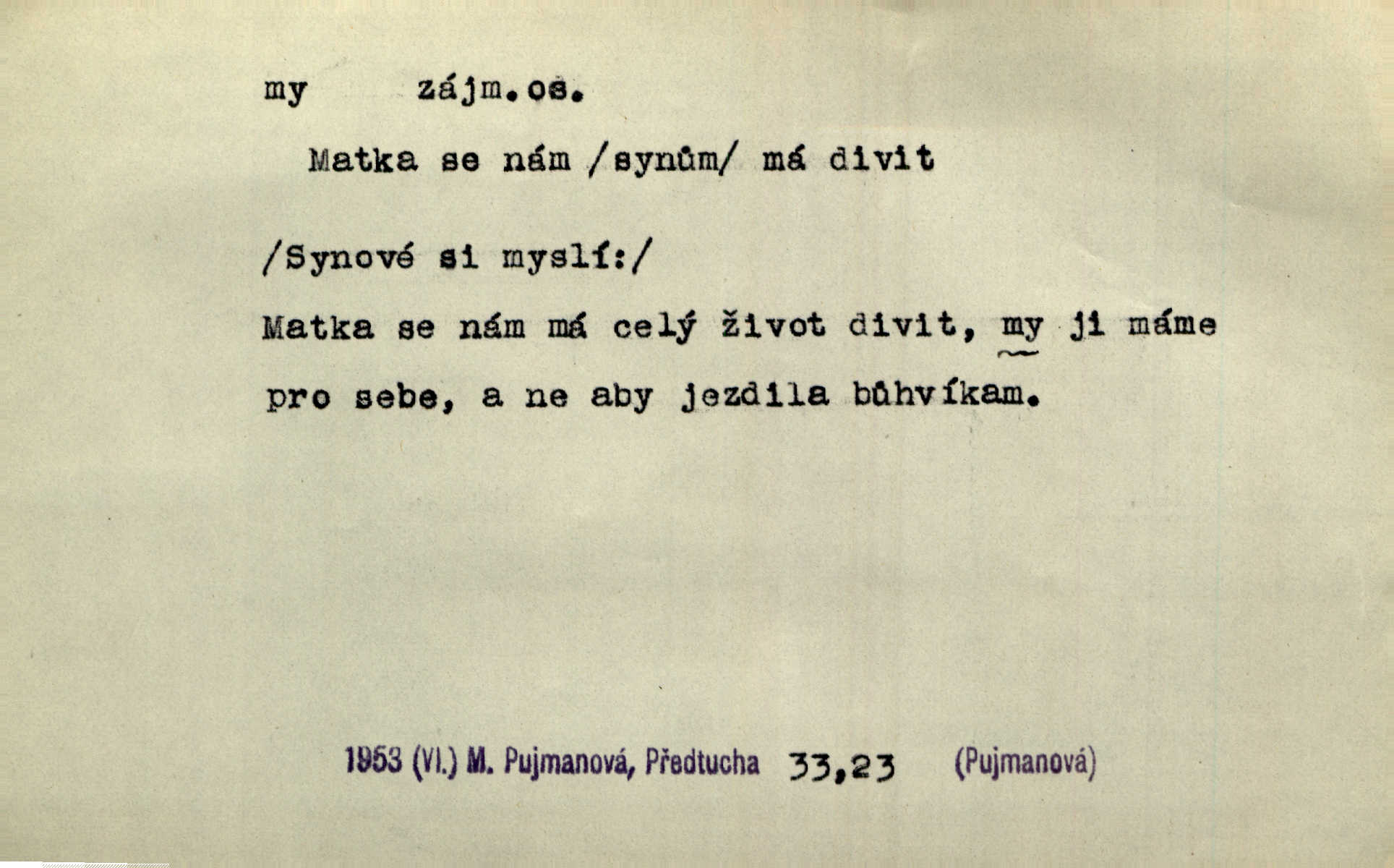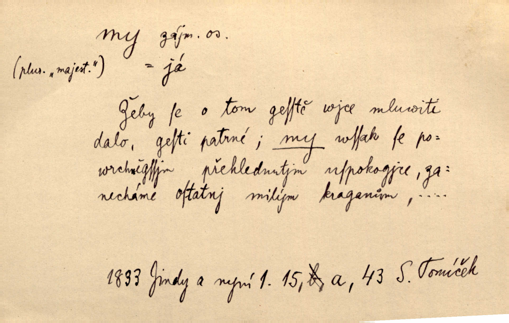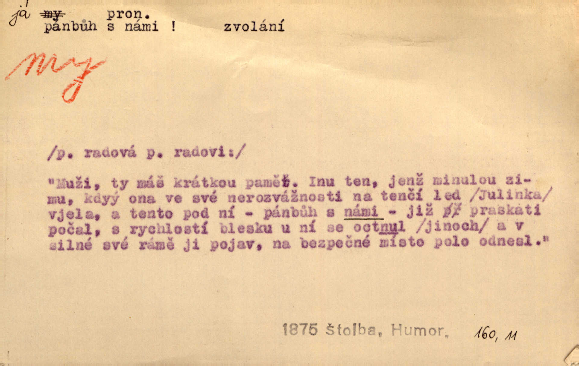 - my zájm. osob. 1. os. pl. (gen., akus., lok. nás, dat. nám, instr. námi) výraz, jímž osoba mluvící označuje skupinu osob, k níž sama náleží. Hospodyně vzavši Báru kolem těla vedla ji do stavení: „Pojďte s námi, tatínku, pojďte!“ Rais. U matčina lože s bratry stojím, chudák dlouho nám už postonává, darmo tážeme se, zdaž naděje nám. Ner. Nom. v podmětě, jsa patrný z tvaru řídícího slovesa, klade se jen v jistých případech: a) je-li na podmětu zvláštní důraz. Vzhůru ženy! My též chceme na oltář svou obět klást. Něm. Kdež pak my proti vám! Rais. Je to náramný rozdíl, co jste udělali vy a co my. Rais. Mohla jsi spíš než my poznat, že se [tatínek] tratí, protože my jsme ho měli stále na očích. Rais. b) jde-li o vyjádření zvláštního pohnutí mysli. Ne, Jene Marie, my se nerozejdeme, my se neloučíme! Zey. Tak! Jdi, jdi stará! A nevzdej se nikomu! My si spolu zatančíme! Pfleg. [Vejběra vzal se skleníku karty a položil je na stůl:] „A co my budeme jen tak sedět.“ Rais. c) při vlídném tónu. Člověk musí hledět, aby s lidmi vyšel. My jsme taky vedli všecko po staru, teprve teď že se to kapku změnilo. Rais. My tady dnes, tatínku, u vás zůstaneme, o doma starost mít nemusíme a vaši si zas můžou odpočinout. Rais. d) je-li částí výrazu složeného. Co chcem, my romantici dobře víme. Ner. Bojím se, jenom my starší že moudříme každičkým rokem! Ner. e) při střídání podmětu. My [sedláci] pány potřebujeme a páni nás. Třeb. Vida, my se modlíme a oni tu bafají a povídají. Rais. f) není-li ve větě určitého tvaru slovesného n. slovesa vůbec. My spolu rostli, co jeden to druhý. Něm. My o vlku a vlk za humny. Pořek. „My o vlku a vlk čumákem ve dveřích.“ Hol. D Dat. nám vyjadřuje citové vzrušení, zvl. ve zvolání. Hle, hle, pan Pelíšek se nám opravdu zamiloval! Rub. Heleť milostslečna Tynda se nám vdává! Čap. Ch. „To jsou nám hosté, zvolal radostně doktor. Šmil. D Ustál. sp. mezi námi (lid. mezi náma) důvěrně. Ale mezi námi, pane Švarný! předce se mi to s ním docela nelíbilo; nebo když někdy chudým dal, říkával: mnoho peněz! Jindy. Je to pravý tatík všech, a oni — to tak mezi náma, pane kmotře! — ještě jej za to šidí. Krás. D označuje jednu osobu, která se cítí částí celku: to bývá a) v slavnostní řeči panovníků. My Karel dvanáctý, král švédský, pozdravujem jonáky volného Zaporoží. Frič. b) v projevech spisovatelů. My zde o povaze jeho [jazyka českého] krátce promluvíme. Jg. Měl-li by ustanoven býti počet větší [ministrův], my bychom tomu také tuze na odpor nebyli. Pal. Nevidí se nám odstoupiti od formy nyní již vůbec přijaté. Zel. D vyjadřuje prostředí, v kterém žijeme (domov, rodný kraj, rodnou zemi, vlastní národ). Halo — Křížku — doveď mě k nám! domů. A. Mrš. Já když zavítal jsem k nám, již jsem chvátal v místo posvěcené [hřbitov]. Svob. „Snad nechcete utíkat?“ ptal se Konopáč. „Musíme k nám,“ přisvědčoval pantáta. Rais. [Snacha má] oči velké a mluví, jakoby byla z nás z našeho rodu. Rais. Pojďte se mnou — odpočiňte si u nás v našem obydlí. Něm. Dávno jste u nás nebyli. Rais. I pěkně vítám, to jsou k nám hosti. Rais. Můžeš mladého hraběte vzíti s sebou: nebude mu to na škodu, pozná-li tady u nás v našem kraji kus jiného světa. Pfleg. Má [farář na zahradě] všecko, co u nás roste v kraji. Baar. Často přidával [zpívající Held] ještě nějakou písničku „od nás“ z rodného kraje. Jir. Vavák hleděl na francouzskou revoluci tak, jak na ni tenkrát u nás většinou hleděli v českém národě, v Čechách. Jir. Cizí osadníci valem k nám se hrnuli. Jir. Byl u nás básník, co jiné měl oči, co měl rád vonné a nádherné růže. Bezr. Písmo dovede se akkomodovat každému pokroku, kdežto nyní už mnohým až k nám dochovaným stavitelským památkám ani nerozumíme do naší, přítomné doby. Ner.
