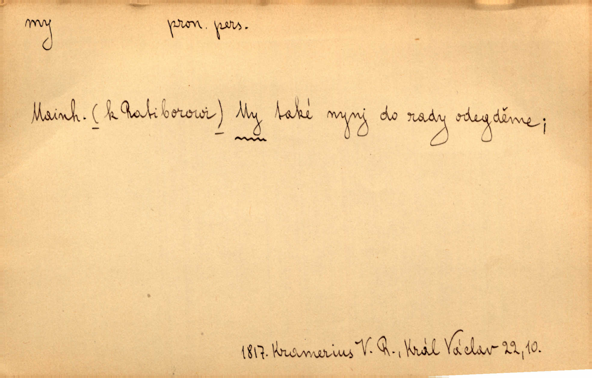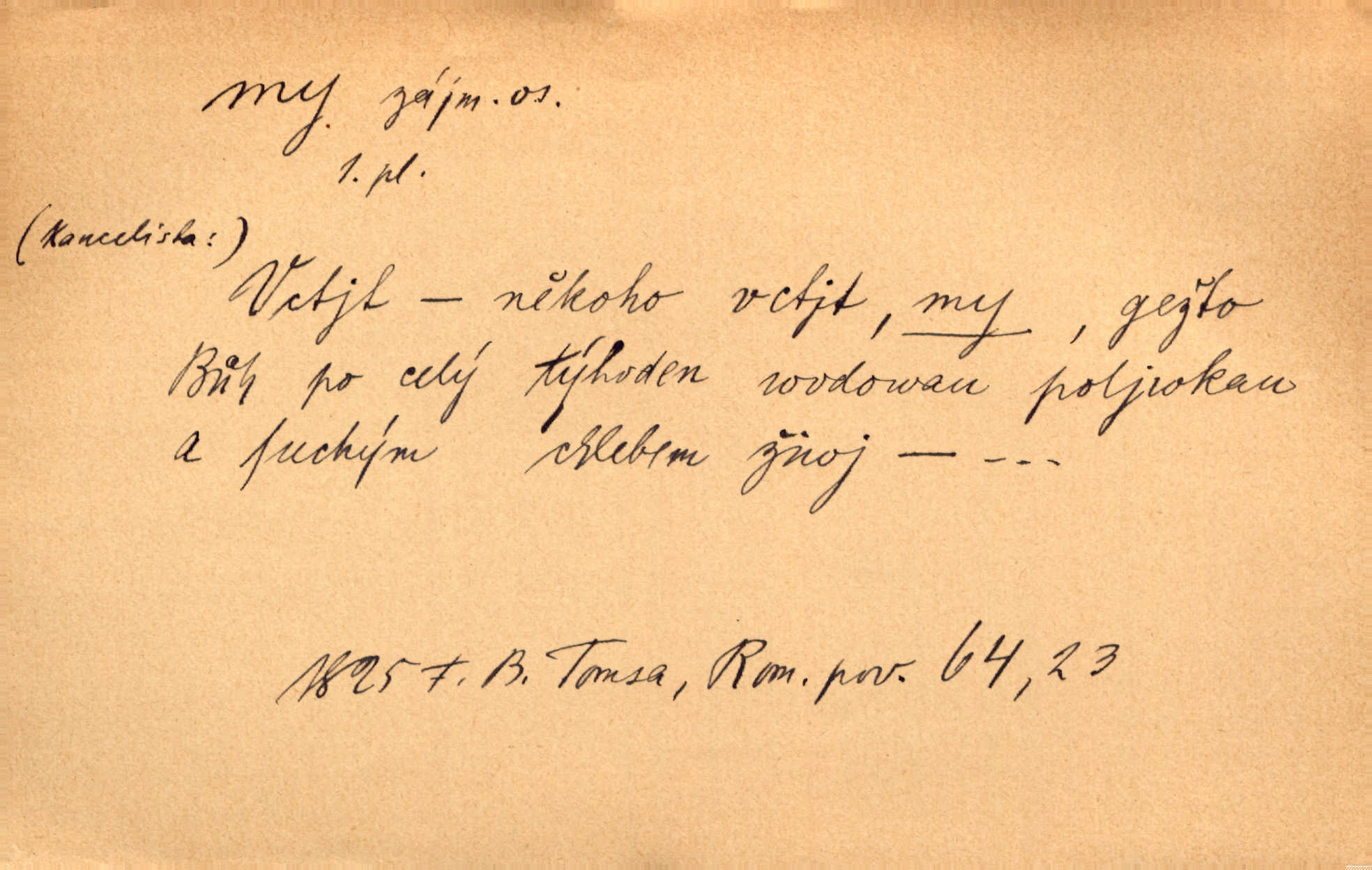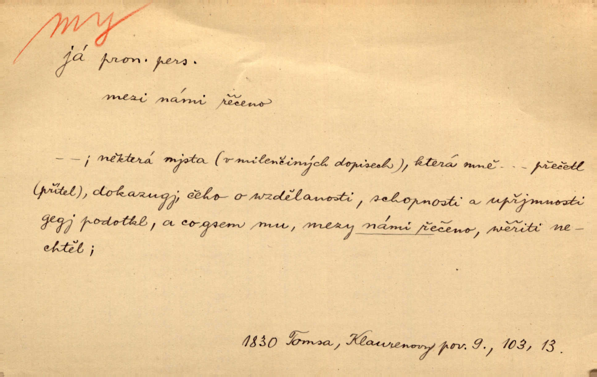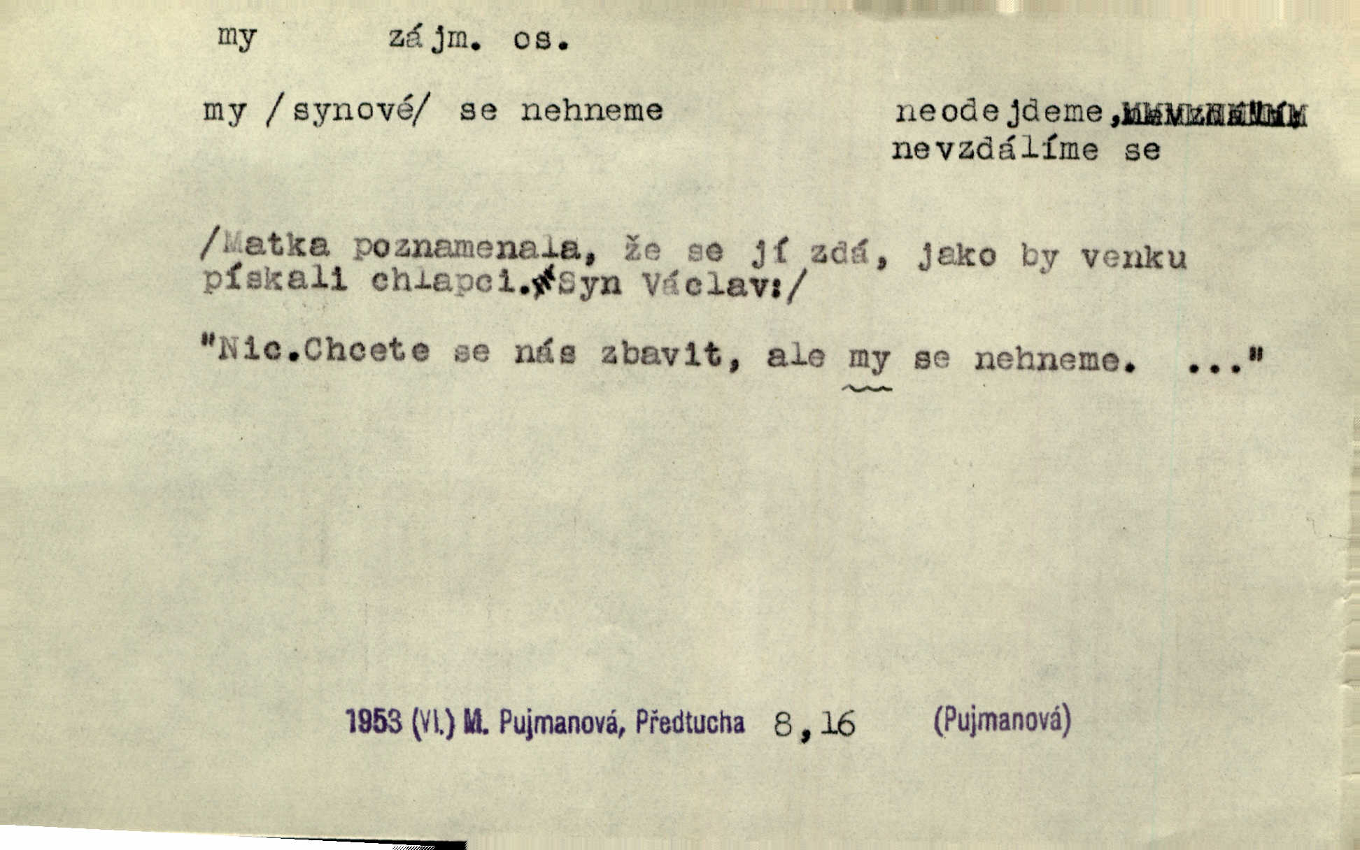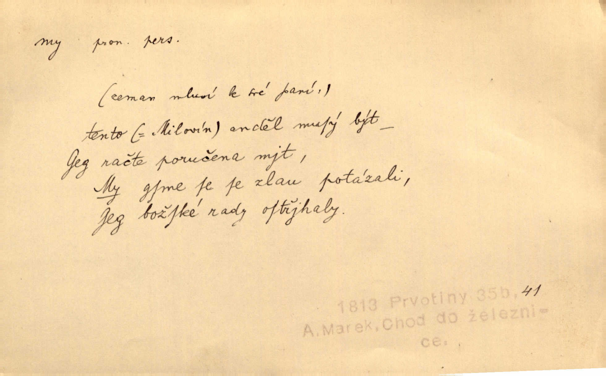 - my zájm. osob. 1. os. pl. (gen., akus., lok. nás, dat. nám, instr. námi) výraz, jímž osoba mluvící označuje skupinu osob, k níž sama náleží. Hospodyně vzavši Báru kolem těla vedla ji do stavení: „Pojďte s námi, tatínku, pojďte!“ Rais. U matčina lože s bratry stojím, chudák dlouho nám už postonává, darmo tážeme se, zdaž naděje nám. Ner. Nom. v podmětě, jsa patrný z tvaru řídícího slovesa, klade se jen v jistých případech: a) je-li na podmětu zvláštní důraz. Vzhůru ženy! My též chceme na oltář svou obět klást. Něm. Kdež pak my proti vám! Rais. Je to náramný rozdíl, co jste udělali vy a co my. Rais. Mohla jsi spíš než my poznat, že se [tatínek] tratí, protože my jsme ho měli stále na očích. Rais. b) jde-li o vyjádření zvláštního pohnutí mysli. Ne, Jene Marie, my se nerozejdeme, my se neloučíme! Zey. Tak! Jdi, jdi stará! A nevzdej se nikomu! My si spolu zatančíme! Pfleg. [Vejběra vzal se skleníku karty a položil je na stůl:] „A co my budeme jen tak sedět.“ Rais. c) při vlídném tónu. Člověk musí hledět, aby s lidmi vyšel. My jsme taky vedli všecko po staru, teprve teď že se to kapku změnilo. Rais. My tady dnes, tatínku, u vás zůstaneme, o doma starost mít nemusíme a vaši si zas můžou odpočinout. Rais. d) je-li částí výrazu složeného. Co chcem, my romantici dobře víme. Ner. Bojím se, jenom my starší že moudříme každičkým rokem! Ner. e) při střídání podmětu. My [sedláci] pány potřebujeme a páni nás. Třeb. Vida, my se modlíme a oni tu bafají a povídají. Rais. f) není-li ve větě určitého tvaru slovesného n. slovesa vůbec. My spolu rostli, co jeden to druhý. Něm. My o vlku a vlk za humny. Pořek. „My o vlku a vlk čumákem ve dveřích.“ Hol. D Dat. nám vyjadřuje citové vzrušení, zvl. ve zvolání. Hle, hle, pan Pelíšek se nám opravdu zamiloval! Rub. Heleť milostslečna Tynda se nám vdává! Čap. Ch. „To jsou nám hosté, zvolal radostně doktor. Šmil. D Ustál. sp. mezi námi (lid. mezi náma) důvěrně. Ale mezi námi, pane Švarný! předce se mi to s ním docela nelíbilo; nebo když někdy chudým dal, říkával: mnoho peněz! Jindy. Je to pravý tatík všech, a oni — to tak mezi náma, pane kmotře! — ještě jej za to šidí. Krás. D označuje jednu osobu, která se cítí částí celku: to bývá a) v slavnostní řeči panovníků. My Karel dvanáctý, král švédský, pozdravujem jonáky volného Zaporoží. Frič. b) v projevech spisovatelů. My zde o povaze jeho [jazyka českého] krátce promluvíme. Jg. Měl-li by ustanoven býti počet větší [ministrův], my bychom tomu také tuze na odpor nebyli. Pal. Nevidí se nám odstoupiti od formy nyní již vůbec přijaté. Zel. D vyjadřuje prostředí, v kterém žijeme (domov, rodný kraj, rodnou zemi, vlastní národ). Halo — Křížku — doveď mě k nám! domů. A. Mrš. Já když zavítal jsem k nám, již jsem chvátal v místo posvěcené [hřbitov]. Svob. „Snad nechcete utíkat?“ ptal se Konopáč. „Musíme k nám,“ přisvědčoval pantáta. Rais. [Snacha má] oči velké a mluví, jakoby byla z nás z našeho rodu. Rais. Pojďte se mnou — odpočiňte si u nás v našem obydlí. Něm. Dávno jste u nás nebyli. Rais. I pěkně vítám, to jsou k nám hosti. Rais. Můžeš mladého hraběte vzíti s sebou: nebude mu to na škodu, pozná-li tady u nás v našem kraji kus jiného světa. Pfleg. Má [farář na zahradě] všecko, co u nás roste v kraji. Baar. Často přidával [zpívající Held] ještě nějakou písničku „od nás“ z rodného kraje. Jir. Vavák hleděl na francouzskou revoluci tak, jak na ni tenkrát u nás většinou hleděli v českém národě, v Čechách. Jir. Cizí osadníci valem k nám se hrnuli. Jir. Byl u nás básník, co jiné měl oči, co měl rád vonné a nádherné růže. Bezr. Písmo dovede se akkomodovat každému pokroku, kdežto nyní už mnohým až k nám dochovaným stavitelským památkám ani nerozumíme do naší, přítomné doby. Ner.