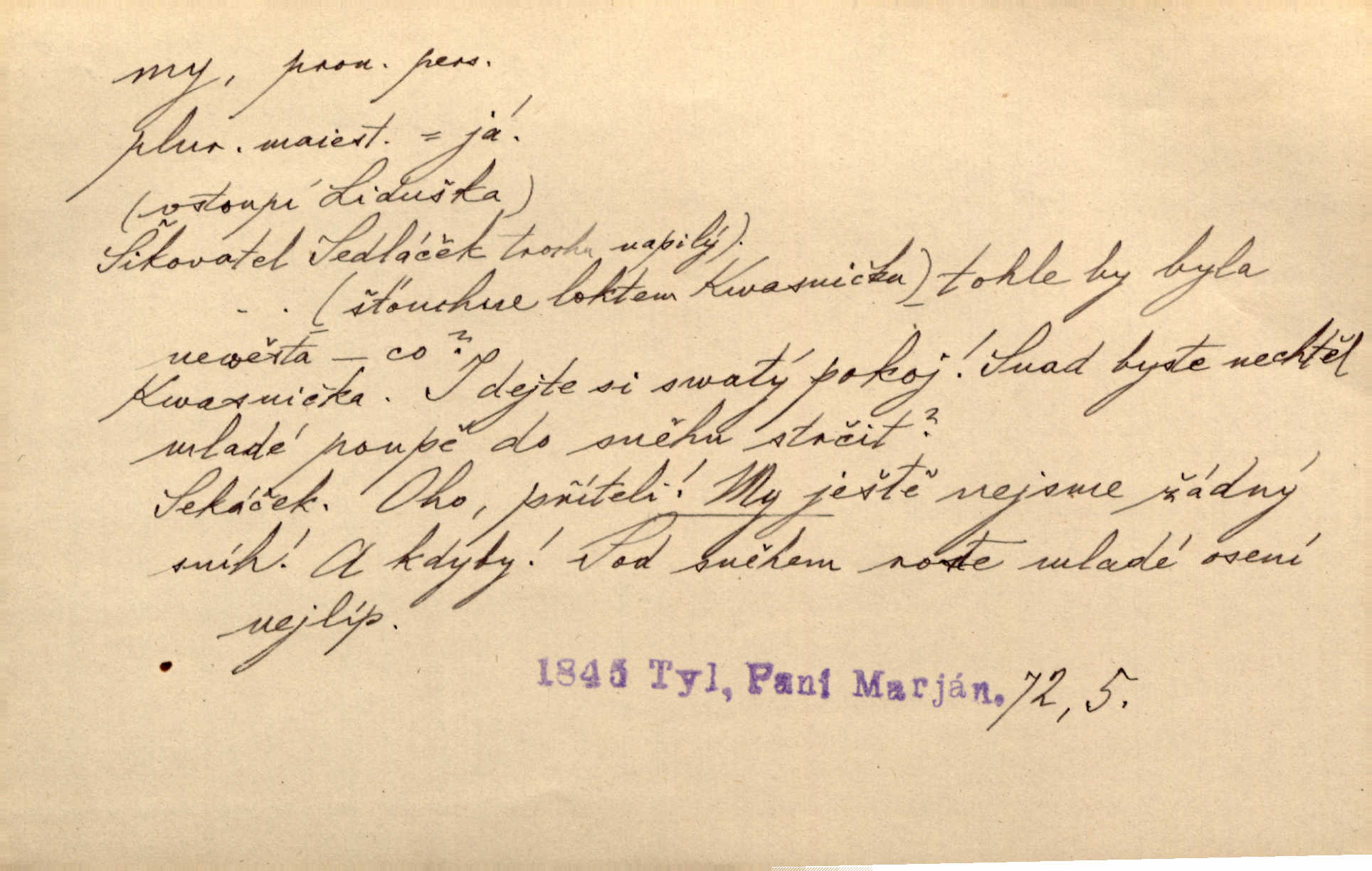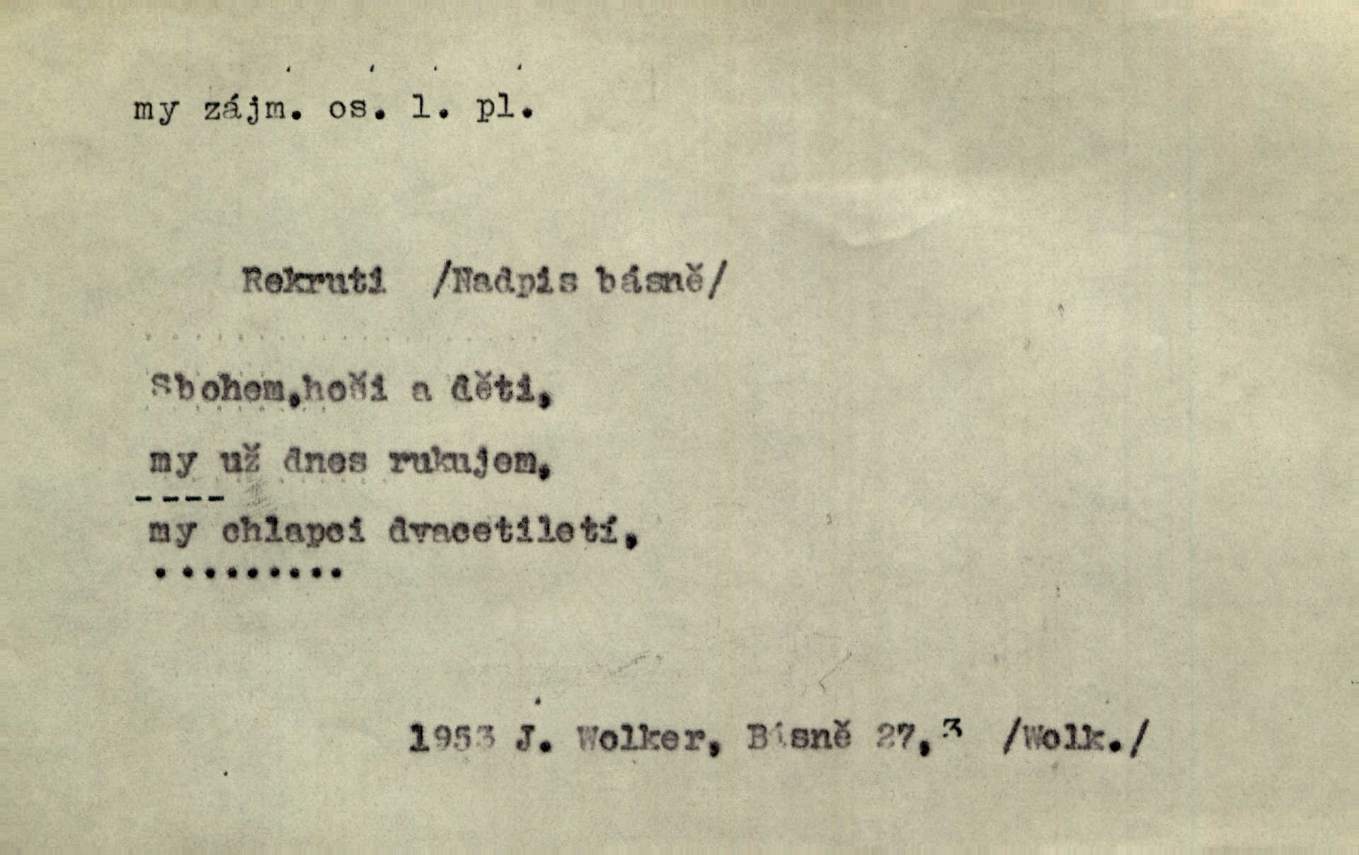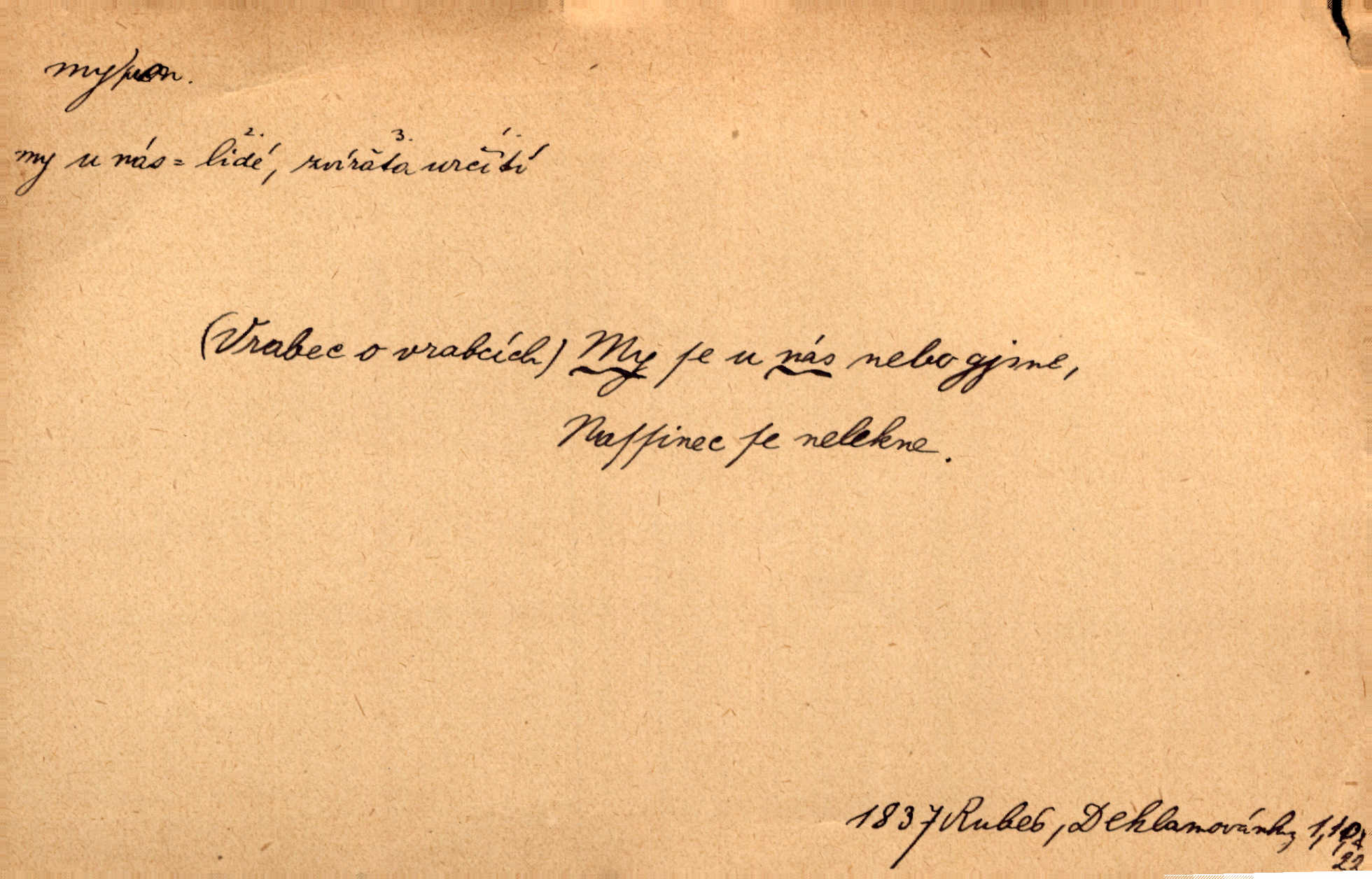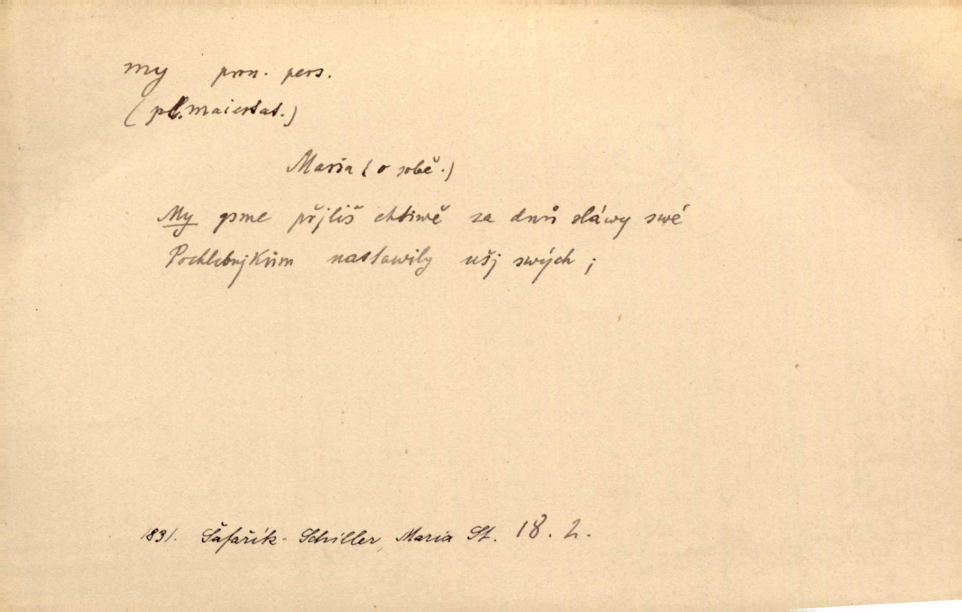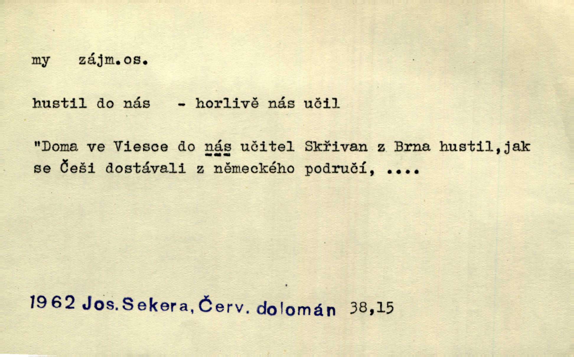 - my zájm. osob. 1. os. pl. (gen., akus., lok. nás, dat. nám, instr. námi) výraz, jímž osoba mluvící označuje skupinu osob, k níž sama náleží. Hospodyně vzavši Báru kolem těla vedla ji do stavení: „Pojďte s námi, tatínku, pojďte!“ Rais. U matčina lože s bratry stojím, chudák dlouho nám už postonává, darmo tážeme se, zdaž naděje nám. Ner. Nom. v podmětě, jsa patrný z tvaru řídícího slovesa, klade se jen v jistých případech: a) je-li na podmětu zvláštní důraz. Vzhůru ženy! My též chceme na oltář svou obět klást. Něm. Kdež pak my proti vám! Rais. Je to náramný rozdíl, co jste udělali vy a co my. Rais. Mohla jsi spíš než my poznat, že se [tatínek] tratí, protože my jsme ho měli stále na očích. Rais. b) jde-li o vyjádření zvláštního pohnutí mysli. Ne, Jene Marie, my se nerozejdeme, my se neloučíme! Zey. Tak! Jdi, jdi stará! A nevzdej se nikomu! My si spolu zatančíme! Pfleg. [Vejběra vzal se skleníku karty a položil je na stůl:] „A co my budeme jen tak sedět.“ Rais. c) při vlídném tónu. Člověk musí hledět, aby s lidmi vyšel. My jsme taky vedli všecko po staru, teprve teď že se to kapku změnilo. Rais. My tady dnes, tatínku, u vás zůstaneme, o doma starost mít nemusíme a vaši si zas můžou odpočinout. Rais. d) je-li částí výrazu složeného. Co chcem, my romantici dobře víme. Ner. Bojím se, jenom my starší že moudříme každičkým rokem! Ner. e) při střídání podmětu. My [sedláci] pány potřebujeme a páni nás. Třeb. Vida, my se modlíme a oni tu bafají a povídají. Rais. f) není-li ve větě určitého tvaru slovesného n. slovesa vůbec. My spolu rostli, co jeden to druhý. Něm. My o vlku a vlk za humny. Pořek. „My o vlku a vlk čumákem ve dveřích.“ Hol. D Dat. nám vyjadřuje citové vzrušení, zvl. ve zvolání. Hle, hle, pan Pelíšek se nám opravdu zamiloval! Rub. Heleť milostslečna Tynda se nám vdává! Čap. Ch. „To jsou nám hosté, zvolal radostně doktor. Šmil. D Ustál. sp. mezi námi (lid. mezi náma) důvěrně. Ale mezi námi, pane Švarný! předce se mi to s ním docela nelíbilo; nebo když někdy chudým dal, říkával: mnoho peněz! Jindy. Je to pravý tatík všech, a oni — to tak mezi náma, pane kmotře! — ještě jej za to šidí. Krás. D označuje jednu osobu, která se cítí částí celku: to bývá a) v slavnostní řeči panovníků. My Karel dvanáctý, král švédský, pozdravujem jonáky volného Zaporoží. Frič. b) v projevech spisovatelů. My zde o povaze jeho [jazyka českého] krátce promluvíme. Jg. Měl-li by ustanoven býti počet větší [ministrův], my bychom tomu také tuze na odpor nebyli. Pal. Nevidí se nám odstoupiti od formy nyní již vůbec přijaté. Zel. D vyjadřuje prostředí, v kterém žijeme (domov, rodný kraj, rodnou zemi, vlastní národ). Halo — Křížku — doveď mě k nám! domů. A. Mrš. Já když zavítal jsem k nám, již jsem chvátal v místo posvěcené [hřbitov]. Svob. „Snad nechcete utíkat?“ ptal se Konopáč. „Musíme k nám,“ přisvědčoval pantáta. Rais. [Snacha má] oči velké a mluví, jakoby byla z nás z našeho rodu. Rais. Pojďte se mnou — odpočiňte si u nás v našem obydlí. Něm. Dávno jste u nás nebyli. Rais. I pěkně vítám, to jsou k nám hosti. Rais. Můžeš mladého hraběte vzíti s sebou: nebude mu to na škodu, pozná-li tady u nás v našem kraji kus jiného světa. Pfleg. Má [farář na zahradě] všecko, co u nás roste v kraji. Baar. Často přidával [zpívající Held] ještě nějakou písničku „od nás“ z rodného kraje. Jir. Vavák hleděl na francouzskou revoluci tak, jak na ni tenkrát u nás většinou hleděli v českém národě, v Čechách. Jir. Cizí osadníci valem k nám se hrnuli. Jir. Byl u nás básník, co jiné měl oči, co měl rád vonné a nádherné růže. Bezr. Písmo dovede se akkomodovat každému pokroku, kdežto nyní už mnohým až k nám dochovaným stavitelským památkám ani nerozumíme do naší, přítomné doby. Ner.