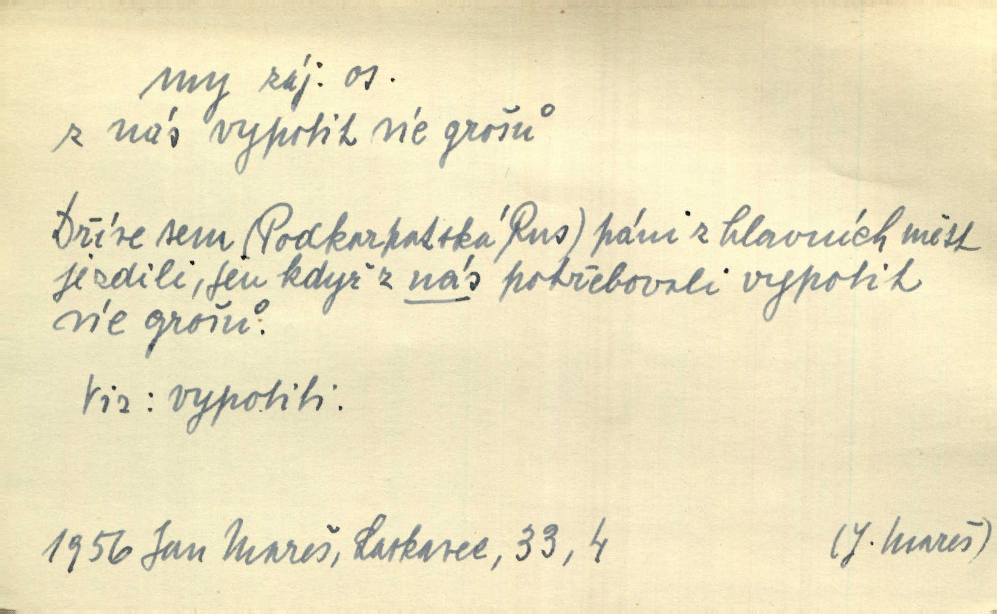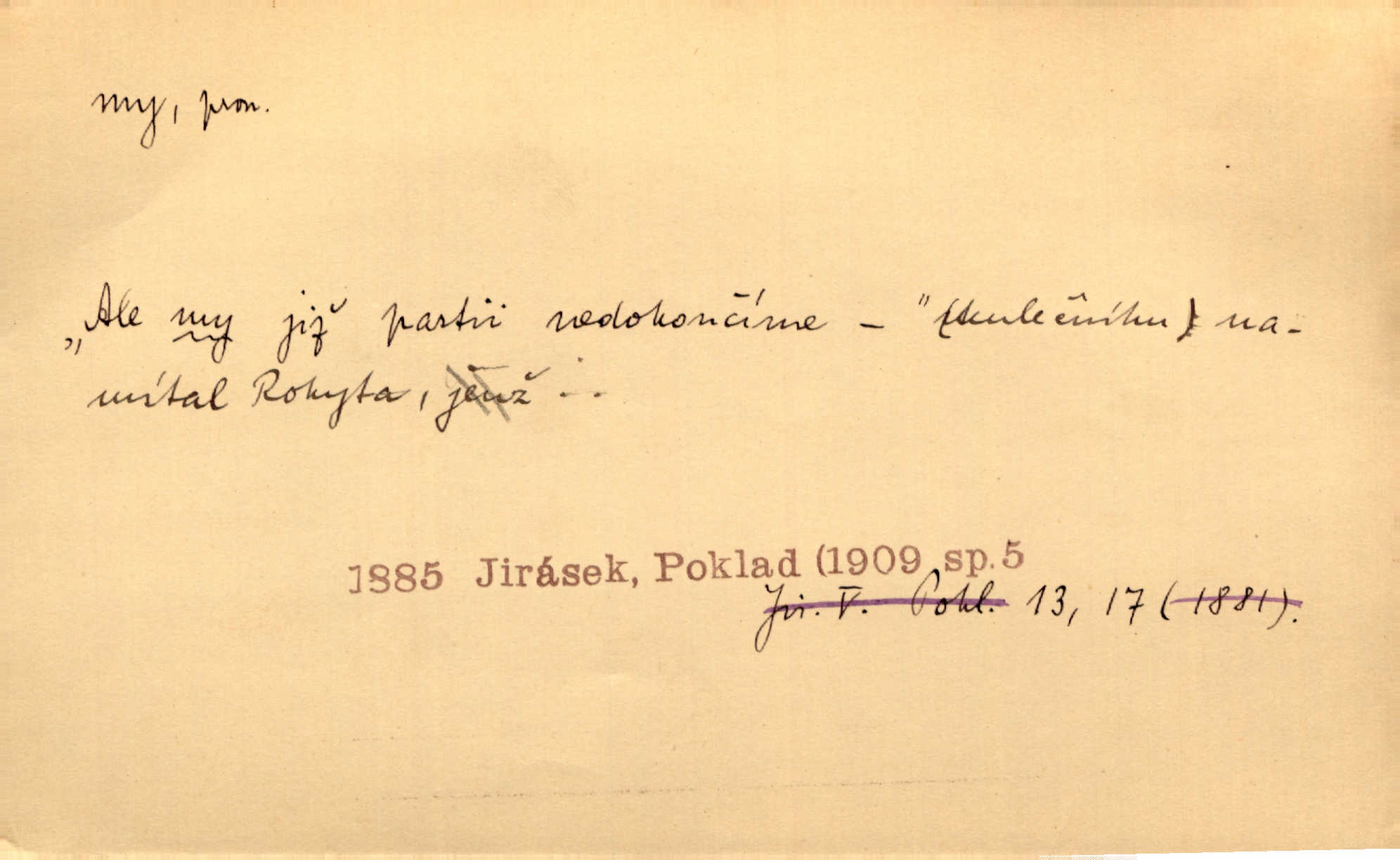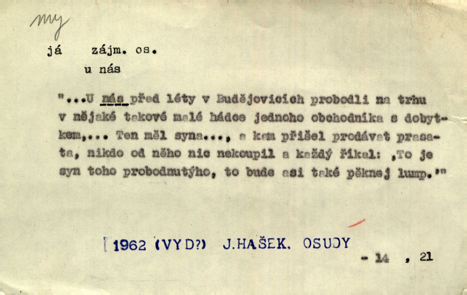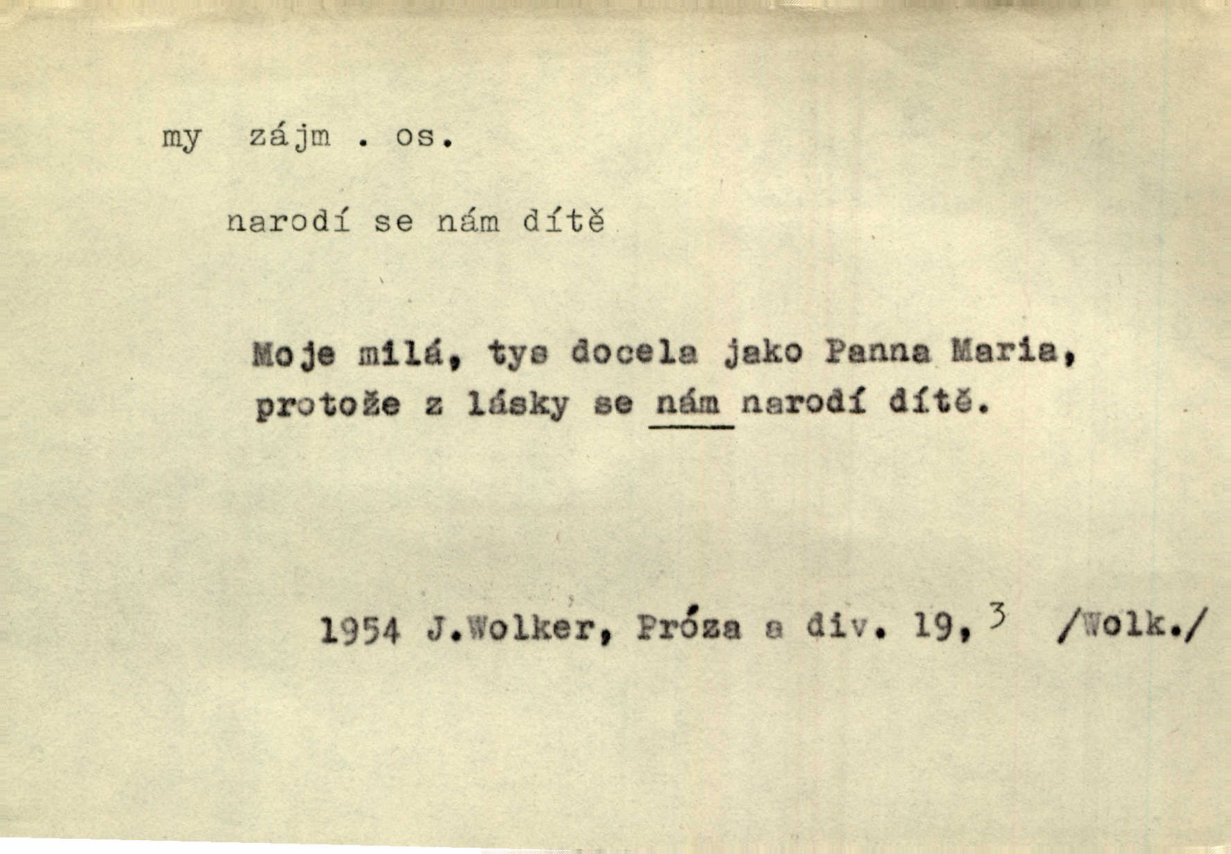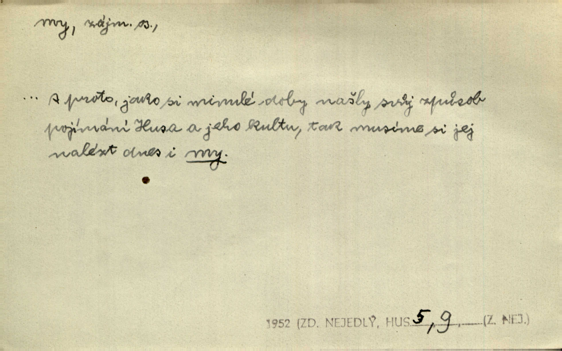- my zájm. osob. 1. os. pl. (gen., akus., lok. nás, dat. nám, instr. námi) výraz, jímž osoba mluvící označuje skupinu osob, k níž sama náleží. Hospodyně vzavši Báru kolem těla vedla ji do stavení: „Pojďte s námi, tatínku, pojďte!“ Rais. U matčina lože s bratry stojím, chudák dlouho nám už postonává, darmo tážeme se, zdaž naděje nám. Ner. Nom. v podmětě, jsa patrný z tvaru řídícího slovesa, klade se jen v jistých případech: a) je-li na podmětu zvláštní důraz. Vzhůru ženy! My též chceme na oltář svou obět klást. Něm. Kdež pak my proti vám! Rais. Je to náramný rozdíl, co jste udělali vy a co my. Rais. Mohla jsi spíš než my poznat, že se [tatínek] tratí, protože my jsme ho měli stále na očích. Rais. b) jde-li o vyjádření zvláštního pohnutí mysli. Ne, Jene Marie, my se nerozejdeme, my se neloučíme! Zey. Tak! Jdi, jdi stará! A nevzdej se nikomu! My si spolu zatančíme! Pfleg. [Vejběra vzal se skleníku karty a položil je na stůl:] „A co my budeme jen tak sedět.“ Rais. c) při vlídném tónu. Člověk musí hledět, aby s lidmi vyšel. My jsme taky vedli všecko po staru, teprve teď že se to kapku změnilo. Rais. My tady dnes, tatínku, u vás zůstaneme, o doma starost mít nemusíme a vaši si zas můžou odpočinout. Rais. d) je-li částí výrazu složeného. Co chcem, my romantici dobře víme. Ner. Bojím se, jenom my starší že moudříme každičkým rokem! Ner. e) při střídání podmětu. My [sedláci] pány potřebujeme a páni nás. Třeb. Vida, my se modlíme a oni tu bafají a povídají. Rais. f) není-li ve větě určitého tvaru slovesného n. slovesa vůbec. My spolu rostli, co jeden to druhý. Něm. My o vlku a vlk za humny. Pořek. „My o vlku a vlk čumákem ve dveřích.“ Hol. D Dat. nám vyjadřuje citové vzrušení, zvl. ve zvolání. Hle, hle, pan Pelíšek se nám opravdu zamiloval! Rub. Heleť milostslečna Tynda se nám vdává! Čap. Ch. „To jsou nám hosté, zvolal radostně doktor. Šmil. D Ustál. sp. mezi námi (lid. mezi náma) důvěrně. Ale mezi námi, pane Švarný! předce se mi to s ním docela nelíbilo; nebo když někdy chudým dal, říkával: mnoho peněz! Jindy. Je to pravý tatík všech, a oni — to tak mezi náma, pane kmotře! — ještě jej za to šidí. Krás. D označuje jednu osobu, která se cítí částí celku: to bývá a) v slavnostní řeči panovníků. My Karel dvanáctý, král švédský, pozdravujem jonáky volného Zaporoží. Frič. b) v projevech spisovatelů. My zde o povaze jeho [jazyka českého] krátce promluvíme. Jg. Měl-li by ustanoven býti počet větší [ministrův], my bychom tomu také tuze na odpor nebyli. Pal. Nevidí se nám odstoupiti od formy nyní již vůbec přijaté. Zel. D vyjadřuje prostředí, v kterém žijeme (domov, rodný kraj, rodnou zemi, vlastní národ). Halo — Křížku — doveď mě k nám! domů. A. Mrš. Já když zavítal jsem k nám, již jsem chvátal v místo posvěcené [hřbitov]. Svob. „Snad nechcete utíkat?“ ptal se Konopáč. „Musíme k nám,“ přisvědčoval pantáta. Rais. [Snacha má] oči velké a mluví, jakoby byla z nás z našeho rodu. Rais. Pojďte se mnou — odpočiňte si u nás v našem obydlí. Něm. Dávno jste u nás nebyli. Rais. I pěkně vítám, to jsou k nám hosti. Rais. Můžeš mladého hraběte vzíti s sebou: nebude mu to na škodu, pozná-li tady u nás v našem kraji kus jiného světa. Pfleg. Má [farář na zahradě] všecko, co u nás roste v kraji. Baar. Často přidával [zpívající Held] ještě nějakou písničku „od nás“ z rodného kraje. Jir. Vavák hleděl na francouzskou revoluci tak, jak na ni tenkrát u nás většinou hleděli v českém národě, v Čechách. Jir. Cizí osadníci valem k nám se hrnuli. Jir. Byl u nás básník, co jiné měl oči, co měl rád vonné a nádherné růže. Bezr. Písmo dovede se akkomodovat každému pokroku, kdežto nyní už mnohým až k nám dochovaným stavitelským památkám ani nerozumíme do naší, přítomné doby. Ner.