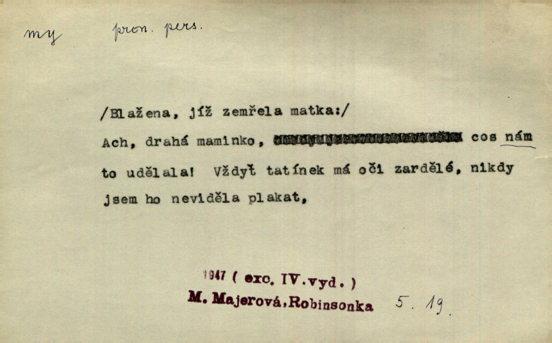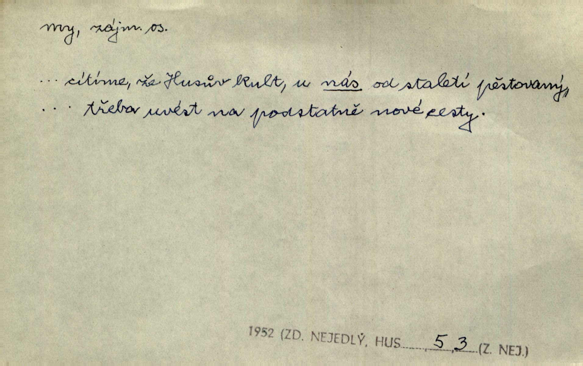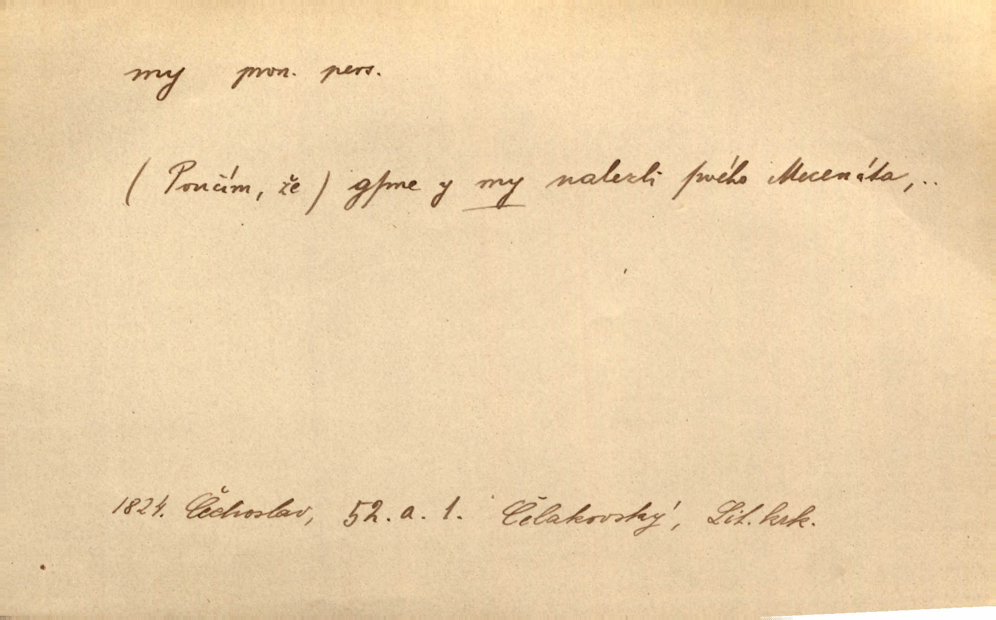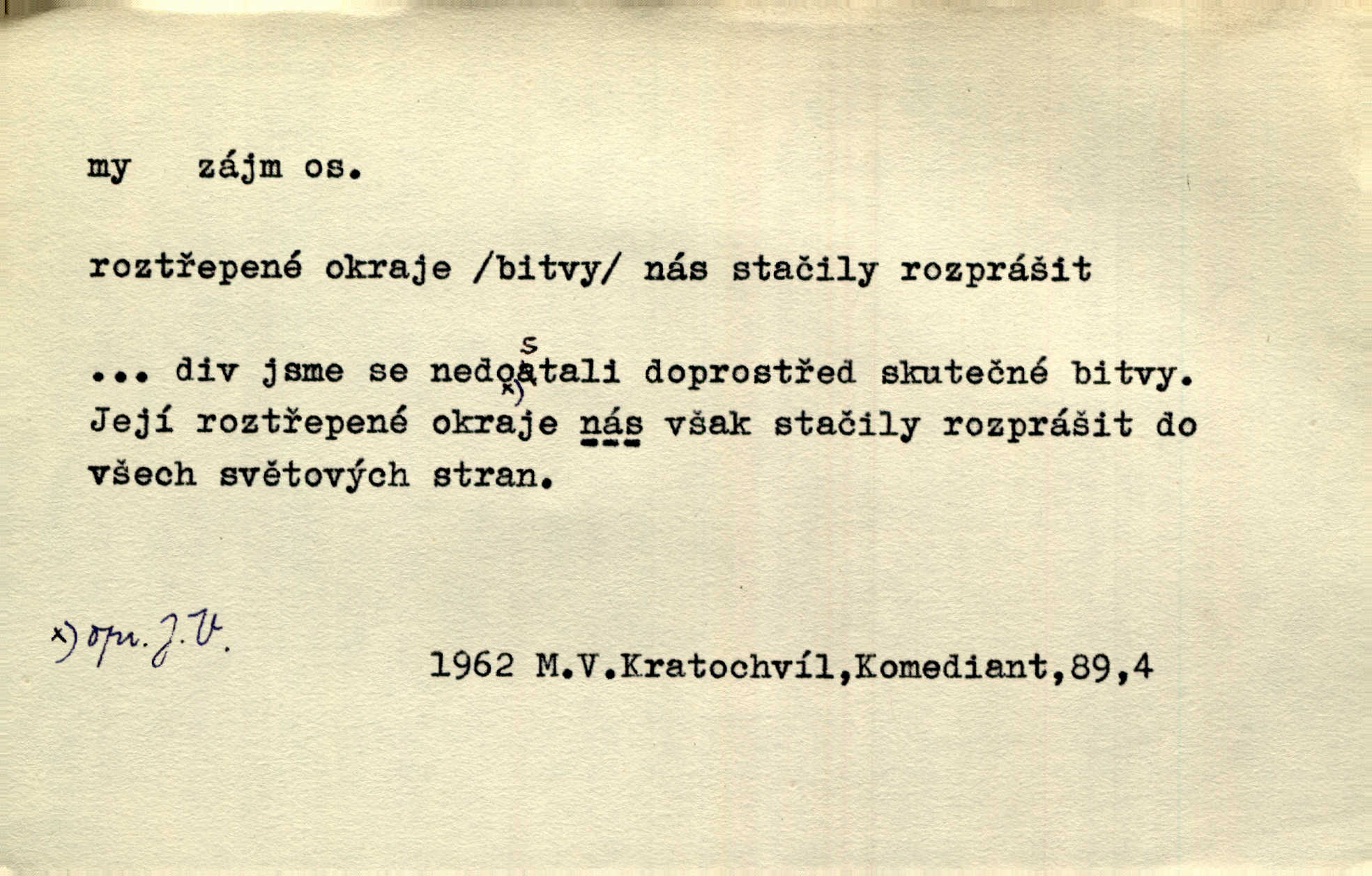 - my zájm. osob. 1. os. pl. (gen., akus., lok. nás, dat. nám, instr. námi) výraz, jímž osoba mluvící označuje skupinu osob, k níž sama náleží. Hospodyně vzavši Báru kolem těla vedla ji do stavení: „Pojďte s námi, tatínku, pojďte!“ Rais. U matčina lože s bratry stojím, chudák dlouho nám už postonává, darmo tážeme se, zdaž naděje nám. Ner. Nom. v podmětě, jsa patrný z tvaru řídícího slovesa, klade se jen v jistých případech: a) je-li na podmětu zvláštní důraz. Vzhůru ženy! My též chceme na oltář svou obět klást. Něm. Kdež pak my proti vám! Rais. Je to náramný rozdíl, co jste udělali vy a co my. Rais. Mohla jsi spíš než my poznat, že se [tatínek] tratí, protože my jsme ho měli stále na očích. Rais. b) jde-li o vyjádření zvláštního pohnutí mysli. Ne, Jene Marie, my se nerozejdeme, my se neloučíme! Zey. Tak! Jdi, jdi stará! A nevzdej se nikomu! My si spolu zatančíme! Pfleg. [Vejběra vzal se skleníku karty a položil je na stůl:] „A co my budeme jen tak sedět.“ Rais. c) při vlídném tónu. Člověk musí hledět, aby s lidmi vyšel. My jsme taky vedli všecko po staru, teprve teď že se to kapku změnilo. Rais. My tady dnes, tatínku, u vás zůstaneme, o doma starost mít nemusíme a vaši si zas můžou odpočinout. Rais. d) je-li částí výrazu složeného. Co chcem, my romantici dobře víme. Ner. Bojím se, jenom my starší že moudříme každičkým rokem! Ner. e) při střídání podmětu. My [sedláci] pány potřebujeme a páni nás. Třeb. Vida, my se modlíme a oni tu bafají a povídají. Rais. f) není-li ve větě určitého tvaru slovesného n. slovesa vůbec. My spolu rostli, co jeden to druhý. Něm. My o vlku a vlk za humny. Pořek. „My o vlku a vlk čumákem ve dveřích.“ Hol. D Dat. nám vyjadřuje citové vzrušení, zvl. ve zvolání. Hle, hle, pan Pelíšek se nám opravdu zamiloval! Rub. Heleť milostslečna Tynda se nám vdává! Čap. Ch. „To jsou nám hosté, zvolal radostně doktor. Šmil. D Ustál. sp. mezi námi (lid. mezi náma) důvěrně. Ale mezi námi, pane Švarný! předce se mi to s ním docela nelíbilo; nebo když někdy chudým dal, říkával: mnoho peněz! Jindy. Je to pravý tatík všech, a oni — to tak mezi náma, pane kmotře! — ještě jej za to šidí. Krás. D označuje jednu osobu, která se cítí částí celku: to bývá a) v slavnostní řeči panovníků. My Karel dvanáctý, král švédský, pozdravujem jonáky volného Zaporoží. Frič. b) v projevech spisovatelů. My zde o povaze jeho [jazyka českého] krátce promluvíme. Jg. Měl-li by ustanoven býti počet větší [ministrův], my bychom tomu také tuze na odpor nebyli. Pal. Nevidí se nám odstoupiti od formy nyní již vůbec přijaté. Zel. D vyjadřuje prostředí, v kterém žijeme (domov, rodný kraj, rodnou zemi, vlastní národ). Halo — Křížku — doveď mě k nám! domů. A. Mrš. Já když zavítal jsem k nám, již jsem chvátal v místo posvěcené [hřbitov]. Svob. „Snad nechcete utíkat?“ ptal se Konopáč. „Musíme k nám,“ přisvědčoval pantáta. Rais. [Snacha má] oči velké a mluví, jakoby byla z nás z našeho rodu. Rais. Pojďte se mnou — odpočiňte si u nás v našem obydlí. Něm. Dávno jste u nás nebyli. Rais. I pěkně vítám, to jsou k nám hosti. Rais. Můžeš mladého hraběte vzíti s sebou: nebude mu to na škodu, pozná-li tady u nás v našem kraji kus jiného světa. Pfleg. Má [farář na zahradě] všecko, co u nás roste v kraji. Baar. Často přidával [zpívající Held] ještě nějakou písničku „od nás“ z rodného kraje. Jir. Vavák hleděl na francouzskou revoluci tak, jak na ni tenkrát u nás většinou hleděli v českém národě, v Čechách. Jir. Cizí osadníci valem k nám se hrnuli. Jir. Byl u nás básník, co jiné měl oči, co měl rád vonné a nádherné růže. Bezr. Písmo dovede se akkomodovat každému pokroku, kdežto nyní už mnohým až k nám dochovaným stavitelským památkám ani nerozumíme do naší, přítomné doby. Ner.