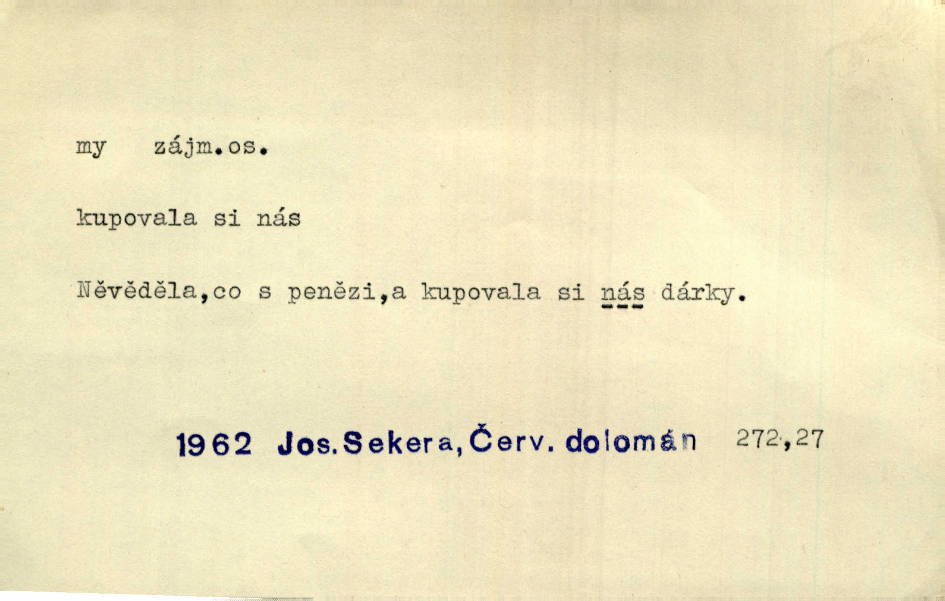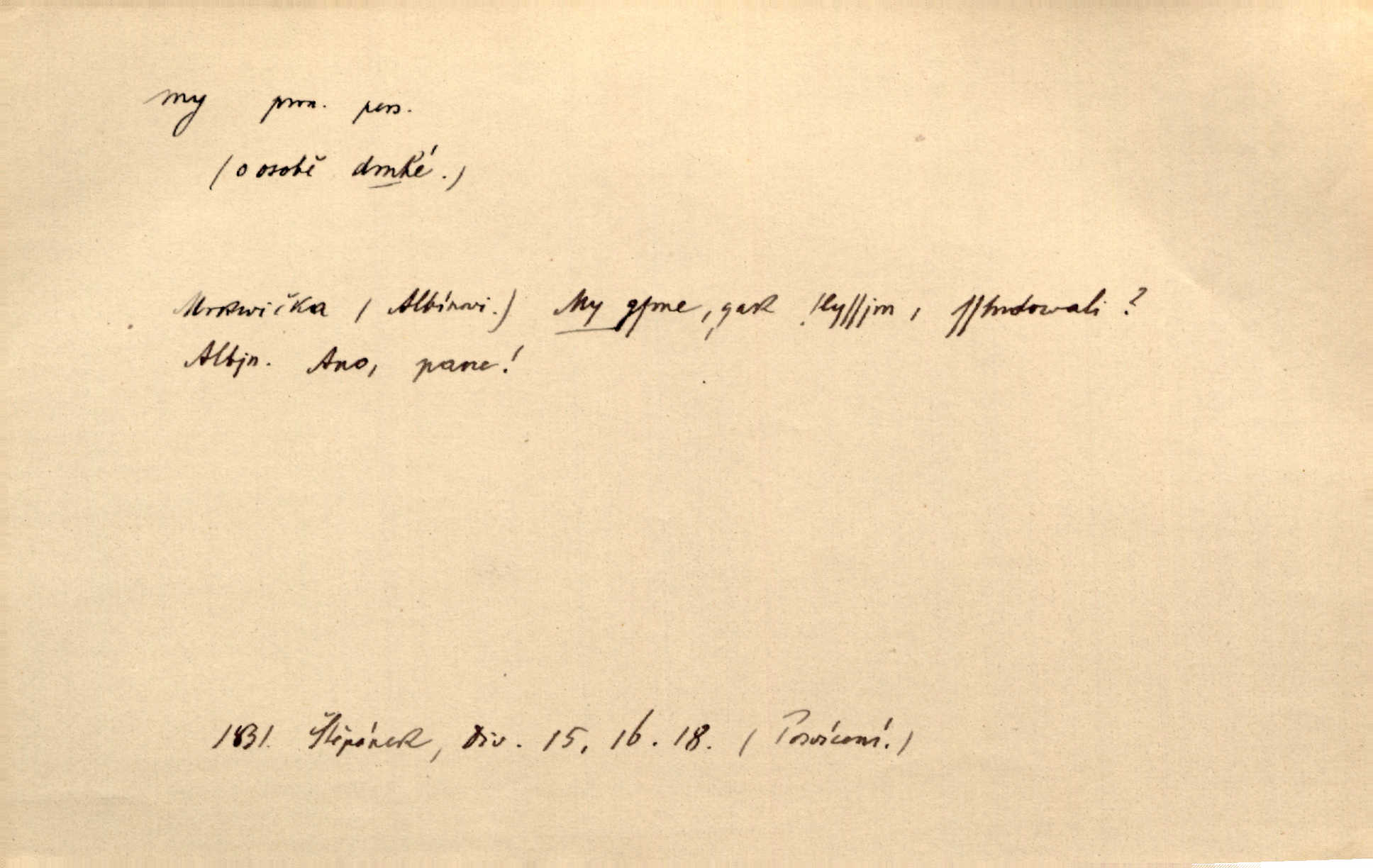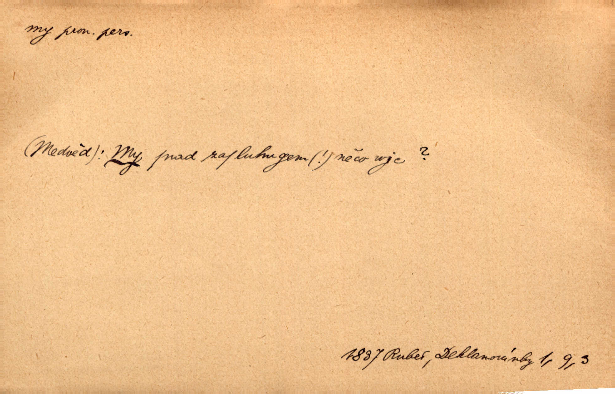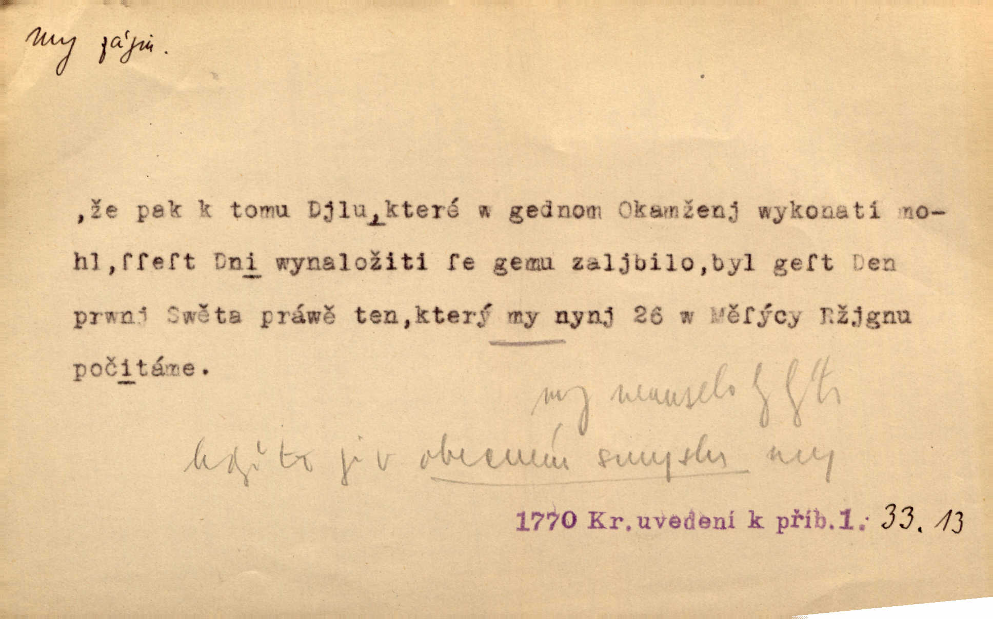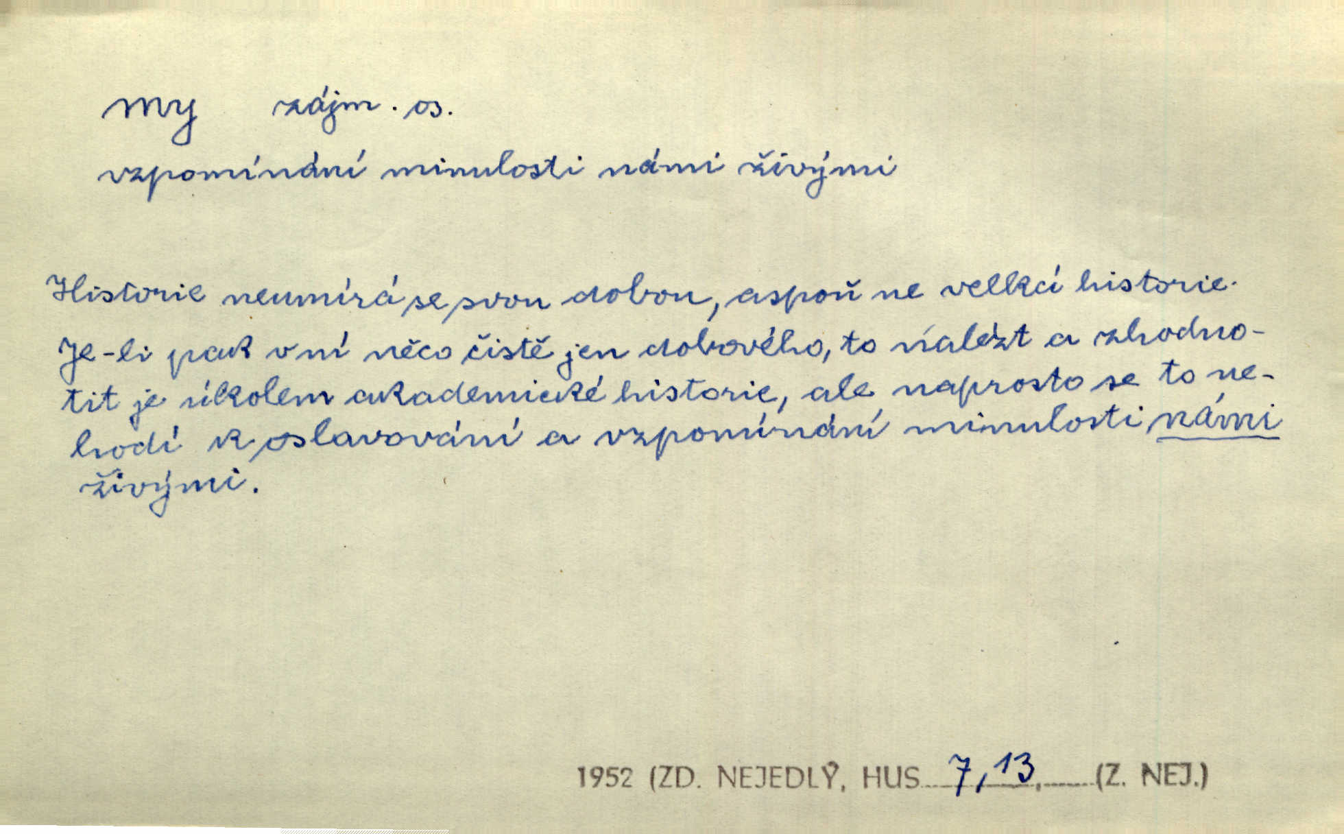 - my zájm. osob. 1. os. pl. (gen., akus., lok. nás, dat. nám, instr. námi) výraz, jímž osoba mluvící označuje skupinu osob, k níž sama náleží. Hospodyně vzavši Báru kolem těla vedla ji do stavení: „Pojďte s námi, tatínku, pojďte!“ Rais. U matčina lože s bratry stojím, chudák dlouho nám už postonává, darmo tážeme se, zdaž naděje nám. Ner. Nom. v podmětě, jsa patrný z tvaru řídícího slovesa, klade se jen v jistých případech: a) je-li na podmětu zvláštní důraz. Vzhůru ženy! My též chceme na oltář svou obět klást. Něm. Kdež pak my proti vám! Rais. Je to náramný rozdíl, co jste udělali vy a co my. Rais. Mohla jsi spíš než my poznat, že se [tatínek] tratí, protože my jsme ho měli stále na očích. Rais. b) jde-li o vyjádření zvláštního pohnutí mysli. Ne, Jene Marie, my se nerozejdeme, my se neloučíme! Zey. Tak! Jdi, jdi stará! A nevzdej se nikomu! My si spolu zatančíme! Pfleg. [Vejběra vzal se skleníku karty a položil je na stůl:] „A co my budeme jen tak sedět.“ Rais. c) při vlídném tónu. Člověk musí hledět, aby s lidmi vyšel. My jsme taky vedli všecko po staru, teprve teď že se to kapku změnilo. Rais. My tady dnes, tatínku, u vás zůstaneme, o doma starost mít nemusíme a vaši si zas můžou odpočinout. Rais. d) je-li částí výrazu složeného. Co chcem, my romantici dobře víme. Ner. Bojím se, jenom my starší že moudříme každičkým rokem! Ner. e) při střídání podmětu. My [sedláci] pány potřebujeme a páni nás. Třeb. Vida, my se modlíme a oni tu bafají a povídají. Rais. f) není-li ve větě určitého tvaru slovesného n. slovesa vůbec. My spolu rostli, co jeden to druhý. Něm. My o vlku a vlk za humny. Pořek. „My o vlku a vlk čumákem ve dveřích.“ Hol. D Dat. nám vyjadřuje citové vzrušení, zvl. ve zvolání. Hle, hle, pan Pelíšek se nám opravdu zamiloval! Rub. Heleť milostslečna Tynda se nám vdává! Čap. Ch. „To jsou nám hosté, zvolal radostně doktor. Šmil. D Ustál. sp. mezi námi (lid. mezi náma) důvěrně. Ale mezi námi, pane Švarný! předce se mi to s ním docela nelíbilo; nebo když někdy chudým dal, říkával: mnoho peněz! Jindy. Je to pravý tatík všech, a oni — to tak mezi náma, pane kmotře! — ještě jej za to šidí. Krás. D označuje jednu osobu, která se cítí částí celku: to bývá a) v slavnostní řeči panovníků. My Karel dvanáctý, král švédský, pozdravujem jonáky volného Zaporoží. Frič. b) v projevech spisovatelů. My zde o povaze jeho [jazyka českého] krátce promluvíme. Jg. Měl-li by ustanoven býti počet větší [ministrův], my bychom tomu také tuze na odpor nebyli. Pal. Nevidí se nám odstoupiti od formy nyní již vůbec přijaté. Zel. D vyjadřuje prostředí, v kterém žijeme (domov, rodný kraj, rodnou zemi, vlastní národ). Halo — Křížku — doveď mě k nám! domů. A. Mrš. Já když zavítal jsem k nám, již jsem chvátal v místo posvěcené [hřbitov]. Svob. „Snad nechcete utíkat?“ ptal se Konopáč. „Musíme k nám,“ přisvědčoval pantáta. Rais. [Snacha má] oči velké a mluví, jakoby byla z nás z našeho rodu. Rais. Pojďte se mnou — odpočiňte si u nás v našem obydlí. Něm. Dávno jste u nás nebyli. Rais. I pěkně vítám, to jsou k nám hosti. Rais. Můžeš mladého hraběte vzíti s sebou: nebude mu to na škodu, pozná-li tady u nás v našem kraji kus jiného světa. Pfleg. Má [farář na zahradě] všecko, co u nás roste v kraji. Baar. Často přidával [zpívající Held] ještě nějakou písničku „od nás“ z rodného kraje. Jir. Vavák hleděl na francouzskou revoluci tak, jak na ni tenkrát u nás většinou hleděli v českém národě, v Čechách. Jir. Cizí osadníci valem k nám se hrnuli. Jir. Byl u nás básník, co jiné měl oči, co měl rád vonné a nádherné růže. Bezr. Písmo dovede se akkomodovat každému pokroku, kdežto nyní už mnohým až k nám dochovaným stavitelským památkám ani nerozumíme do naší, přítomné doby. Ner.