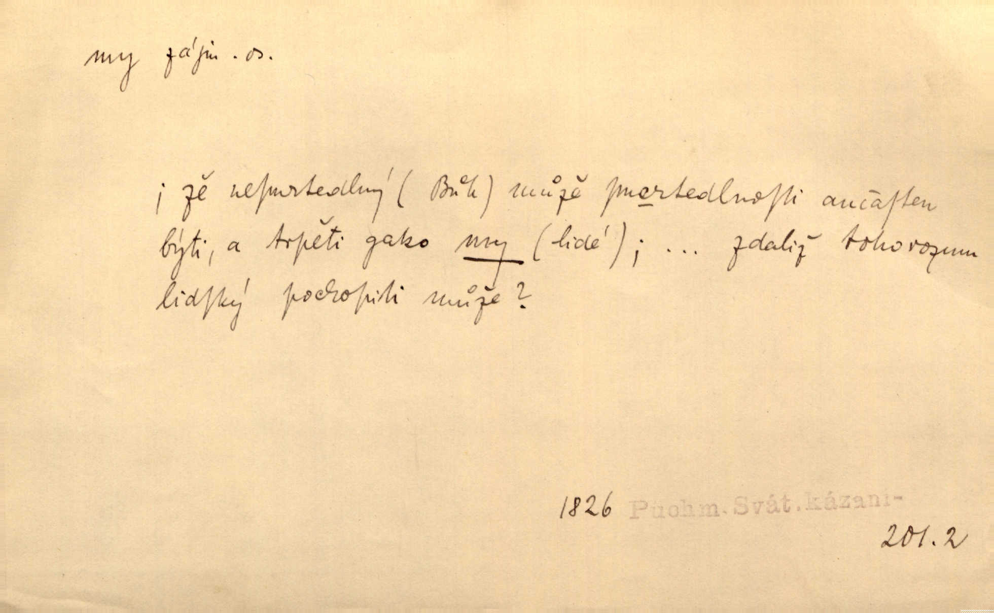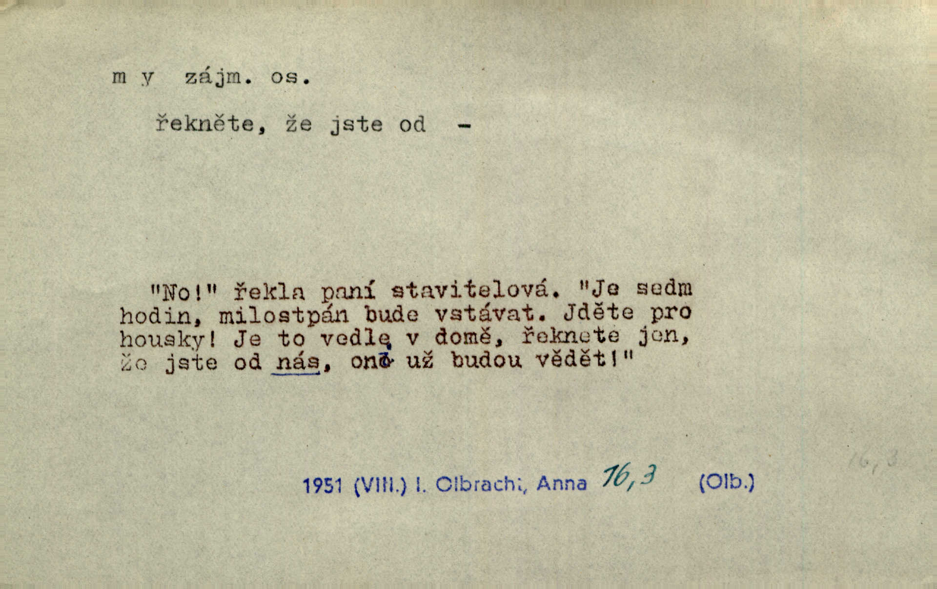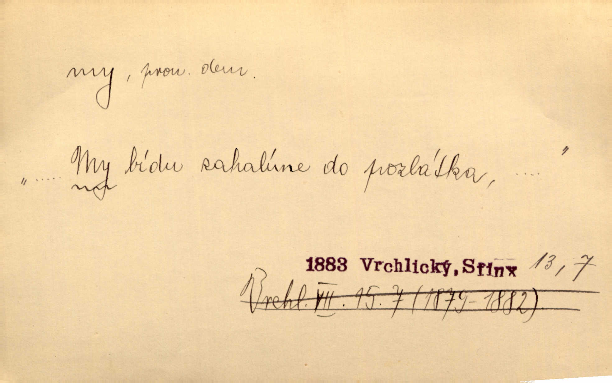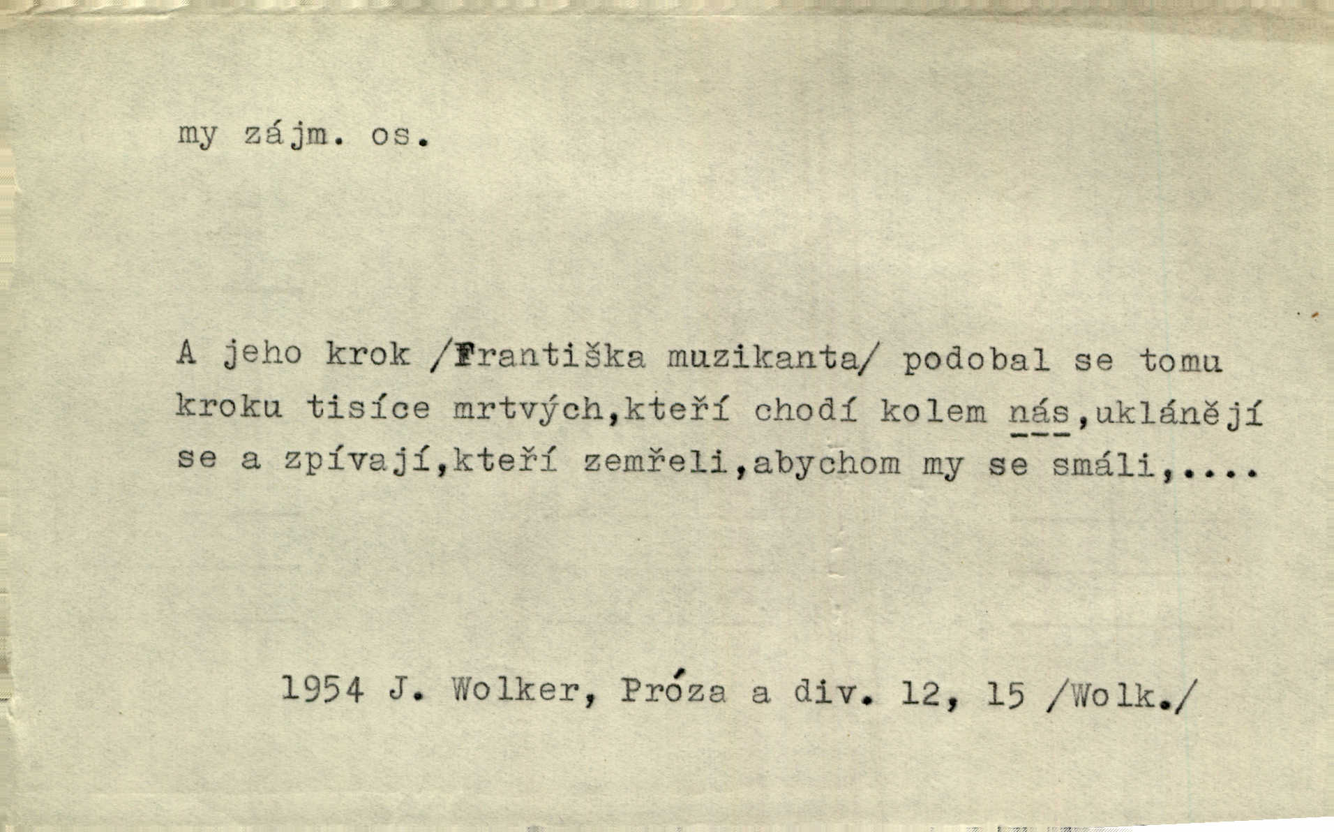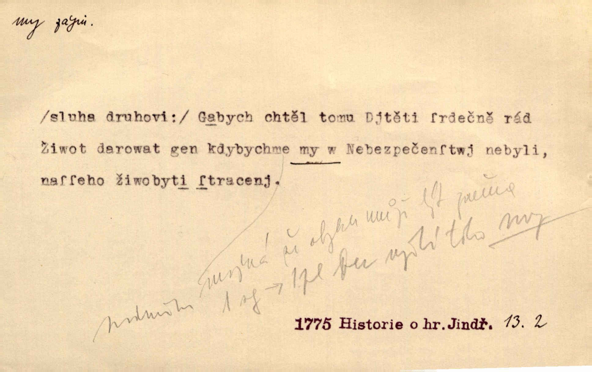 - my zájm. osob. 1. os. pl. (gen., akus., lok. nás, dat. nám, instr. námi) výraz, jímž osoba mluvící označuje skupinu osob, k níž sama náleží. Hospodyně vzavši Báru kolem těla vedla ji do stavení: „Pojďte s námi, tatínku, pojďte!“ Rais. U matčina lože s bratry stojím, chudák dlouho nám už postonává, darmo tážeme se, zdaž naděje nám. Ner. Nom. v podmětě, jsa patrný z tvaru řídícího slovesa, klade se jen v jistých případech: a) je-li na podmětu zvláštní důraz. Vzhůru ženy! My též chceme na oltář svou obět klást. Něm. Kdež pak my proti vám! Rais. Je to náramný rozdíl, co jste udělali vy a co my. Rais. Mohla jsi spíš než my poznat, že se [tatínek] tratí, protože my jsme ho měli stále na očích. Rais. b) jde-li o vyjádření zvláštního pohnutí mysli. Ne, Jene Marie, my se nerozejdeme, my se neloučíme! Zey. Tak! Jdi, jdi stará! A nevzdej se nikomu! My si spolu zatančíme! Pfleg. [Vejběra vzal se skleníku karty a položil je na stůl:] „A co my budeme jen tak sedět.“ Rais. c) při vlídném tónu. Člověk musí hledět, aby s lidmi vyšel. My jsme taky vedli všecko po staru, teprve teď že se to kapku změnilo. Rais. My tady dnes, tatínku, u vás zůstaneme, o doma starost mít nemusíme a vaši si zas můžou odpočinout. Rais. d) je-li částí výrazu složeného. Co chcem, my romantici dobře víme. Ner. Bojím se, jenom my starší že moudříme každičkým rokem! Ner. e) při střídání podmětu. My [sedláci] pány potřebujeme a páni nás. Třeb. Vida, my se modlíme a oni tu bafají a povídají. Rais. f) není-li ve větě určitého tvaru slovesného n. slovesa vůbec. My spolu rostli, co jeden to druhý. Něm. My o vlku a vlk za humny. Pořek. „My o vlku a vlk čumákem ve dveřích.“ Hol. D Dat. nám vyjadřuje citové vzrušení, zvl. ve zvolání. Hle, hle, pan Pelíšek se nám opravdu zamiloval! Rub. Heleť milostslečna Tynda se nám vdává! Čap. Ch. „To jsou nám hosté, zvolal radostně doktor. Šmil. D Ustál. sp. mezi námi (lid. mezi náma) důvěrně. Ale mezi námi, pane Švarný! předce se mi to s ním docela nelíbilo; nebo když někdy chudým dal, říkával: mnoho peněz! Jindy. Je to pravý tatík všech, a oni — to tak mezi náma, pane kmotře! — ještě jej za to šidí. Krás. D označuje jednu osobu, která se cítí částí celku: to bývá a) v slavnostní řeči panovníků. My Karel dvanáctý, král švédský, pozdravujem jonáky volného Zaporoží. Frič. b) v projevech spisovatelů. My zde o povaze jeho [jazyka českého] krátce promluvíme. Jg. Měl-li by ustanoven býti počet větší [ministrův], my bychom tomu také tuze na odpor nebyli. Pal. Nevidí se nám odstoupiti od formy nyní již vůbec přijaté. Zel. D vyjadřuje prostředí, v kterém žijeme (domov, rodný kraj, rodnou zemi, vlastní národ). Halo — Křížku — doveď mě k nám! domů. A. Mrš. Já když zavítal jsem k nám, již jsem chvátal v místo posvěcené [hřbitov]. Svob. „Snad nechcete utíkat?“ ptal se Konopáč. „Musíme k nám,“ přisvědčoval pantáta. Rais. [Snacha má] oči velké a mluví, jakoby byla z nás z našeho rodu. Rais. Pojďte se mnou — odpočiňte si u nás v našem obydlí. Něm. Dávno jste u nás nebyli. Rais. I pěkně vítám, to jsou k nám hosti. Rais. Můžeš mladého hraběte vzíti s sebou: nebude mu to na škodu, pozná-li tady u nás v našem kraji kus jiného světa. Pfleg. Má [farář na zahradě] všecko, co u nás roste v kraji. Baar. Často přidával [zpívající Held] ještě nějakou písničku „od nás“ z rodného kraje. Jir. Vavák hleděl na francouzskou revoluci tak, jak na ni tenkrát u nás většinou hleděli v českém národě, v Čechách. Jir. Cizí osadníci valem k nám se hrnuli. Jir. Byl u nás básník, co jiné měl oči, co měl rád vonné a nádherné růže. Bezr. Písmo dovede se akkomodovat každému pokroku, kdežto nyní už mnohým až k nám dochovaným stavitelským památkám ani nerozumíme do naší, přítomné doby. Ner.