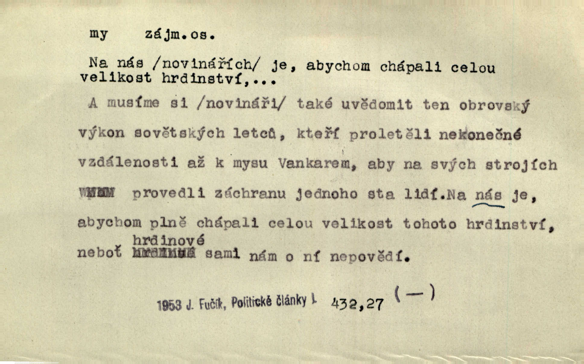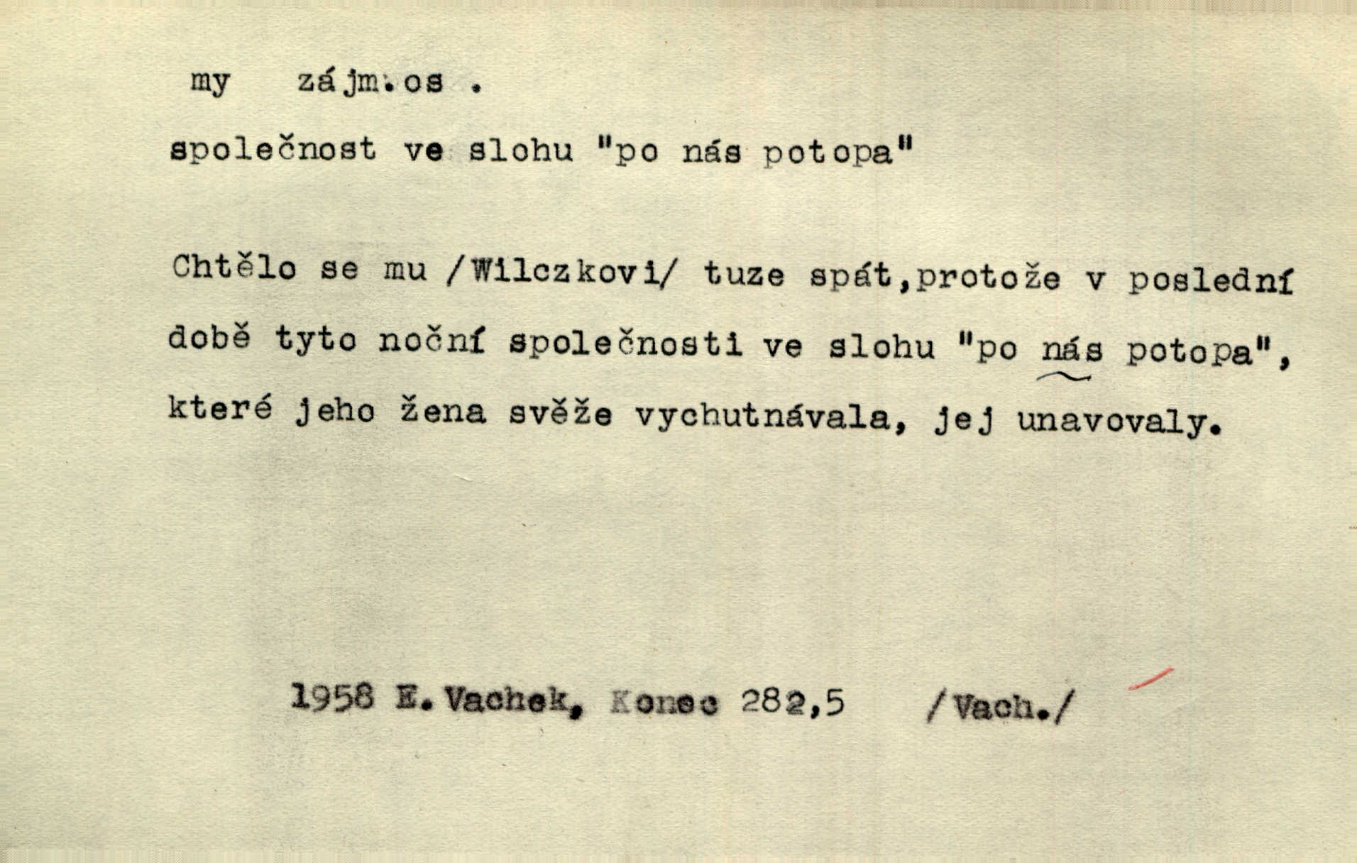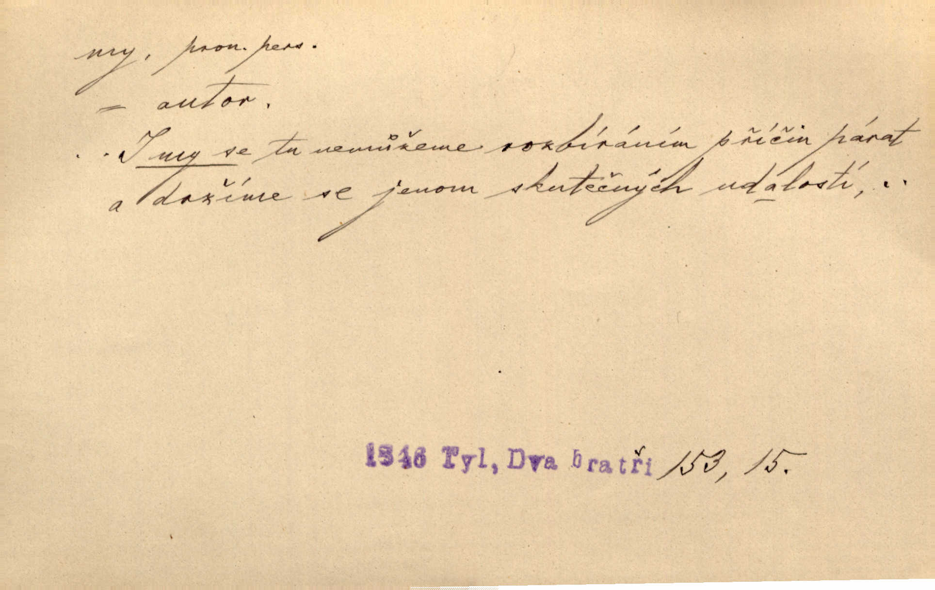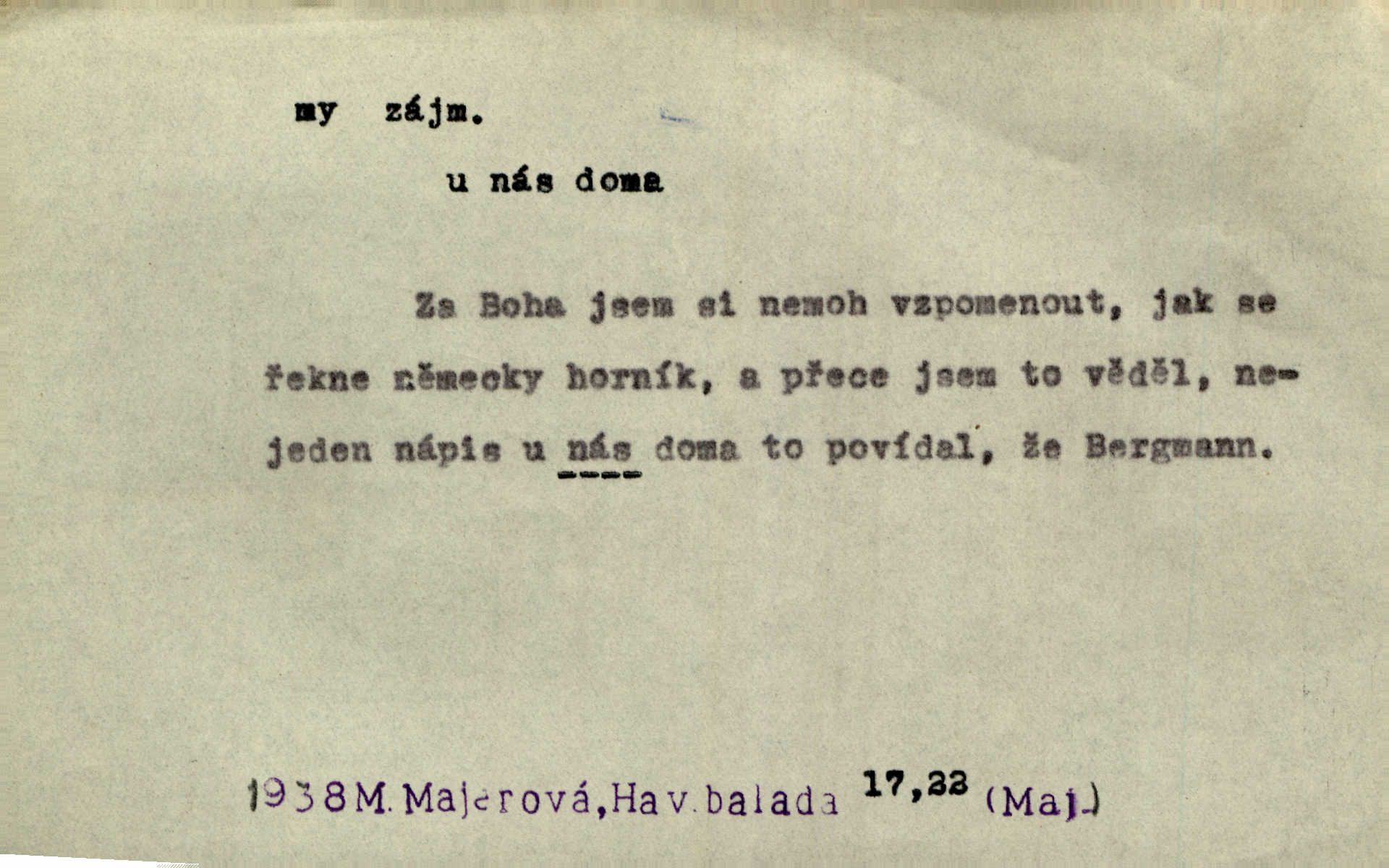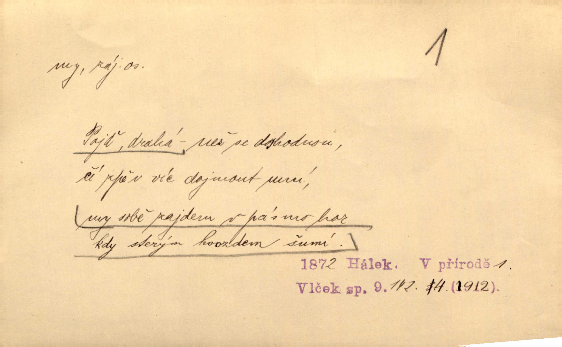 - my zájm. osob. 1. os. pl. (gen., akus., lok. nás, dat. nám, instr. námi) výraz, jímž osoba mluvící označuje skupinu osob, k níž sama náleží. Hospodyně vzavši Báru kolem těla vedla ji do stavení: „Pojďte s námi, tatínku, pojďte!“ Rais. U matčina lože s bratry stojím, chudák dlouho nám už postonává, darmo tážeme se, zdaž naděje nám. Ner. Nom. v podmětě, jsa patrný z tvaru řídícího slovesa, klade se jen v jistých případech: a) je-li na podmětu zvláštní důraz. Vzhůru ženy! My též chceme na oltář svou obět klást. Něm. Kdež pak my proti vám! Rais. Je to náramný rozdíl, co jste udělali vy a co my. Rais. Mohla jsi spíš než my poznat, že se [tatínek] tratí, protože my jsme ho měli stále na očích. Rais. b) jde-li o vyjádření zvláštního pohnutí mysli. Ne, Jene Marie, my se nerozejdeme, my se neloučíme! Zey. Tak! Jdi, jdi stará! A nevzdej se nikomu! My si spolu zatančíme! Pfleg. [Vejběra vzal se skleníku karty a položil je na stůl:] „A co my budeme jen tak sedět.“ Rais. c) při vlídném tónu. Člověk musí hledět, aby s lidmi vyšel. My jsme taky vedli všecko po staru, teprve teď že se to kapku změnilo. Rais. My tady dnes, tatínku, u vás zůstaneme, o doma starost mít nemusíme a vaši si zas můžou odpočinout. Rais. d) je-li částí výrazu složeného. Co chcem, my romantici dobře víme. Ner. Bojím se, jenom my starší že moudříme každičkým rokem! Ner. e) při střídání podmětu. My [sedláci] pány potřebujeme a páni nás. Třeb. Vida, my se modlíme a oni tu bafají a povídají. Rais. f) není-li ve větě určitého tvaru slovesného n. slovesa vůbec. My spolu rostli, co jeden to druhý. Něm. My o vlku a vlk za humny. Pořek. „My o vlku a vlk čumákem ve dveřích.“ Hol. D Dat. nám vyjadřuje citové vzrušení, zvl. ve zvolání. Hle, hle, pan Pelíšek se nám opravdu zamiloval! Rub. Heleť milostslečna Tynda se nám vdává! Čap. Ch. „To jsou nám hosté, zvolal radostně doktor. Šmil. D Ustál. sp. mezi námi (lid. mezi náma) důvěrně. Ale mezi námi, pane Švarný! předce se mi to s ním docela nelíbilo; nebo když někdy chudým dal, říkával: mnoho peněz! Jindy. Je to pravý tatík všech, a oni — to tak mezi náma, pane kmotře! — ještě jej za to šidí. Krás. D označuje jednu osobu, která se cítí částí celku: to bývá a) v slavnostní řeči panovníků. My Karel dvanáctý, král švédský, pozdravujem jonáky volného Zaporoží. Frič. b) v projevech spisovatelů. My zde o povaze jeho [jazyka českého] krátce promluvíme. Jg. Měl-li by ustanoven býti počet větší [ministrův], my bychom tomu také tuze na odpor nebyli. Pal. Nevidí se nám odstoupiti od formy nyní již vůbec přijaté. Zel. D vyjadřuje prostředí, v kterém žijeme (domov, rodný kraj, rodnou zemi, vlastní národ). Halo — Křížku — doveď mě k nám! domů. A. Mrš. Já když zavítal jsem k nám, již jsem chvátal v místo posvěcené [hřbitov]. Svob. „Snad nechcete utíkat?“ ptal se Konopáč. „Musíme k nám,“ přisvědčoval pantáta. Rais. [Snacha má] oči velké a mluví, jakoby byla z nás z našeho rodu. Rais. Pojďte se mnou — odpočiňte si u nás v našem obydlí. Něm. Dávno jste u nás nebyli. Rais. I pěkně vítám, to jsou k nám hosti. Rais. Můžeš mladého hraběte vzíti s sebou: nebude mu to na škodu, pozná-li tady u nás v našem kraji kus jiného světa. Pfleg. Má [farář na zahradě] všecko, co u nás roste v kraji. Baar. Často přidával [zpívající Held] ještě nějakou písničku „od nás“ z rodného kraje. Jir. Vavák hleděl na francouzskou revoluci tak, jak na ni tenkrát u nás většinou hleděli v českém národě, v Čechách. Jir. Cizí osadníci valem k nám se hrnuli. Jir. Byl u nás básník, co jiné měl oči, co měl rád vonné a nádherné růže. Bezr. Písmo dovede se akkomodovat každému pokroku, kdežto nyní už mnohým až k nám dochovaným stavitelským památkám ani nerozumíme do naší, přítomné doby. Ner.