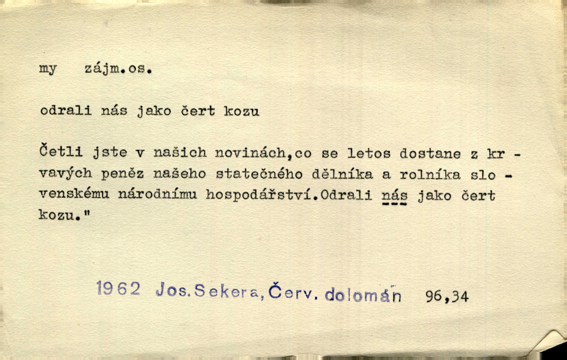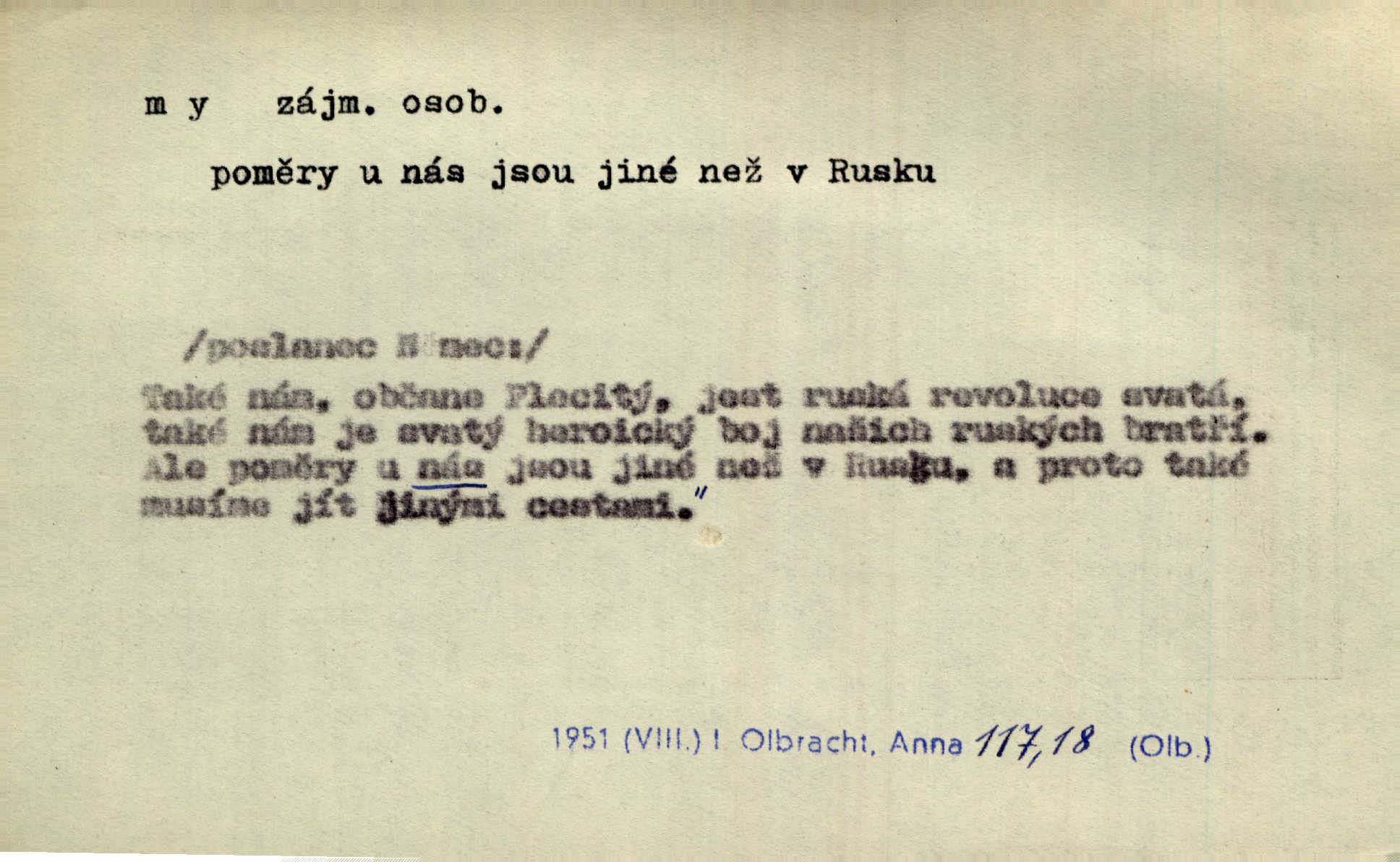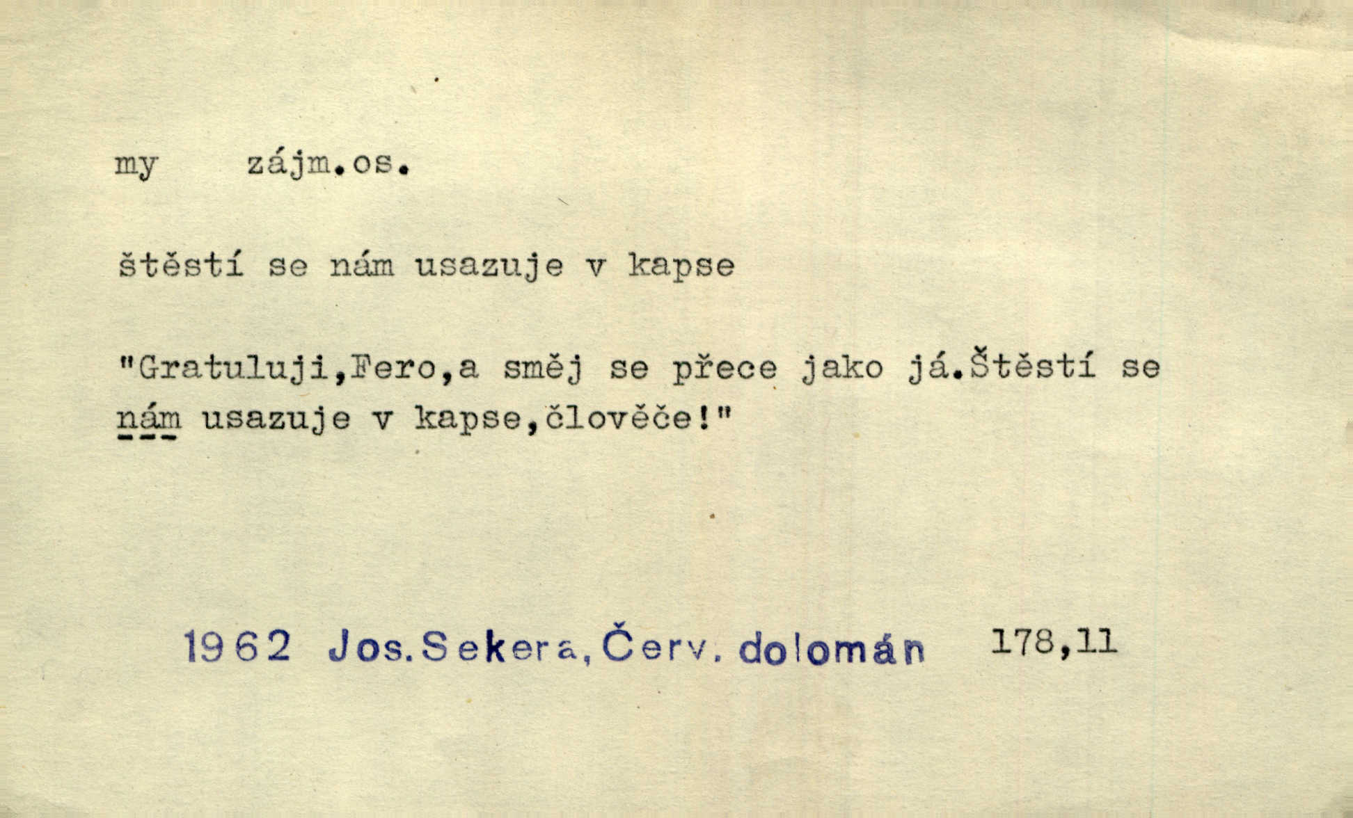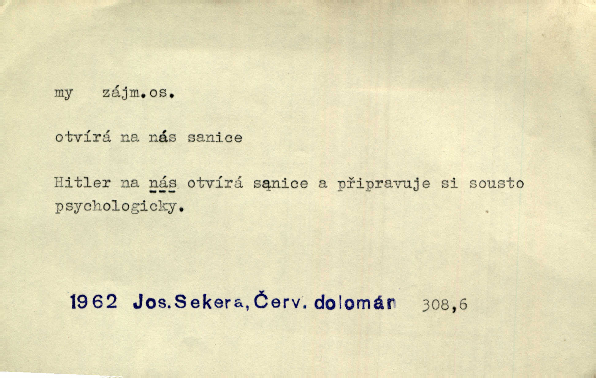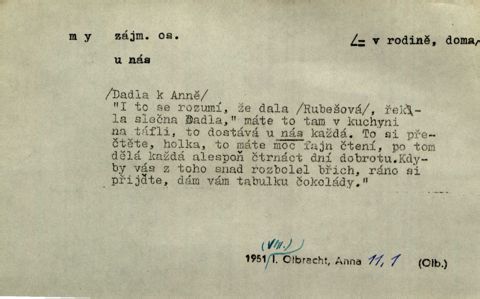 - my zájm. osob. 1. os. pl. (gen., akus., lok. nás, dat. nám, instr. námi) výraz, jímž osoba mluvící označuje skupinu osob, k níž sama náleží. Hospodyně vzavši Báru kolem těla vedla ji do stavení: „Pojďte s námi, tatínku, pojďte!“ Rais. U matčina lože s bratry stojím, chudák dlouho nám už postonává, darmo tážeme se, zdaž naděje nám. Ner. Nom. v podmětě, jsa patrný z tvaru řídícího slovesa, klade se jen v jistých případech: a) je-li na podmětu zvláštní důraz. Vzhůru ženy! My též chceme na oltář svou obět klást. Něm. Kdež pak my proti vám! Rais. Je to náramný rozdíl, co jste udělali vy a co my. Rais. Mohla jsi spíš než my poznat, že se [tatínek] tratí, protože my jsme ho měli stále na očích. Rais. b) jde-li o vyjádření zvláštního pohnutí mysli. Ne, Jene Marie, my se nerozejdeme, my se neloučíme! Zey. Tak! Jdi, jdi stará! A nevzdej se nikomu! My si spolu zatančíme! Pfleg. [Vejběra vzal se skleníku karty a položil je na stůl:] „A co my budeme jen tak sedět.“ Rais. c) při vlídném tónu. Člověk musí hledět, aby s lidmi vyšel. My jsme taky vedli všecko po staru, teprve teď že se to kapku změnilo. Rais. My tady dnes, tatínku, u vás zůstaneme, o doma starost mít nemusíme a vaši si zas můžou odpočinout. Rais. d) je-li částí výrazu složeného. Co chcem, my romantici dobře víme. Ner. Bojím se, jenom my starší že moudříme každičkým rokem! Ner. e) při střídání podmětu. My [sedláci] pány potřebujeme a páni nás. Třeb. Vida, my se modlíme a oni tu bafají a povídají. Rais. f) není-li ve větě určitého tvaru slovesného n. slovesa vůbec. My spolu rostli, co jeden to druhý. Něm. My o vlku a vlk za humny. Pořek. „My o vlku a vlk čumákem ve dveřích.“ Hol. D Dat. nám vyjadřuje citové vzrušení, zvl. ve zvolání. Hle, hle, pan Pelíšek se nám opravdu zamiloval! Rub. Heleť milostslečna Tynda se nám vdává! Čap. Ch. „To jsou nám hosté, zvolal radostně doktor. Šmil. D Ustál. sp. mezi námi (lid. mezi náma) důvěrně. Ale mezi námi, pane Švarný! předce se mi to s ním docela nelíbilo; nebo když někdy chudým dal, říkával: mnoho peněz! Jindy. Je to pravý tatík všech, a oni — to tak mezi náma, pane kmotře! — ještě jej za to šidí. Krás. D označuje jednu osobu, která se cítí částí celku: to bývá a) v slavnostní řeči panovníků. My Karel dvanáctý, král švédský, pozdravujem jonáky volného Zaporoží. Frič. b) v projevech spisovatelů. My zde o povaze jeho [jazyka českého] krátce promluvíme. Jg. Měl-li by ustanoven býti počet větší [ministrův], my bychom tomu také tuze na odpor nebyli. Pal. Nevidí se nám odstoupiti od formy nyní již vůbec přijaté. Zel. D vyjadřuje prostředí, v kterém žijeme (domov, rodný kraj, rodnou zemi, vlastní národ). Halo — Křížku — doveď mě k nám! domů. A. Mrš. Já když zavítal jsem k nám, již jsem chvátal v místo posvěcené [hřbitov]. Svob. „Snad nechcete utíkat?“ ptal se Konopáč. „Musíme k nám,“ přisvědčoval pantáta. Rais. [Snacha má] oči velké a mluví, jakoby byla z nás z našeho rodu. Rais. Pojďte se mnou — odpočiňte si u nás v našem obydlí. Něm. Dávno jste u nás nebyli. Rais. I pěkně vítám, to jsou k nám hosti. Rais. Můžeš mladého hraběte vzíti s sebou: nebude mu to na škodu, pozná-li tady u nás v našem kraji kus jiného světa. Pfleg. Má [farář na zahradě] všecko, co u nás roste v kraji. Baar. Často přidával [zpívající Held] ještě nějakou písničku „od nás“ z rodného kraje. Jir. Vavák hleděl na francouzskou revoluci tak, jak na ni tenkrát u nás většinou hleděli v českém národě, v Čechách. Jir. Cizí osadníci valem k nám se hrnuli. Jir. Byl u nás básník, co jiné měl oči, co měl rád vonné a nádherné růže. Bezr. Písmo dovede se akkomodovat každému pokroku, kdežto nyní už mnohým až k nám dochovaným stavitelským památkám ani nerozumíme do naší, přítomné doby. Ner.