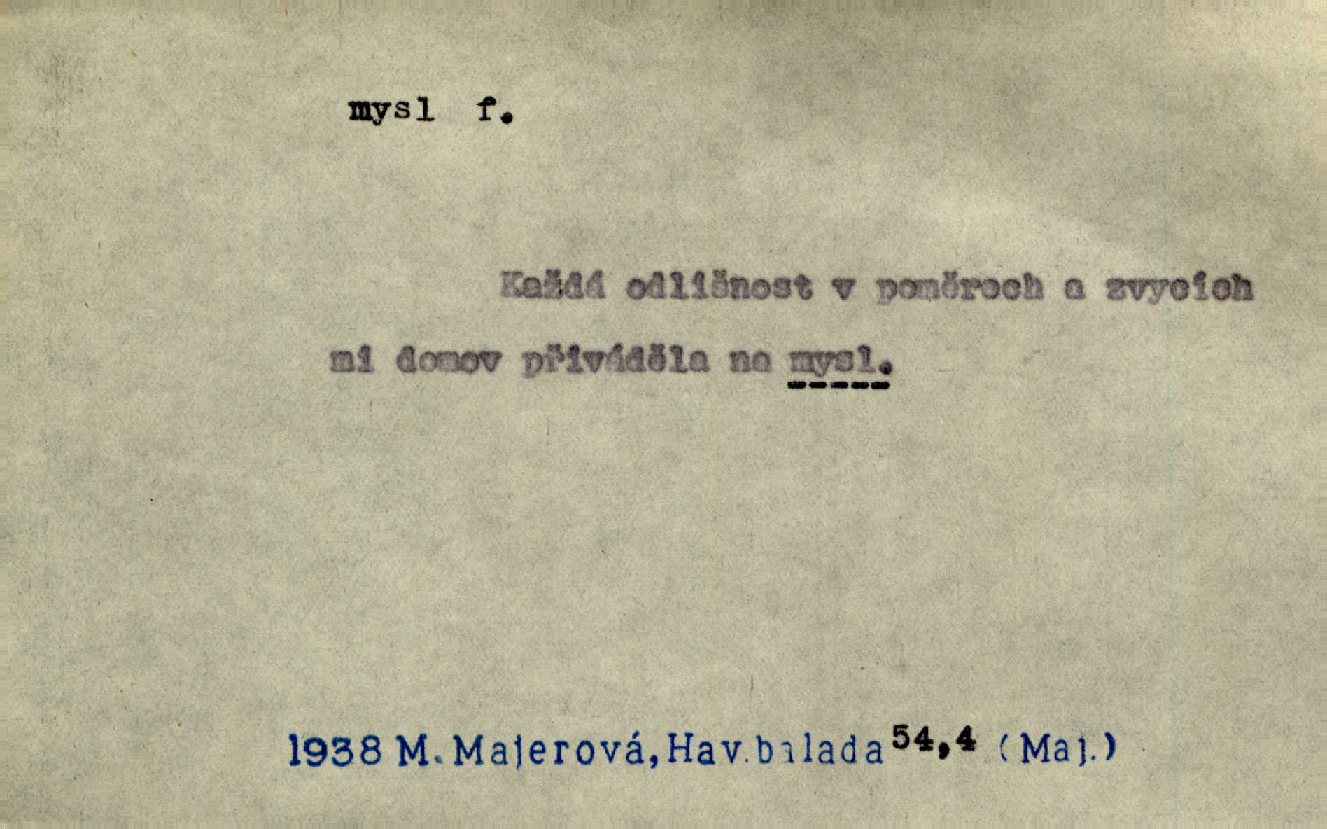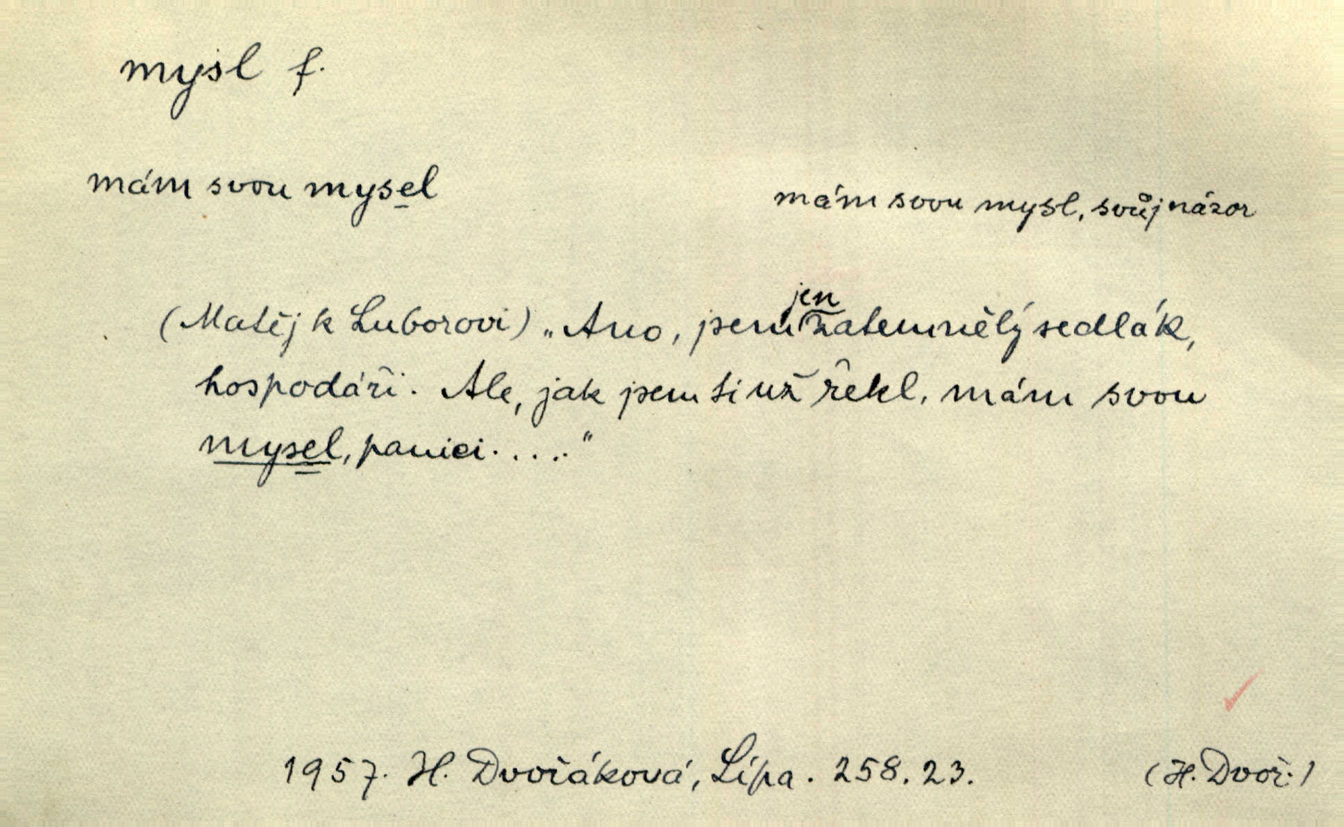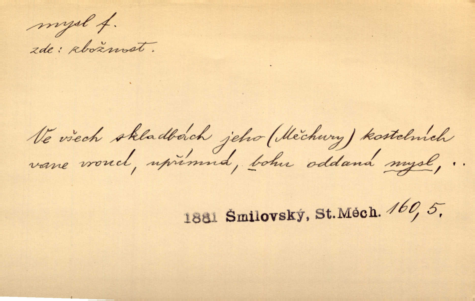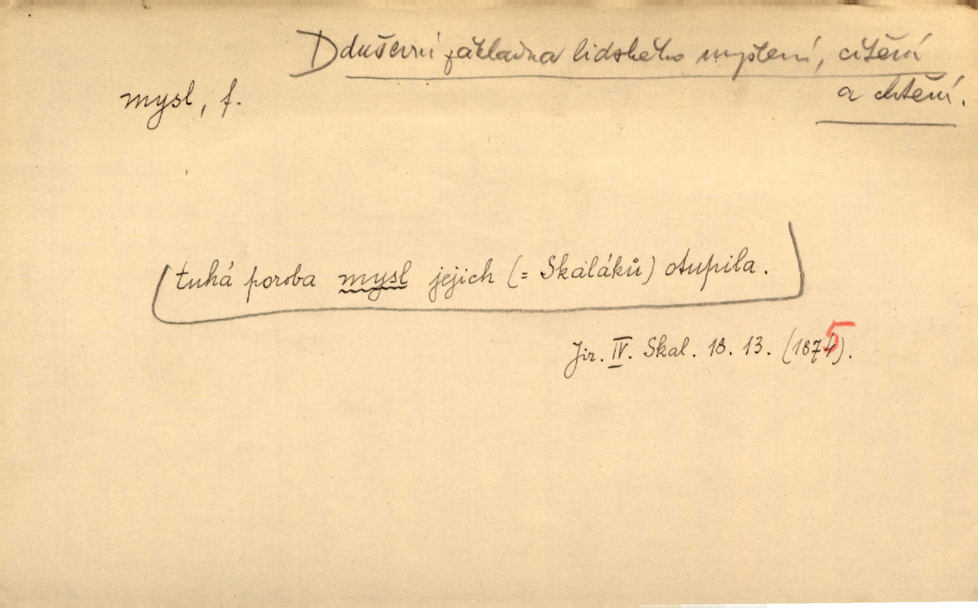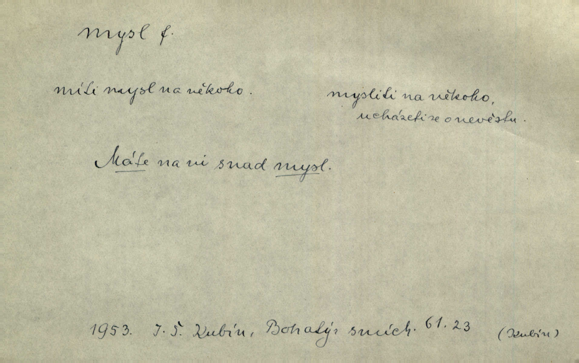 - mysl, -i f. (pl. dat. myslím, lok. myslích, instr. myslemi) duševní základna lidského myšlení, cítění a chtění. Tuhá poroba mysl jejich otupila. Jir. Událosť ta zaujala mysli všech našich přátel. Šmil. Ta [matka] se navzpomínala! Pořád to měla na mysli na to myslila. Třeb. Jindřich, maje na mysli válečnou slávu, hotovil se k boji. Tomíč. Bylo podškrtnuto ještě jiné místo, které mi dříve nepřišlo na mysl kterého jsem si nevšiml. K. Čap. Srdce její chytlo se kdysi na podobu šohaje, jenž jí nevypadl z mysli nezapomněla naň. Herb. Zvoleň mu nešla z mysli. Jir. Sejde s očí, sejde s mysli zapomene se. Přísl. Že já jsem bratrem jejím, prosím, abys pustil z mysli nemyslil na to. Šmil. Pro přírodu měl mysl přístupnou. Šmil. Já nevím, co jsem dělala, snad jsem byla na mysli spletená. Čap. Ch. Zdali neklesá [Havlíček v Brixenu] na mysli a nesžírá-li zoufalství jeho ňadra? Herb. Filos. pocitová základna a povaha logického myšlení. D mínění, smýšlení, názory, přesvědčení. Vím, že jste jedné mysli s tím nehodným knězem. Jir. Všude se mi stýskalo, všecko bylo mi proti mysli. Něm. Když provdávali starší sestru za advokáta, nebylo jí to [mladší sestře] po mysli. Šmil. Ve všech skladbách jeho vane vroucí, upřímná, bohu oddaná mysl. Šmil. Ne vždy se na světě potkáte s tak citlivým srdcem a s tak šlechetnou myslí. Sab. Byl to člověk lehké mysli lehkomyslný. Něm. První jeho žena byla ze zemanského rodu a vysoké mysli hrdá. Vrba. D citový obsah lidského nitra, nálada, chuť k něčemu. Jiskra byl dobré mysli. Jir. Vybízel dělníky k zpěvu, aby těžká práce neudusila veselou a zdravou mysl. Pfleg. Veselá mysl půl zdraví. Pořek. Není hodno ani radostí ani žalem kormoutiti jasnou mysl. Klác. S veselou myslí v srdci opouštěl jsem zámek. Stroup. Cítil se příliš osamělým a byl proto těžké mysli. Šmil. Sluší s myslí hrdinnou buď čekat mír, buď ránu poslední. Vrch. D dobrá mysl lid. rostlina dobromysl, Origanum. Rozkvétá tu macoška, tymian, dobrá mysl. Vrch. Dobrá mysl pomáhá od bolesti zubů a štípání v hlavě. R. Svob. D odvaha, zmužilost, energie. Dodal si mysli a vešel. Svět. Nyní mu klesá mysl a již se poddává úzkosti a bázni. Prav. Teď teprve nabyli postrašení [pijáci] mysli a spěchali za ním. J. J. Kol. Když nechcete, zůstanu, jenom se utište — a neztrácejte mysl! Šim.