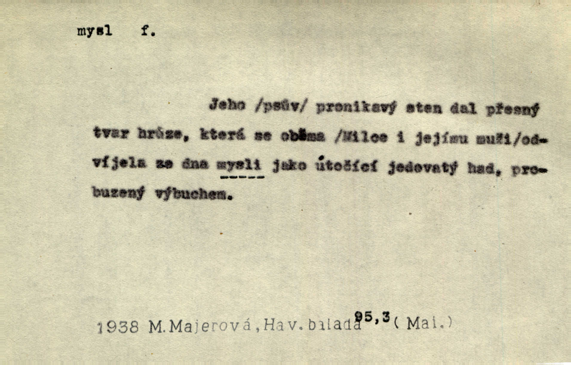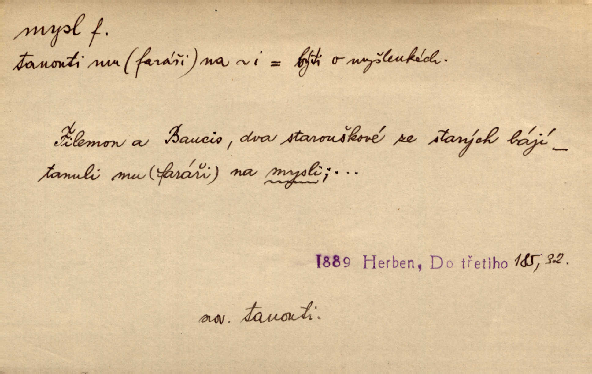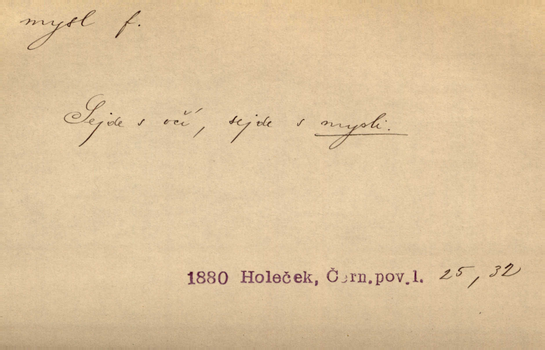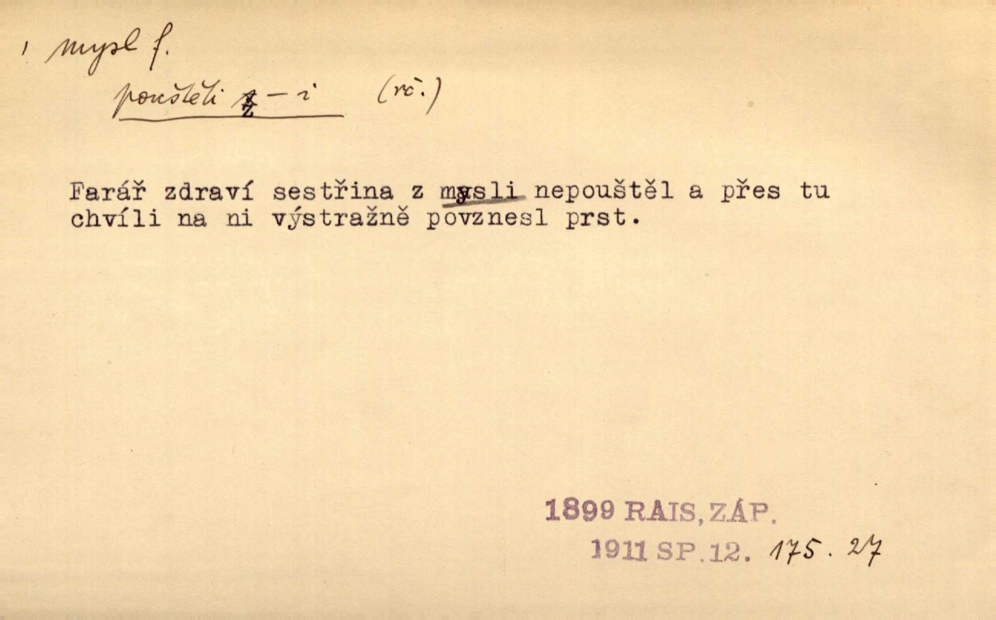 - mysl, -i f. (pl. dat. myslím, lok. myslích, instr. myslemi) duševní základna lidského myšlení, cítění a chtění. Tuhá poroba mysl jejich otupila. Jir. Událosť ta zaujala mysli všech našich přátel. Šmil. Ta [matka] se navzpomínala! Pořád to měla na mysli na to myslila. Třeb. Jindřich, maje na mysli válečnou slávu, hotovil se k boji. Tomíč. Bylo podškrtnuto ještě jiné místo, které mi dříve nepřišlo na mysl kterého jsem si nevšiml. K. Čap. Srdce její chytlo se kdysi na podobu šohaje, jenž jí nevypadl z mysli nezapomněla naň. Herb. Zvoleň mu nešla z mysli. Jir. Sejde s očí, sejde s mysli zapomene se. Přísl. Že já jsem bratrem jejím, prosím, abys pustil z mysli nemyslil na to. Šmil. Pro přírodu měl mysl přístupnou. Šmil. Já nevím, co jsem dělala, snad jsem byla na mysli spletená. Čap. Ch. Zdali neklesá [Havlíček v Brixenu] na mysli a nesžírá-li zoufalství jeho ňadra? Herb. Filos. pocitová základna a povaha logického myšlení. D mínění, smýšlení, názory, přesvědčení. Vím, že jste jedné mysli s tím nehodným knězem. Jir. Všude se mi stýskalo, všecko bylo mi proti mysli. Něm. Když provdávali starší sestru za advokáta, nebylo jí to [mladší sestře] po mysli. Šmil. Ve všech skladbách jeho vane vroucí, upřímná, bohu oddaná mysl. Šmil. Ne vždy se na světě potkáte s tak citlivým srdcem a s tak šlechetnou myslí. Sab. Byl to člověk lehké mysli lehkomyslný. Něm. První jeho žena byla ze zemanského rodu a vysoké mysli hrdá. Vrba. D citový obsah lidského nitra, nálada, chuť k něčemu. Jiskra byl dobré mysli. Jir. Vybízel dělníky k zpěvu, aby těžká práce neudusila veselou a zdravou mysl. Pfleg. Veselá mysl půl zdraví. Pořek. Není hodno ani radostí ani žalem kormoutiti jasnou mysl. Klác. S veselou myslí v srdci opouštěl jsem zámek. Stroup. Cítil se příliš osamělým a byl proto těžké mysli. Šmil. Sluší s myslí hrdinnou buď čekat mír, buď ránu poslední. Vrch. D dobrá mysl lid. rostlina dobromysl, Origanum. Rozkvétá tu macoška, tymian, dobrá mysl. Vrch. Dobrá mysl pomáhá od bolesti zubů a štípání v hlavě. R. Svob. D odvaha, zmužilost, energie. Dodal si mysli a vešel. Svět. Nyní mu klesá mysl a již se poddává úzkosti a bázni. Prav. Teď teprve nabyli postrašení [pijáci] mysli a spěchali za ním. J. J. Kol. Když nechcete, zůstanu, jenom se utište — a neztrácejte mysl! Šim.