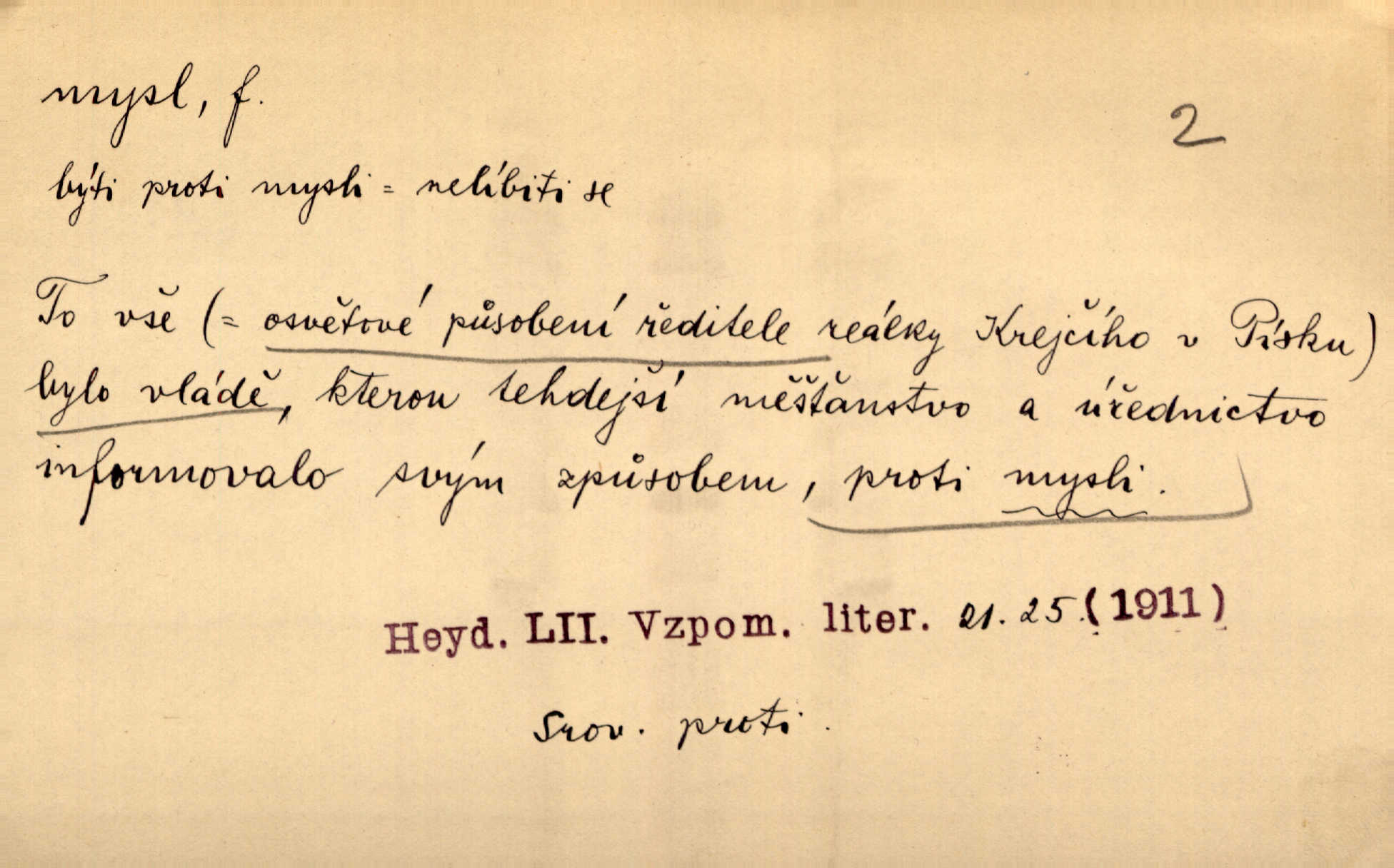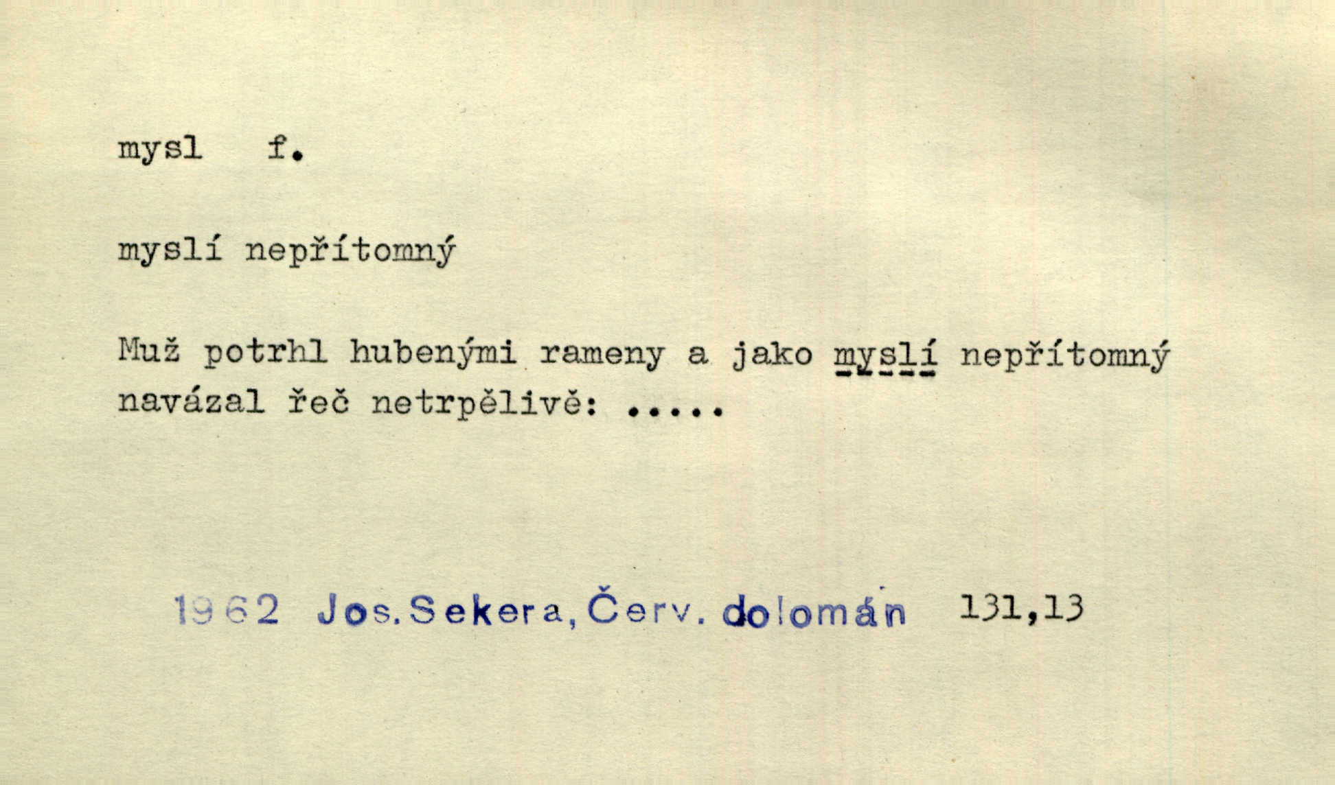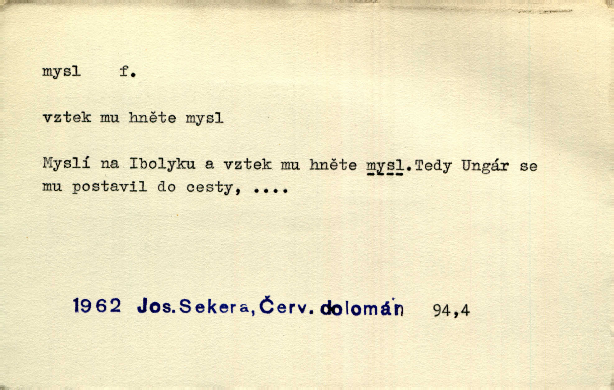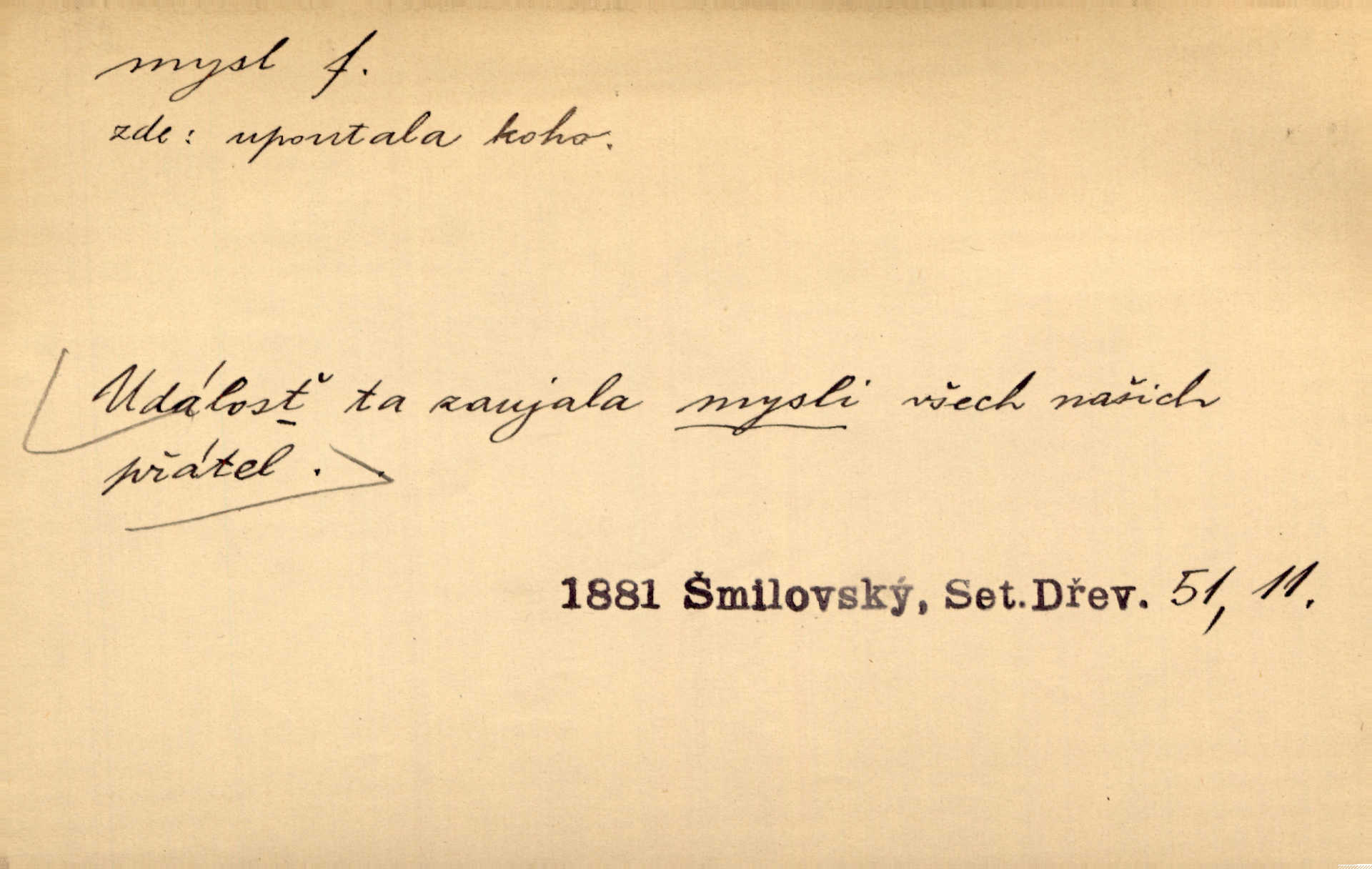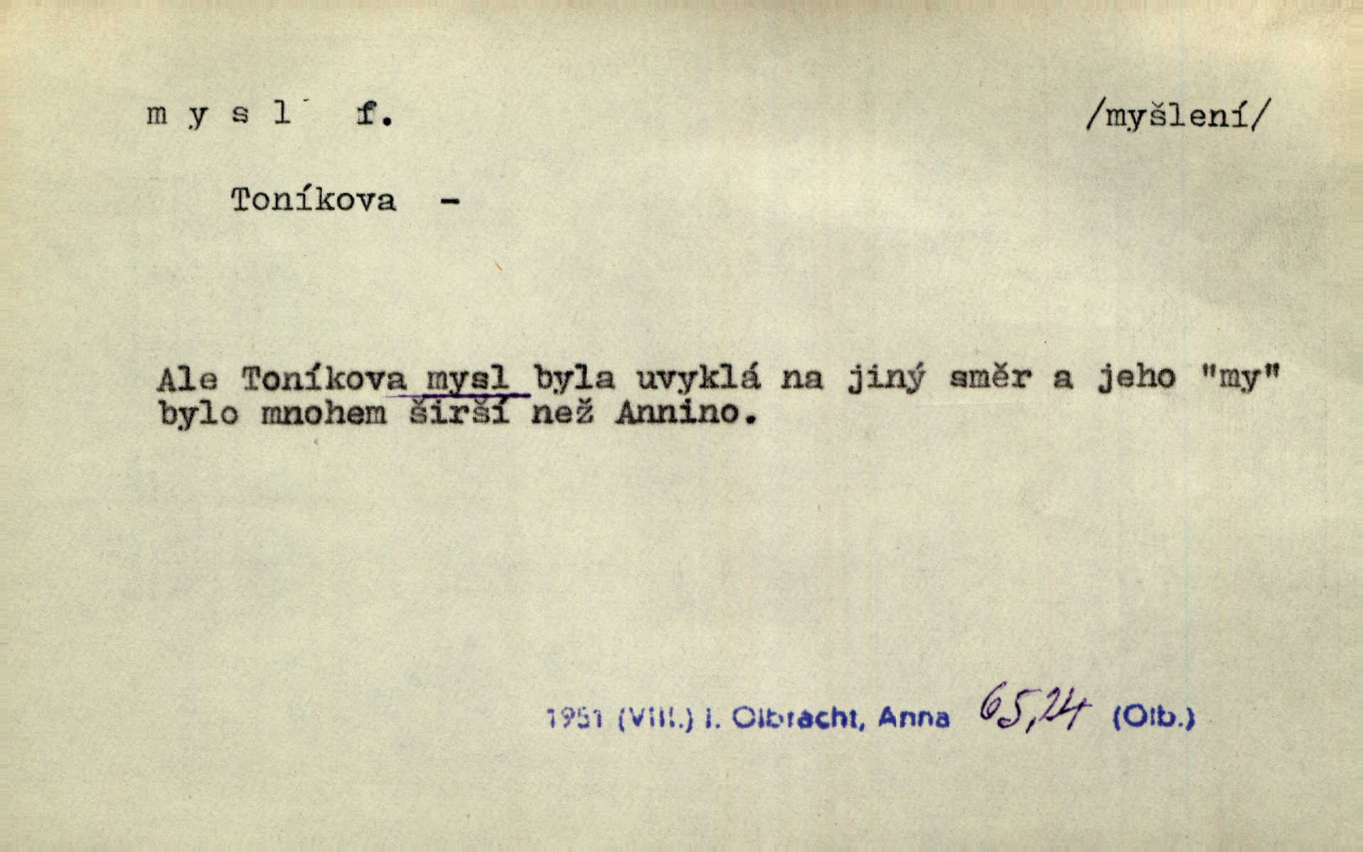 - mysl, -i f. (pl. dat. myslím, lok. myslích, instr. myslemi) duševní základna lidského myšlení, cítění a chtění. Tuhá poroba mysl jejich otupila. Jir. Událosť ta zaujala mysli všech našich přátel. Šmil. Ta [matka] se navzpomínala! Pořád to měla na mysli na to myslila. Třeb. Jindřich, maje na mysli válečnou slávu, hotovil se k boji. Tomíč. Bylo podškrtnuto ještě jiné místo, které mi dříve nepřišlo na mysl kterého jsem si nevšiml. K. Čap. Srdce její chytlo se kdysi na podobu šohaje, jenž jí nevypadl z mysli nezapomněla naň. Herb. Zvoleň mu nešla z mysli. Jir. Sejde s očí, sejde s mysli zapomene se. Přísl. Že já jsem bratrem jejím, prosím, abys pustil z mysli nemyslil na to. Šmil. Pro přírodu měl mysl přístupnou. Šmil. Já nevím, co jsem dělala, snad jsem byla na mysli spletená. Čap. Ch. Zdali neklesá [Havlíček v Brixenu] na mysli a nesžírá-li zoufalství jeho ňadra? Herb. Filos. pocitová základna a povaha logického myšlení. D mínění, smýšlení, názory, přesvědčení. Vím, že jste jedné mysli s tím nehodným knězem. Jir. Všude se mi stýskalo, všecko bylo mi proti mysli. Něm. Když provdávali starší sestru za advokáta, nebylo jí to [mladší sestře] po mysli. Šmil. Ve všech skladbách jeho vane vroucí, upřímná, bohu oddaná mysl. Šmil. Ne vždy se na světě potkáte s tak citlivým srdcem a s tak šlechetnou myslí. Sab. Byl to člověk lehké mysli lehkomyslný. Něm. První jeho žena byla ze zemanského rodu a vysoké mysli hrdá. Vrba. D citový obsah lidského nitra, nálada, chuť k něčemu. Jiskra byl dobré mysli. Jir. Vybízel dělníky k zpěvu, aby těžká práce neudusila veselou a zdravou mysl. Pfleg. Veselá mysl půl zdraví. Pořek. Není hodno ani radostí ani žalem kormoutiti jasnou mysl. Klác. S veselou myslí v srdci opouštěl jsem zámek. Stroup. Cítil se příliš osamělým a byl proto těžké mysli. Šmil. Sluší s myslí hrdinnou buď čekat mír, buď ránu poslední. Vrch. D dobrá mysl lid. rostlina dobromysl, Origanum. Rozkvétá tu macoška, tymian, dobrá mysl. Vrch. Dobrá mysl pomáhá od bolesti zubů a štípání v hlavě. R. Svob. D odvaha, zmužilost, energie. Dodal si mysli a vešel. Svět. Nyní mu klesá mysl a již se poddává úzkosti a bázni. Prav. Teď teprve nabyli postrašení [pijáci] mysli a spěchali za ním. J. J. Kol. Když nechcete, zůstanu, jenom se utište — a neztrácejte mysl! Šim.
