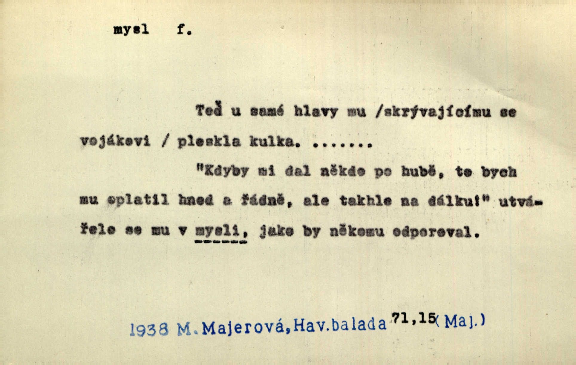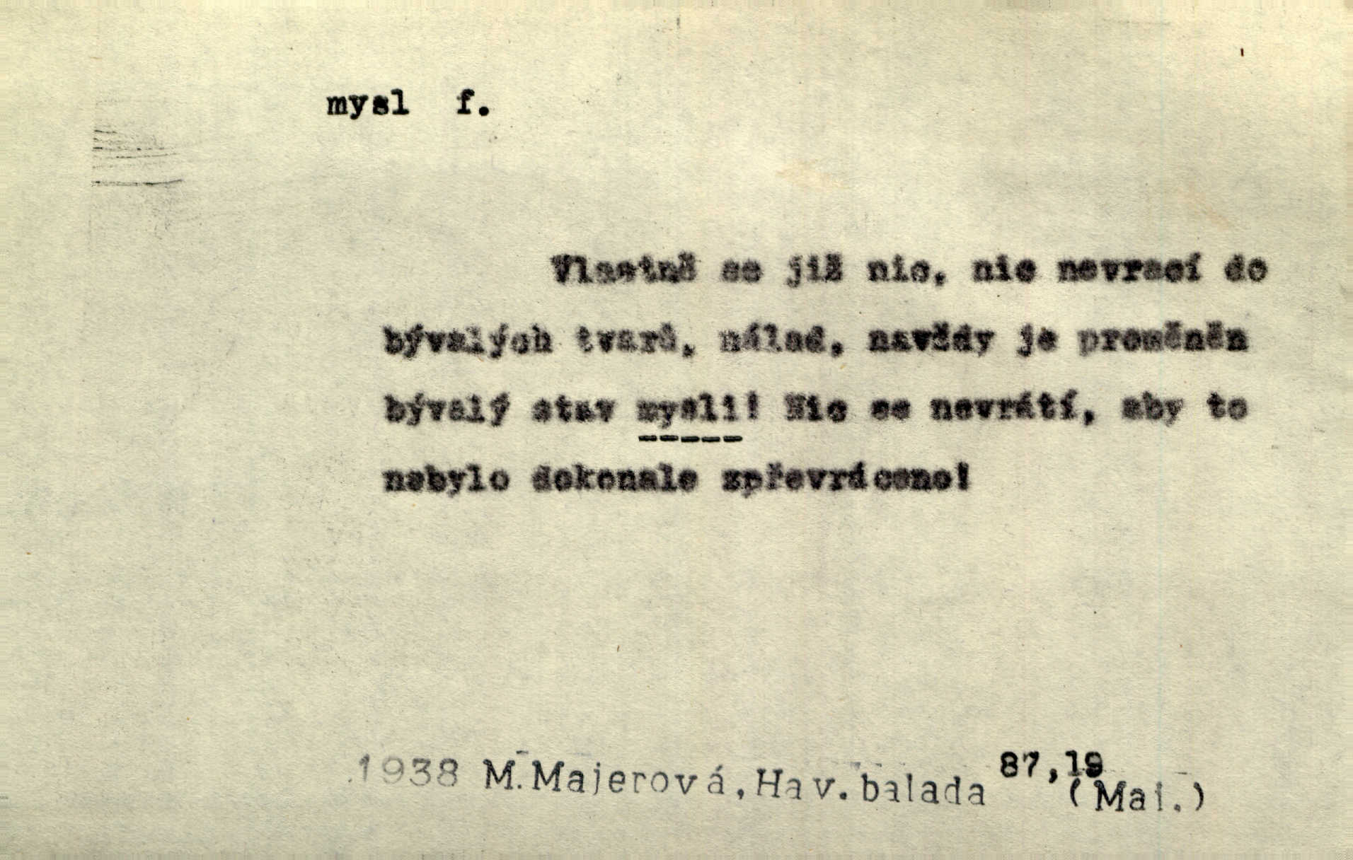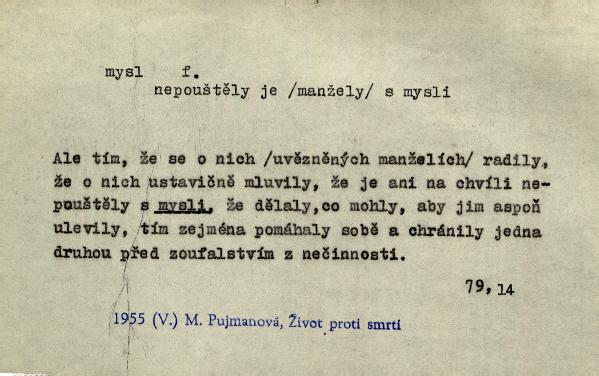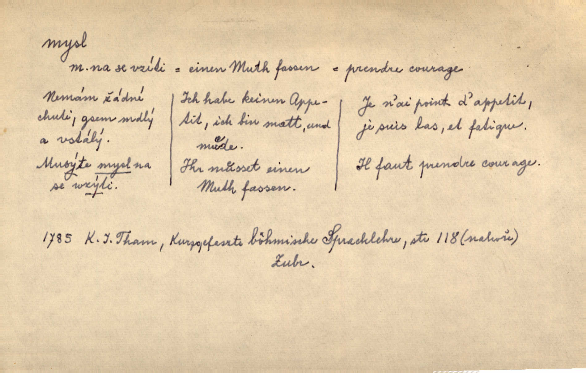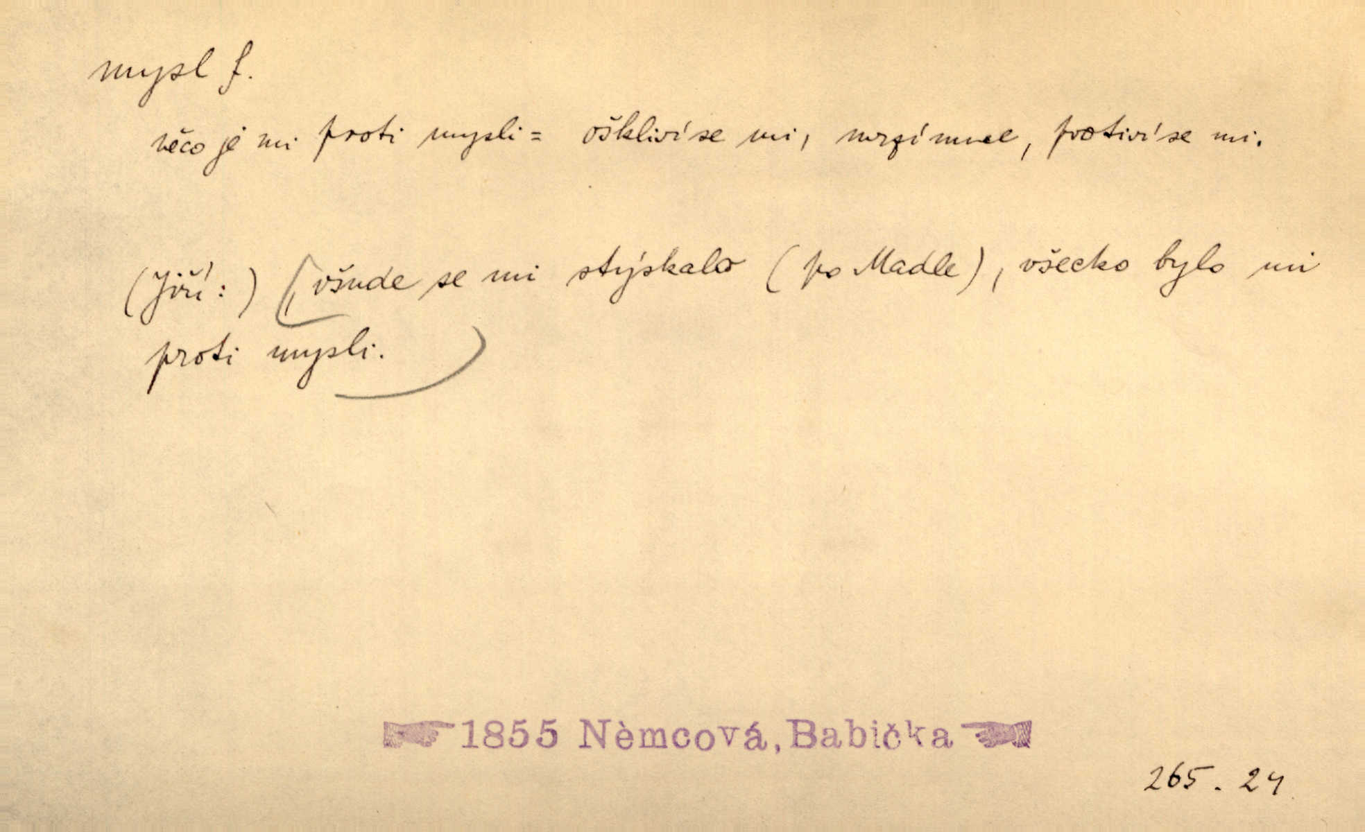 - mysl, -i f. (pl. dat. myslím, lok. myslích, instr. myslemi) duševní základna lidského myšlení, cítění a chtění. Tuhá poroba mysl jejich otupila. Jir. Událosť ta zaujala mysli všech našich přátel. Šmil. Ta [matka] se navzpomínala! Pořád to měla na mysli na to myslila. Třeb. Jindřich, maje na mysli válečnou slávu, hotovil se k boji. Tomíč. Bylo podškrtnuto ještě jiné místo, které mi dříve nepřišlo na mysl kterého jsem si nevšiml. K. Čap. Srdce její chytlo se kdysi na podobu šohaje, jenž jí nevypadl z mysli nezapomněla naň. Herb. Zvoleň mu nešla z mysli. Jir. Sejde s očí, sejde s mysli zapomene se. Přísl. Že já jsem bratrem jejím, prosím, abys pustil z mysli nemyslil na to. Šmil. Pro přírodu měl mysl přístupnou. Šmil. Já nevím, co jsem dělala, snad jsem byla na mysli spletená. Čap. Ch. Zdali neklesá [Havlíček v Brixenu] na mysli a nesžírá-li zoufalství jeho ňadra? Herb. Filos. pocitová základna a povaha logického myšlení. D mínění, smýšlení, názory, přesvědčení. Vím, že jste jedné mysli s tím nehodným knězem. Jir. Všude se mi stýskalo, všecko bylo mi proti mysli. Něm. Když provdávali starší sestru za advokáta, nebylo jí to [mladší sestře] po mysli. Šmil. Ve všech skladbách jeho vane vroucí, upřímná, bohu oddaná mysl. Šmil. Ne vždy se na světě potkáte s tak citlivým srdcem a s tak šlechetnou myslí. Sab. Byl to člověk lehké mysli lehkomyslný. Něm. První jeho žena byla ze zemanského rodu a vysoké mysli hrdá. Vrba. D citový obsah lidského nitra, nálada, chuť k něčemu. Jiskra byl dobré mysli. Jir. Vybízel dělníky k zpěvu, aby těžká práce neudusila veselou a zdravou mysl. Pfleg. Veselá mysl půl zdraví. Pořek. Není hodno ani radostí ani žalem kormoutiti jasnou mysl. Klác. S veselou myslí v srdci opouštěl jsem zámek. Stroup. Cítil se příliš osamělým a byl proto těžké mysli. Šmil. Sluší s myslí hrdinnou buď čekat mír, buď ránu poslední. Vrch. D dobrá mysl lid. rostlina dobromysl, Origanum. Rozkvétá tu macoška, tymian, dobrá mysl. Vrch. Dobrá mysl pomáhá od bolesti zubů a štípání v hlavě. R. Svob. D odvaha, zmužilost, energie. Dodal si mysli a vešel. Svět. Nyní mu klesá mysl a již se poddává úzkosti a bázni. Prav. Teď teprve nabyli postrašení [pijáci] mysli a spěchali za ním. J. J. Kol. Když nechcete, zůstanu, jenom se utište — a neztrácejte mysl! Šim.