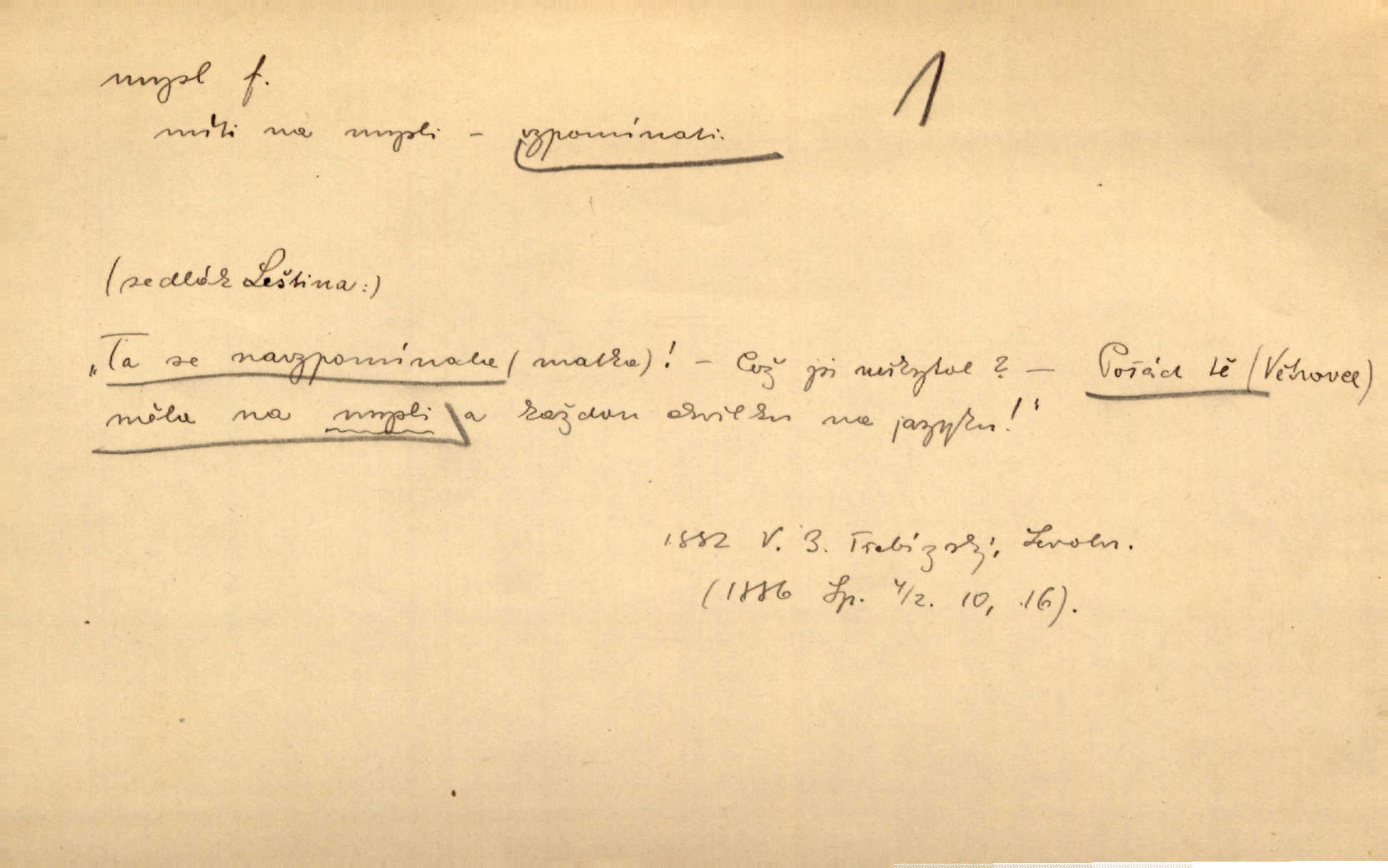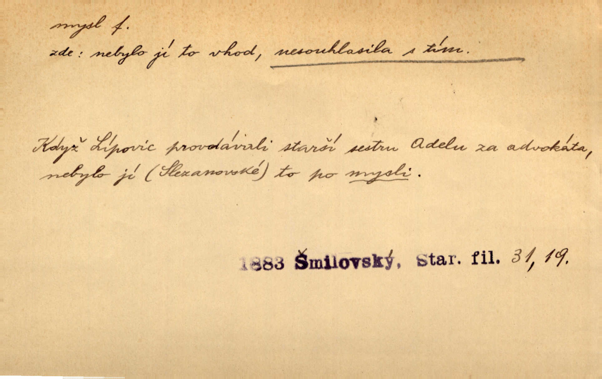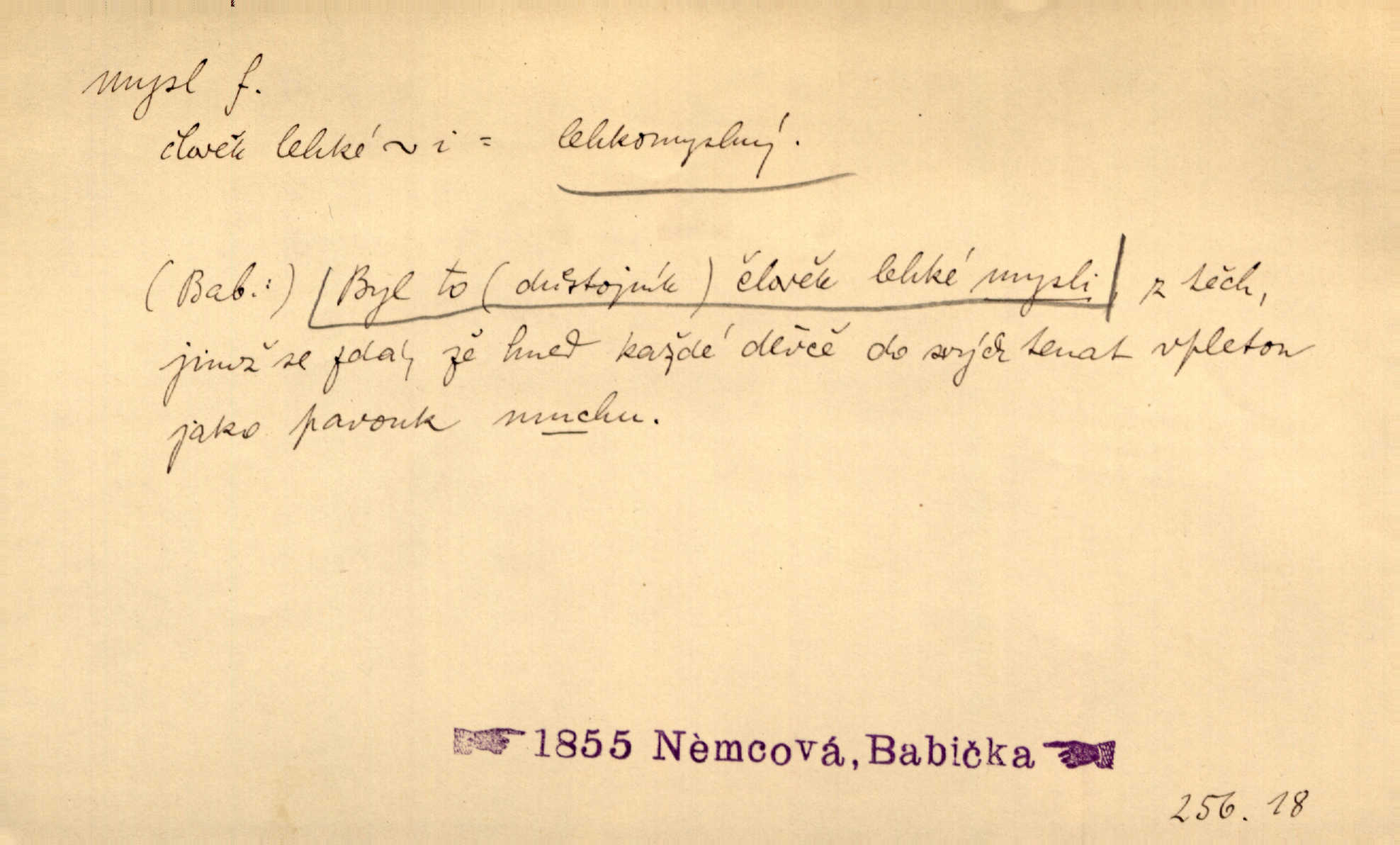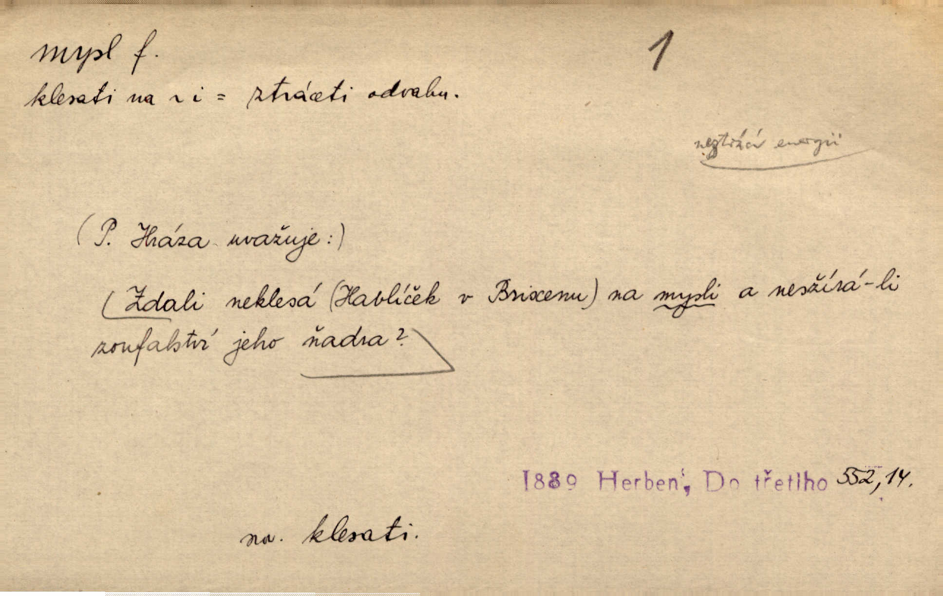 - mysl, -i f. (pl. dat. myslím, lok. myslích, instr. myslemi) duševní základna lidského myšlení, cítění a chtění. Tuhá poroba mysl jejich otupila. Jir. Událosť ta zaujala mysli všech našich přátel. Šmil. Ta [matka] se navzpomínala! Pořád to měla na mysli na to myslila. Třeb. Jindřich, maje na mysli válečnou slávu, hotovil se k boji. Tomíč. Bylo podškrtnuto ještě jiné místo, které mi dříve nepřišlo na mysl kterého jsem si nevšiml. K. Čap. Srdce její chytlo se kdysi na podobu šohaje, jenž jí nevypadl z mysli nezapomněla naň. Herb. Zvoleň mu nešla z mysli. Jir. Sejde s očí, sejde s mysli zapomene se. Přísl. Že já jsem bratrem jejím, prosím, abys pustil z mysli nemyslil na to. Šmil. Pro přírodu měl mysl přístupnou. Šmil. Já nevím, co jsem dělala, snad jsem byla na mysli spletená. Čap. Ch. Zdali neklesá [Havlíček v Brixenu] na mysli a nesžírá-li zoufalství jeho ňadra? Herb. Filos. pocitová základna a povaha logického myšlení. D mínění, smýšlení, názory, přesvědčení. Vím, že jste jedné mysli s tím nehodným knězem. Jir. Všude se mi stýskalo, všecko bylo mi proti mysli. Něm. Když provdávali starší sestru za advokáta, nebylo jí to [mladší sestře] po mysli. Šmil. Ve všech skladbách jeho vane vroucí, upřímná, bohu oddaná mysl. Šmil. Ne vždy se na světě potkáte s tak citlivým srdcem a s tak šlechetnou myslí. Sab. Byl to člověk lehké mysli lehkomyslný. Něm. První jeho žena byla ze zemanského rodu a vysoké mysli hrdá. Vrba. D citový obsah lidského nitra, nálada, chuť k něčemu. Jiskra byl dobré mysli. Jir. Vybízel dělníky k zpěvu, aby těžká práce neudusila veselou a zdravou mysl. Pfleg. Veselá mysl půl zdraví. Pořek. Není hodno ani radostí ani žalem kormoutiti jasnou mysl. Klác. S veselou myslí v srdci opouštěl jsem zámek. Stroup. Cítil se příliš osamělým a byl proto těžké mysli. Šmil. Sluší s myslí hrdinnou buď čekat mír, buď ránu poslední. Vrch. D dobrá mysl lid. rostlina dobromysl, Origanum. Rozkvétá tu macoška, tymian, dobrá mysl. Vrch. Dobrá mysl pomáhá od bolesti zubů a štípání v hlavě. R. Svob. D odvaha, zmužilost, energie. Dodal si mysli a vešel. Svět. Nyní mu klesá mysl a již se poddává úzkosti a bázni. Prav. Teď teprve nabyli postrašení [pijáci] mysli a spěchali za ním. J. J. Kol. Když nechcete, zůstanu, jenom se utište — a neztrácejte mysl! Šim.