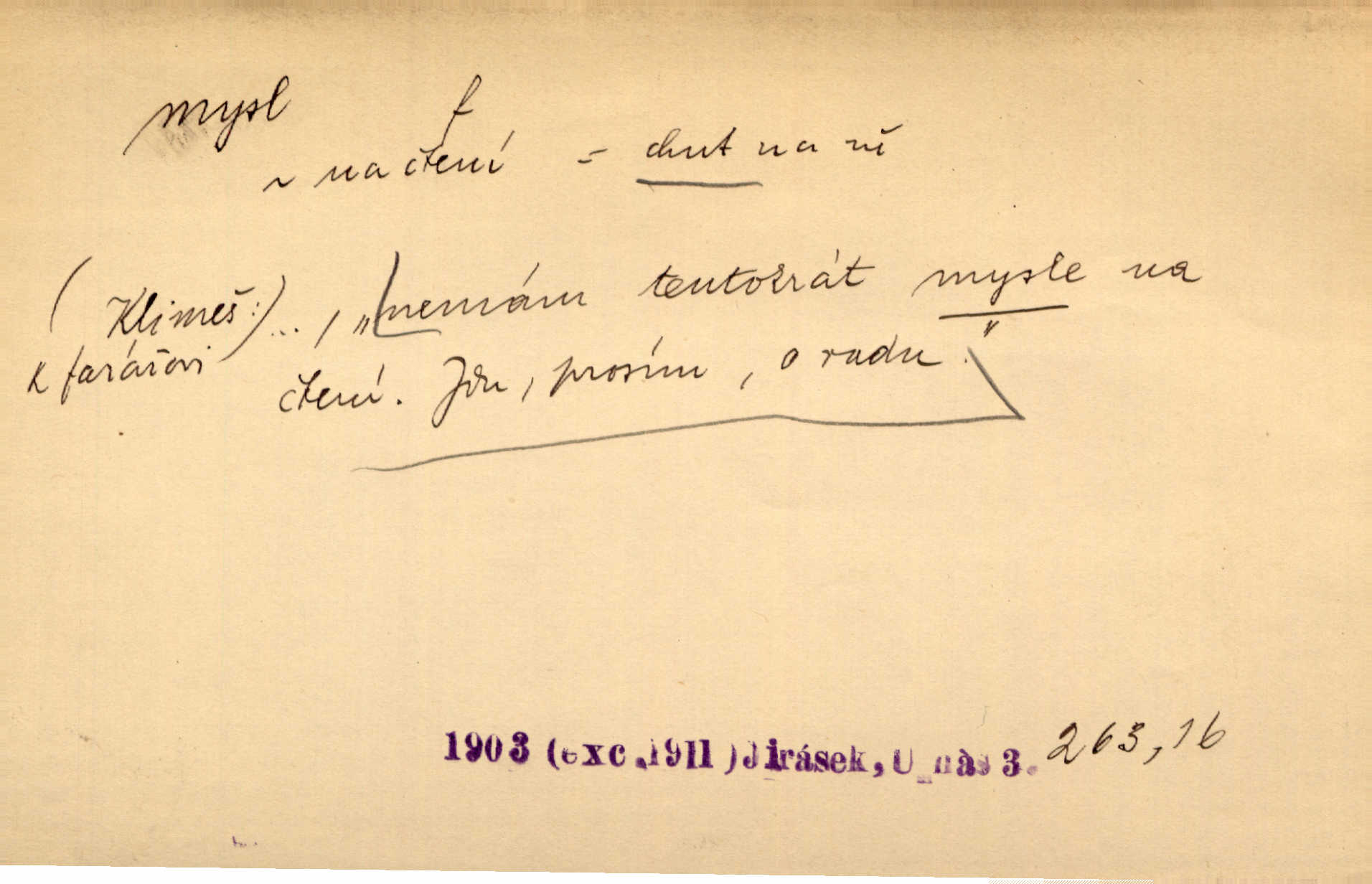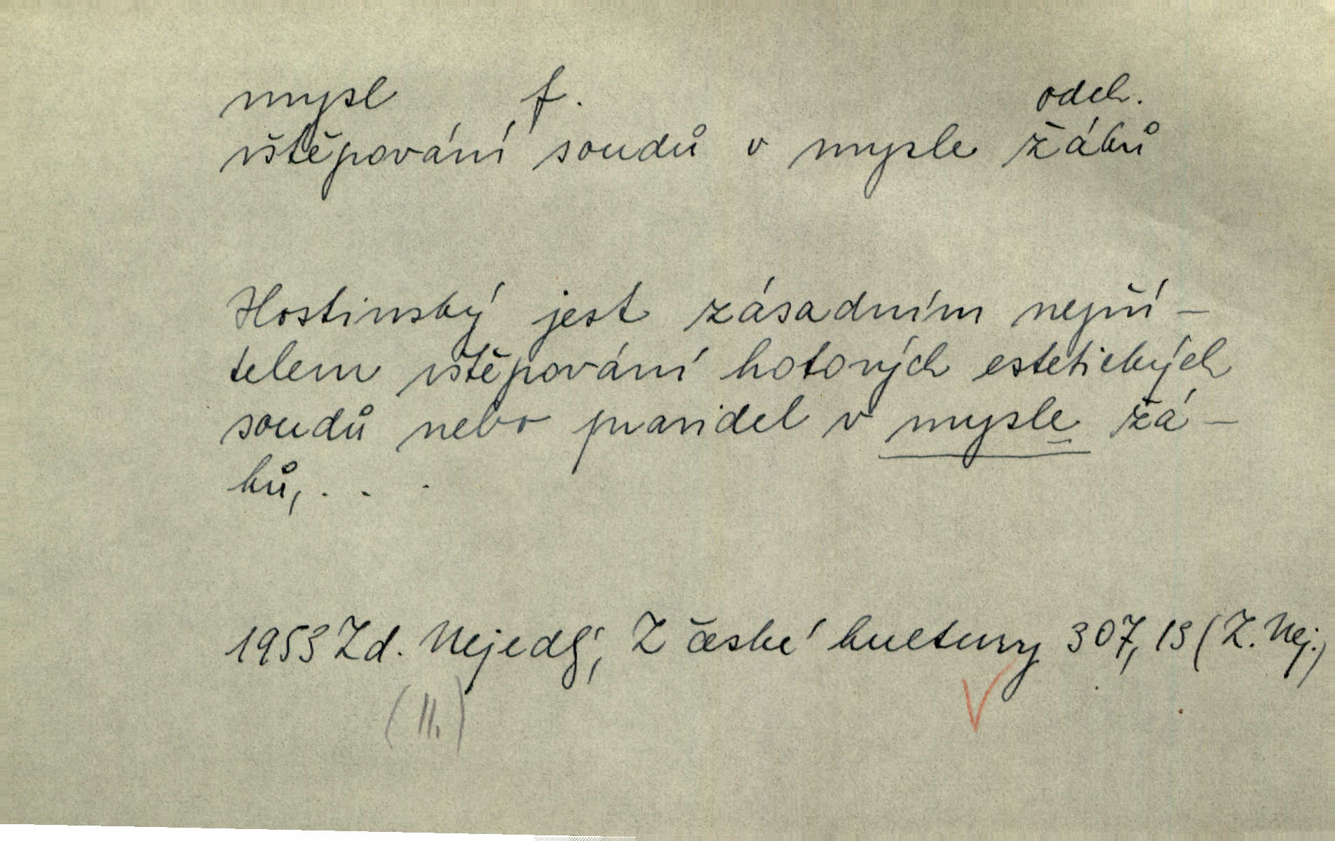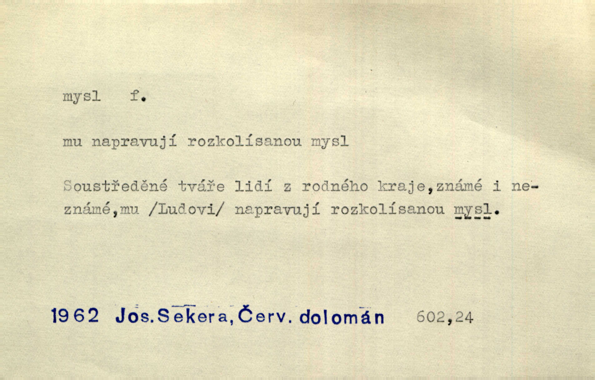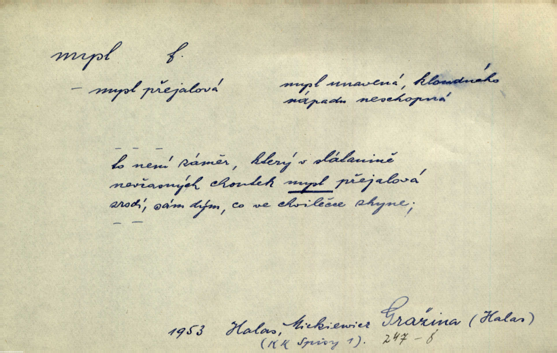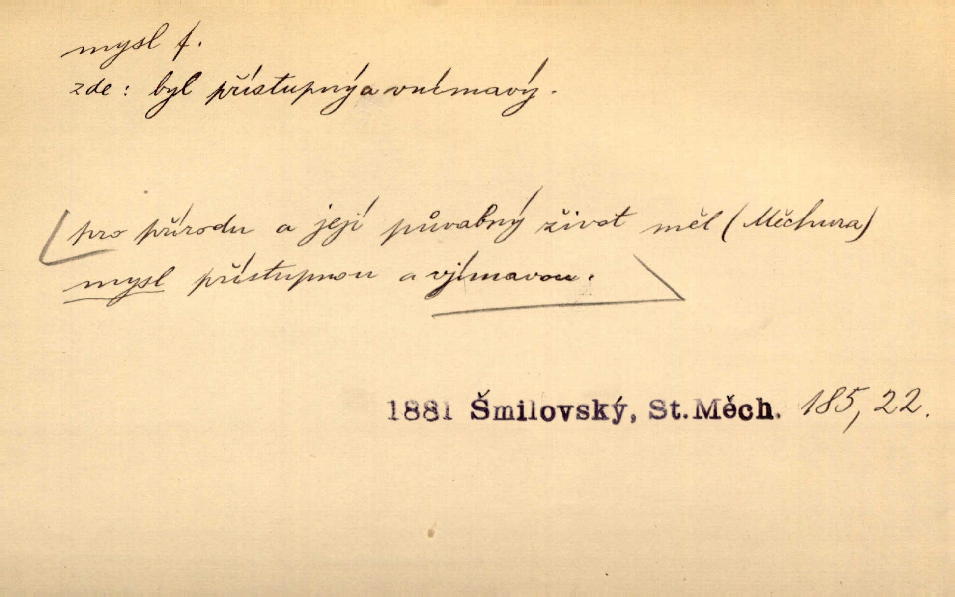 - mysl, -i f. (pl. dat. myslím, lok. myslích, instr. myslemi) duševní základna lidského myšlení, cítění a chtění. Tuhá poroba mysl jejich otupila. Jir. Událosť ta zaujala mysli všech našich přátel. Šmil. Ta [matka] se navzpomínala! Pořád to měla na mysli na to myslila. Třeb. Jindřich, maje na mysli válečnou slávu, hotovil se k boji. Tomíč. Bylo podškrtnuto ještě jiné místo, které mi dříve nepřišlo na mysl kterého jsem si nevšiml. K. Čap. Srdce její chytlo se kdysi na podobu šohaje, jenž jí nevypadl z mysli nezapomněla naň. Herb. Zvoleň mu nešla z mysli. Jir. Sejde s očí, sejde s mysli zapomene se. Přísl. Že já jsem bratrem jejím, prosím, abys pustil z mysli nemyslil na to. Šmil. Pro přírodu měl mysl přístupnou. Šmil. Já nevím, co jsem dělala, snad jsem byla na mysli spletená. Čap. Ch. Zdali neklesá [Havlíček v Brixenu] na mysli a nesžírá-li zoufalství jeho ňadra? Herb. Filos. pocitová základna a povaha logického myšlení. D mínění, smýšlení, názory, přesvědčení. Vím, že jste jedné mysli s tím nehodným knězem. Jir. Všude se mi stýskalo, všecko bylo mi proti mysli. Něm. Když provdávali starší sestru za advokáta, nebylo jí to [mladší sestře] po mysli. Šmil. Ve všech skladbách jeho vane vroucí, upřímná, bohu oddaná mysl. Šmil. Ne vždy se na světě potkáte s tak citlivým srdcem a s tak šlechetnou myslí. Sab. Byl to člověk lehké mysli lehkomyslný. Něm. První jeho žena byla ze zemanského rodu a vysoké mysli hrdá. Vrba. D citový obsah lidského nitra, nálada, chuť k něčemu. Jiskra byl dobré mysli. Jir. Vybízel dělníky k zpěvu, aby těžká práce neudusila veselou a zdravou mysl. Pfleg. Veselá mysl půl zdraví. Pořek. Není hodno ani radostí ani žalem kormoutiti jasnou mysl. Klác. S veselou myslí v srdci opouštěl jsem zámek. Stroup. Cítil se příliš osamělým a byl proto těžké mysli. Šmil. Sluší s myslí hrdinnou buď čekat mír, buď ránu poslední. Vrch. D dobrá mysl lid. rostlina dobromysl, Origanum. Rozkvétá tu macoška, tymian, dobrá mysl. Vrch. Dobrá mysl pomáhá od bolesti zubů a štípání v hlavě. R. Svob. D odvaha, zmužilost, energie. Dodal si mysli a vešel. Svět. Nyní mu klesá mysl a již se poddává úzkosti a bázni. Prav. Teď teprve nabyli postrašení [pijáci] mysli a spěchali za ním. J. J. Kol. Když nechcete, zůstanu, jenom se utište — a neztrácejte mysl! Šim.