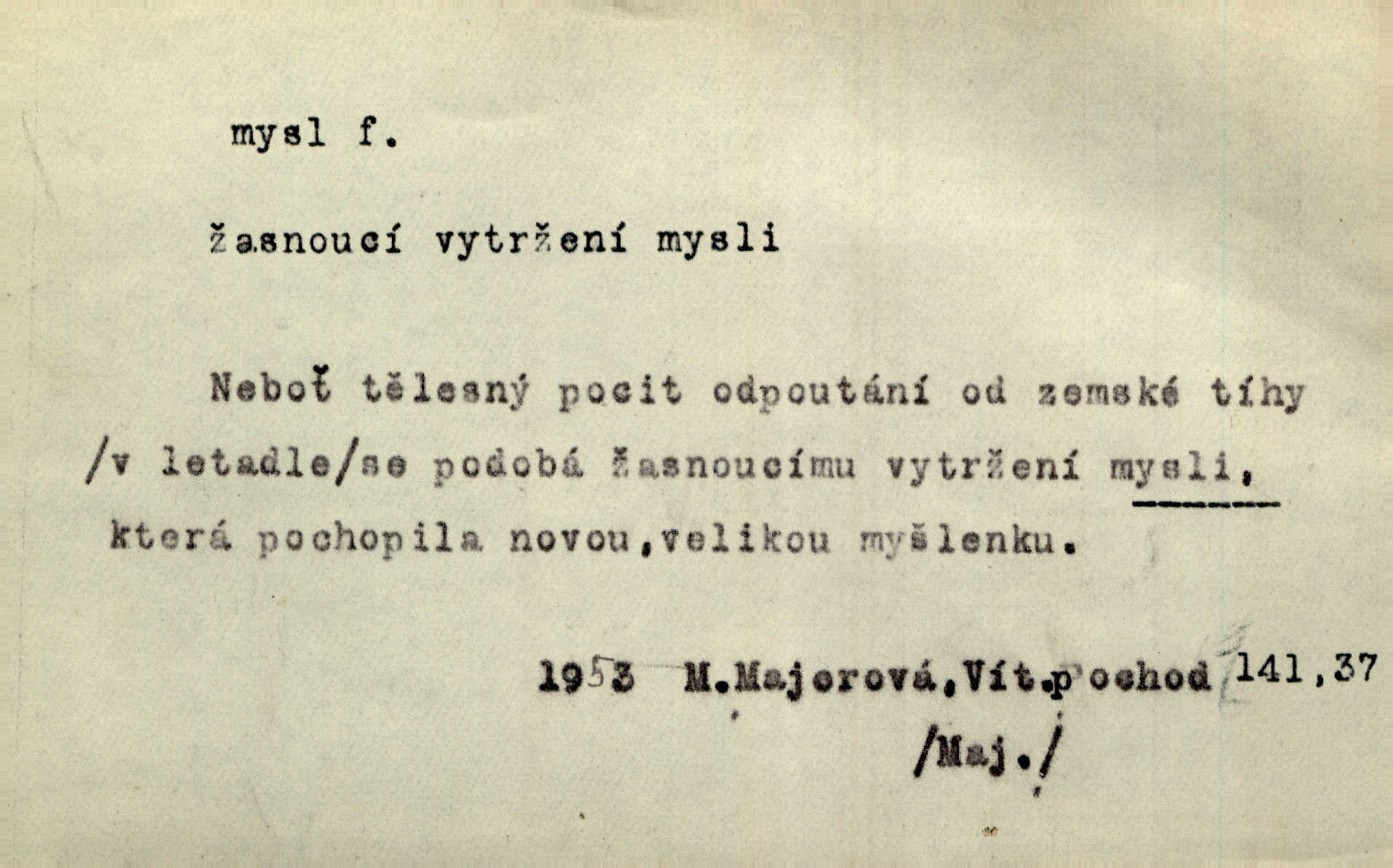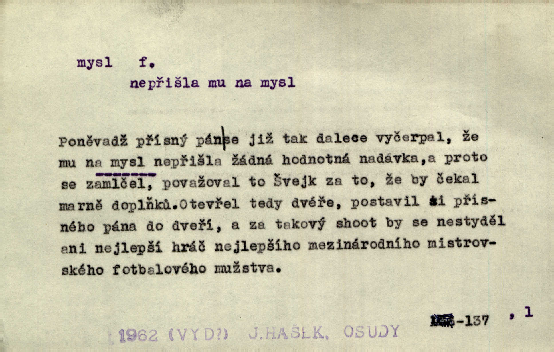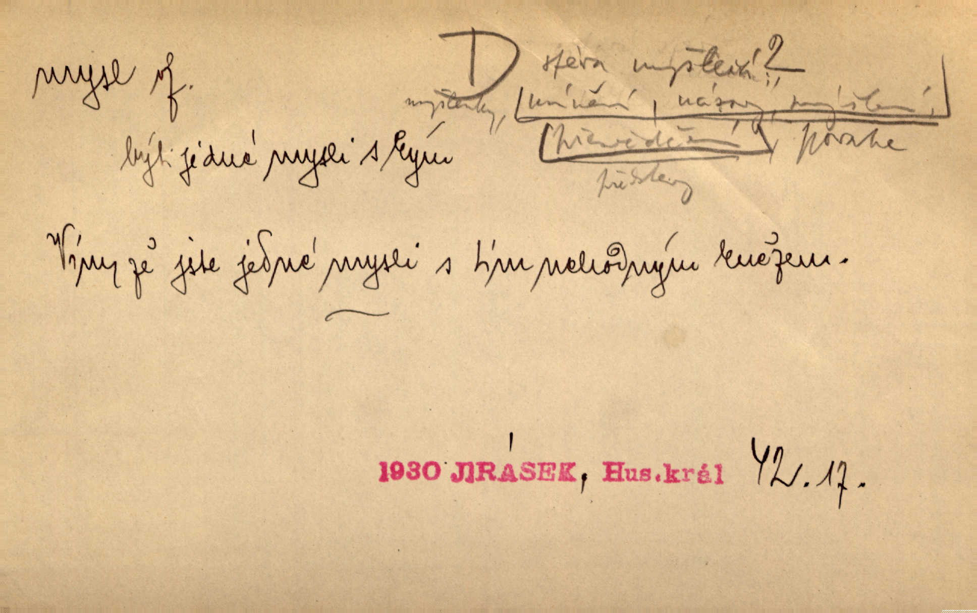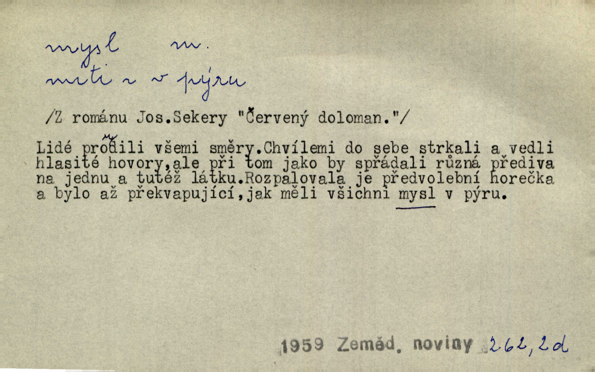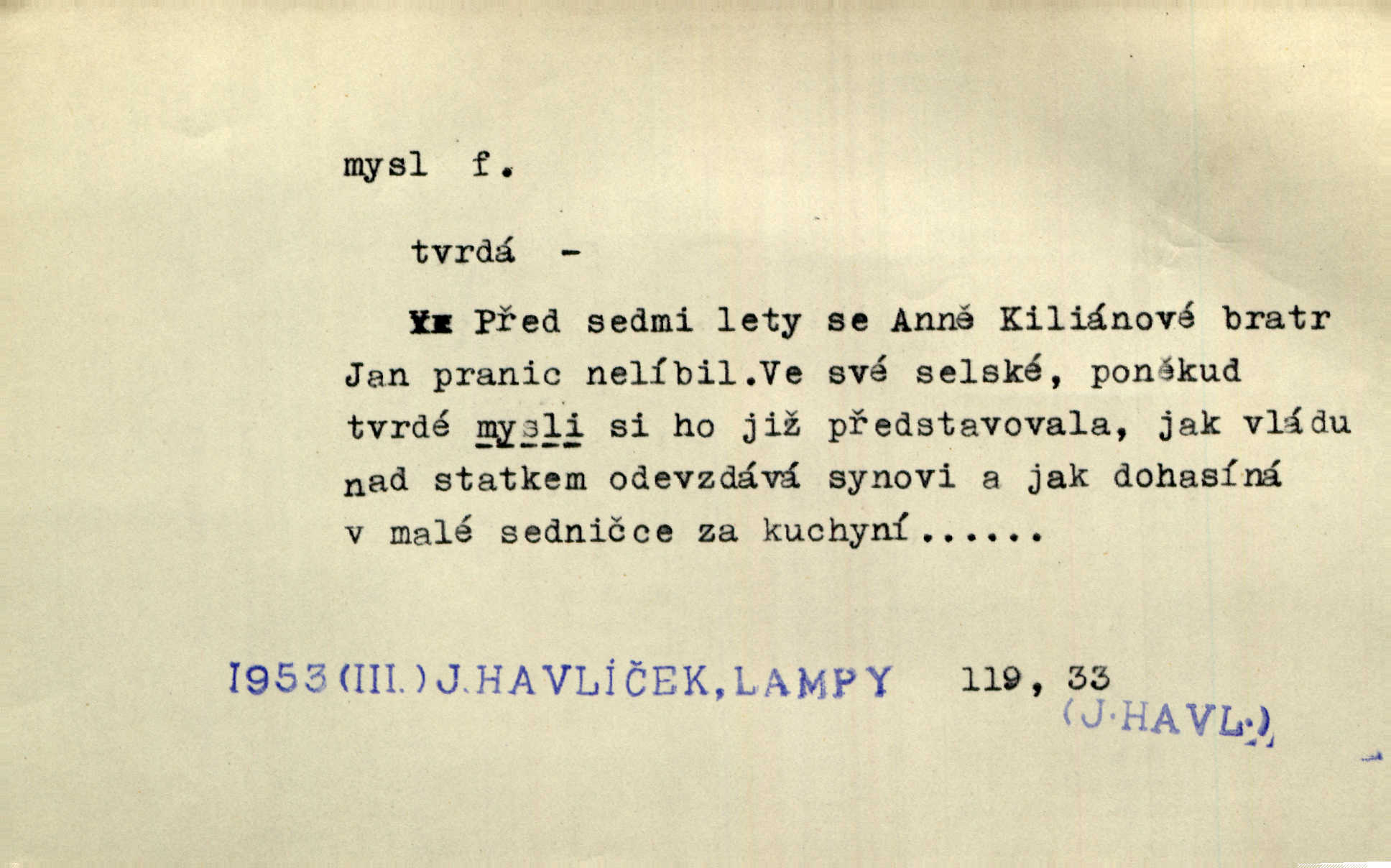 - mysl, -i f. (pl. dat. myslím, lok. myslích, instr. myslemi) duševní základna lidského myšlení, cítění a chtění. Tuhá poroba mysl jejich otupila. Jir. Událosť ta zaujala mysli všech našich přátel. Šmil. Ta [matka] se navzpomínala! Pořád to měla na mysli na to myslila. Třeb. Jindřich, maje na mysli válečnou slávu, hotovil se k boji. Tomíč. Bylo podškrtnuto ještě jiné místo, které mi dříve nepřišlo na mysl kterého jsem si nevšiml. K. Čap. Srdce její chytlo se kdysi na podobu šohaje, jenž jí nevypadl z mysli nezapomněla naň. Herb. Zvoleň mu nešla z mysli. Jir. Sejde s očí, sejde s mysli zapomene se. Přísl. Že já jsem bratrem jejím, prosím, abys pustil z mysli nemyslil na to. Šmil. Pro přírodu měl mysl přístupnou. Šmil. Já nevím, co jsem dělala, snad jsem byla na mysli spletená. Čap. Ch. Zdali neklesá [Havlíček v Brixenu] na mysli a nesžírá-li zoufalství jeho ňadra? Herb. Filos. pocitová základna a povaha logického myšlení. D mínění, smýšlení, názory, přesvědčení. Vím, že jste jedné mysli s tím nehodným knězem. Jir. Všude se mi stýskalo, všecko bylo mi proti mysli. Něm. Když provdávali starší sestru za advokáta, nebylo jí to [mladší sestře] po mysli. Šmil. Ve všech skladbách jeho vane vroucí, upřímná, bohu oddaná mysl. Šmil. Ne vždy se na světě potkáte s tak citlivým srdcem a s tak šlechetnou myslí. Sab. Byl to člověk lehké mysli lehkomyslný. Něm. První jeho žena byla ze zemanského rodu a vysoké mysli hrdá. Vrba. D citový obsah lidského nitra, nálada, chuť k něčemu. Jiskra byl dobré mysli. Jir. Vybízel dělníky k zpěvu, aby těžká práce neudusila veselou a zdravou mysl. Pfleg. Veselá mysl půl zdraví. Pořek. Není hodno ani radostí ani žalem kormoutiti jasnou mysl. Klác. S veselou myslí v srdci opouštěl jsem zámek. Stroup. Cítil se příliš osamělým a byl proto těžké mysli. Šmil. Sluší s myslí hrdinnou buď čekat mír, buď ránu poslední. Vrch. D dobrá mysl lid. rostlina dobromysl, Origanum. Rozkvétá tu macoška, tymian, dobrá mysl. Vrch. Dobrá mysl pomáhá od bolesti zubů a štípání v hlavě. R. Svob. D odvaha, zmužilost, energie. Dodal si mysli a vešel. Svět. Nyní mu klesá mysl a již se poddává úzkosti a bázni. Prav. Teď teprve nabyli postrašení [pijáci] mysli a spěchali za ním. J. J. Kol. Když nechcete, zůstanu, jenom se utište — a neztrácejte mysl! Šim.