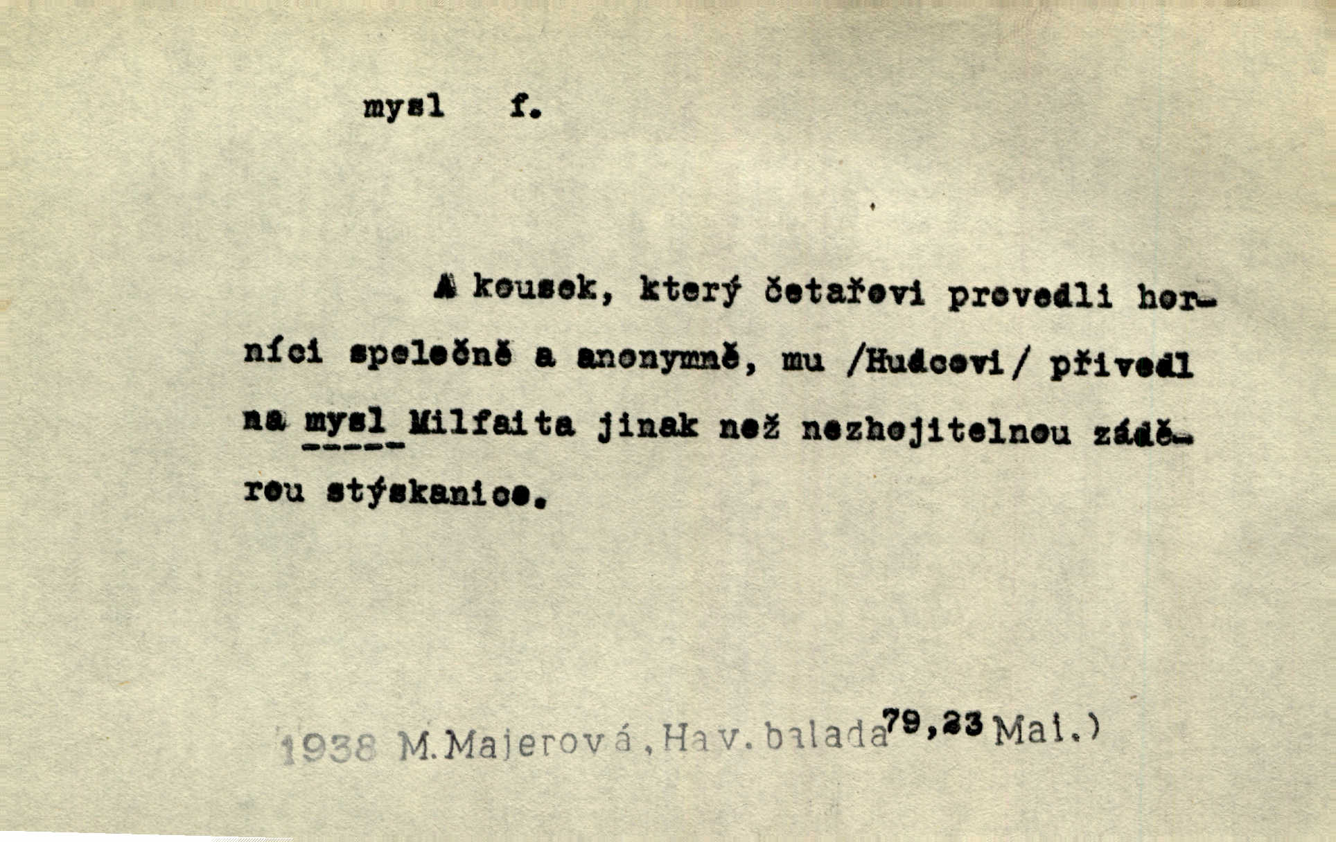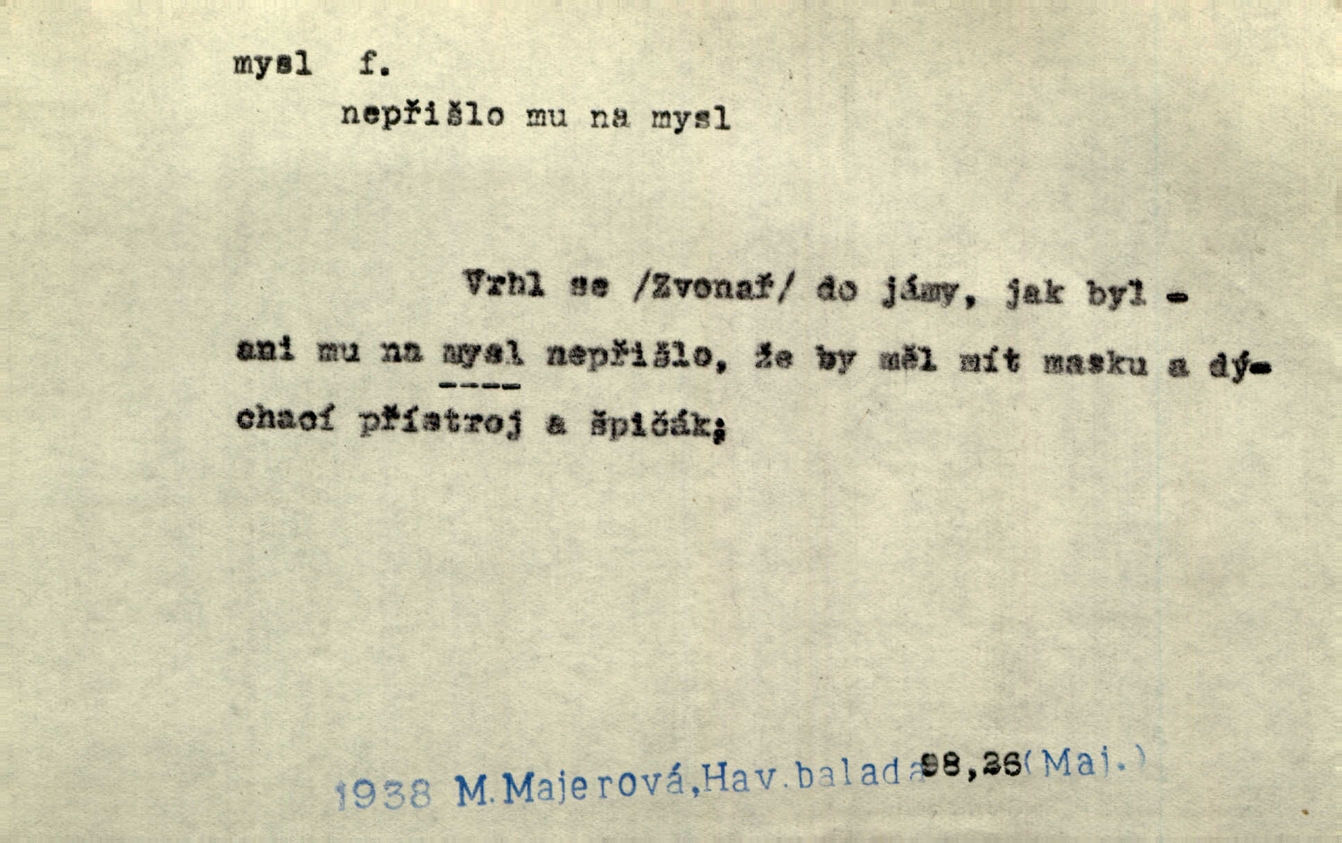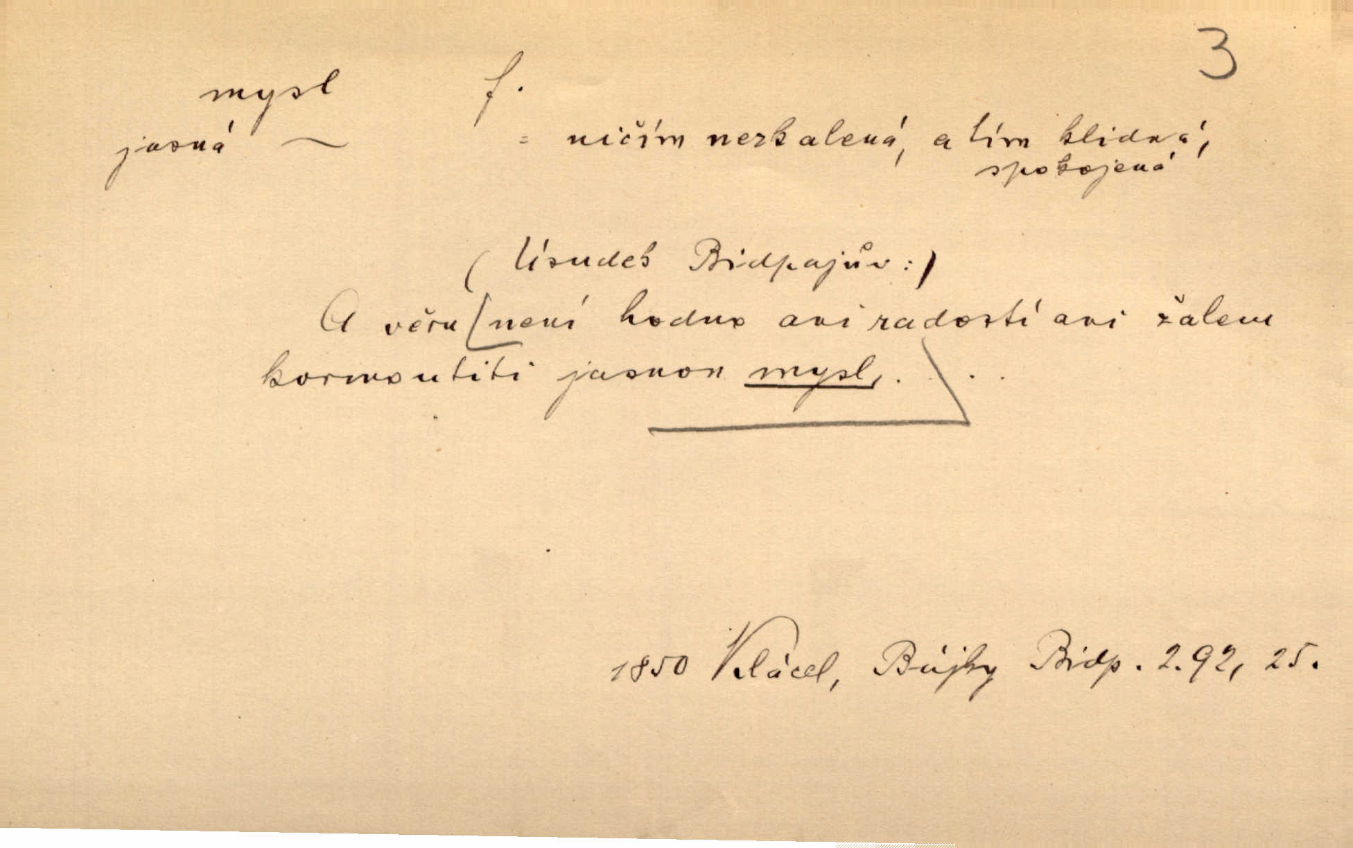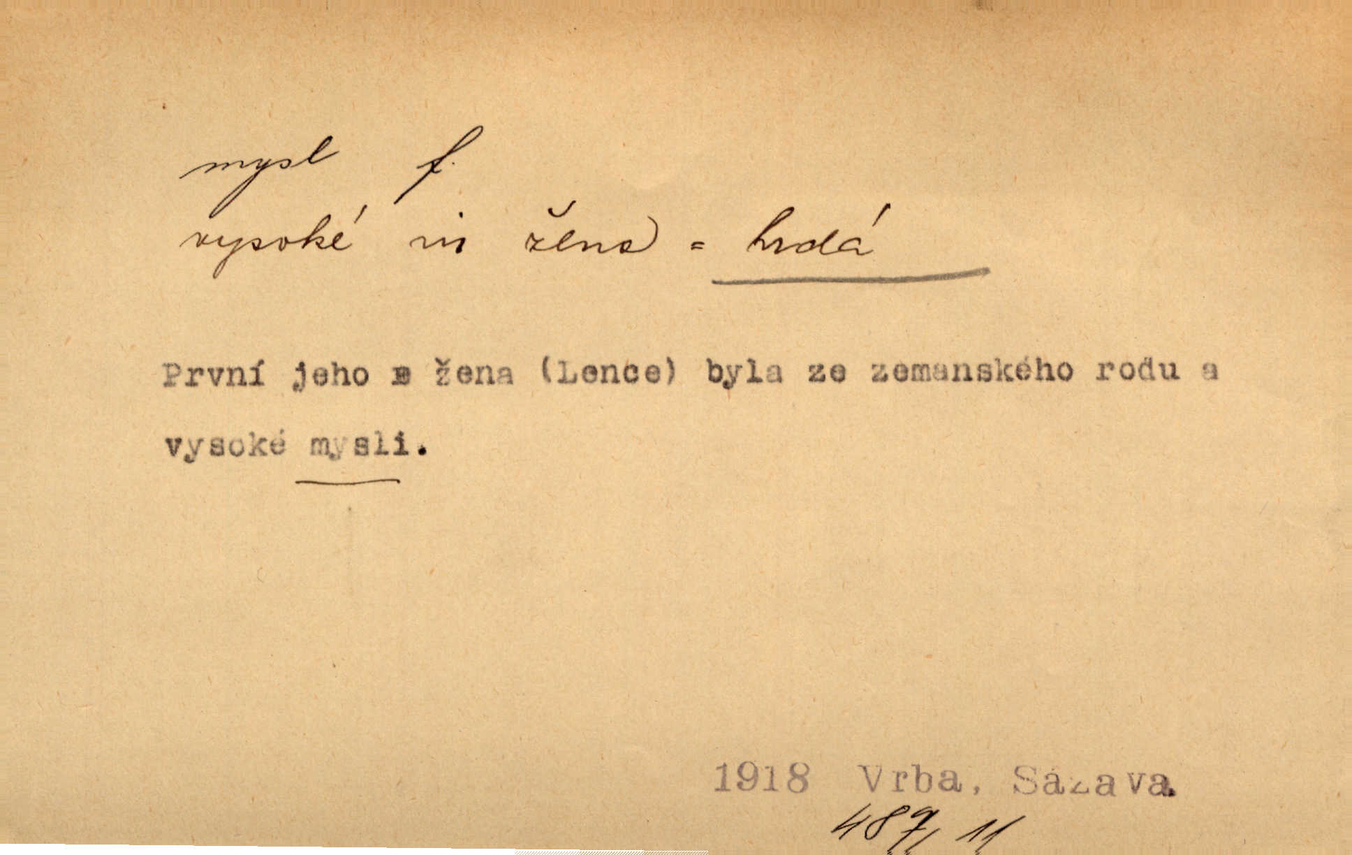 - mysl, -i f. (pl. dat. myslím, lok. myslích, instr. myslemi) duševní základna lidského myšlení, cítění a chtění. Tuhá poroba mysl jejich otupila. Jir. Událosť ta zaujala mysli všech našich přátel. Šmil. Ta [matka] se navzpomínala! Pořád to měla na mysli na to myslila. Třeb. Jindřich, maje na mysli válečnou slávu, hotovil se k boji. Tomíč. Bylo podškrtnuto ještě jiné místo, které mi dříve nepřišlo na mysl kterého jsem si nevšiml. K. Čap. Srdce její chytlo se kdysi na podobu šohaje, jenž jí nevypadl z mysli nezapomněla naň. Herb. Zvoleň mu nešla z mysli. Jir. Sejde s očí, sejde s mysli zapomene se. Přísl. Že já jsem bratrem jejím, prosím, abys pustil z mysli nemyslil na to. Šmil. Pro přírodu měl mysl přístupnou. Šmil. Já nevím, co jsem dělala, snad jsem byla na mysli spletená. Čap. Ch. Zdali neklesá [Havlíček v Brixenu] na mysli a nesžírá-li zoufalství jeho ňadra? Herb. Filos. pocitová základna a povaha logického myšlení. D mínění, smýšlení, názory, přesvědčení. Vím, že jste jedné mysli s tím nehodným knězem. Jir. Všude se mi stýskalo, všecko bylo mi proti mysli. Něm. Když provdávali starší sestru za advokáta, nebylo jí to [mladší sestře] po mysli. Šmil. Ve všech skladbách jeho vane vroucí, upřímná, bohu oddaná mysl. Šmil. Ne vždy se na světě potkáte s tak citlivým srdcem a s tak šlechetnou myslí. Sab. Byl to člověk lehké mysli lehkomyslný. Něm. První jeho žena byla ze zemanského rodu a vysoké mysli hrdá. Vrba. D citový obsah lidského nitra, nálada, chuť k něčemu. Jiskra byl dobré mysli. Jir. Vybízel dělníky k zpěvu, aby těžká práce neudusila veselou a zdravou mysl. Pfleg. Veselá mysl půl zdraví. Pořek. Není hodno ani radostí ani žalem kormoutiti jasnou mysl. Klác. S veselou myslí v srdci opouštěl jsem zámek. Stroup. Cítil se příliš osamělým a byl proto těžké mysli. Šmil. Sluší s myslí hrdinnou buď čekat mír, buď ránu poslední. Vrch. D dobrá mysl lid. rostlina dobromysl, Origanum. Rozkvétá tu macoška, tymian, dobrá mysl. Vrch. Dobrá mysl pomáhá od bolesti zubů a štípání v hlavě. R. Svob. D odvaha, zmužilost, energie. Dodal si mysli a vešel. Svět. Nyní mu klesá mysl a již se poddává úzkosti a bázni. Prav. Teď teprve nabyli postrašení [pijáci] mysli a spěchali za ním. J. J. Kol. Když nechcete, zůstanu, jenom se utište — a neztrácejte mysl! Šim.