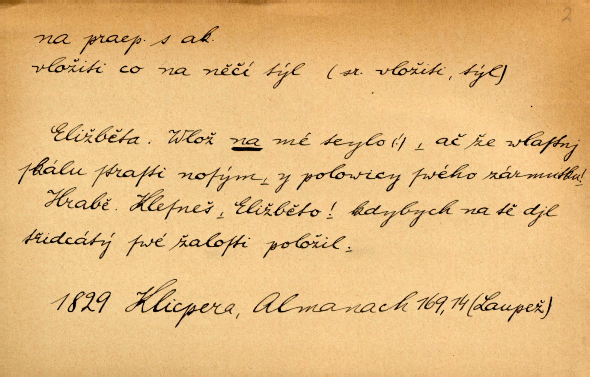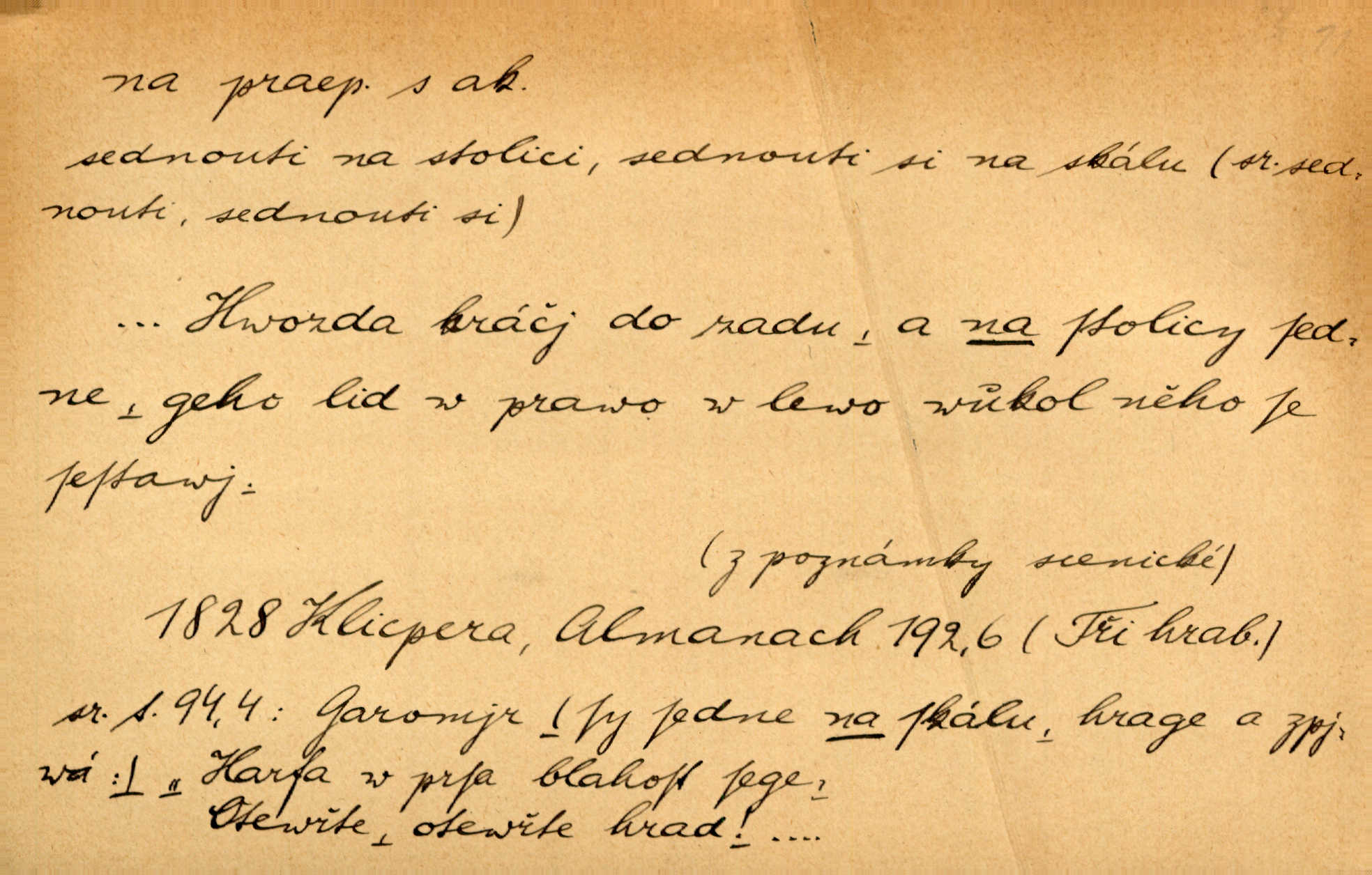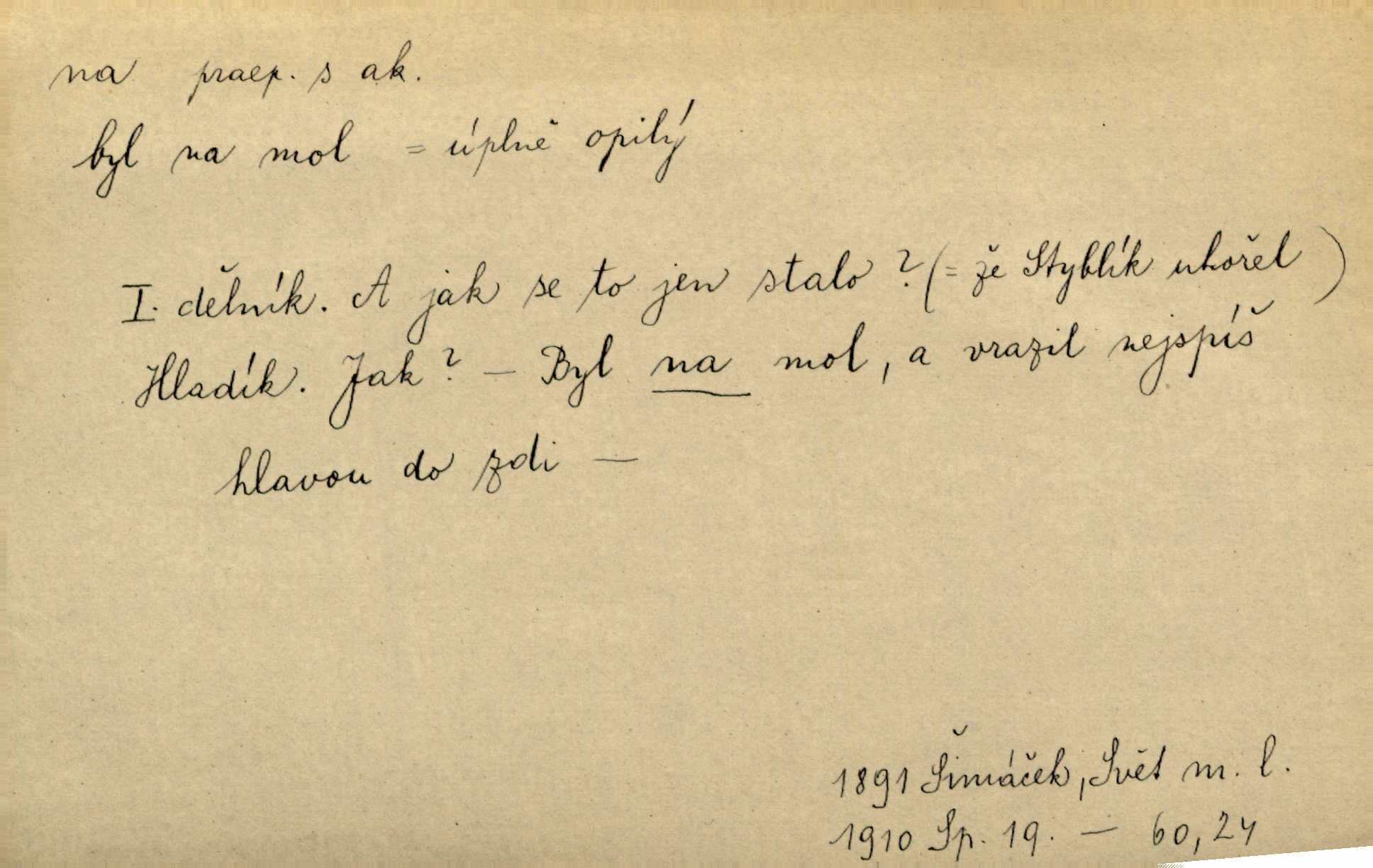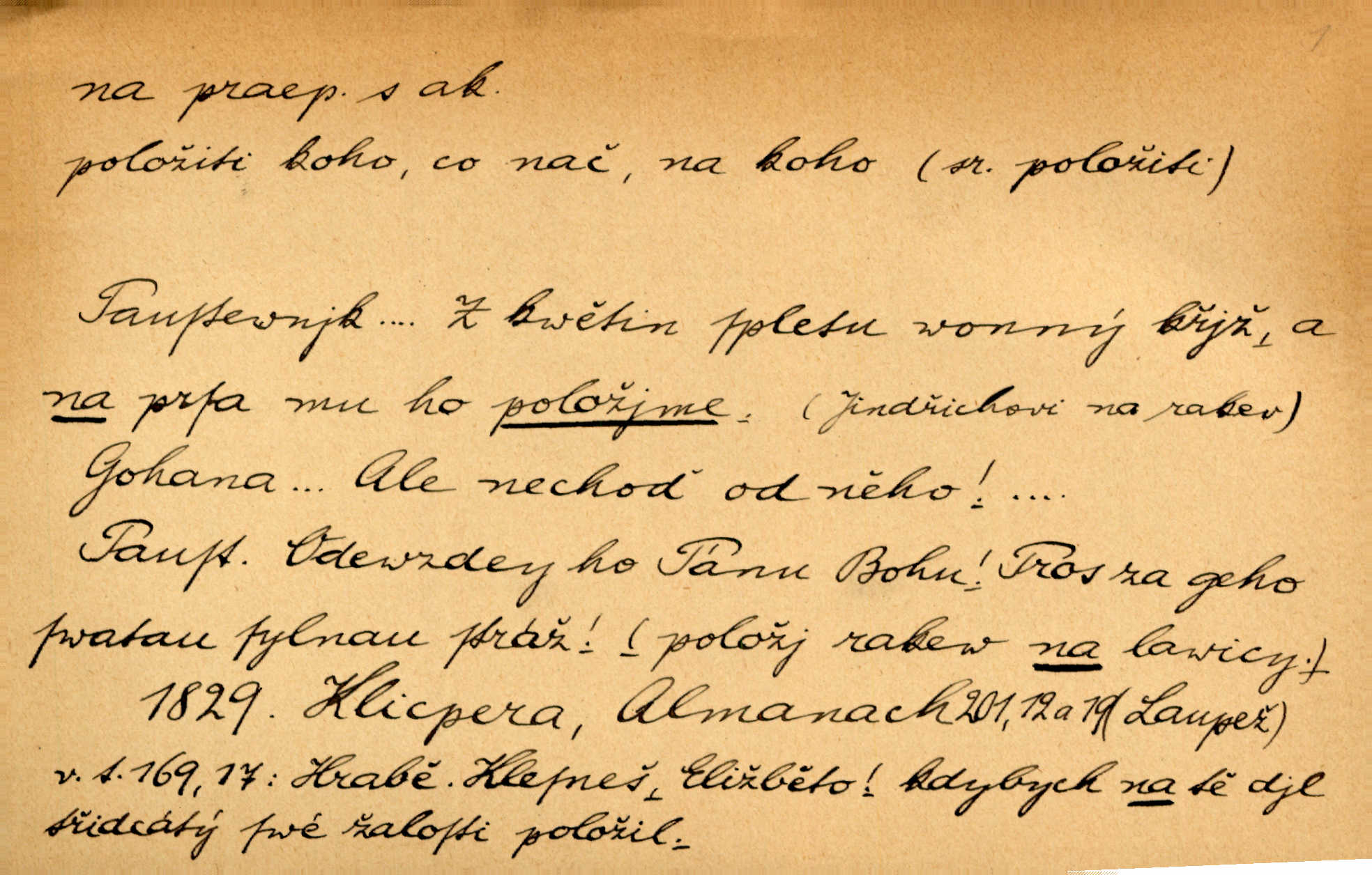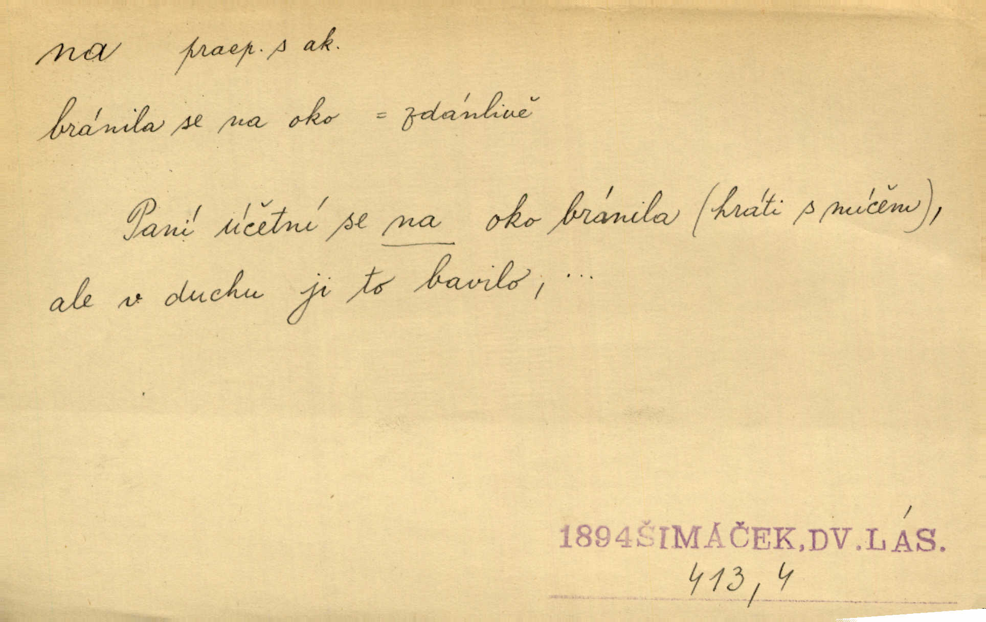 - na předl. s akus. vyjadřuje hořejšek n. povrch věci, osoby a p., ke kterému děj směřuje n. dospívá. Rozložila knihy na stůl. Šmil. Na hráz vystoupila třetí osoba. Šmil. Napsal tužkou něco na papír. Pfleg. Přiklekli na stupeň k oltáři. Šmil. Ubíral se na lože. Baar. Do zbraně! … Známá nota: na koně! na koně! Jir. Vzal pušku na ramena. Šmil. Smála se, když ji vzkřísili a když jí led na hlavu kladli. Zey. Hoši [na pastvě] na hlavy se staví, po rukách chodí. Baar. Vzala Terynku na ruku. Šmil. Padl na kolena. Baar. [Poražený] vezme za trest vítěze na záda. Zey. Ó, bych byl zdráv a na nohy mohl skočiti. Jir. Kůň stál — pouze z nohy na nohu přešlápl. Baar. Křičela, jako když ji na nože bere. Čap. Ch. Zalekla se, jako by někdo strach na ni hodil. Jir. Odpoledne připadl mu Hukal opět na mysl vzpomněl si na něj. Šmil. Musímť hradnímu na srdce vložiti, aby podobných lidí do hradu nepouštěl důtklivě uložiti. Jan. Mraky zoufalosti na mou duši lehnou. Vrch. Kaplan Fabián vzal na se úlohu, již farář naň vznesl ujal se úlohy. Šmil. Brával vždy vinu na sebe a odprošoval ji. Svět. D vyjadřuje zvl. povrch těla při výrazech odívání a podobných. Vzala na sebe, co nejlepšího měla. R. Svob. Šla v střevících na bosou nohu. Jir. Pouto na nohu a na ruku pro toho, kdo několikrát neposlechl. Jir. Mlha brala na se tvar určitý nabývala tvaru. Zey. Domněnky jeho braly na se barvu pravdivosti nabývaly rázu. Šmil. Žárlení vzalo na sebe nebezpečný ráz. Herb. Vybranějšími slovy nápady své pronášela, vážnější tvář na sebe berouc. Sab. D vyjadřuje místo, zvl. zvýšené, k němuž děj směřuje n. dospívá a na němž někdo stane n. spočine. Přiběhli na vrch za městečkem. Šmil. Dochází večer na zahrádku do zahrádky. Jir. Zeď přelezl a stoupal k milé na balkon. Mach. Kristus vstupoval na nebe. Zey. Já šel rovnou na zámek. Jir. Ubíral se na Hradčany na Loretánský plac. Pfleg. Přišel za svým povoláním na Šumavu. Šmil. Odešla na komoru prohlédnout zásoby do komory položené ve vyšším patře. Podl. Chodil někam až na Smíchov. Šim. Už nemám vyjíti v čem na ulici! Mach. Vraceli se na faru. Šmil. [Stařec] vyšel tiše na síň do síně. Jir. Chodila s místa na místo. Pfleg. Chůze se strany na stranu. R. Svob. Sežeňme je [nepřátele] z Malé strany, a pak budeme volni na všechny strany. Jir. Holčička mi zrovna přišla na svět narodila se. R. Svob. Chtěl jsem, než tě pošleme na věčnost, abys měl jasný pojem o věci usmrtíme. R. Svob. Přivedl ji na pravou cestu. Šmil. Vyplaven byl [příběh] z hlubin zapomenutí na povrch. Kronb. D vyjadřuje osobu n. věc, do jejíž těsné blízkosti n. do jejíhož úplného hmotného dotyku něco směřuje n. dospívá. V průjezdu vrazil na faráře. Šmil. Musil dobrou hodinu jíti, než přišel na myslivnu. Třeb. Narazil na stolek a opřel se oň. Šmil. S náprstkem na prstu zasedala na roh stolu a prohlížela proti světlu defektní místa. Šim. Tluče někdo na vrata. Pfleg. Vozy strženy šikem napříč, kolo na kolo, tak že se slily v dlouhou hradbu. Jir. Přitiskla své rty na jeho ústa. Šmil. Promočená košile lepila se na tělo. Baar. Zarazil se. Jako by byla ledová ruka naň sáhla. Šmil. Malovala na chaloupku samá srdce červená. Vrch. Maluj čerta na zeď, a jistě se ti ukáže straš. Paleč. Černé na bílém četl to farář s kazatelny a přibil pak na dveře chrámové. Baar. Příchozí pověsil plášť na kolík na stěně. Jir. Přikázala, ať se dnes nikomu neukazuje na oči nepřichází do styku. Ben. Po celý týden již nevycházel na lidi mezi lidi, do společnosti. Herb. Znamenitý muž postavil se hnutí tomu na čelo do popředí. Win. Srnec postavil se zrovna na ránu do rány. Šmil. Brali si nás jednotlivě na mušku a sestřelovali nás s koní. Baar. Přišla kosa na kámen nepovedlo se. Pořek. D vyjadřuje osoby n. věci, které se k sobě v prostoru n. čase hromadí, čímž se event. děj zesiluje, stupňuje. Všeobecná pokleslost duševní a terorism panujících koterií plodily zlo na zlo. Herb. Rána na ránu, a zvěř prchá. Mácha. [Stařena] udělala kříž, dva, a zase říkala a zase kříž na kříž. Jir. Všechno kvapilo ráz na ráz. Herb. D vyjadřuje hranice, mez, až po kterou něco směřuje. Záclona, splývající až na zem. Jir. Nohavice dosahovaly jen na kotníky. Něm. Na kůži promoklí vraceli se poslové jeden za druhým. Svět. Povýšila [věda] i život praktický na stupeň dříve neznaný. Sab. Pavel hluboký, ve všem dumavý a bádavý až na dno, přemýšlel o své lásce. Pfleg. Portýr se uklonil s onou úsměvnou pokorou, na kterou se za kavalírské zpropitné služebnictvo hostinců vždy sníží. Ner. Bude to trvat rok, než dojde na vdavky. Herrm. Přivedla ji na žebráckou hůl. Hol. Nikdy se mu nedostala [matka] na kůži nevyzrála na něho. Prav. Čekali jsme, až přijdou [vojáci] na dostřel. Dur. Nemíti bystrou ženu, byl by hospodařil s krávy na kozu. Baar. Také na tebe došlo! stihl tě trest. Hol. Podle němč.: Čekali, až přijde na ně řada až na ně dojde. Kronb. D vyjadřuje místo, ke kterému v prostoru něco bez jiných zřetelů směřuje. Odtud jde pěkná pěšinka na východ východním směrem. Pfleg. Slunce se kloní na západ! Vrch. Jel na Bamberg, odtud chtěl přes Cheb do Prahy. Jir. Opustil město, přímo míře na statky otcovy. Pfleg. Na horách nesou se slova lehounce na dálku vzduchem průzračným. R. Svob. Zmítané větrem na všechny směry plynové plameny na rozích blíkaly. Čap. Ch. Proti malým dušičkám, které se na venek původními staví, volejmež jen vždy stigma Kollárovo. Durd. D vyjadřuje vůbec hmotný n. nehmotný cíl, k němuž něco bez jiných zřetelů směřuje. Vyjít si na vzduch. Nechoď na deš