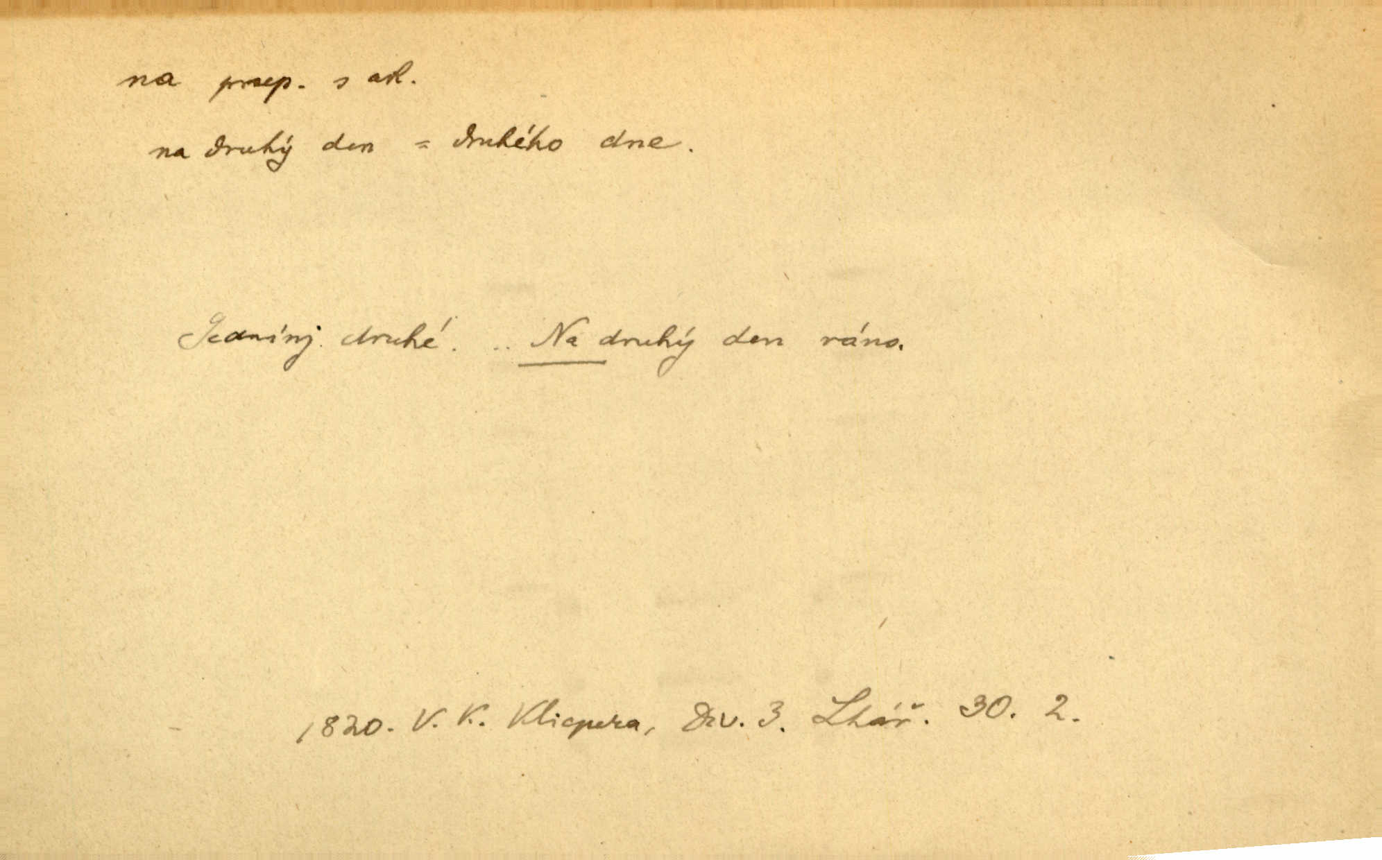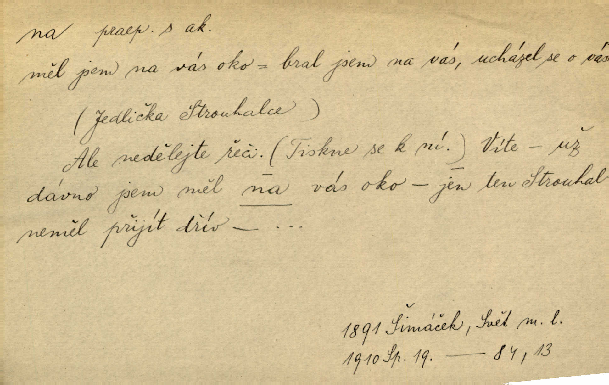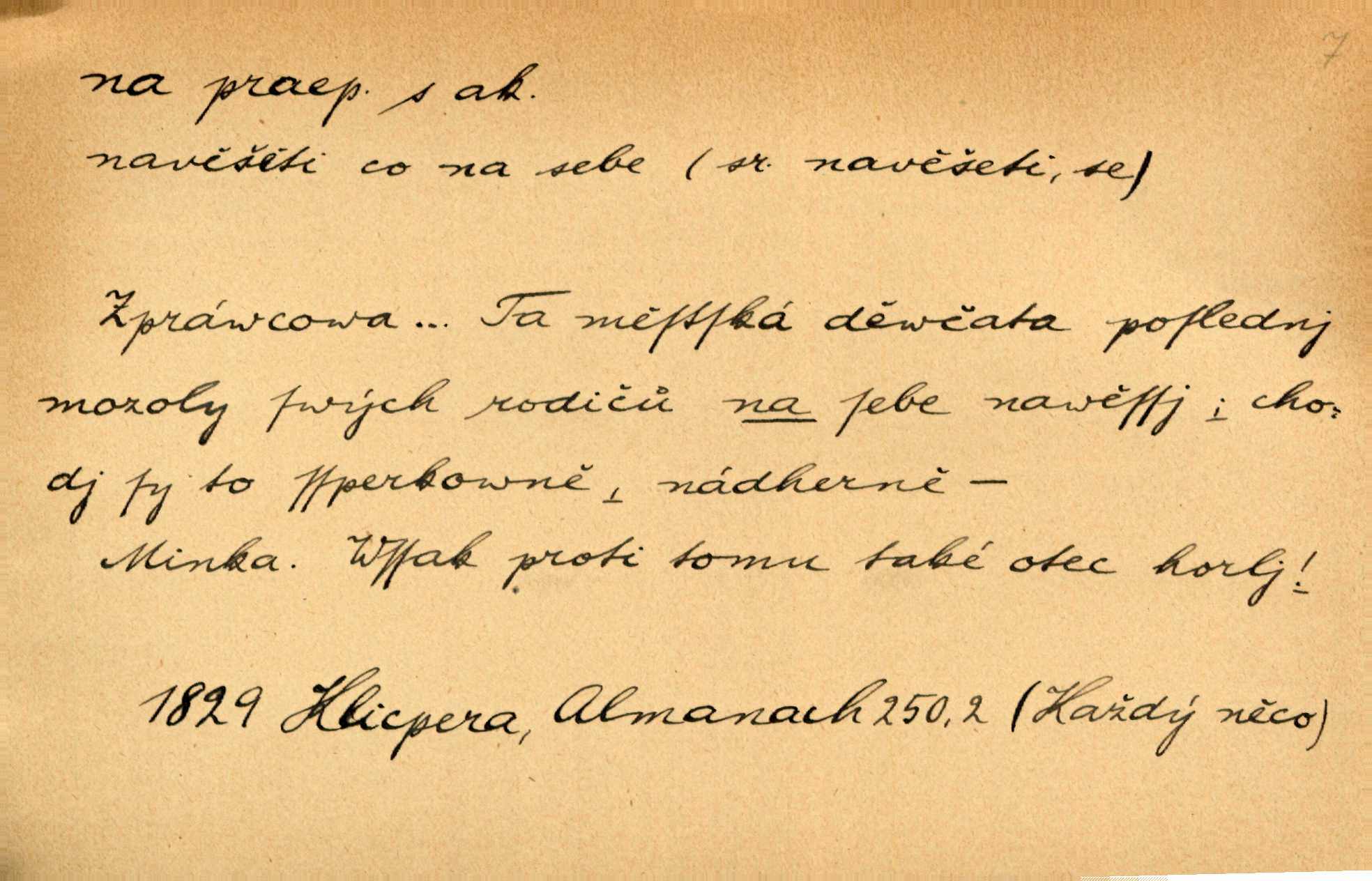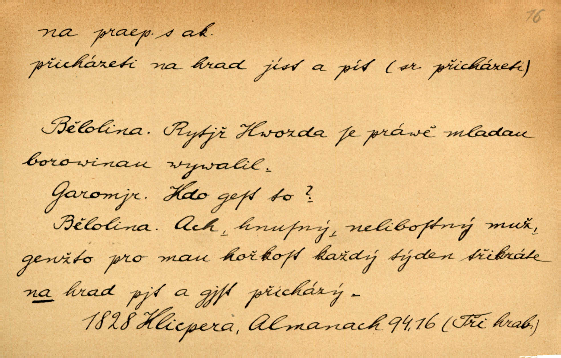 - na předl. s akus. vyjadřuje hořejšek n. povrch věci, osoby a p., ke kterému děj směřuje n. dospívá. Rozložila knihy na stůl. Šmil. Na hráz vystoupila třetí osoba. Šmil. Napsal tužkou něco na papír. Pfleg. Přiklekli na stupeň k oltáři. Šmil. Ubíral se na lože. Baar. Do zbraně! … Známá nota: na koně! na koně! Jir. Vzal pušku na ramena. Šmil. Smála se, když ji vzkřísili a když jí led na hlavu kladli. Zey. Hoši [na pastvě] na hlavy se staví, po rukách chodí. Baar. Vzala Terynku na ruku. Šmil. Padl na kolena. Baar. [Poražený] vezme za trest vítěze na záda. Zey. Ó, bych byl zdráv a na nohy mohl skočiti. Jir. Kůň stál — pouze z nohy na nohu přešlápl. Baar. Křičela, jako když ji na nože bere. Čap. Ch. Zalekla se, jako by někdo strach na ni hodil. Jir. Odpoledne připadl mu Hukal opět na mysl vzpomněl si na něj. Šmil. Musímť hradnímu na srdce vložiti, aby podobných lidí do hradu nepouštěl důtklivě uložiti. Jan. Mraky zoufalosti na mou duši lehnou. Vrch. Kaplan Fabián vzal na se úlohu, již farář naň vznesl ujal se úlohy. Šmil. Brával vždy vinu na sebe a odprošoval ji. Svět. D vyjadřuje zvl. povrch těla při výrazech odívání a podobných. Vzala na sebe, co nejlepšího měla. R. Svob. Šla v střevících na bosou nohu. Jir. Pouto na nohu a na ruku pro toho, kdo několikrát neposlechl. Jir. Mlha brala na se tvar určitý nabývala tvaru. Zey. Domněnky jeho braly na se barvu pravdivosti nabývaly rázu. Šmil. Žárlení vzalo na sebe nebezpečný ráz. Herb. Vybranějšími slovy nápady své pronášela, vážnější tvář na sebe berouc. Sab. D vyjadřuje místo, zvl. zvýšené, k němuž děj směřuje n. dospívá a na němž někdo stane n. spočine. Přiběhli na vrch za městečkem. Šmil. Dochází večer na zahrádku do zahrádky. Jir. Zeď přelezl a stoupal k milé na balkon. Mach. Kristus vstupoval na nebe. Zey. Já šel rovnou na zámek. Jir. Ubíral se na Hradčany na Loretánský plac. Pfleg. Přišel za svým povoláním na Šumavu. Šmil. Odešla na komoru prohlédnout zásoby do komory položené ve vyšším patře. Podl. Chodil někam až na Smíchov. Šim. Už nemám vyjíti v čem na ulici! Mach. Vraceli se na faru. Šmil. [Stařec] vyšel tiše na síň do síně. Jir. Chodila s místa na místo. Pfleg. Chůze se strany na stranu. R. Svob. Sežeňme je [nepřátele] z Malé strany, a pak budeme volni na všechny strany. Jir. Holčička mi zrovna přišla na svět narodila se. R. Svob. Chtěl jsem, než tě pošleme na věčnost, abys měl jasný pojem o věci usmrtíme. R. Svob. Přivedl ji na pravou cestu. Šmil. Vyplaven byl [příběh] z hlubin zapomenutí na povrch. Kronb. D vyjadřuje osobu n. věc, do jejíž těsné blízkosti n. do jejíhož úplného hmotného dotyku něco směřuje n. dospívá. V průjezdu vrazil na faráře. Šmil. Musil dobrou hodinu jíti, než přišel na myslivnu. Třeb. Narazil na stolek a opřel se oň. Šmil. S náprstkem na prstu zasedala na roh stolu a prohlížela proti světlu defektní místa. Šim. Tluče někdo na vrata. Pfleg. Vozy strženy šikem napříč, kolo na kolo, tak že se slily v dlouhou hradbu. Jir. Přitiskla své rty na jeho ústa. Šmil. Promočená košile lepila se na tělo. Baar. Zarazil se. Jako by byla ledová ruka naň sáhla. Šmil. Malovala na chaloupku samá srdce červená. Vrch. Maluj čerta na zeď, a jistě se ti ukáže straš. Paleč. Černé na bílém četl to farář s kazatelny a přibil pak na dveře chrámové. Baar. Příchozí pověsil plášť na kolík na stěně. Jir. Přikázala, ať se dnes nikomu neukazuje na oči nepřichází do styku. Ben. Po celý týden již nevycházel na lidi mezi lidi, do společnosti. Herb. Znamenitý muž postavil se hnutí tomu na čelo do popředí. Win. Srnec postavil se zrovna na ránu do rány. Šmil. Brali si nás jednotlivě na mušku a sestřelovali nás s koní. Baar. Přišla kosa na kámen nepovedlo se. Pořek. D vyjadřuje osoby n. věci, které se k sobě v prostoru n. čase hromadí, čímž se event. děj zesiluje, stupňuje. Všeobecná pokleslost duševní a terorism panujících koterií plodily zlo na zlo. Herb. Rána na ránu, a zvěř prchá. Mácha. [Stařena] udělala kříž, dva, a zase říkala a zase kříž na kříž. Jir. Všechno kvapilo ráz na ráz. Herb. D vyjadřuje hranice, mez, až po kterou něco směřuje. Záclona, splývající až na zem. Jir. Nohavice dosahovaly jen na kotníky. Něm. Na kůži promoklí vraceli se poslové jeden za druhým. Svět. Povýšila [věda] i život praktický na stupeň dříve neznaný. Sab. Pavel hluboký, ve všem dumavý a bádavý až na dno, přemýšlel o své lásce. Pfleg. Portýr se uklonil s onou úsměvnou pokorou, na kterou se za kavalírské zpropitné služebnictvo hostinců vždy sníží. Ner. Bude to trvat rok, než dojde na vdavky. Herrm. Přivedla ji na žebráckou hůl. Hol. Nikdy se mu nedostala [matka] na kůži nevyzrála na něho. Prav. Čekali jsme, až přijdou [vojáci] na dostřel. Dur. Nemíti bystrou ženu, byl by hospodařil s krávy na kozu. Baar. Také na tebe došlo! stihl tě trest. Hol. Podle němč.: Čekali, až přijde na ně řada až na ně dojde. Kronb. D vyjadřuje místo, ke kterému v prostoru něco bez jiných zřetelů směřuje. Odtud jde pěkná pěšinka na východ východním směrem. Pfleg. Slunce se kloní na západ! Vrch. Jel na Bamberg, odtud chtěl přes Cheb do Prahy. Jir. Opustil město, přímo míře na statky otcovy. Pfleg. Na horách nesou se slova lehounce na dálku vzduchem průzračným. R. Svob. Zmítané větrem na všechny směry plynové plameny na rozích blíkaly. Čap. Ch. Proti malým dušičkám, které se na venek původními staví, volejmež jen vždy stigma Kollárovo. Durd. D vyjadřuje vůbec hmotný n. nehmotný cíl, k němuž něco bez jiných zřetelů směřuje. Vyjít si na vzduch. Nechoď na deš