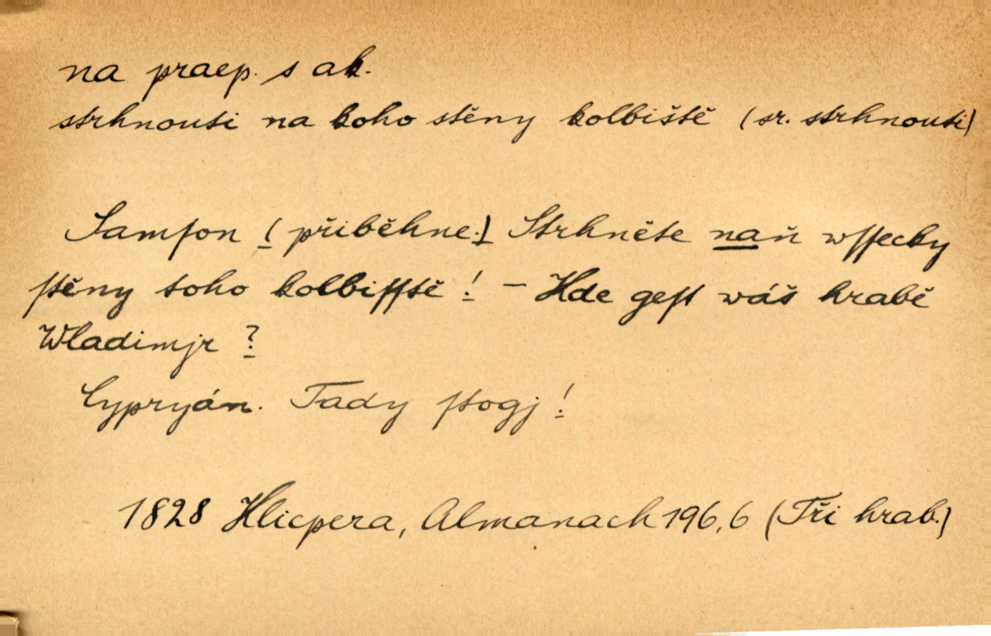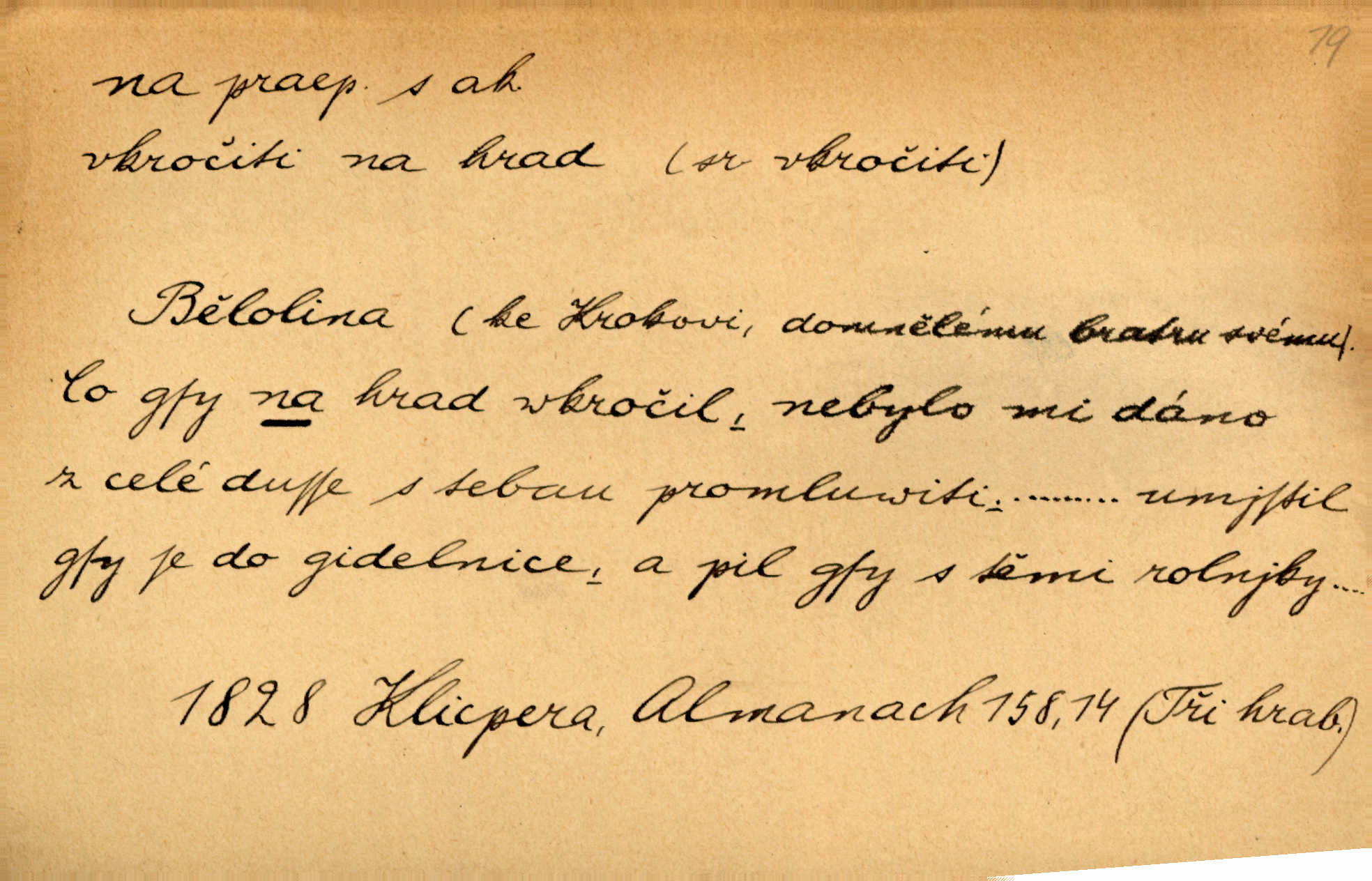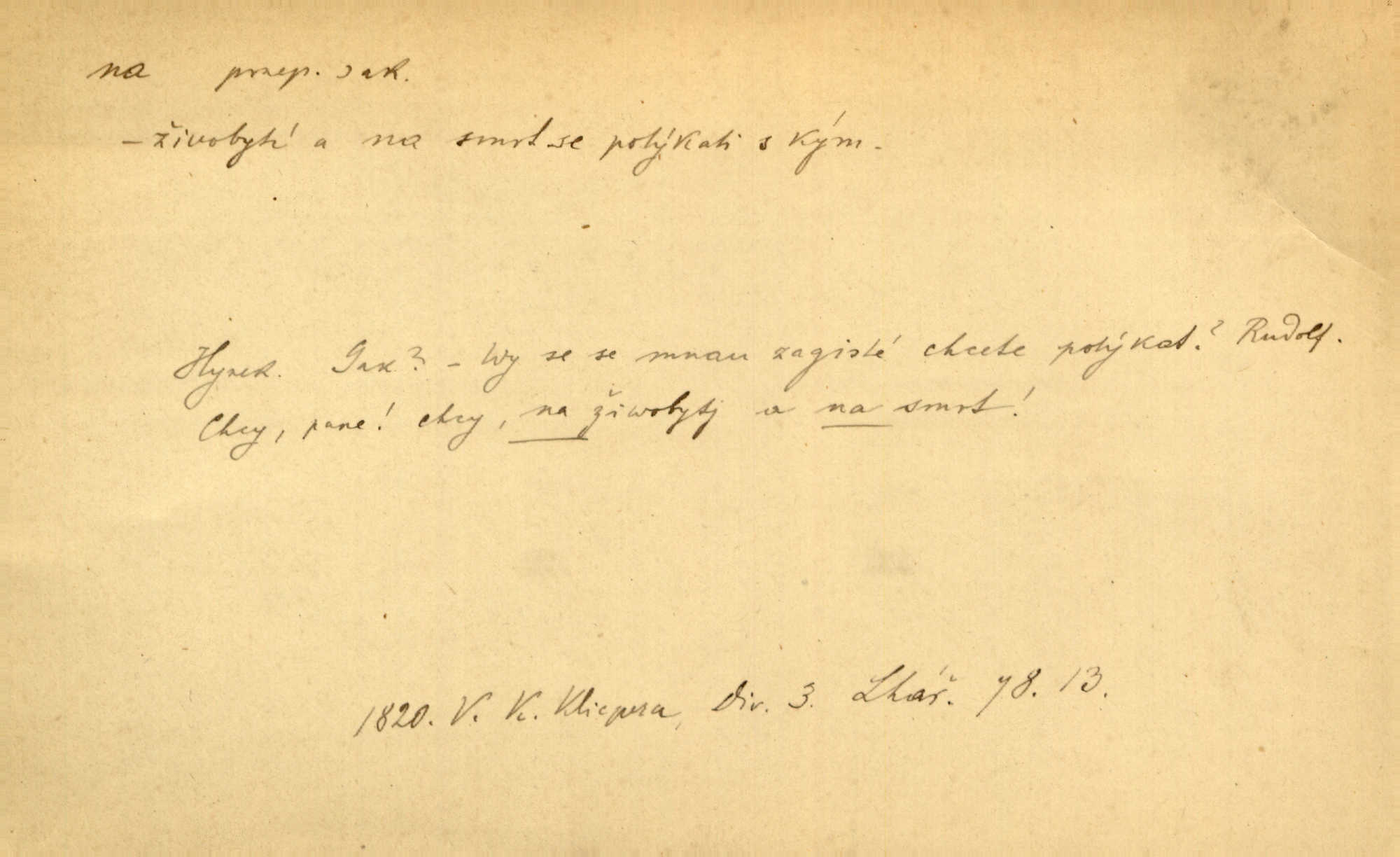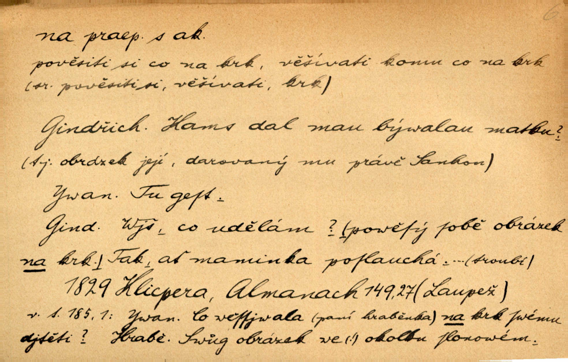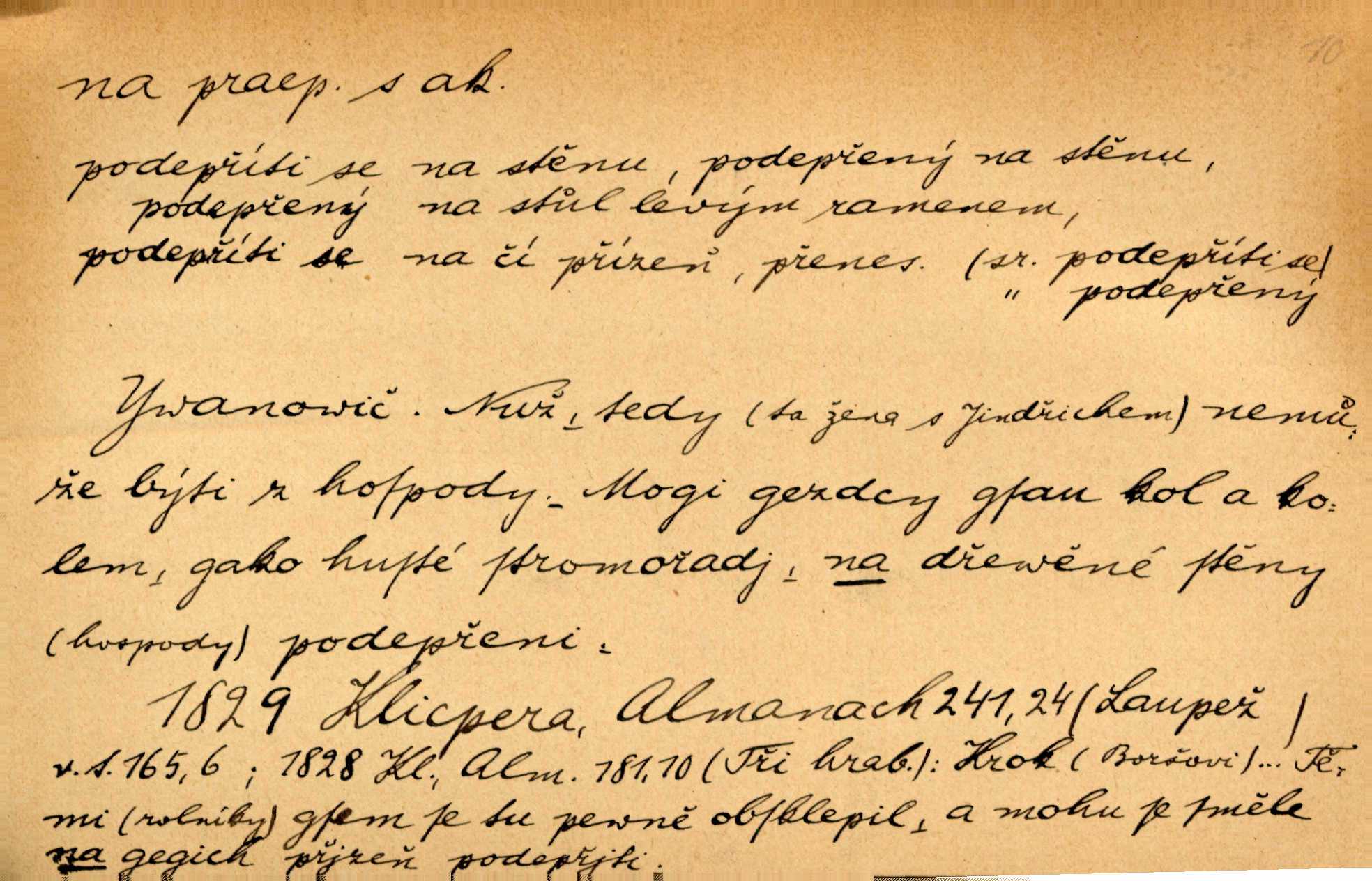 - na předl. s akus. vyjadřuje hořejšek n. povrch věci, osoby a p., ke kterému děj směřuje n. dospívá. Rozložila knihy na stůl. Šmil. Na hráz vystoupila třetí osoba. Šmil. Napsal tužkou něco na papír. Pfleg. Přiklekli na stupeň k oltáři. Šmil. Ubíral se na lože. Baar. Do zbraně! … Známá nota: na koně! na koně! Jir. Vzal pušku na ramena. Šmil. Smála se, když ji vzkřísili a když jí led na hlavu kladli. Zey. Hoši [na pastvě] na hlavy se staví, po rukách chodí. Baar. Vzala Terynku na ruku. Šmil. Padl na kolena. Baar. [Poražený] vezme za trest vítěze na záda. Zey. Ó, bych byl zdráv a na nohy mohl skočiti. Jir. Kůň stál — pouze z nohy na nohu přešlápl. Baar. Křičela, jako když ji na nože bere. Čap. Ch. Zalekla se, jako by někdo strach na ni hodil. Jir. Odpoledne připadl mu Hukal opět na mysl vzpomněl si na něj. Šmil. Musímť hradnímu na srdce vložiti, aby podobných lidí do hradu nepouštěl důtklivě uložiti. Jan. Mraky zoufalosti na mou duši lehnou. Vrch. Kaplan Fabián vzal na se úlohu, již farář naň vznesl ujal se úlohy. Šmil. Brával vždy vinu na sebe a odprošoval ji. Svět. D vyjadřuje zvl. povrch těla při výrazech odívání a podobných. Vzala na sebe, co nejlepšího měla. R. Svob. Šla v střevících na bosou nohu. Jir. Pouto na nohu a na ruku pro toho, kdo několikrát neposlechl. Jir. Mlha brala na se tvar určitý nabývala tvaru. Zey. Domněnky jeho braly na se barvu pravdivosti nabývaly rázu. Šmil. Žárlení vzalo na sebe nebezpečný ráz. Herb. Vybranějšími slovy nápady své pronášela, vážnější tvář na sebe berouc. Sab. D vyjadřuje místo, zvl. zvýšené, k němuž děj směřuje n. dospívá a na němž někdo stane n. spočine. Přiběhli na vrch za městečkem. Šmil. Dochází večer na zahrádku do zahrádky. Jir. Zeď přelezl a stoupal k milé na balkon. Mach. Kristus vstupoval na nebe. Zey. Já šel rovnou na zámek. Jir. Ubíral se na Hradčany na Loretánský plac. Pfleg. Přišel za svým povoláním na Šumavu. Šmil. Odešla na komoru prohlédnout zásoby do komory položené ve vyšším patře. Podl. Chodil někam až na Smíchov. Šim. Už nemám vyjíti v čem na ulici! Mach. Vraceli se na faru. Šmil. [Stařec] vyšel tiše na síň do síně. Jir. Chodila s místa na místo. Pfleg. Chůze se strany na stranu. R. Svob. Sežeňme je [nepřátele] z Malé strany, a pak budeme volni na všechny strany. Jir. Holčička mi zrovna přišla na svět narodila se. R. Svob. Chtěl jsem, než tě pošleme na věčnost, abys měl jasný pojem o věci usmrtíme. R. Svob. Přivedl ji na pravou cestu. Šmil. Vyplaven byl [příběh] z hlubin zapomenutí na povrch. Kronb. D vyjadřuje osobu n. věc, do jejíž těsné blízkosti n. do jejíhož úplného hmotného dotyku něco směřuje n. dospívá. V průjezdu vrazil na faráře. Šmil. Musil dobrou hodinu jíti, než přišel na myslivnu. Třeb. Narazil na stolek a opřel se oň. Šmil. S náprstkem na prstu zasedala na roh stolu a prohlížela proti světlu defektní místa. Šim. Tluče někdo na vrata. Pfleg. Vozy strženy šikem napříč, kolo na kolo, tak že se slily v dlouhou hradbu. Jir. Přitiskla své rty na jeho ústa. Šmil. Promočená košile lepila se na tělo. Baar. Zarazil se. Jako by byla ledová ruka naň sáhla. Šmil. Malovala na chaloupku samá srdce červená. Vrch. Maluj čerta na zeď, a jistě se ti ukáže straš. Paleč. Černé na bílém četl to farář s kazatelny a přibil pak na dveře chrámové. Baar. Příchozí pověsil plášť na kolík na stěně. Jir. Přikázala, ať se dnes nikomu neukazuje na oči nepřichází do styku. Ben. Po celý týden již nevycházel na lidi mezi lidi, do společnosti. Herb. Znamenitý muž postavil se hnutí tomu na čelo do popředí. Win. Srnec postavil se zrovna na ránu do rány. Šmil. Brali si nás jednotlivě na mušku a sestřelovali nás s koní. Baar. Přišla kosa na kámen nepovedlo se. Pořek. D vyjadřuje osoby n. věci, které se k sobě v prostoru n. čase hromadí, čímž se event. děj zesiluje, stupňuje. Všeobecná pokleslost duševní a terorism panujících koterií plodily zlo na zlo. Herb. Rána na ránu, a zvěř prchá. Mácha. [Stařena] udělala kříž, dva, a zase říkala a zase kříž na kříž. Jir. Všechno kvapilo ráz na ráz. Herb. D vyjadřuje hranice, mez, až po kterou něco směřuje. Záclona, splývající až na zem. Jir. Nohavice dosahovaly jen na kotníky. Něm. Na kůži promoklí vraceli se poslové jeden za druhým. Svět. Povýšila [věda] i život praktický na stupeň dříve neznaný. Sab. Pavel hluboký, ve všem dumavý a bádavý až na dno, přemýšlel o své lásce. Pfleg. Portýr se uklonil s onou úsměvnou pokorou, na kterou se za kavalírské zpropitné služebnictvo hostinců vždy sníží. Ner. Bude to trvat rok, než dojde na vdavky. Herrm. Přivedla ji na žebráckou hůl. Hol. Nikdy se mu nedostala [matka] na kůži nevyzrála na něho. Prav. Čekali jsme, až přijdou [vojáci] na dostřel. Dur. Nemíti bystrou ženu, byl by hospodařil s krávy na kozu. Baar. Také na tebe došlo! stihl tě trest. Hol. Podle němč.: Čekali, až přijde na ně řada až na ně dojde. Kronb. D vyjadřuje místo, ke kterému v prostoru něco bez jiných zřetelů směřuje. Odtud jde pěkná pěšinka na východ východním směrem. Pfleg. Slunce se kloní na západ! Vrch. Jel na Bamberg, odtud chtěl přes Cheb do Prahy. Jir. Opustil město, přímo míře na statky otcovy. Pfleg. Na horách nesou se slova lehounce na dálku vzduchem průzračným. R. Svob. Zmítané větrem na všechny směry plynové plameny na rozích blíkaly. Čap. Ch. Proti malým dušičkám, které se na venek původními staví, volejmež jen vždy stigma Kollárovo. Durd. D vyjadřuje vůbec hmotný n. nehmotný cíl, k němuž něco bez jiných zřetelů směřuje. Vyjít si na vzduch. Nechoď na deš