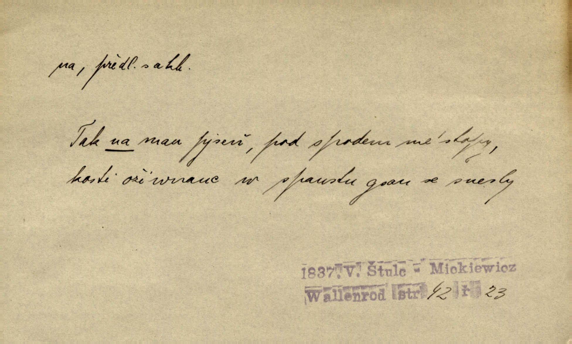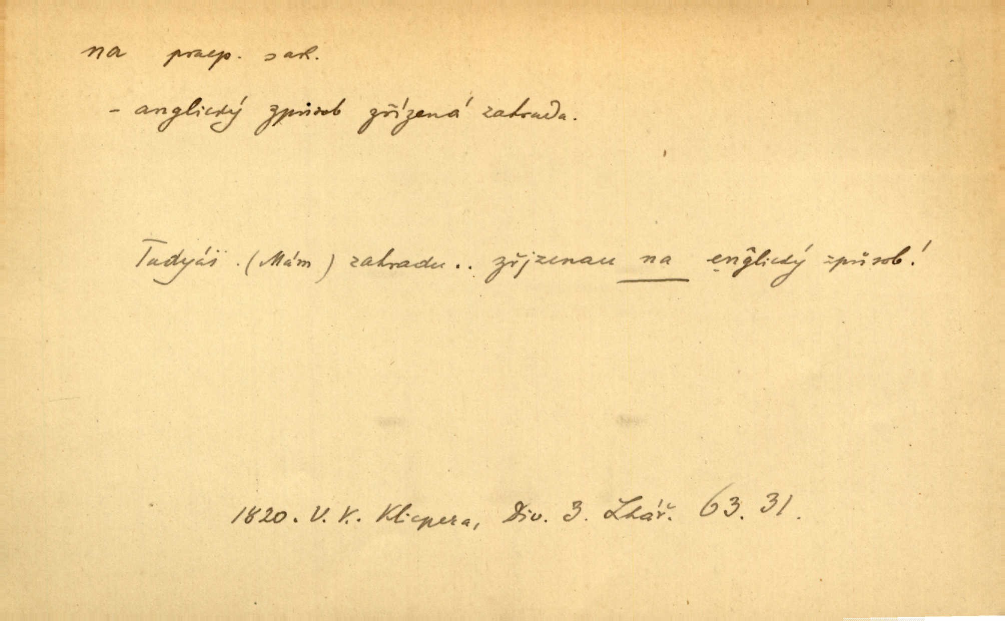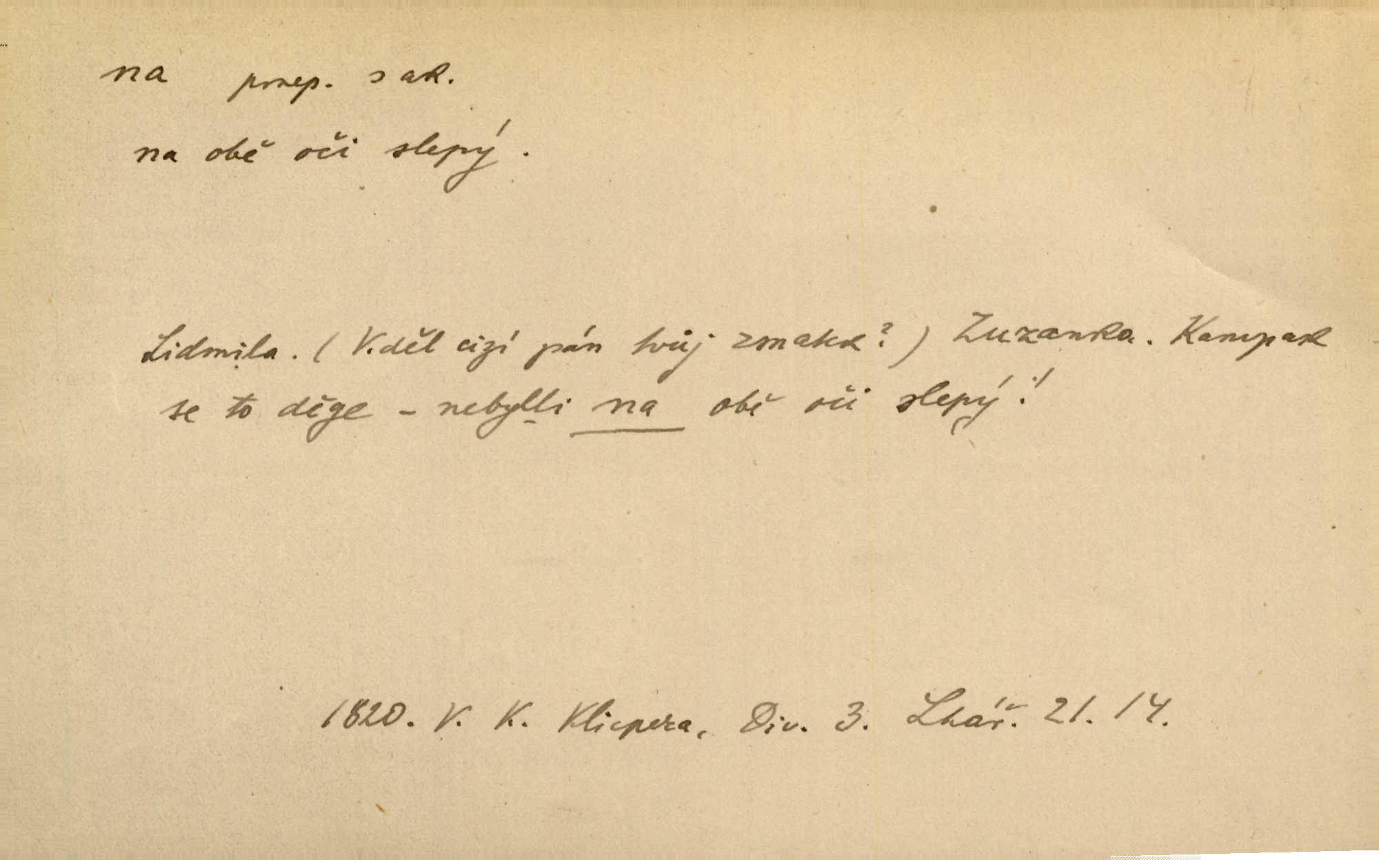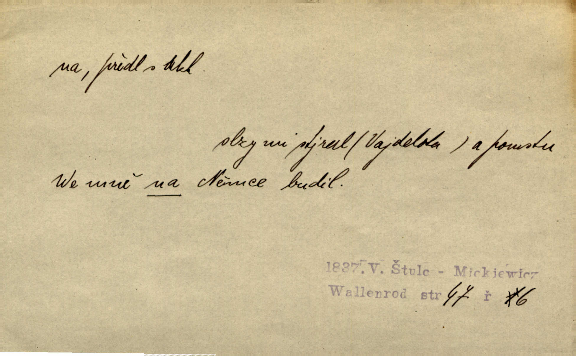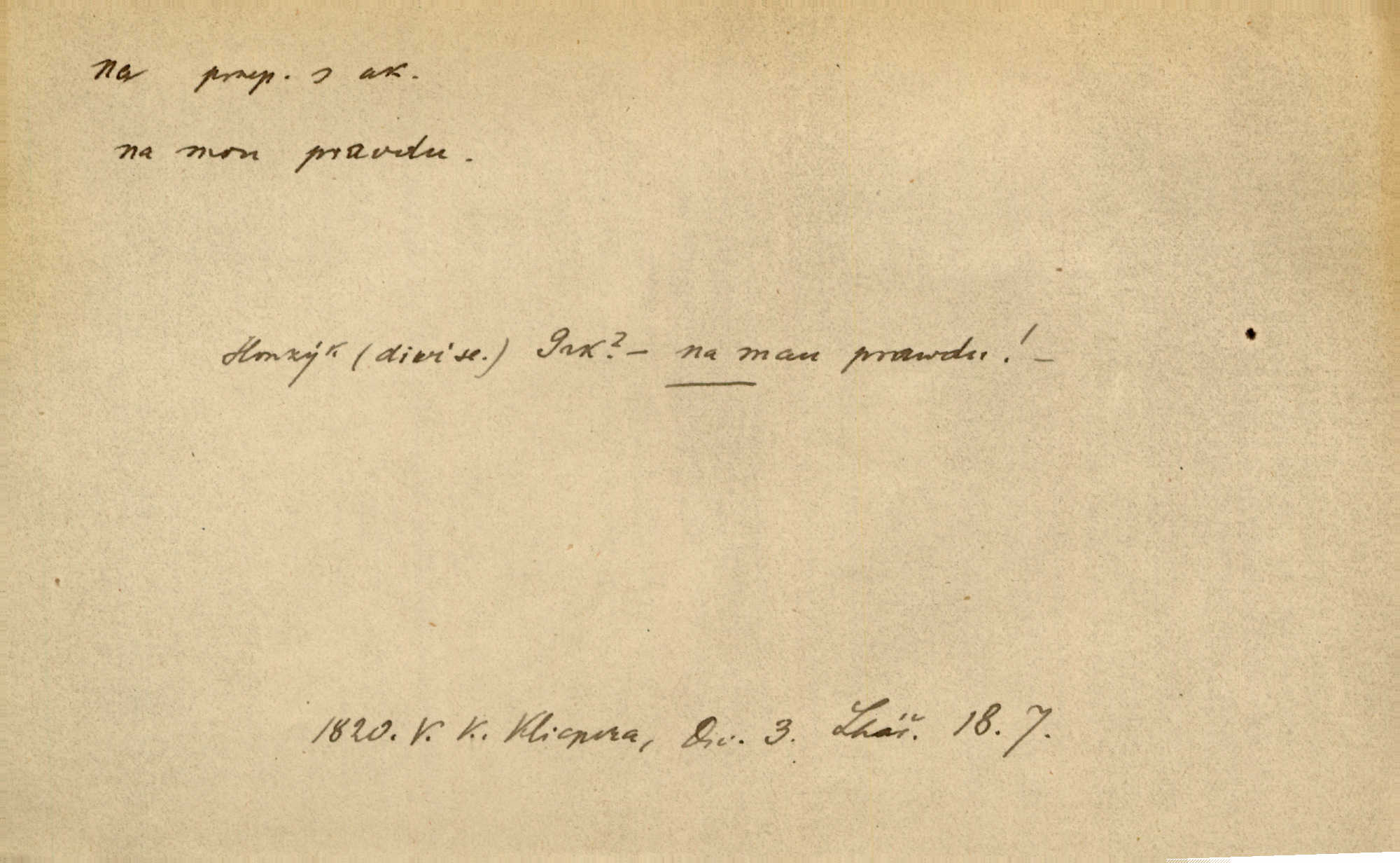 - na předl. s akus. vyjadřuje hořejšek n. povrch věci, osoby a p., ke kterému děj směřuje n. dospívá. Rozložila knihy na stůl. Šmil. Na hráz vystoupila třetí osoba. Šmil. Napsal tužkou něco na papír. Pfleg. Přiklekli na stupeň k oltáři. Šmil. Ubíral se na lože. Baar. Do zbraně! … Známá nota: na koně! na koně! Jir. Vzal pušku na ramena. Šmil. Smála se, když ji vzkřísili a když jí led na hlavu kladli. Zey. Hoši [na pastvě] na hlavy se staví, po rukách chodí. Baar. Vzala Terynku na ruku. Šmil. Padl na kolena. Baar. [Poražený] vezme za trest vítěze na záda. Zey. Ó, bych byl zdráv a na nohy mohl skočiti. Jir. Kůň stál — pouze z nohy na nohu přešlápl. Baar. Křičela, jako když ji na nože bere. Čap. Ch. Zalekla se, jako by někdo strach na ni hodil. Jir. Odpoledne připadl mu Hukal opět na mysl vzpomněl si na něj. Šmil. Musímť hradnímu na srdce vložiti, aby podobných lidí do hradu nepouštěl důtklivě uložiti. Jan. Mraky zoufalosti na mou duši lehnou. Vrch. Kaplan Fabián vzal na se úlohu, již farář naň vznesl ujal se úlohy. Šmil. Brával vždy vinu na sebe a odprošoval ji. Svět. D vyjadřuje zvl. povrch těla při výrazech odívání a podobných. Vzala na sebe, co nejlepšího měla. R. Svob. Šla v střevících na bosou nohu. Jir. Pouto na nohu a na ruku pro toho, kdo několikrát neposlechl. Jir. Mlha brala na se tvar určitý nabývala tvaru. Zey. Domněnky jeho braly na se barvu pravdivosti nabývaly rázu. Šmil. Žárlení vzalo na sebe nebezpečný ráz. Herb. Vybranějšími slovy nápady své pronášela, vážnější tvář na sebe berouc. Sab. D vyjadřuje místo, zvl. zvýšené, k němuž děj směřuje n. dospívá a na němž někdo stane n. spočine. Přiběhli na vrch za městečkem. Šmil. Dochází večer na zahrádku do zahrádky. Jir. Zeď přelezl a stoupal k milé na balkon. Mach. Kristus vstupoval na nebe. Zey. Já šel rovnou na zámek. Jir. Ubíral se na Hradčany na Loretánský plac. Pfleg. Přišel za svým povoláním na Šumavu. Šmil. Odešla na komoru prohlédnout zásoby do komory položené ve vyšším patře. Podl. Chodil někam až na Smíchov. Šim. Už nemám vyjíti v čem na ulici! Mach. Vraceli se na faru. Šmil. [Stařec] vyšel tiše na síň do síně. Jir. Chodila s místa na místo. Pfleg. Chůze se strany na stranu. R. Svob. Sežeňme je [nepřátele] z Malé strany, a pak budeme volni na všechny strany. Jir. Holčička mi zrovna přišla na svět narodila se. R. Svob. Chtěl jsem, než tě pošleme na věčnost, abys měl jasný pojem o věci usmrtíme. R. Svob. Přivedl ji na pravou cestu. Šmil. Vyplaven byl [příběh] z hlubin zapomenutí na povrch. Kronb. D vyjadřuje osobu n. věc, do jejíž těsné blízkosti n. do jejíhož úplného hmotného dotyku něco směřuje n. dospívá. V průjezdu vrazil na faráře. Šmil. Musil dobrou hodinu jíti, než přišel na myslivnu. Třeb. Narazil na stolek a opřel se oň. Šmil. S náprstkem na prstu zasedala na roh stolu a prohlížela proti světlu defektní místa. Šim. Tluče někdo na vrata. Pfleg. Vozy strženy šikem napříč, kolo na kolo, tak že se slily v dlouhou hradbu. Jir. Přitiskla své rty na jeho ústa. Šmil. Promočená košile lepila se na tělo. Baar. Zarazil se. Jako by byla ledová ruka naň sáhla. Šmil. Malovala na chaloupku samá srdce červená. Vrch. Maluj čerta na zeď, a jistě se ti ukáže straš. Paleč. Černé na bílém četl to farář s kazatelny a přibil pak na dveře chrámové. Baar. Příchozí pověsil plášť na kolík na stěně. Jir. Přikázala, ať se dnes nikomu neukazuje na oči nepřichází do styku. Ben. Po celý týden již nevycházel na lidi mezi lidi, do společnosti. Herb. Znamenitý muž postavil se hnutí tomu na čelo do popředí. Win. Srnec postavil se zrovna na ránu do rány. Šmil. Brali si nás jednotlivě na mušku a sestřelovali nás s koní. Baar. Přišla kosa na kámen nepovedlo se. Pořek. D vyjadřuje osoby n. věci, které se k sobě v prostoru n. čase hromadí, čímž se event. děj zesiluje, stupňuje. Všeobecná pokleslost duševní a terorism panujících koterií plodily zlo na zlo. Herb. Rána na ránu, a zvěř prchá. Mácha. [Stařena] udělala kříž, dva, a zase říkala a zase kříž na kříž. Jir. Všechno kvapilo ráz na ráz. Herb. D vyjadřuje hranice, mez, až po kterou něco směřuje. Záclona, splývající až na zem. Jir. Nohavice dosahovaly jen na kotníky. Něm. Na kůži promoklí vraceli se poslové jeden za druhým. Svět. Povýšila [věda] i život praktický na stupeň dříve neznaný. Sab. Pavel hluboký, ve všem dumavý a bádavý až na dno, přemýšlel o své lásce. Pfleg. Portýr se uklonil s onou úsměvnou pokorou, na kterou se za kavalírské zpropitné služebnictvo hostinců vždy sníží. Ner. Bude to trvat rok, než dojde na vdavky. Herrm. Přivedla ji na žebráckou hůl. Hol. Nikdy se mu nedostala [matka] na kůži nevyzrála na něho. Prav. Čekali jsme, až přijdou [vojáci] na dostřel. Dur. Nemíti bystrou ženu, byl by hospodařil s krávy na kozu. Baar. Také na tebe došlo! stihl tě trest. Hol. Podle němč.: Čekali, až přijde na ně řada až na ně dojde. Kronb. D vyjadřuje místo, ke kterému v prostoru něco bez jiných zřetelů směřuje. Odtud jde pěkná pěšinka na východ východním směrem. Pfleg. Slunce se kloní na západ! Vrch. Jel na Bamberg, odtud chtěl přes Cheb do Prahy. Jir. Opustil město, přímo míře na statky otcovy. Pfleg. Na horách nesou se slova lehounce na dálku vzduchem průzračným. R. Svob. Zmítané větrem na všechny směry plynové plameny na rozích blíkaly. Čap. Ch. Proti malým dušičkám, které se na venek původními staví, volejmež jen vždy stigma Kollárovo. Durd. D vyjadřuje vůbec hmotný n. nehmotný cíl, k němuž něco bez jiných zřetelů směřuje. Vyjít si na vzduch. Nechoď na deš