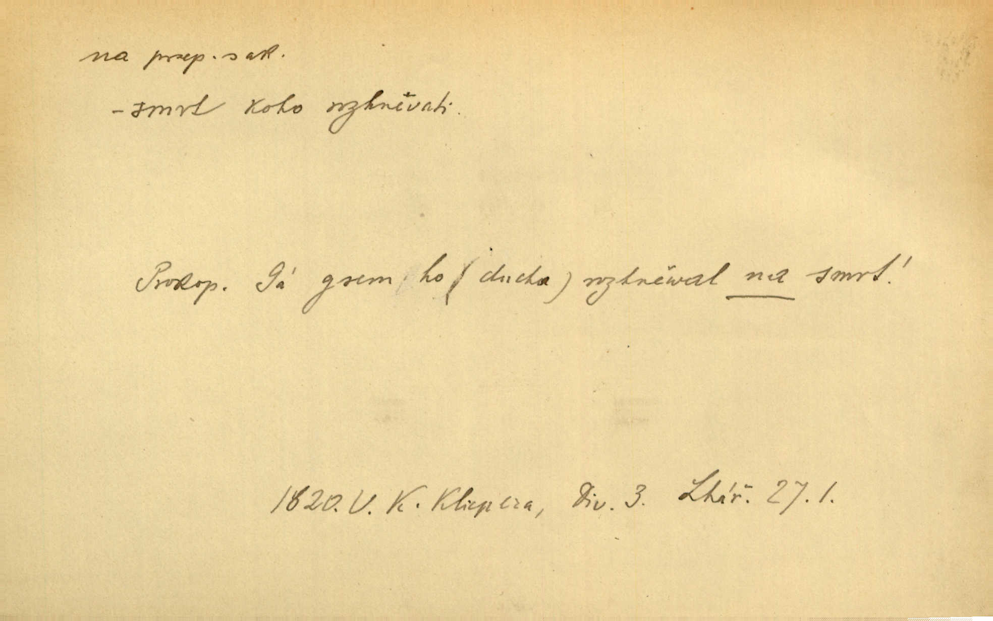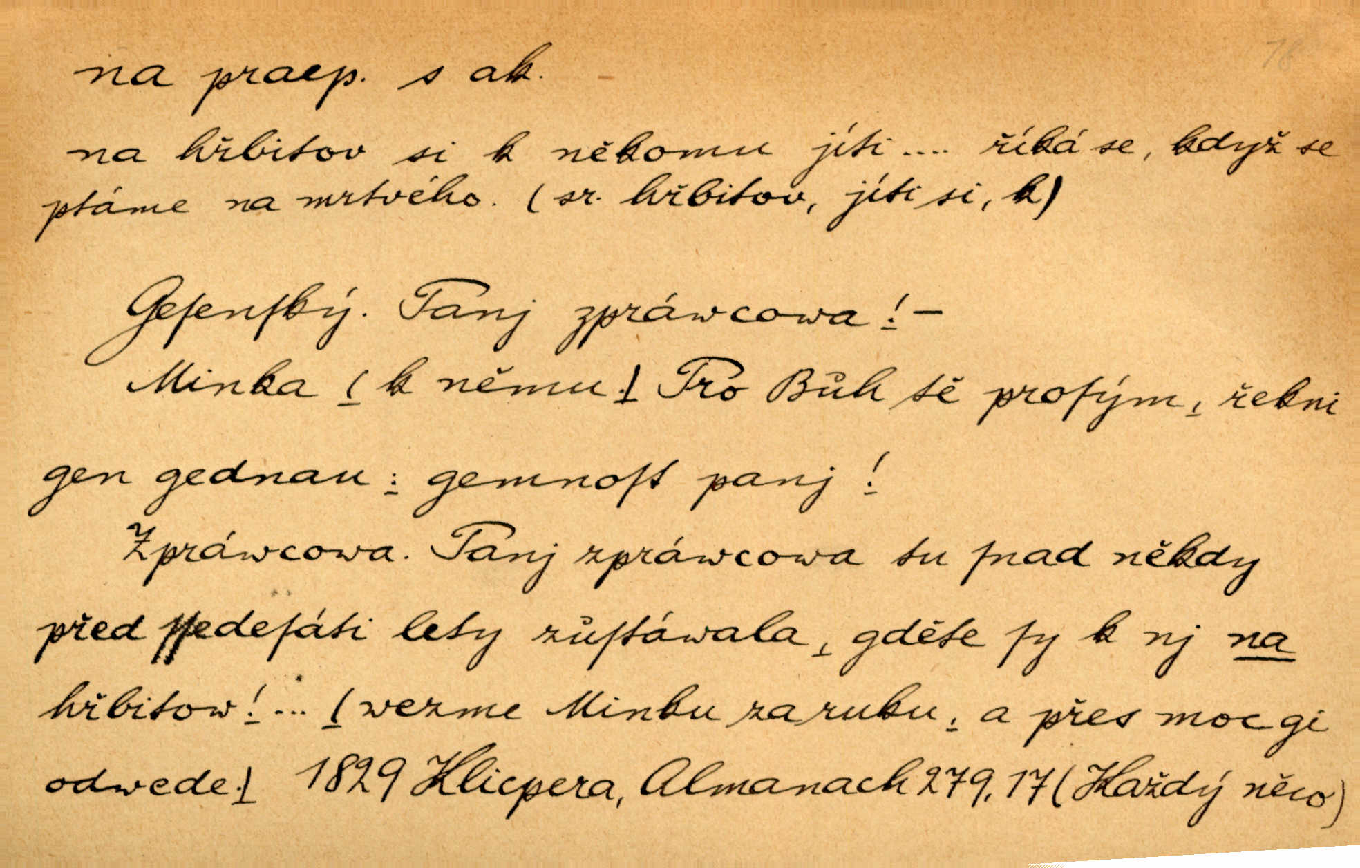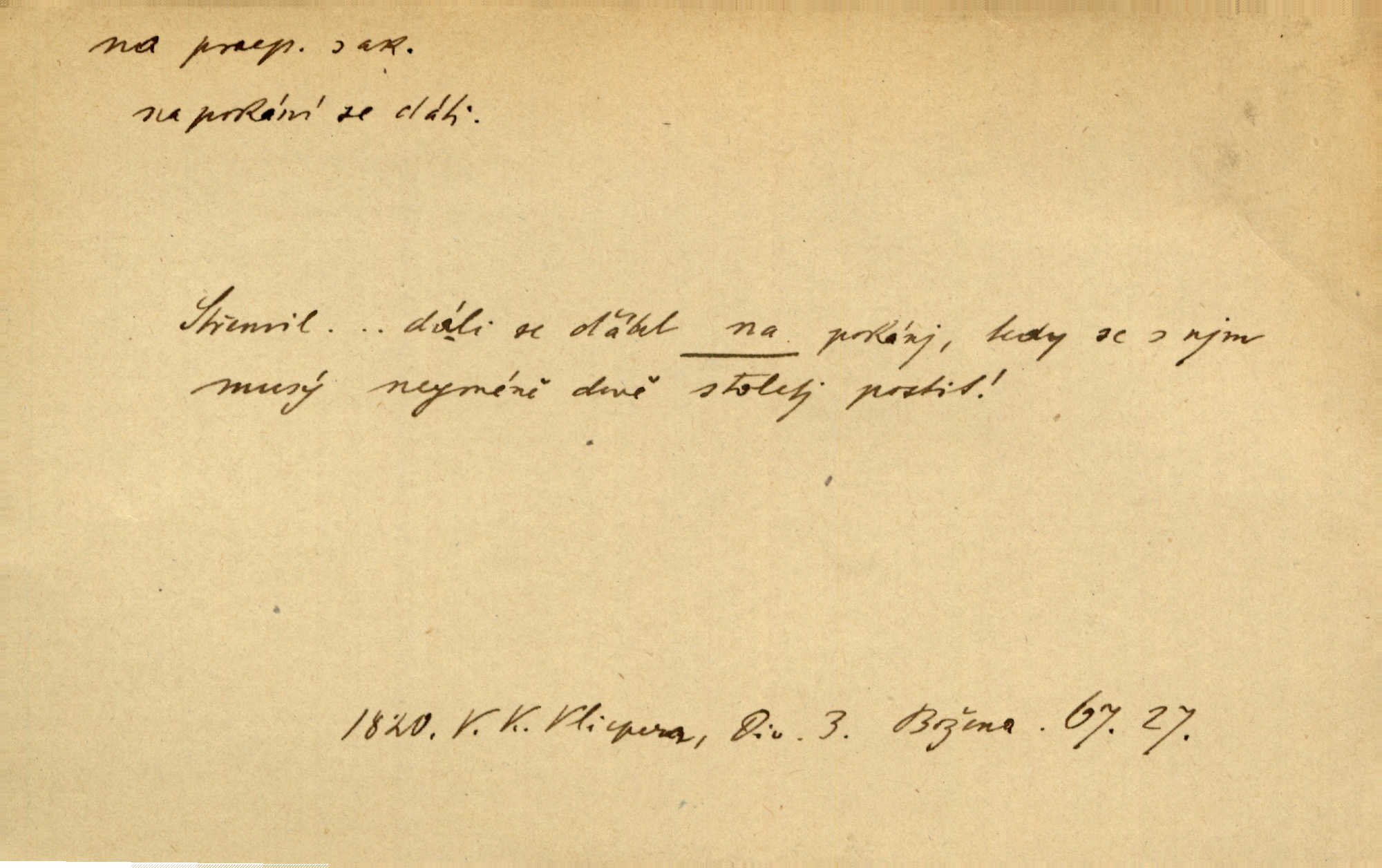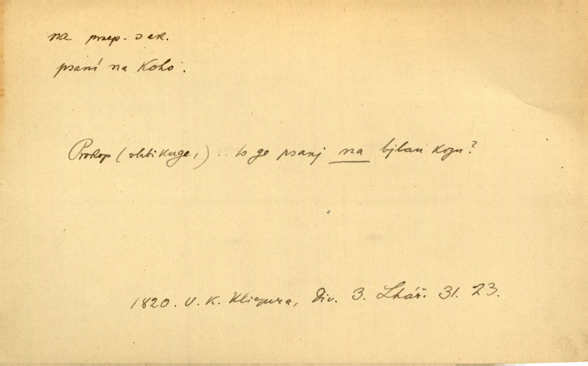 - na předl. s akus. vyjadřuje hořejšek n. povrch věci, osoby a p., ke kterému děj směřuje n. dospívá. Rozložila knihy na stůl. Šmil. Na hráz vystoupila třetí osoba. Šmil. Napsal tužkou něco na papír. Pfleg. Přiklekli na stupeň k oltáři. Šmil. Ubíral se na lože. Baar. Do zbraně! … Známá nota: na koně! na koně! Jir. Vzal pušku na ramena. Šmil. Smála se, když ji vzkřísili a když jí led na hlavu kladli. Zey. Hoši [na pastvě] na hlavy se staví, po rukách chodí. Baar. Vzala Terynku na ruku. Šmil. Padl na kolena. Baar. [Poražený] vezme za trest vítěze na záda. Zey. Ó, bych byl zdráv a na nohy mohl skočiti. Jir. Kůň stál — pouze z nohy na nohu přešlápl. Baar. Křičela, jako když ji na nože bere. Čap. Ch. Zalekla se, jako by někdo strach na ni hodil. Jir. Odpoledne připadl mu Hukal opět na mysl vzpomněl si na něj. Šmil. Musímť hradnímu na srdce vložiti, aby podobných lidí do hradu nepouštěl důtklivě uložiti. Jan. Mraky zoufalosti na mou duši lehnou. Vrch. Kaplan Fabián vzal na se úlohu, již farář naň vznesl ujal se úlohy. Šmil. Brával vždy vinu na sebe a odprošoval ji. Svět. D vyjadřuje zvl. povrch těla při výrazech odívání a podobných. Vzala na sebe, co nejlepšího měla. R. Svob. Šla v střevících na bosou nohu. Jir. Pouto na nohu a na ruku pro toho, kdo několikrát neposlechl. Jir. Mlha brala na se tvar určitý nabývala tvaru. Zey. Domněnky jeho braly na se barvu pravdivosti nabývaly rázu. Šmil. Žárlení vzalo na sebe nebezpečný ráz. Herb. Vybranějšími slovy nápady své pronášela, vážnější tvář na sebe berouc. Sab. D vyjadřuje místo, zvl. zvýšené, k němuž děj směřuje n. dospívá a na němž někdo stane n. spočine. Přiběhli na vrch za městečkem. Šmil. Dochází večer na zahrádku do zahrádky. Jir. Zeď přelezl a stoupal k milé na balkon. Mach. Kristus vstupoval na nebe. Zey. Já šel rovnou na zámek. Jir. Ubíral se na Hradčany na Loretánský plac. Pfleg. Přišel za svým povoláním na Šumavu. Šmil. Odešla na komoru prohlédnout zásoby do komory položené ve vyšším patře. Podl. Chodil někam až na Smíchov. Šim. Už nemám vyjíti v čem na ulici! Mach. Vraceli se na faru. Šmil. [Stařec] vyšel tiše na síň do síně. Jir. Chodila s místa na místo. Pfleg. Chůze se strany na stranu. R. Svob. Sežeňme je [nepřátele] z Malé strany, a pak budeme volni na všechny strany. Jir. Holčička mi zrovna přišla na svět narodila se. R. Svob. Chtěl jsem, než tě pošleme na věčnost, abys měl jasný pojem o věci usmrtíme. R. Svob. Přivedl ji na pravou cestu. Šmil. Vyplaven byl [příběh] z hlubin zapomenutí na povrch. Kronb. D vyjadřuje osobu n. věc, do jejíž těsné blízkosti n. do jejíhož úplného hmotného dotyku něco směřuje n. dospívá. V průjezdu vrazil na faráře. Šmil. Musil dobrou hodinu jíti, než přišel na myslivnu. Třeb. Narazil na stolek a opřel se oň. Šmil. S náprstkem na prstu zasedala na roh stolu a prohlížela proti světlu defektní místa. Šim. Tluče někdo na vrata. Pfleg. Vozy strženy šikem napříč, kolo na kolo, tak že se slily v dlouhou hradbu. Jir. Přitiskla své rty na jeho ústa. Šmil. Promočená košile lepila se na tělo. Baar. Zarazil se. Jako by byla ledová ruka naň sáhla. Šmil. Malovala na chaloupku samá srdce červená. Vrch. Maluj čerta na zeď, a jistě se ti ukáže straš. Paleč. Černé na bílém četl to farář s kazatelny a přibil pak na dveře chrámové. Baar. Příchozí pověsil plášť na kolík na stěně. Jir. Přikázala, ať se dnes nikomu neukazuje na oči nepřichází do styku. Ben. Po celý týden již nevycházel na lidi mezi lidi, do společnosti. Herb. Znamenitý muž postavil se hnutí tomu na čelo do popředí. Win. Srnec postavil se zrovna na ránu do rány. Šmil. Brali si nás jednotlivě na mušku a sestřelovali nás s koní. Baar. Přišla kosa na kámen nepovedlo se. Pořek. D vyjadřuje osoby n. věci, které se k sobě v prostoru n. čase hromadí, čímž se event. děj zesiluje, stupňuje. Všeobecná pokleslost duševní a terorism panujících koterií plodily zlo na zlo. Herb. Rána na ránu, a zvěř prchá. Mácha. [Stařena] udělala kříž, dva, a zase říkala a zase kříž na kříž. Jir. Všechno kvapilo ráz na ráz. Herb. D vyjadřuje hranice, mez, až po kterou něco směřuje. Záclona, splývající až na zem. Jir. Nohavice dosahovaly jen na kotníky. Něm. Na kůži promoklí vraceli se poslové jeden za druhým. Svět. Povýšila [věda] i život praktický na stupeň dříve neznaný. Sab. Pavel hluboký, ve všem dumavý a bádavý až na dno, přemýšlel o své lásce. Pfleg. Portýr se uklonil s onou úsměvnou pokorou, na kterou se za kavalírské zpropitné služebnictvo hostinců vždy sníží. Ner. Bude to trvat rok, než dojde na vdavky. Herrm. Přivedla ji na žebráckou hůl. Hol. Nikdy se mu nedostala [matka] na kůži nevyzrála na něho. Prav. Čekali jsme, až přijdou [vojáci] na dostřel. Dur. Nemíti bystrou ženu, byl by hospodařil s krávy na kozu. Baar. Také na tebe došlo! stihl tě trest. Hol. Podle němč.: Čekali, až přijde na ně řada až na ně dojde. Kronb. D vyjadřuje místo, ke kterému v prostoru něco bez jiných zřetelů směřuje. Odtud jde pěkná pěšinka na východ východním směrem. Pfleg. Slunce se kloní na západ! Vrch. Jel na Bamberg, odtud chtěl přes Cheb do Prahy. Jir. Opustil město, přímo míře na statky otcovy. Pfleg. Na horách nesou se slova lehounce na dálku vzduchem průzračným. R. Svob. Zmítané větrem na všechny směry plynové plameny na rozích blíkaly. Čap. Ch. Proti malým dušičkám, které se na venek původními staví, volejmež jen vždy stigma Kollárovo. Durd. D vyjadřuje vůbec hmotný n. nehmotný cíl, k němuž něco bez jiných zřetelů směřuje. Vyjít si na vzduch. Nechoď na deš