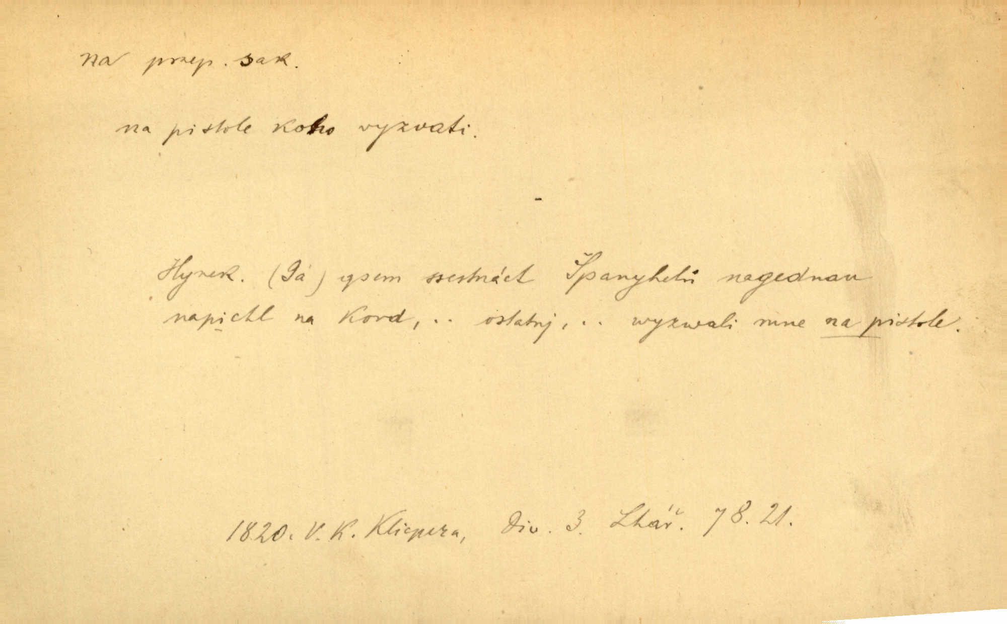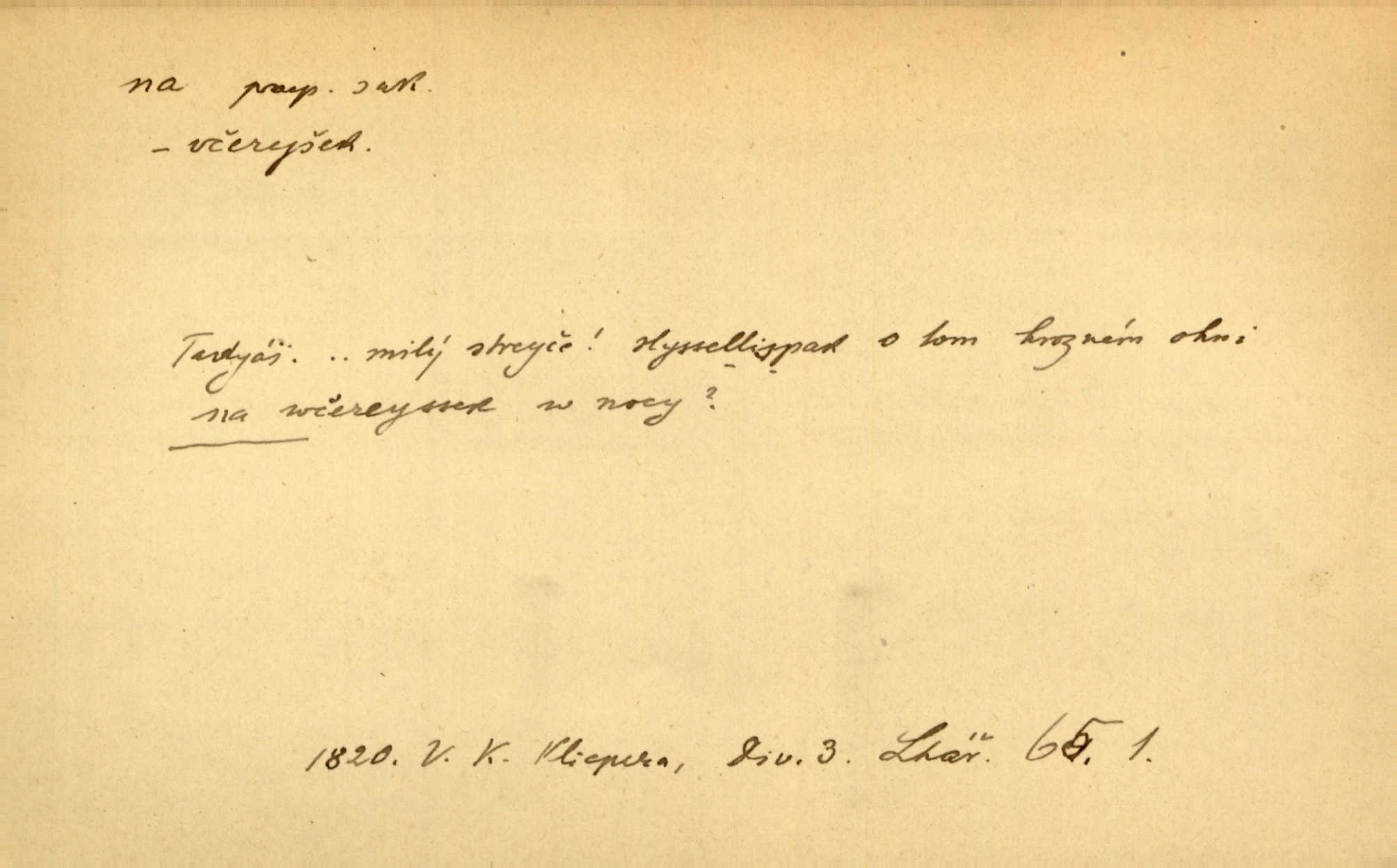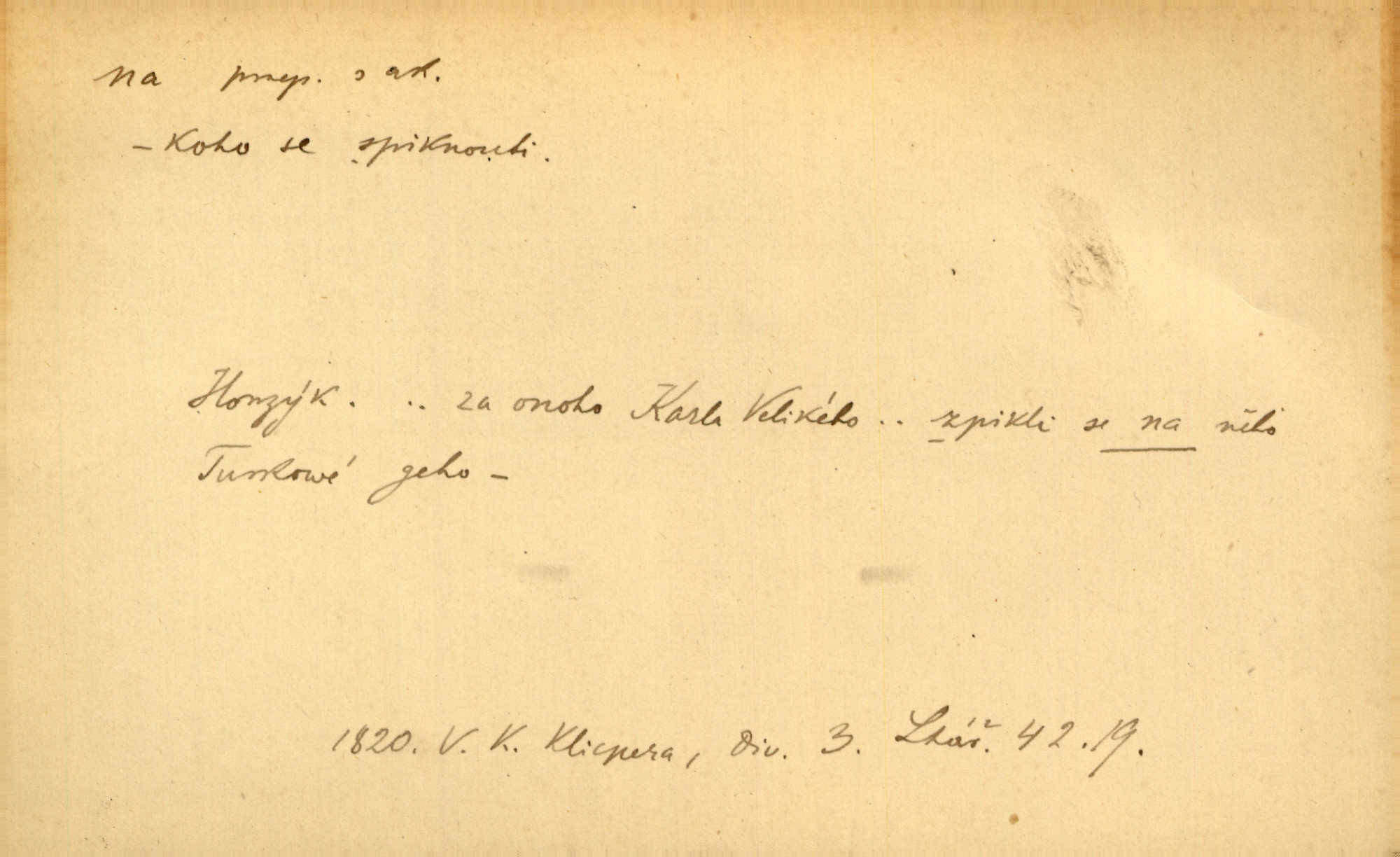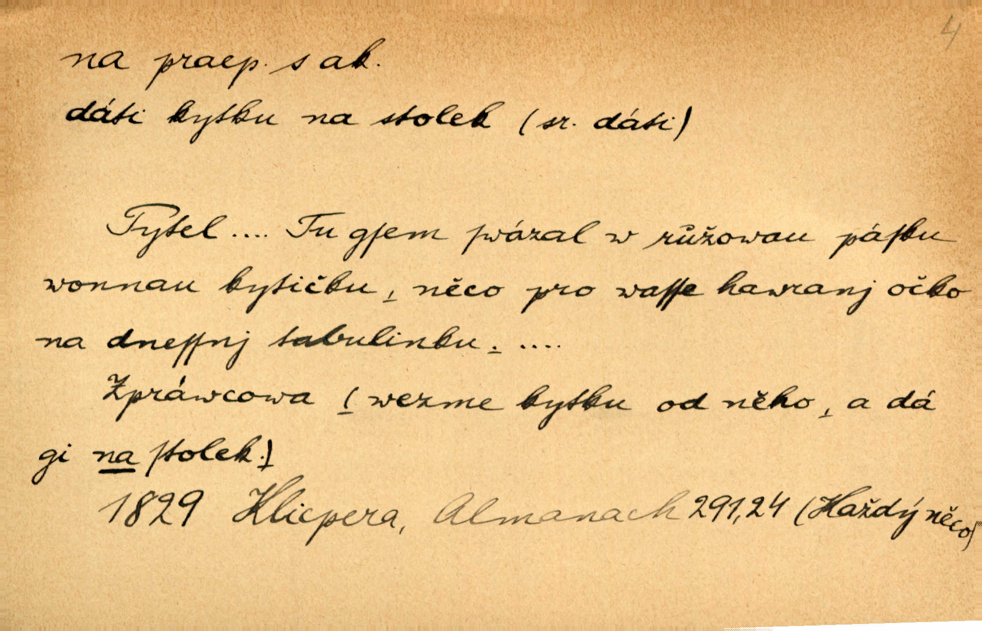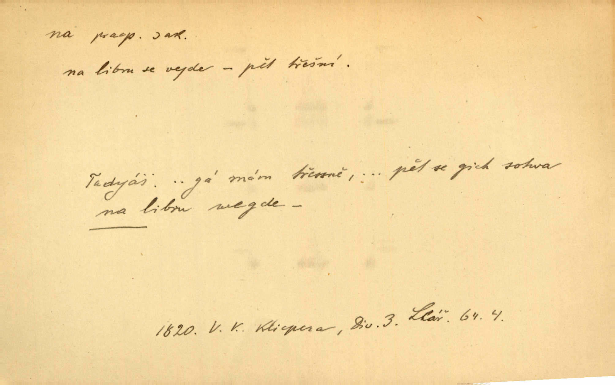 - na předl. s akus. vyjadřuje hořejšek n. povrch věci, osoby a p., ke kterému děj směřuje n. dospívá. Rozložila knihy na stůl. Šmil. Na hráz vystoupila třetí osoba. Šmil. Napsal tužkou něco na papír. Pfleg. Přiklekli na stupeň k oltáři. Šmil. Ubíral se na lože. Baar. Do zbraně! … Známá nota: na koně! na koně! Jir. Vzal pušku na ramena. Šmil. Smála se, když ji vzkřísili a když jí led na hlavu kladli. Zey. Hoši [na pastvě] na hlavy se staví, po rukách chodí. Baar. Vzala Terynku na ruku. Šmil. Padl na kolena. Baar. [Poražený] vezme za trest vítěze na záda. Zey. Ó, bych byl zdráv a na nohy mohl skočiti. Jir. Kůň stál — pouze z nohy na nohu přešlápl. Baar. Křičela, jako když ji na nože bere. Čap. Ch. Zalekla se, jako by někdo strach na ni hodil. Jir. Odpoledne připadl mu Hukal opět na mysl vzpomněl si na něj. Šmil. Musímť hradnímu na srdce vložiti, aby podobných lidí do hradu nepouštěl důtklivě uložiti. Jan. Mraky zoufalosti na mou duši lehnou. Vrch. Kaplan Fabián vzal na se úlohu, již farář naň vznesl ujal se úlohy. Šmil. Brával vždy vinu na sebe a odprošoval ji. Svět. D vyjadřuje zvl. povrch těla při výrazech odívání a podobných. Vzala na sebe, co nejlepšího měla. R. Svob. Šla v střevících na bosou nohu. Jir. Pouto na nohu a na ruku pro toho, kdo několikrát neposlechl. Jir. Mlha brala na se tvar určitý nabývala tvaru. Zey. Domněnky jeho braly na se barvu pravdivosti nabývaly rázu. Šmil. Žárlení vzalo na sebe nebezpečný ráz. Herb. Vybranějšími slovy nápady své pronášela, vážnější tvář na sebe berouc. Sab. D vyjadřuje místo, zvl. zvýšené, k němuž děj směřuje n. dospívá a na němž někdo stane n. spočine. Přiběhli na vrch za městečkem. Šmil. Dochází večer na zahrádku do zahrádky. Jir. Zeď přelezl a stoupal k milé na balkon. Mach. Kristus vstupoval na nebe. Zey. Já šel rovnou na zámek. Jir. Ubíral se na Hradčany na Loretánský plac. Pfleg. Přišel za svým povoláním na Šumavu. Šmil. Odešla na komoru prohlédnout zásoby do komory položené ve vyšším patře. Podl. Chodil někam až na Smíchov. Šim. Už nemám vyjíti v čem na ulici! Mach. Vraceli se na faru. Šmil. [Stařec] vyšel tiše na síň do síně. Jir. Chodila s místa na místo. Pfleg. Chůze se strany na stranu. R. Svob. Sežeňme je [nepřátele] z Malé strany, a pak budeme volni na všechny strany. Jir. Holčička mi zrovna přišla na svět narodila se. R. Svob. Chtěl jsem, než tě pošleme na věčnost, abys měl jasný pojem o věci usmrtíme. R. Svob. Přivedl ji na pravou cestu. Šmil. Vyplaven byl [příběh] z hlubin zapomenutí na povrch. Kronb. D vyjadřuje osobu n. věc, do jejíž těsné blízkosti n. do jejíhož úplného hmotného dotyku něco směřuje n. dospívá. V průjezdu vrazil na faráře. Šmil. Musil dobrou hodinu jíti, než přišel na myslivnu. Třeb. Narazil na stolek a opřel se oň. Šmil. S náprstkem na prstu zasedala na roh stolu a prohlížela proti světlu defektní místa. Šim. Tluče někdo na vrata. Pfleg. Vozy strženy šikem napříč, kolo na kolo, tak že se slily v dlouhou hradbu. Jir. Přitiskla své rty na jeho ústa. Šmil. Promočená košile lepila se na tělo. Baar. Zarazil se. Jako by byla ledová ruka naň sáhla. Šmil. Malovala na chaloupku samá srdce červená. Vrch. Maluj čerta na zeď, a jistě se ti ukáže straš. Paleč. Černé na bílém četl to farář s kazatelny a přibil pak na dveře chrámové. Baar. Příchozí pověsil plášť na kolík na stěně. Jir. Přikázala, ať se dnes nikomu neukazuje na oči nepřichází do styku. Ben. Po celý týden již nevycházel na lidi mezi lidi, do společnosti. Herb. Znamenitý muž postavil se hnutí tomu na čelo do popředí. Win. Srnec postavil se zrovna na ránu do rány. Šmil. Brali si nás jednotlivě na mušku a sestřelovali nás s koní. Baar. Přišla kosa na kámen nepovedlo se. Pořek. D vyjadřuje osoby n. věci, které se k sobě v prostoru n. čase hromadí, čímž se event. děj zesiluje, stupňuje. Všeobecná pokleslost duševní a terorism panujících koterií plodily zlo na zlo. Herb. Rána na ránu, a zvěř prchá. Mácha. [Stařena] udělala kříž, dva, a zase říkala a zase kříž na kříž. Jir. Všechno kvapilo ráz na ráz. Herb. D vyjadřuje hranice, mez, až po kterou něco směřuje. Záclona, splývající až na zem. Jir. Nohavice dosahovaly jen na kotníky. Něm. Na kůži promoklí vraceli se poslové jeden za druhým. Svět. Povýšila [věda] i život praktický na stupeň dříve neznaný. Sab. Pavel hluboký, ve všem dumavý a bádavý až na dno, přemýšlel o své lásce. Pfleg. Portýr se uklonil s onou úsměvnou pokorou, na kterou se za kavalírské zpropitné služebnictvo hostinců vždy sníží. Ner. Bude to trvat rok, než dojde na vdavky. Herrm. Přivedla ji na žebráckou hůl. Hol. Nikdy se mu nedostala [matka] na kůži nevyzrála na něho. Prav. Čekali jsme, až přijdou [vojáci] na dostřel. Dur. Nemíti bystrou ženu, byl by hospodařil s krávy na kozu. Baar. Také na tebe došlo! stihl tě trest. Hol. Podle němč.: Čekali, až přijde na ně řada až na ně dojde. Kronb. D vyjadřuje místo, ke kterému v prostoru něco bez jiných zřetelů směřuje. Odtud jde pěkná pěšinka na východ východním směrem. Pfleg. Slunce se kloní na západ! Vrch. Jel na Bamberg, odtud chtěl přes Cheb do Prahy. Jir. Opustil město, přímo míře na statky otcovy. Pfleg. Na horách nesou se slova lehounce na dálku vzduchem průzračným. R. Svob. Zmítané větrem na všechny směry plynové plameny na rozích blíkaly. Čap. Ch. Proti malým dušičkám, které se na venek původními staví, volejmež jen vždy stigma Kollárovo. Durd. D vyjadřuje vůbec hmotný n. nehmotný cíl, k němuž něco bez jiných zřetelů směřuje. Vyjít si na vzduch. Nechoď na deš