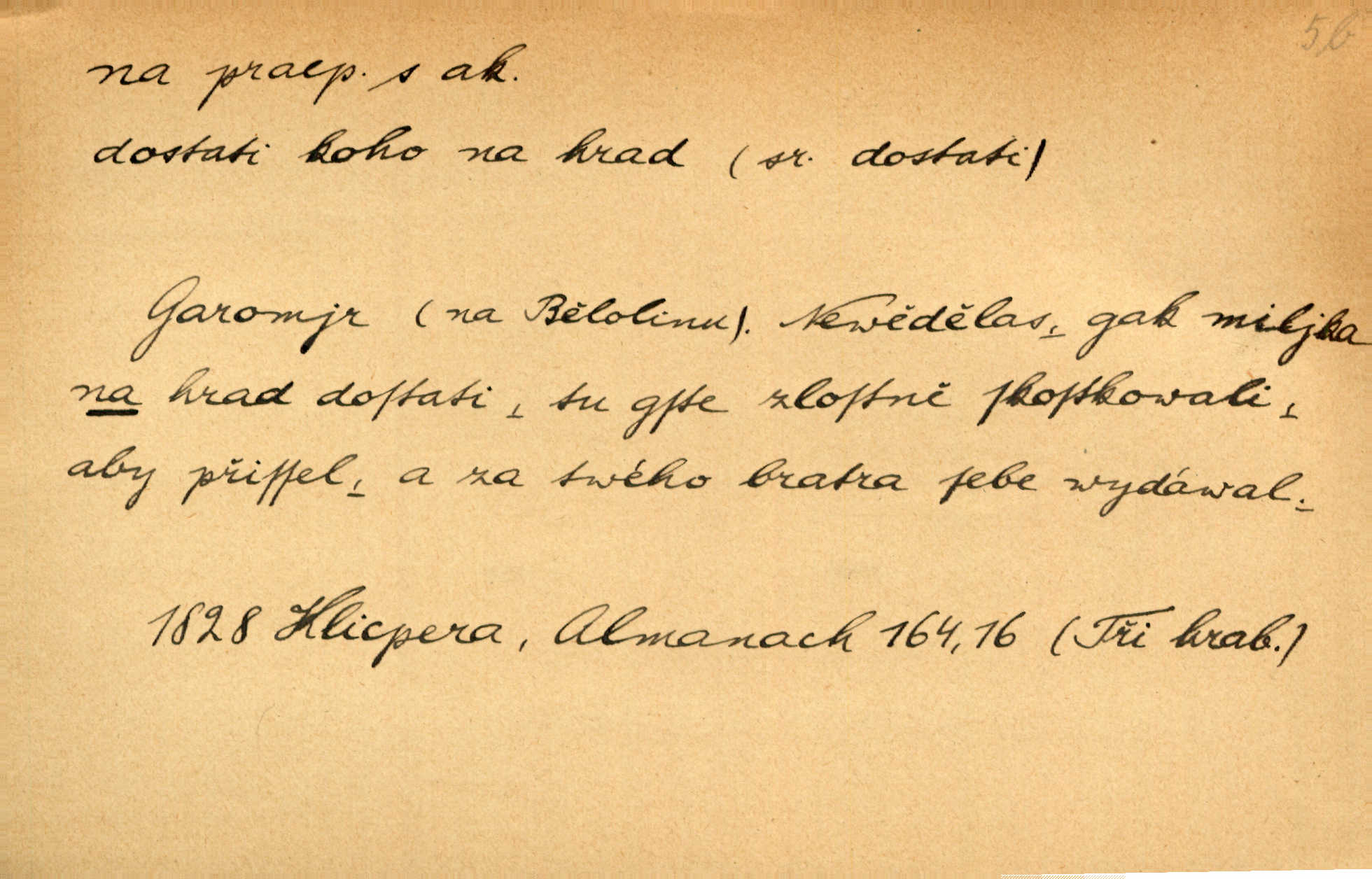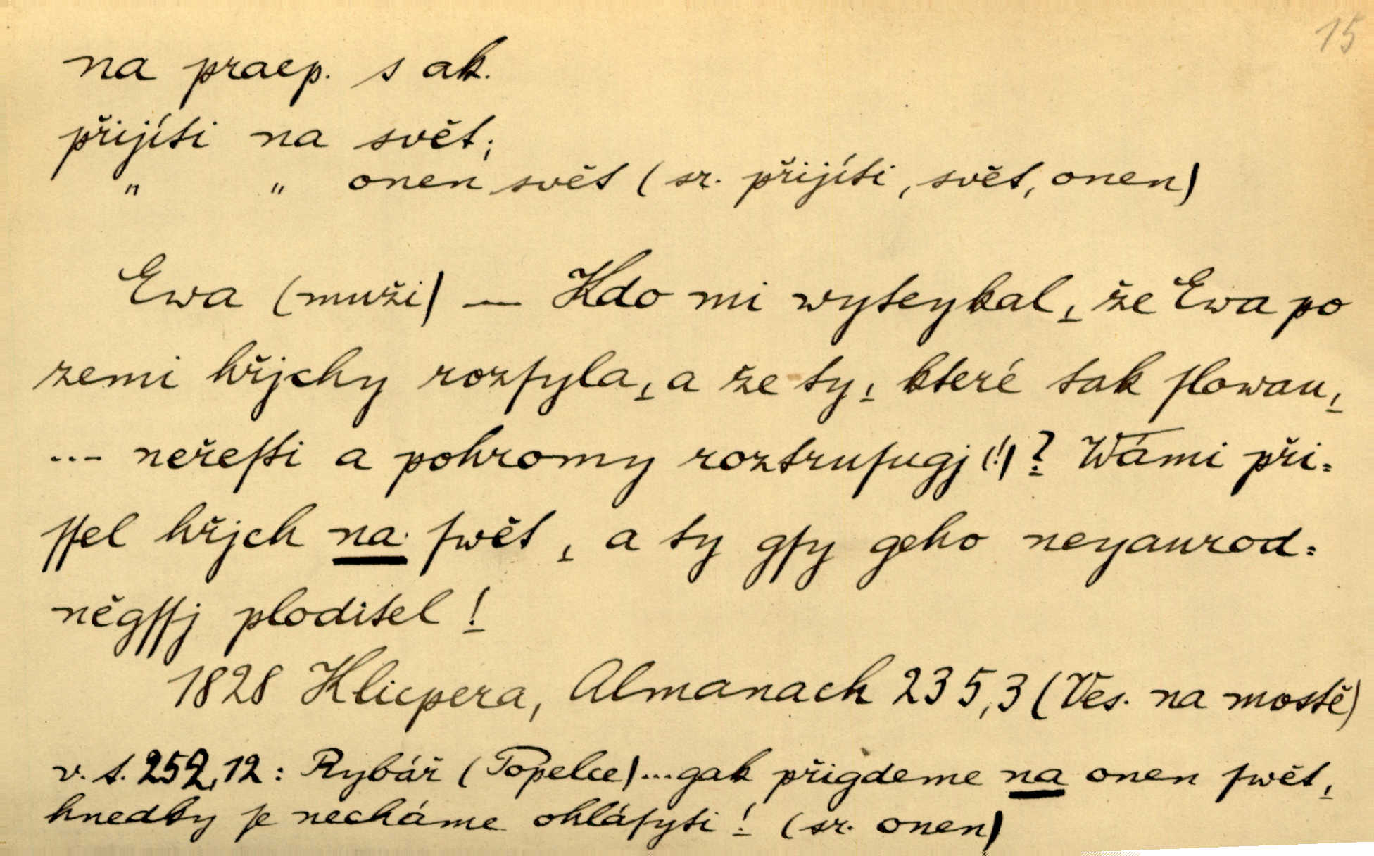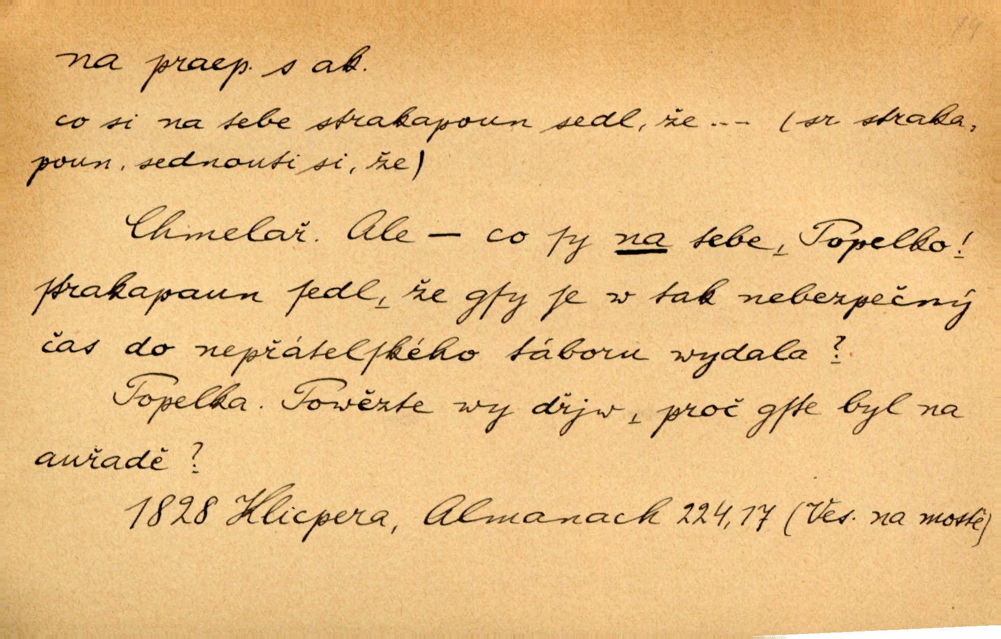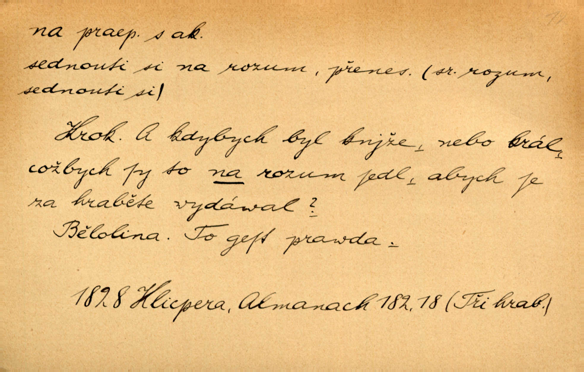 - na 2. citosl. dial. v německém prostředí no, nuže. „Na!“ vykřik kočí, komoň frká, a juž kola hrčí. Heyd. Vyšinul se na kůň, zavolal: „Šimla, na!“ Kosm. Ah — tady je pěkně, na, však nemusíme odtud pospíchat. Jir. Na, ve Zdicích bude Suchářípa hned po poledni. Čap. Ch.