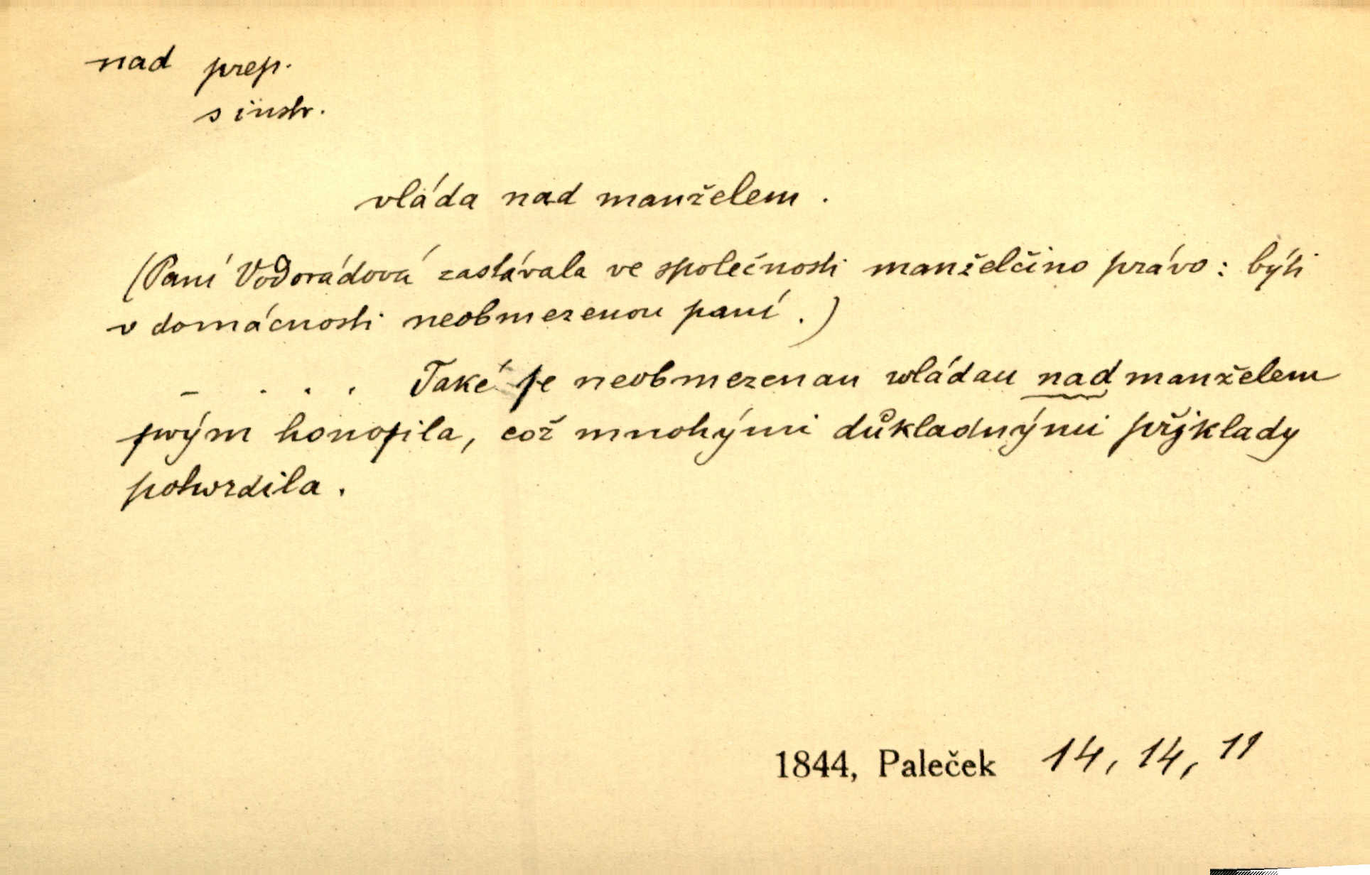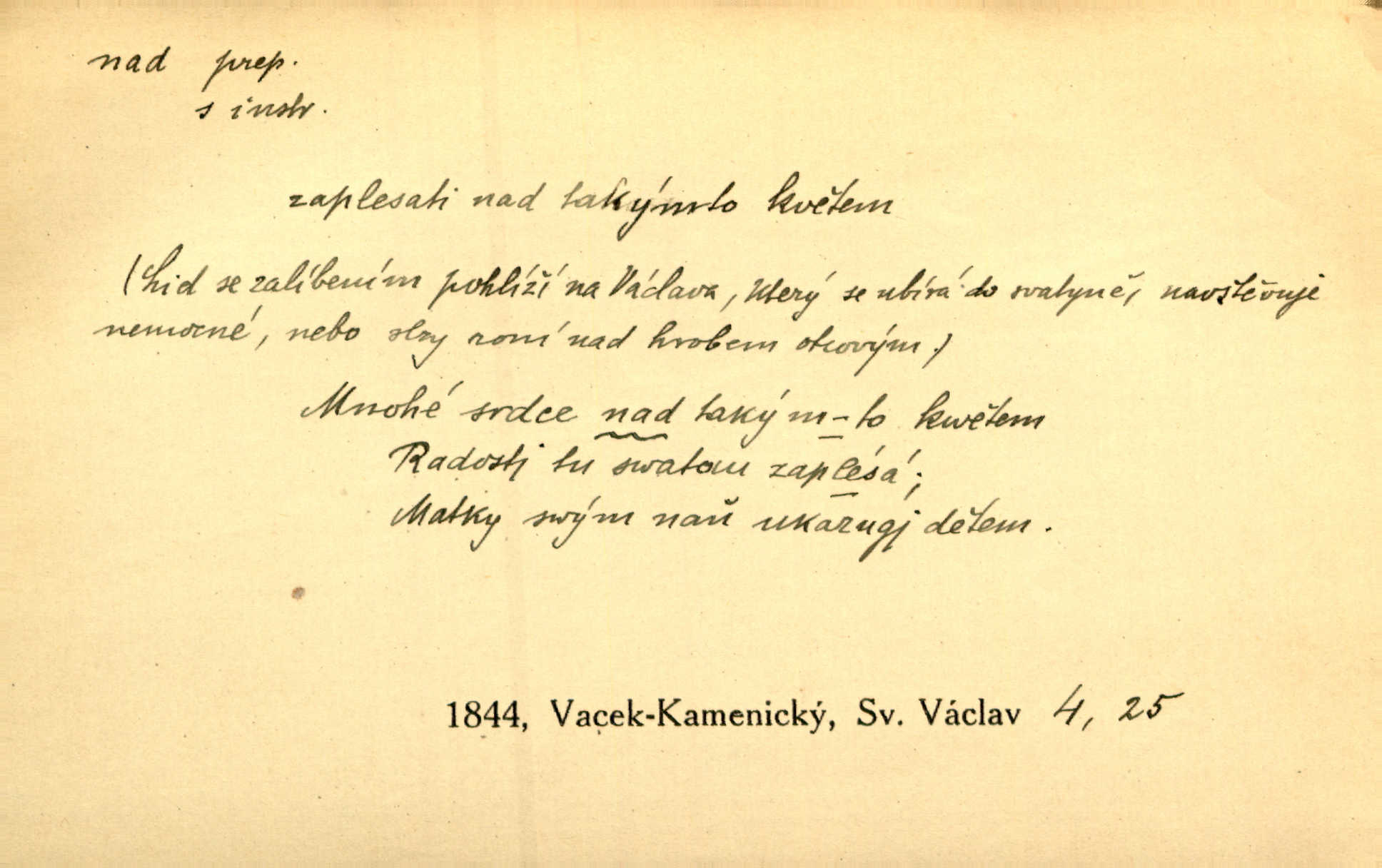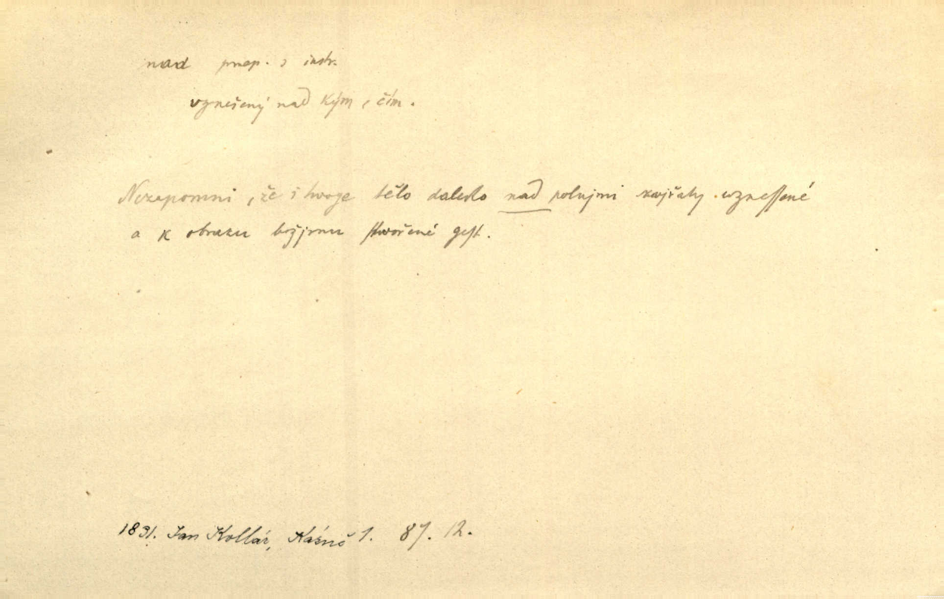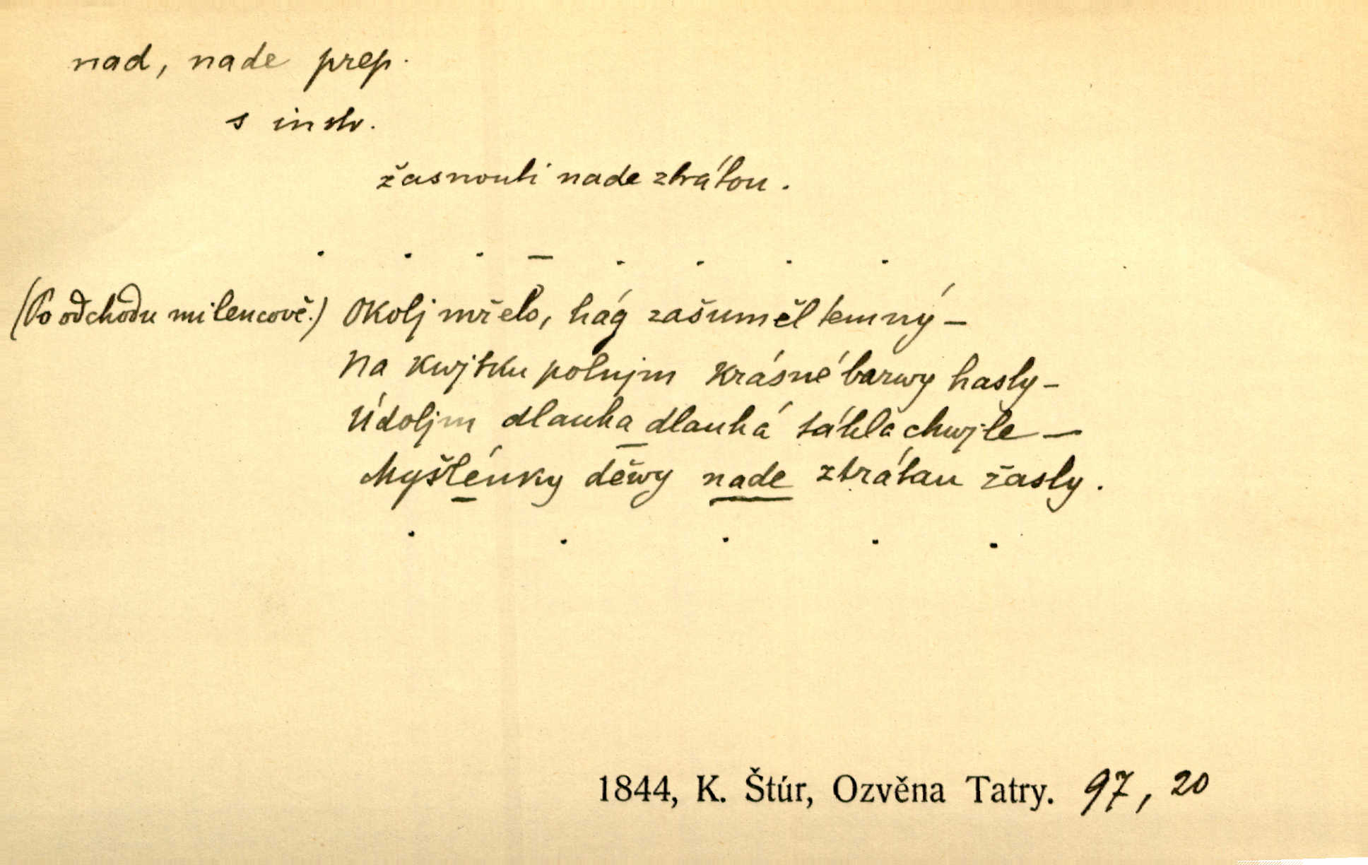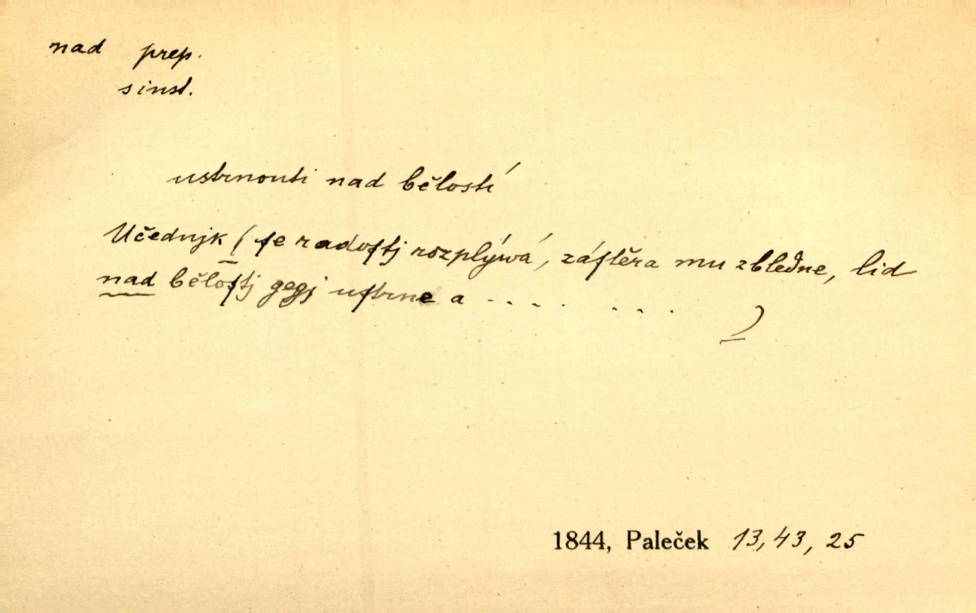 - nad předl. s akus. vyjadřuje místo položené výše než někdo n. něco, k němuž děj nějaký směřuje. Slunce vyšlo nad horu. Čel. Vynořila se nad houštinu hlava s mocnýma parohama. Jir. Jeho vysoká postava vyniká nad všechny ostatní. Něm. Nahnula se nad jeho obličej. Něm. Rybičky vyskakovaly nad vodu. Prav. Nad dědinu snášel se vlažný večer. Herb. Pod kolenama až nad lejtka leskly se mu bílé punčochy. Tyl. Venku je bláta nad kotníky! Rub. Ruce, až nad loket obnažené. Šim. Nenosil tak vysoké boty až nad kolena. Něm. Stárneme, děti nám rostou nad hlavu vymaňují se z našeho vlivu. Čap. Ch. Když ono, pane, je té práce u nás až nad hlavu přespříliš. Rais. D vyjadřuje to, co je n. není předstihováno, předstiženo, překonáno něčím jiným. Ujímati se vdov a sirotků — to je skutek nad všeliké dobré skutky. Baar. Dobrá rada nad zlato. Přísl. On je vám chytrý nad žida. Něm. Mijoval ji vášnivě, nad Márinku nebylo. Štol. Tvá žena že je nad mou, ty kluku? Kosm. Nad vás není, slečno Viki — v celé Praze by druhou takovou hospodyni nenašel. Šim. Básník byl v něm [Stendhalovi] nad psychologa. Šal. Říkávají, že nebývá nad lásku mateřskou a nad péči otcovskou! Třeb. Odvětila tónem, z něhož vyznívalo, že je daleko povýšena nad všechny narážky. Šim. Chleba tvrdší nad oblásky. Ner. Věci nad slunce jasnější nesměly být vyslovovány. Herb. Vám, dětí našich milé pěstitelky, dán úkol krásný a nad jiné velký. Ner. Není pod sluncem tvora podlejšího nad člověka. Bozd. Můj starý přítel, nade všechny milovaný. Us. Bývala [dcera] otci nade všecko drahá. Svět. [Domek] svým zevnějškem nad jiné vynikal. Jir. Nevypínali se jeden nad druhého. Prav. V trpělivosti předčí [lid český] i nad samy mravence. Šmil. Tvoje ústa malá voní nad jabloně květ. Čech. Křičel chraptivě nad síly svých hlasivek. R. Svob. Já musel pořád žít nad své poměry nákladněji, než postavení dovolovalo. Čap. Paní Johanka nad slušnosť a míru rozhazovala více, než se slušelo a patřilo. Šmil. Rány hojily se nad očekávání rychle nezvykle, neobyčejně. Jir. Nad pomyšlení rozveselen svolal všecku čeleď. Ehrenb. Ulice oživly již za té ranní doby nad obyčej neobyčejně. Jir. Že se řádně zmácháte, jest nade vši pochybnost nepochybné. Ehrenb. Častěji sem chodil a nad potřebu dlouho tu prodléval zbytečně. Vrba. D s opakovaným substantivem vyjadřuje zesilování, stupňování. Div nad div! Verunka pronesla jen několik slov, ale ta slova zaryla se mu do duše. Šmil. Zmatek nad zmatek vládne v jeho [lidstva] hlavách. Baar. Marnosť nad marnosť, všecko je marnosť. Vrch. No je to radost nad radost. Ner. Psávaly jsme nesmysly nad nesmysly. Krás. Jsem konečně i sobec nad sobce, který by rád se něčeho dobádal. Kos. D nad to připojuje (často s důrazem) k tomu, co již bylo řečeno, něco nového. Nestačil svou pravicí, aby odnesl těžkého muže ve zbroji a nad to bez vlády omdlelého. Jir. Vedl si vesele, miloval zábavy i společnost. Nad to byl postavy krásné. Jir. [Hoch] nemá schopností a je nad to ještě darebákem. Ner. D Dial. nad lidi mezi lidi, před lidmi. Všímám si jenom svého, nikam nad lidi nevyjdu. Rais. Nemusíme to snad o polednách nade všecky lidi odnášet, brousí to pak po člověku a pomlouvají. Rais. Já mu do ničeho mluvit nesmím, protože potom spustí nad lidi a je mi hanba. Rais. D předl. s instr. vyjadřuje místo položené směrem vzhůru od někoho n. od něčeho, na němž něco je n. se děje. A lampa ještě hořela, co nad klekadlem visela. Erb. Povstala, spráskla ruce nad hlavou. Čap. Ch. Konci prstů přejížděla po vlasech nad skráněmi. Šim. Mysli se nejvýš — a nad tebou hvězd jako vřesných zvonců. Ner. Obloha nad západem zeleněla. Mrš. Nad sněhem juž první skřivan zpíval. Vrch. Chef nad rozloženými plány vykládal o turbině. Čap. Ch. Protrhl se rybník, co byl výše nad vesnicí. Jir. Nad Otavou leží z větších měst také ještě Horažďovice, Sušice, Písek při Otavě. Šim. Geom. opsati kružnici nad průměrem tak ji nakresliti, že daná úsečka se stane průměrem kružnice. D vyjadřuje osobu n. věc podléhající vlivu, převaze, moci, právu někoho n. něčeho. Vždyť nemusí našinec nad sebou chefa trpěti. Krás. Klidně chci očekávat, jakkoli nebe nade mnou rozhodne. Zey. Odpoledne už zase stál nad lidmi v kamenných lomech dozíral. A. Mrš. Jak bůh nade mnou, čirou mluvím pravdu. Šmil. Vyniká [rek] nad ostatní silou. Durd. Ctibor silou svojí zvítězil nad jedním německým rytířem, nad kterým nikdo zvítězit nemohl. Něm. Nabyv ledové chladnosti, dovedl jí vládnouti nad jinými. Pfleg. Bystré oko lesníkovo nad lesy bdíti počalo. Lum. Nikdo nežárlil, že jemu nebylo svěřeno poručnictví nad Mařenkou. Podl. Nakupování, vaření, rozdělování — nad tím jsem já zas ministr to mám na péči, to mně přísluší. Šim. D s opakovaným substativem vyjadřuje zesilování, stupňování. Což dím, ó marnost nad marností! Jg. Máme místo konstituce zmatek nad zmatkem. Havl. D vyjadřuje příčinu duševního, zejm. citového rozpoložení. Radost nad shledáním dvou milých jí lidí popoháněla ji [babičku] tam. Něm. Otázal se hlasem, nad nímž jej sama zamrazilo. Čap. Ch. Utrápil se nad darebným synem. Ner. My nad ní [dcerou] starostí sešedivíme! R. Svob. Kdo se neslituje nad dítětem, není dětí hoden. Hál. Když je [lívanečky] přinášela, strnul jsem nad jejich množstvím. Šim. Obec se sama nad sebou zapomíná — a jako žebráci o almužnu se sváříte. Baar. Zadumal se nad tím slovem. Zey. Sám pánbůh blažen se nad námi usmíval. Ner.