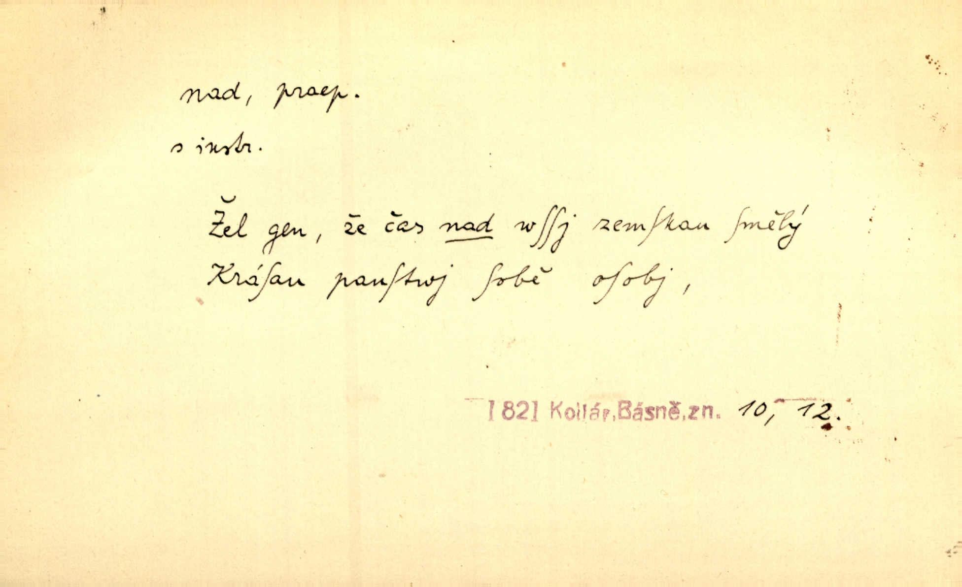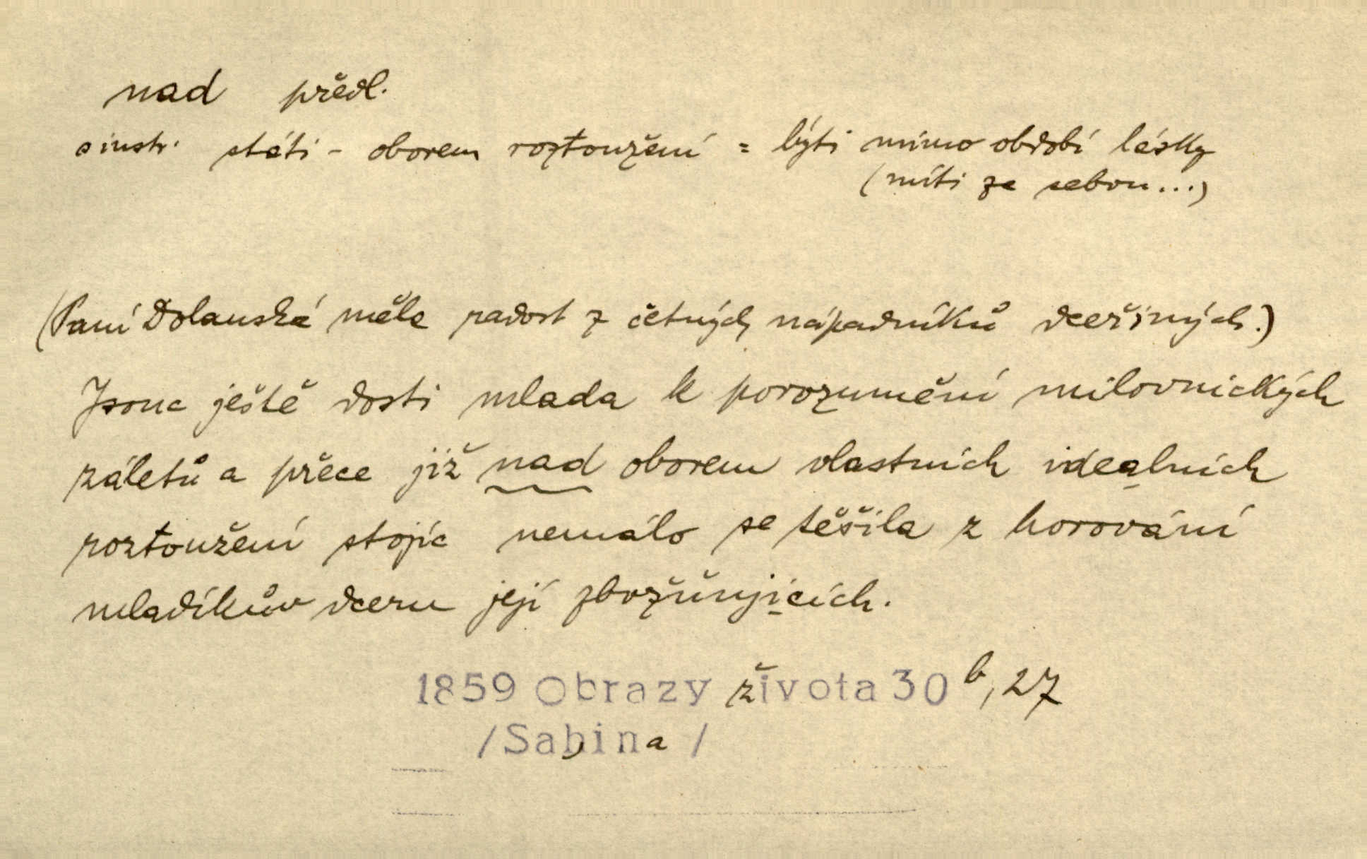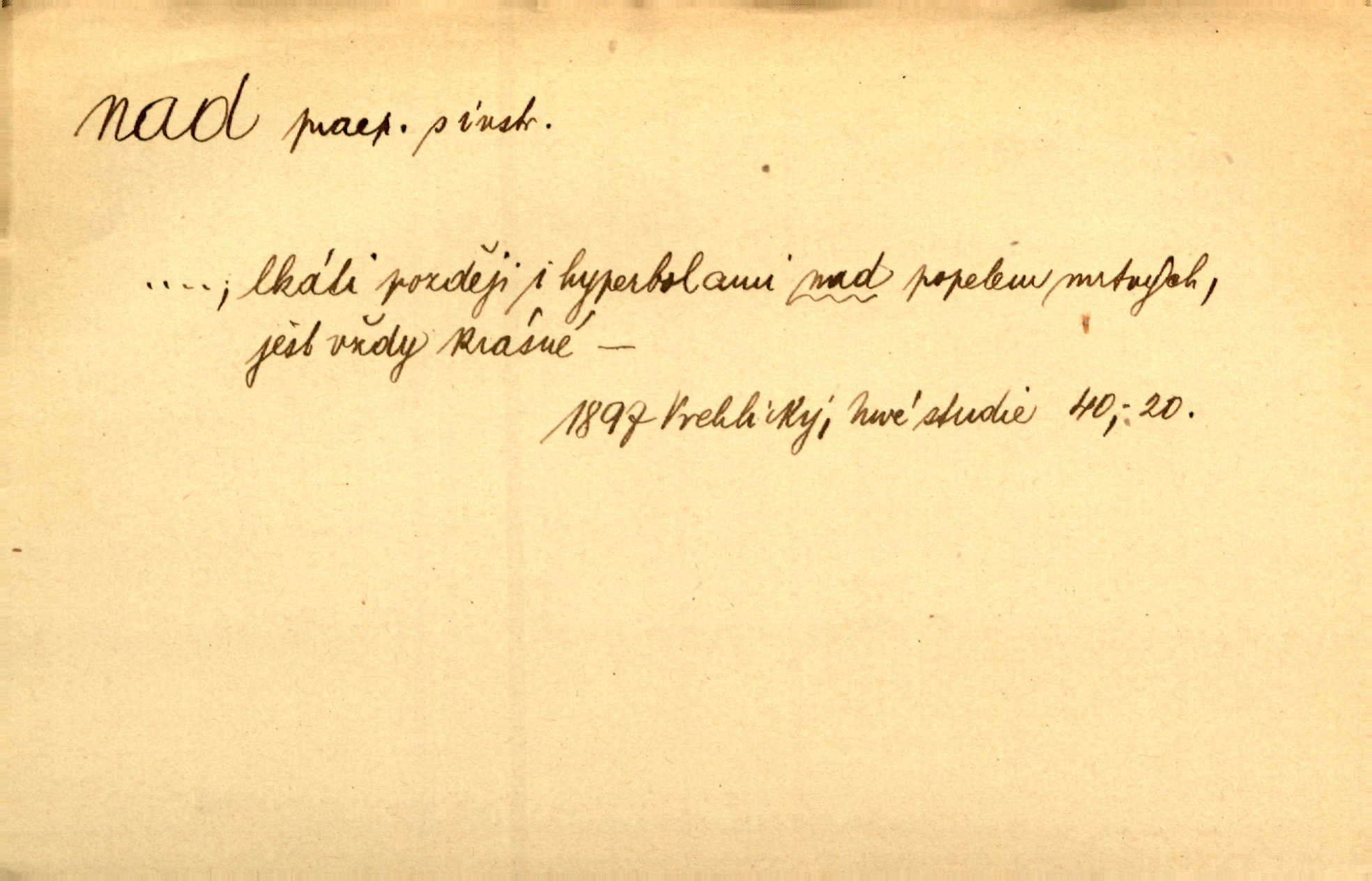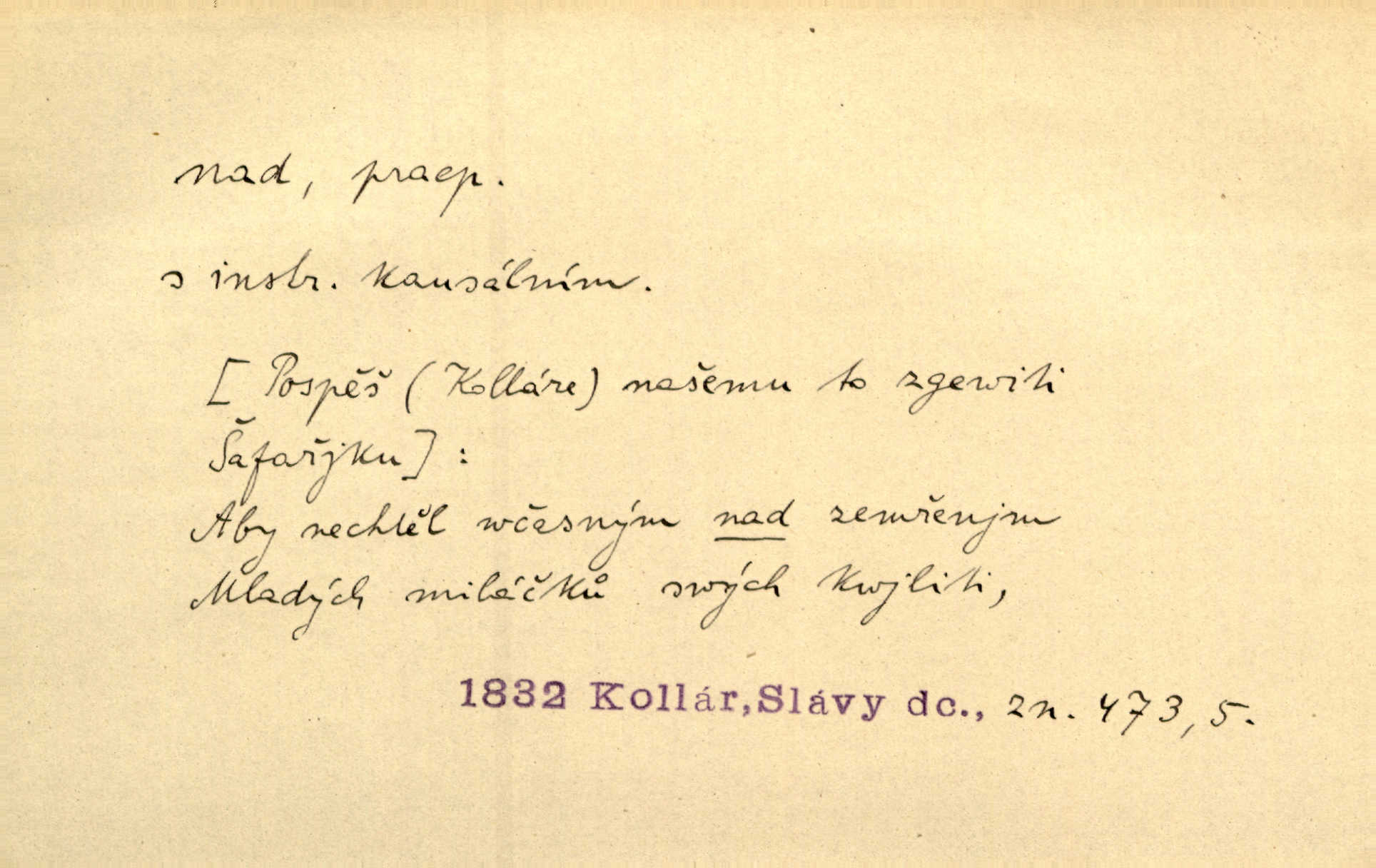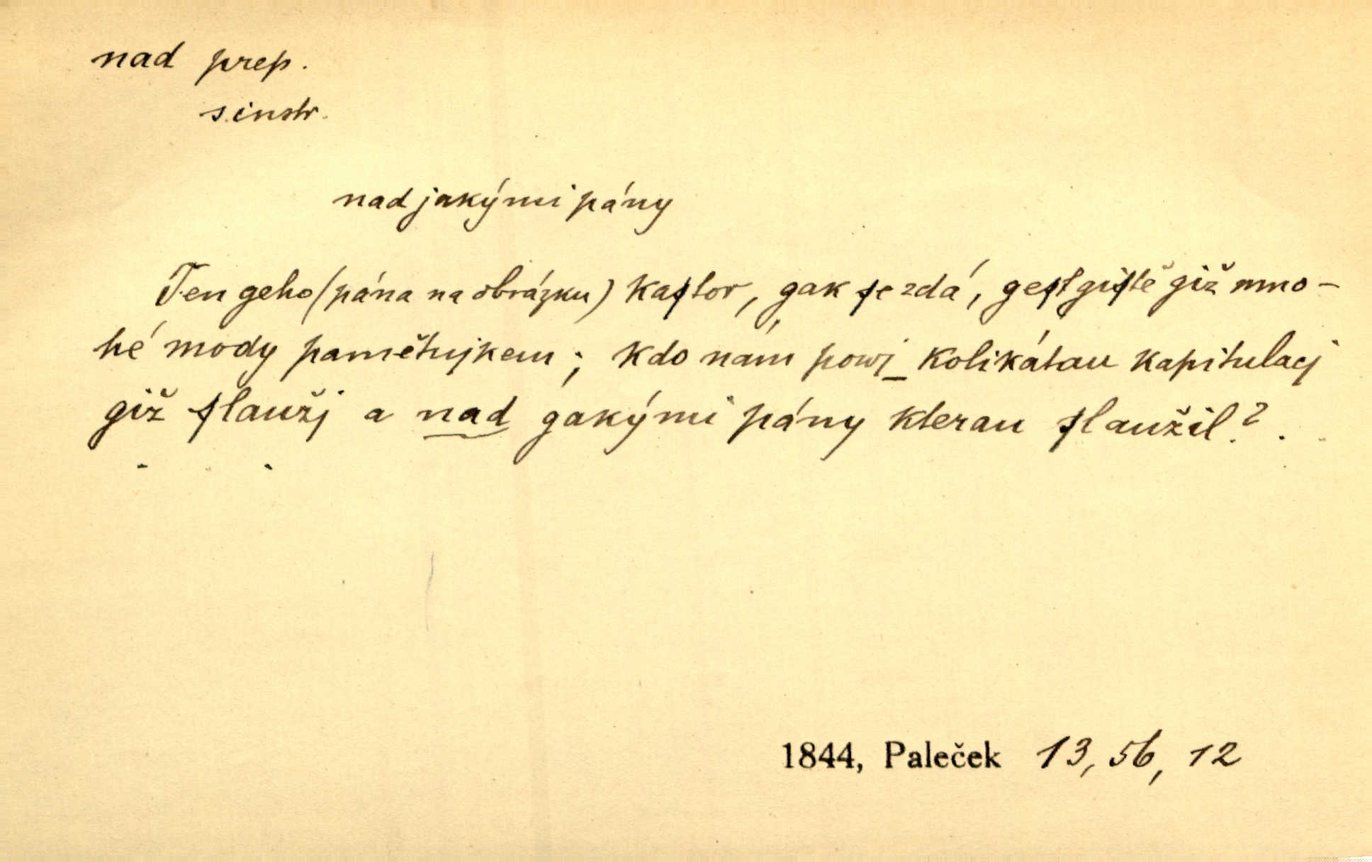 - nad předl. s akus. vyjadřuje místo položené výše než někdo n. něco, k němuž děj nějaký směřuje. Slunce vyšlo nad horu. Čel. Vynořila se nad houštinu hlava s mocnýma parohama. Jir. Jeho vysoká postava vyniká nad všechny ostatní. Něm. Nahnula se nad jeho obličej. Něm. Rybičky vyskakovaly nad vodu. Prav. Nad dědinu snášel se vlažný večer. Herb. Pod kolenama až nad lejtka leskly se mu bílé punčochy. Tyl. Venku je bláta nad kotníky! Rub. Ruce, až nad loket obnažené. Šim. Nenosil tak vysoké boty až nad kolena. Něm. Stárneme, děti nám rostou nad hlavu vymaňují se z našeho vlivu. Čap. Ch. Když ono, pane, je té práce u nás až nad hlavu přespříliš. Rais. D vyjadřuje to, co je n. není předstihováno, předstiženo, překonáno něčím jiným. Ujímati se vdov a sirotků — to je skutek nad všeliké dobré skutky. Baar. Dobrá rada nad zlato. Přísl. On je vám chytrý nad žida. Něm. Mijoval ji vášnivě, nad Márinku nebylo. Štol. Tvá žena že je nad mou, ty kluku? Kosm. Nad vás není, slečno Viki — v celé Praze by druhou takovou hospodyni nenašel. Šim. Básník byl v něm [Stendhalovi] nad psychologa. Šal. Říkávají, že nebývá nad lásku mateřskou a nad péči otcovskou! Třeb. Odvětila tónem, z něhož vyznívalo, že je daleko povýšena nad všechny narážky. Šim. Chleba tvrdší nad oblásky. Ner. Věci nad slunce jasnější nesměly být vyslovovány. Herb. Vám, dětí našich milé pěstitelky, dán úkol krásný a nad jiné velký. Ner. Není pod sluncem tvora podlejšího nad člověka. Bozd. Můj starý přítel, nade všechny milovaný. Us. Bývala [dcera] otci nade všecko drahá. Svět. [Domek] svým zevnějškem nad jiné vynikal. Jir. Nevypínali se jeden nad druhého. Prav. V trpělivosti předčí [lid český] i nad samy mravence. Šmil. Tvoje ústa malá voní nad jabloně květ. Čech. Křičel chraptivě nad síly svých hlasivek. R. Svob. Já musel pořád žít nad své poměry nákladněji, než postavení dovolovalo. Čap. Paní Johanka nad slušnosť a míru rozhazovala více, než se slušelo a patřilo. Šmil. Rány hojily se nad očekávání rychle nezvykle, neobyčejně. Jir. Nad pomyšlení rozveselen svolal všecku čeleď. Ehrenb. Ulice oživly již za té ranní doby nad obyčej neobyčejně. Jir. Že se řádně zmácháte, jest nade vši pochybnost nepochybné. Ehrenb. Častěji sem chodil a nad potřebu dlouho tu prodléval zbytečně. Vrba. D s opakovaným substantivem vyjadřuje zesilování, stupňování. Div nad div! Verunka pronesla jen několik slov, ale ta slova zaryla se mu do duše. Šmil. Zmatek nad zmatek vládne v jeho [lidstva] hlavách. Baar. Marnosť nad marnosť, všecko je marnosť. Vrch. No je to radost nad radost. Ner. Psávaly jsme nesmysly nad nesmysly. Krás. Jsem konečně i sobec nad sobce, který by rád se něčeho dobádal. Kos. D nad to připojuje (často s důrazem) k tomu, co již bylo řečeno, něco nového. Nestačil svou pravicí, aby odnesl těžkého muže ve zbroji a nad to bez vlády omdlelého. Jir. Vedl si vesele, miloval zábavy i společnost. Nad to byl postavy krásné. Jir. [Hoch] nemá schopností a je nad to ještě darebákem. Ner. D Dial. nad lidi mezi lidi, před lidmi. Všímám si jenom svého, nikam nad lidi nevyjdu. Rais. Nemusíme to snad o polednách nade všecky lidi odnášet, brousí to pak po člověku a pomlouvají. Rais. Já mu do ničeho mluvit nesmím, protože potom spustí nad lidi a je mi hanba. Rais. D předl. s instr. vyjadřuje místo položené směrem vzhůru od někoho n. od něčeho, na němž něco je n. se děje. A lampa ještě hořela, co nad klekadlem visela. Erb. Povstala, spráskla ruce nad hlavou. Čap. Ch. Konci prstů přejížděla po vlasech nad skráněmi. Šim. Mysli se nejvýš — a nad tebou hvězd jako vřesných zvonců. Ner. Obloha nad západem zeleněla. Mrš. Nad sněhem juž první skřivan zpíval. Vrch. Chef nad rozloženými plány vykládal o turbině. Čap. Ch. Protrhl se rybník, co byl výše nad vesnicí. Jir. Nad Otavou leží z větších měst také ještě Horažďovice, Sušice, Písek při Otavě. Šim. Geom. opsati kružnici nad průměrem tak ji nakresliti, že daná úsečka se stane průměrem kružnice. D vyjadřuje osobu n. věc podléhající vlivu, převaze, moci, právu někoho n. něčeho. Vždyť nemusí našinec nad sebou chefa trpěti. Krás. Klidně chci očekávat, jakkoli nebe nade mnou rozhodne. Zey. Odpoledne už zase stál nad lidmi v kamenných lomech dozíral. A. Mrš. Jak bůh nade mnou, čirou mluvím pravdu. Šmil. Vyniká [rek] nad ostatní silou. Durd. Ctibor silou svojí zvítězil nad jedním německým rytířem, nad kterým nikdo zvítězit nemohl. Něm. Nabyv ledové chladnosti, dovedl jí vládnouti nad jinými. Pfleg. Bystré oko lesníkovo nad lesy bdíti počalo. Lum. Nikdo nežárlil, že jemu nebylo svěřeno poručnictví nad Mařenkou. Podl. Nakupování, vaření, rozdělování — nad tím jsem já zas ministr to mám na péči, to mně přísluší. Šim. D s opakovaným substativem vyjadřuje zesilování, stupňování. Což dím, ó marnost nad marností! Jg. Máme místo konstituce zmatek nad zmatkem. Havl. D vyjadřuje příčinu duševního, zejm. citového rozpoložení. Radost nad shledáním dvou milých jí lidí popoháněla ji [babičku] tam. Něm. Otázal se hlasem, nad nímž jej sama zamrazilo. Čap. Ch. Utrápil se nad darebným synem. Ner. My nad ní [dcerou] starostí sešedivíme! R. Svob. Kdo se neslituje nad dítětem, není dětí hoden. Hál. Když je [lívanečky] přinášela, strnul jsem nad jejich množstvím. Šim. Obec se sama nad sebou zapomíná — a jako žebráci o almužnu se sváříte. Baar. Zadumal se nad tím slovem. Zey. Sám pánbůh blažen se nad námi usmíval. Ner.
