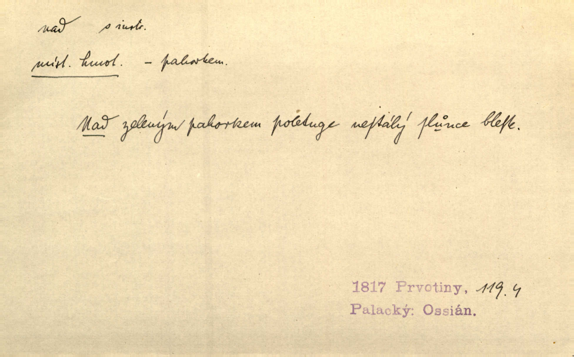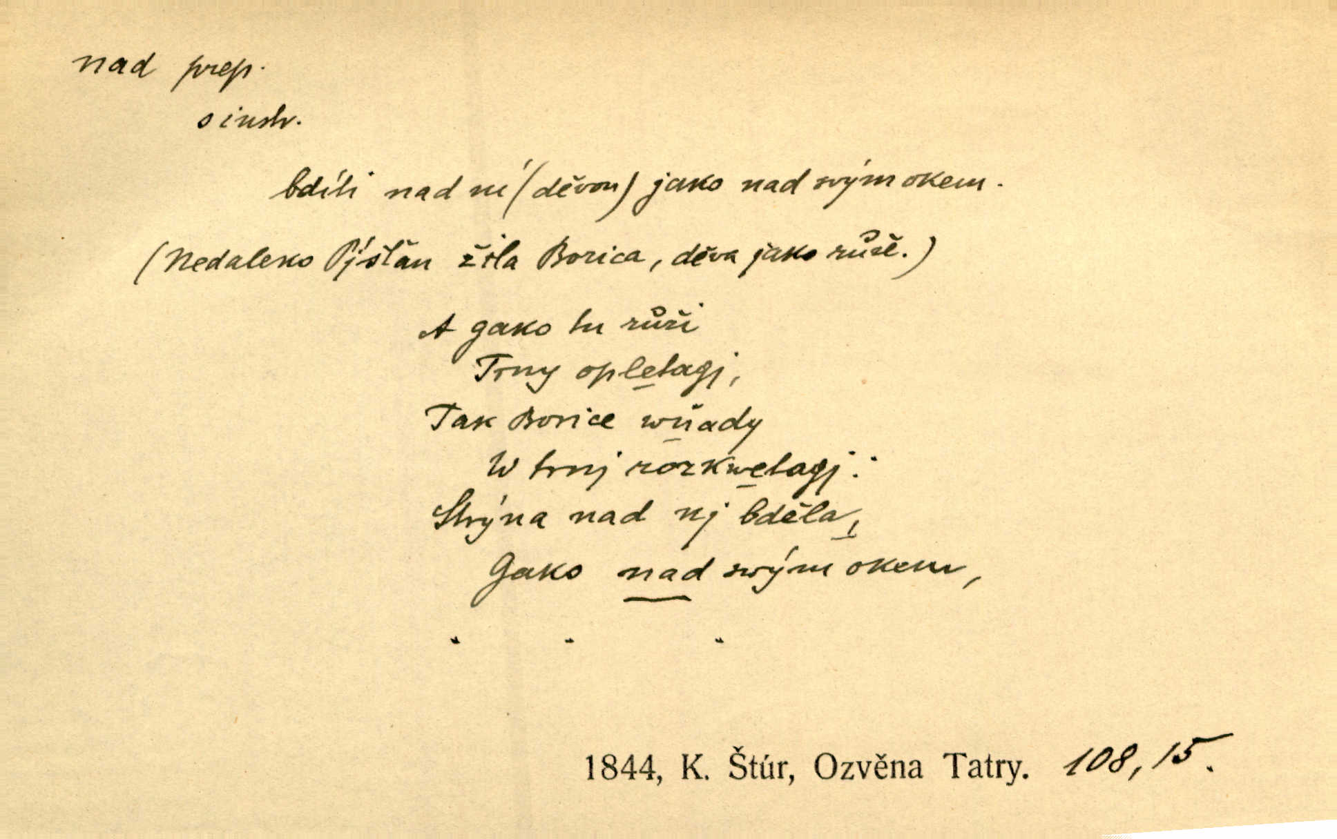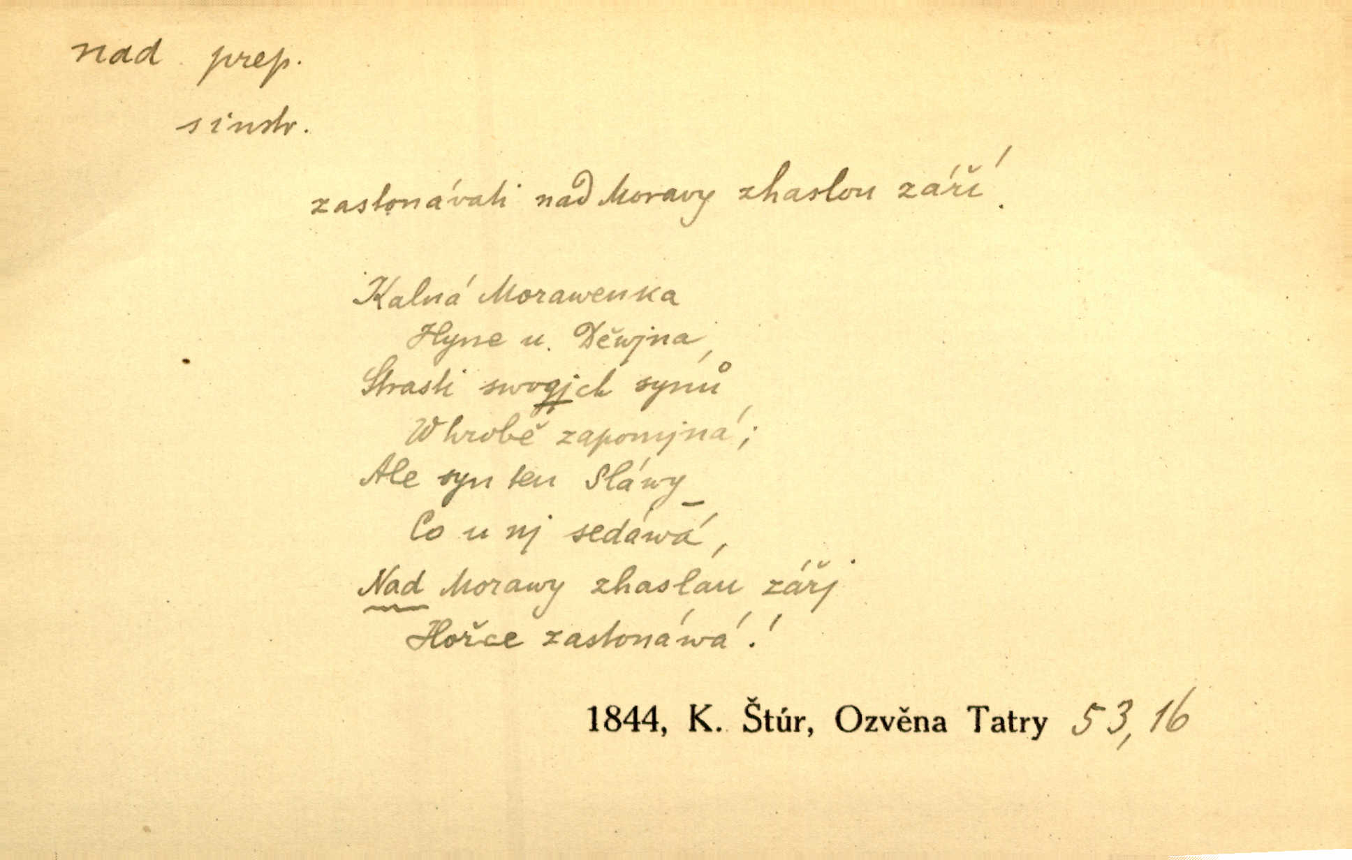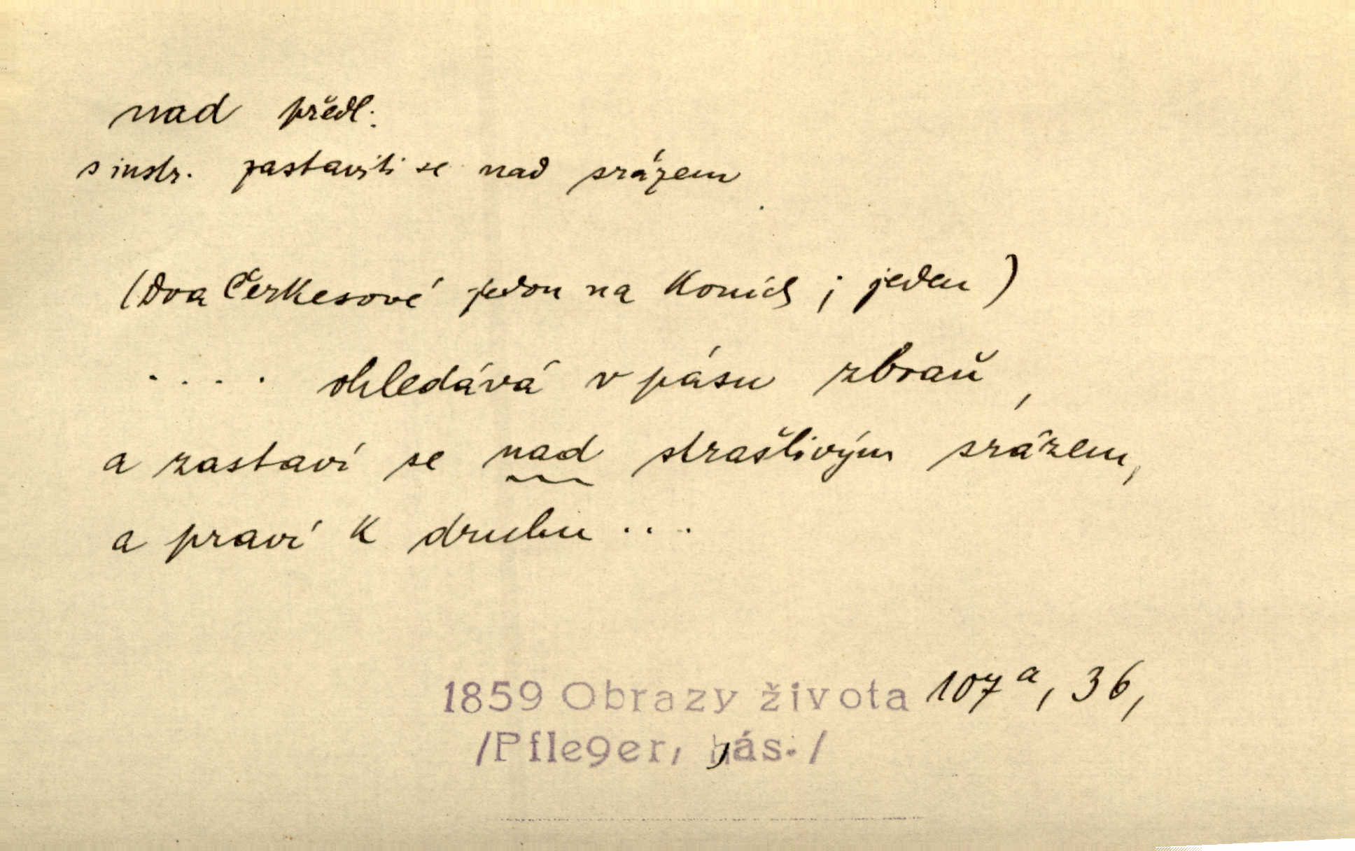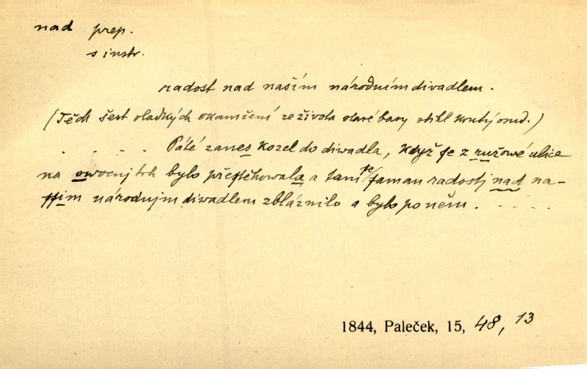 - nad předl. s akus. vyjadřuje místo položené výše než někdo n. něco, k němuž děj nějaký směřuje. Slunce vyšlo nad horu. Čel. Vynořila se nad houštinu hlava s mocnýma parohama. Jir. Jeho vysoká postava vyniká nad všechny ostatní. Něm. Nahnula se nad jeho obličej. Něm. Rybičky vyskakovaly nad vodu. Prav. Nad dědinu snášel se vlažný večer. Herb. Pod kolenama až nad lejtka leskly se mu bílé punčochy. Tyl. Venku je bláta nad kotníky! Rub. Ruce, až nad loket obnažené. Šim. Nenosil tak vysoké boty až nad kolena. Něm. Stárneme, děti nám rostou nad hlavu vymaňují se z našeho vlivu. Čap. Ch. Když ono, pane, je té práce u nás až nad hlavu přespříliš. Rais. D vyjadřuje to, co je n. není předstihováno, předstiženo, překonáno něčím jiným. Ujímati se vdov a sirotků — to je skutek nad všeliké dobré skutky. Baar. Dobrá rada nad zlato. Přísl. On je vám chytrý nad žida. Něm. Mijoval ji vášnivě, nad Márinku nebylo. Štol. Tvá žena že je nad mou, ty kluku? Kosm. Nad vás není, slečno Viki — v celé Praze by druhou takovou hospodyni nenašel. Šim. Básník byl v něm [Stendhalovi] nad psychologa. Šal. Říkávají, že nebývá nad lásku mateřskou a nad péči otcovskou! Třeb. Odvětila tónem, z něhož vyznívalo, že je daleko povýšena nad všechny narážky. Šim. Chleba tvrdší nad oblásky. Ner. Věci nad slunce jasnější nesměly být vyslovovány. Herb. Vám, dětí našich milé pěstitelky, dán úkol krásný a nad jiné velký. Ner. Není pod sluncem tvora podlejšího nad člověka. Bozd. Můj starý přítel, nade všechny milovaný. Us. Bývala [dcera] otci nade všecko drahá. Svět. [Domek] svým zevnějškem nad jiné vynikal. Jir. Nevypínali se jeden nad druhého. Prav. V trpělivosti předčí [lid český] i nad samy mravence. Šmil. Tvoje ústa malá voní nad jabloně květ. Čech. Křičel chraptivě nad síly svých hlasivek. R. Svob. Já musel pořád žít nad své poměry nákladněji, než postavení dovolovalo. Čap. Paní Johanka nad slušnosť a míru rozhazovala více, než se slušelo a patřilo. Šmil. Rány hojily se nad očekávání rychle nezvykle, neobyčejně. Jir. Nad pomyšlení rozveselen svolal všecku čeleď. Ehrenb. Ulice oživly již za té ranní doby nad obyčej neobyčejně. Jir. Že se řádně zmácháte, jest nade vši pochybnost nepochybné. Ehrenb. Častěji sem chodil a nad potřebu dlouho tu prodléval zbytečně. Vrba. D s opakovaným substantivem vyjadřuje zesilování, stupňování. Div nad div! Verunka pronesla jen několik slov, ale ta slova zaryla se mu do duše. Šmil. Zmatek nad zmatek vládne v jeho [lidstva] hlavách. Baar. Marnosť nad marnosť, všecko je marnosť. Vrch. No je to radost nad radost. Ner. Psávaly jsme nesmysly nad nesmysly. Krás. Jsem konečně i sobec nad sobce, který by rád se něčeho dobádal. Kos. D nad to připojuje (často s důrazem) k tomu, co již bylo řečeno, něco nového. Nestačil svou pravicí, aby odnesl těžkého muže ve zbroji a nad to bez vlády omdlelého. Jir. Vedl si vesele, miloval zábavy i společnost. Nad to byl postavy krásné. Jir. [Hoch] nemá schopností a je nad to ještě darebákem. Ner. D Dial. nad lidi mezi lidi, před lidmi. Všímám si jenom svého, nikam nad lidi nevyjdu. Rais. Nemusíme to snad o polednách nade všecky lidi odnášet, brousí to pak po člověku a pomlouvají. Rais. Já mu do ničeho mluvit nesmím, protože potom spustí nad lidi a je mi hanba. Rais. D předl. s instr. vyjadřuje místo položené směrem vzhůru od někoho n. od něčeho, na němž něco je n. se děje. A lampa ještě hořela, co nad klekadlem visela. Erb. Povstala, spráskla ruce nad hlavou. Čap. Ch. Konci prstů přejížděla po vlasech nad skráněmi. Šim. Mysli se nejvýš — a nad tebou hvězd jako vřesných zvonců. Ner. Obloha nad západem zeleněla. Mrš. Nad sněhem juž první skřivan zpíval. Vrch. Chef nad rozloženými plány vykládal o turbině. Čap. Ch. Protrhl se rybník, co byl výše nad vesnicí. Jir. Nad Otavou leží z větších měst také ještě Horažďovice, Sušice, Písek při Otavě. Šim. Geom. opsati kružnici nad průměrem tak ji nakresliti, že daná úsečka se stane průměrem kružnice. D vyjadřuje osobu n. věc podléhající vlivu, převaze, moci, právu někoho n. něčeho. Vždyť nemusí našinec nad sebou chefa trpěti. Krás. Klidně chci očekávat, jakkoli nebe nade mnou rozhodne. Zey. Odpoledne už zase stál nad lidmi v kamenných lomech dozíral. A. Mrš. Jak bůh nade mnou, čirou mluvím pravdu. Šmil. Vyniká [rek] nad ostatní silou. Durd. Ctibor silou svojí zvítězil nad jedním německým rytířem, nad kterým nikdo zvítězit nemohl. Něm. Nabyv ledové chladnosti, dovedl jí vládnouti nad jinými. Pfleg. Bystré oko lesníkovo nad lesy bdíti počalo. Lum. Nikdo nežárlil, že jemu nebylo svěřeno poručnictví nad Mařenkou. Podl. Nakupování, vaření, rozdělování — nad tím jsem já zas ministr to mám na péči, to mně přísluší. Šim. D s opakovaným substativem vyjadřuje zesilování, stupňování. Což dím, ó marnost nad marností! Jg. Máme místo konstituce zmatek nad zmatkem. Havl. D vyjadřuje příčinu duševního, zejm. citového rozpoložení. Radost nad shledáním dvou milých jí lidí popoháněla ji [babičku] tam. Něm. Otázal se hlasem, nad nímž jej sama zamrazilo. Čap. Ch. Utrápil se nad darebným synem. Ner. My nad ní [dcerou] starostí sešedivíme! R. Svob. Kdo se neslituje nad dítětem, není dětí hoden. Hál. Když je [lívanečky] přinášela, strnul jsem nad jejich množstvím. Šim. Obec se sama nad sebou zapomíná — a jako žebráci o almužnu se sváříte. Baar. Zadumal se nad tím slovem. Zey. Sám pánbůh blažen se nad námi usmíval. Ner.