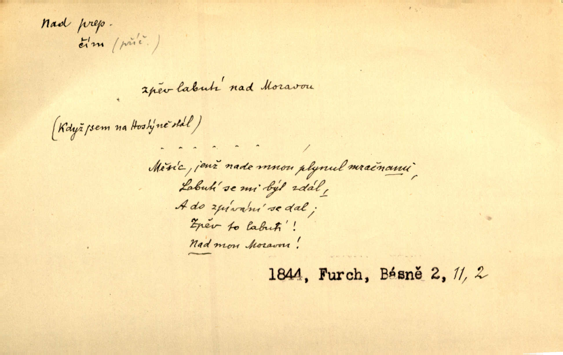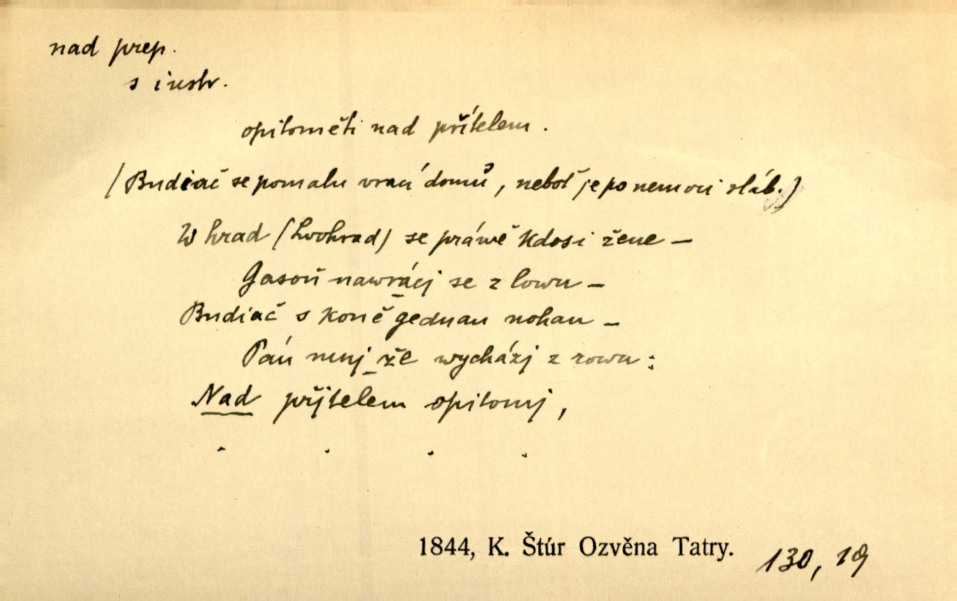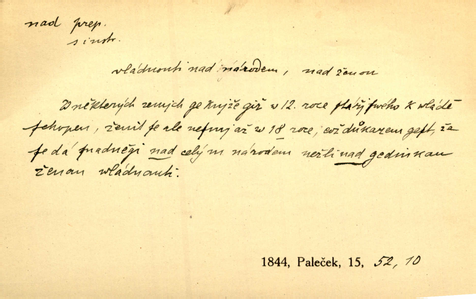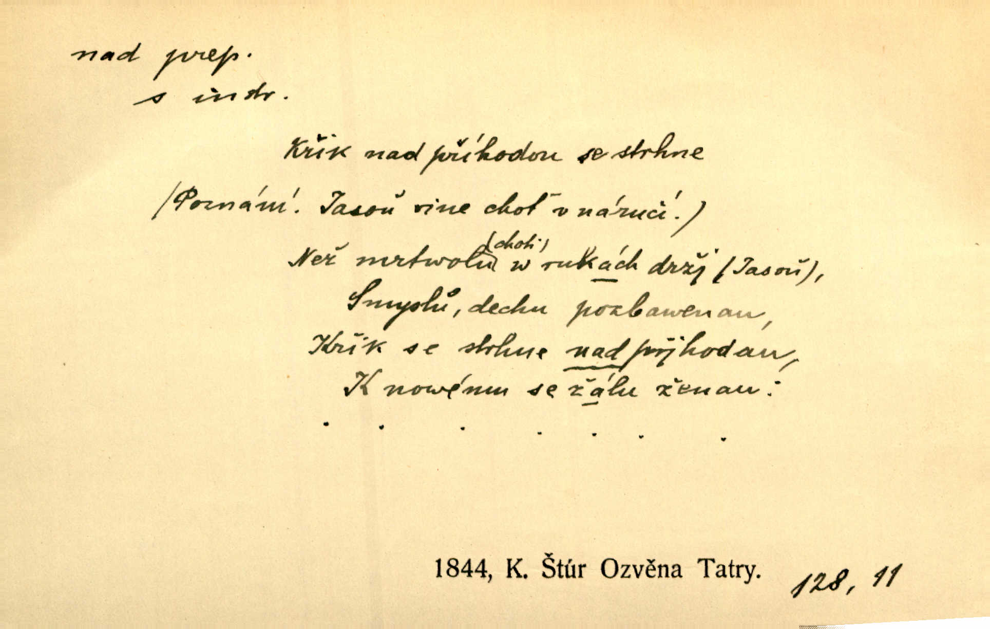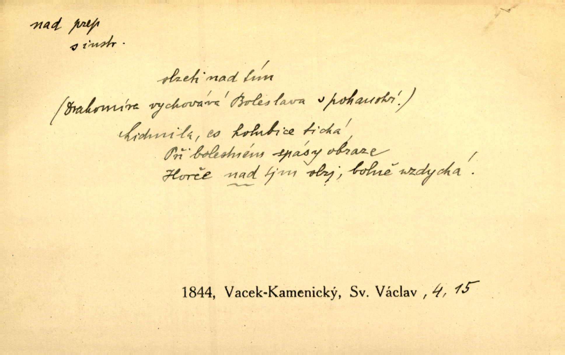 - nad předl. s akus. vyjadřuje místo položené výše než někdo n. něco, k němuž děj nějaký směřuje. Slunce vyšlo nad horu. Čel. Vynořila se nad houštinu hlava s mocnýma parohama. Jir. Jeho vysoká postava vyniká nad všechny ostatní. Něm. Nahnula se nad jeho obličej. Něm. Rybičky vyskakovaly nad vodu. Prav. Nad dědinu snášel se vlažný večer. Herb. Pod kolenama až nad lejtka leskly se mu bílé punčochy. Tyl. Venku je bláta nad kotníky! Rub. Ruce, až nad loket obnažené. Šim. Nenosil tak vysoké boty až nad kolena. Něm. Stárneme, děti nám rostou nad hlavu vymaňují se z našeho vlivu. Čap. Ch. Když ono, pane, je té práce u nás až nad hlavu přespříliš. Rais. D vyjadřuje to, co je n. není předstihováno, předstiženo, překonáno něčím jiným. Ujímati se vdov a sirotků — to je skutek nad všeliké dobré skutky. Baar. Dobrá rada nad zlato. Přísl. On je vám chytrý nad žida. Něm. Mijoval ji vášnivě, nad Márinku nebylo. Štol. Tvá žena že je nad mou, ty kluku? Kosm. Nad vás není, slečno Viki — v celé Praze by druhou takovou hospodyni nenašel. Šim. Básník byl v něm [Stendhalovi] nad psychologa. Šal. Říkávají, že nebývá nad lásku mateřskou a nad péči otcovskou! Třeb. Odvětila tónem, z něhož vyznívalo, že je daleko povýšena nad všechny narážky. Šim. Chleba tvrdší nad oblásky. Ner. Věci nad slunce jasnější nesměly být vyslovovány. Herb. Vám, dětí našich milé pěstitelky, dán úkol krásný a nad jiné velký. Ner. Není pod sluncem tvora podlejšího nad člověka. Bozd. Můj starý přítel, nade všechny milovaný. Us. Bývala [dcera] otci nade všecko drahá. Svět. [Domek] svým zevnějškem nad jiné vynikal. Jir. Nevypínali se jeden nad druhého. Prav. V trpělivosti předčí [lid český] i nad samy mravence. Šmil. Tvoje ústa malá voní nad jabloně květ. Čech. Křičel chraptivě nad síly svých hlasivek. R. Svob. Já musel pořád žít nad své poměry nákladněji, než postavení dovolovalo. Čap. Paní Johanka nad slušnosť a míru rozhazovala více, než se slušelo a patřilo. Šmil. Rány hojily se nad očekávání rychle nezvykle, neobyčejně. Jir. Nad pomyšlení rozveselen svolal všecku čeleď. Ehrenb. Ulice oživly již za té ranní doby nad obyčej neobyčejně. Jir. Že se řádně zmácháte, jest nade vši pochybnost nepochybné. Ehrenb. Častěji sem chodil a nad potřebu dlouho tu prodléval zbytečně. Vrba. D s opakovaným substantivem vyjadřuje zesilování, stupňování. Div nad div! Verunka pronesla jen několik slov, ale ta slova zaryla se mu do duše. Šmil. Zmatek nad zmatek vládne v jeho [lidstva] hlavách. Baar. Marnosť nad marnosť, všecko je marnosť. Vrch. No je to radost nad radost. Ner. Psávaly jsme nesmysly nad nesmysly. Krás. Jsem konečně i sobec nad sobce, který by rád se něčeho dobádal. Kos. D nad to připojuje (často s důrazem) k tomu, co již bylo řečeno, něco nového. Nestačil svou pravicí, aby odnesl těžkého muže ve zbroji a nad to bez vlády omdlelého. Jir. Vedl si vesele, miloval zábavy i společnost. Nad to byl postavy krásné. Jir. [Hoch] nemá schopností a je nad to ještě darebákem. Ner. D Dial. nad lidi mezi lidi, před lidmi. Všímám si jenom svého, nikam nad lidi nevyjdu. Rais. Nemusíme to snad o polednách nade všecky lidi odnášet, brousí to pak po člověku a pomlouvají. Rais. Já mu do ničeho mluvit nesmím, protože potom spustí nad lidi a je mi hanba. Rais. D předl. s instr. vyjadřuje místo položené směrem vzhůru od někoho n. od něčeho, na němž něco je n. se děje. A lampa ještě hořela, co nad klekadlem visela. Erb. Povstala, spráskla ruce nad hlavou. Čap. Ch. Konci prstů přejížděla po vlasech nad skráněmi. Šim. Mysli se nejvýš — a nad tebou hvězd jako vřesných zvonců. Ner. Obloha nad západem zeleněla. Mrš. Nad sněhem juž první skřivan zpíval. Vrch. Chef nad rozloženými plány vykládal o turbině. Čap. Ch. Protrhl se rybník, co byl výše nad vesnicí. Jir. Nad Otavou leží z větších měst také ještě Horažďovice, Sušice, Písek při Otavě. Šim. Geom. opsati kružnici nad průměrem tak ji nakresliti, že daná úsečka se stane průměrem kružnice. D vyjadřuje osobu n. věc podléhající vlivu, převaze, moci, právu někoho n. něčeho. Vždyť nemusí našinec nad sebou chefa trpěti. Krás. Klidně chci očekávat, jakkoli nebe nade mnou rozhodne. Zey. Odpoledne už zase stál nad lidmi v kamenných lomech dozíral. A. Mrš. Jak bůh nade mnou, čirou mluvím pravdu. Šmil. Vyniká [rek] nad ostatní silou. Durd. Ctibor silou svojí zvítězil nad jedním německým rytířem, nad kterým nikdo zvítězit nemohl. Něm. Nabyv ledové chladnosti, dovedl jí vládnouti nad jinými. Pfleg. Bystré oko lesníkovo nad lesy bdíti počalo. Lum. Nikdo nežárlil, že jemu nebylo svěřeno poručnictví nad Mařenkou. Podl. Nakupování, vaření, rozdělování — nad tím jsem já zas ministr to mám na péči, to mně přísluší. Šim. D s opakovaným substativem vyjadřuje zesilování, stupňování. Což dím, ó marnost nad marností! Jg. Máme místo konstituce zmatek nad zmatkem. Havl. D vyjadřuje příčinu duševního, zejm. citového rozpoložení. Radost nad shledáním dvou milých jí lidí popoháněla ji [babičku] tam. Něm. Otázal se hlasem, nad nímž jej sama zamrazilo. Čap. Ch. Utrápil se nad darebným synem. Ner. My nad ní [dcerou] starostí sešedivíme! R. Svob. Kdo se neslituje nad dítětem, není dětí hoden. Hál. Když je [lívanečky] přinášela, strnul jsem nad jejich množstvím. Šim. Obec se sama nad sebou zapomíná — a jako žebráci o almužnu se sváříte. Baar. Zadumal se nad tím slovem. Zey. Sám pánbůh blažen se nad námi usmíval. Ner.