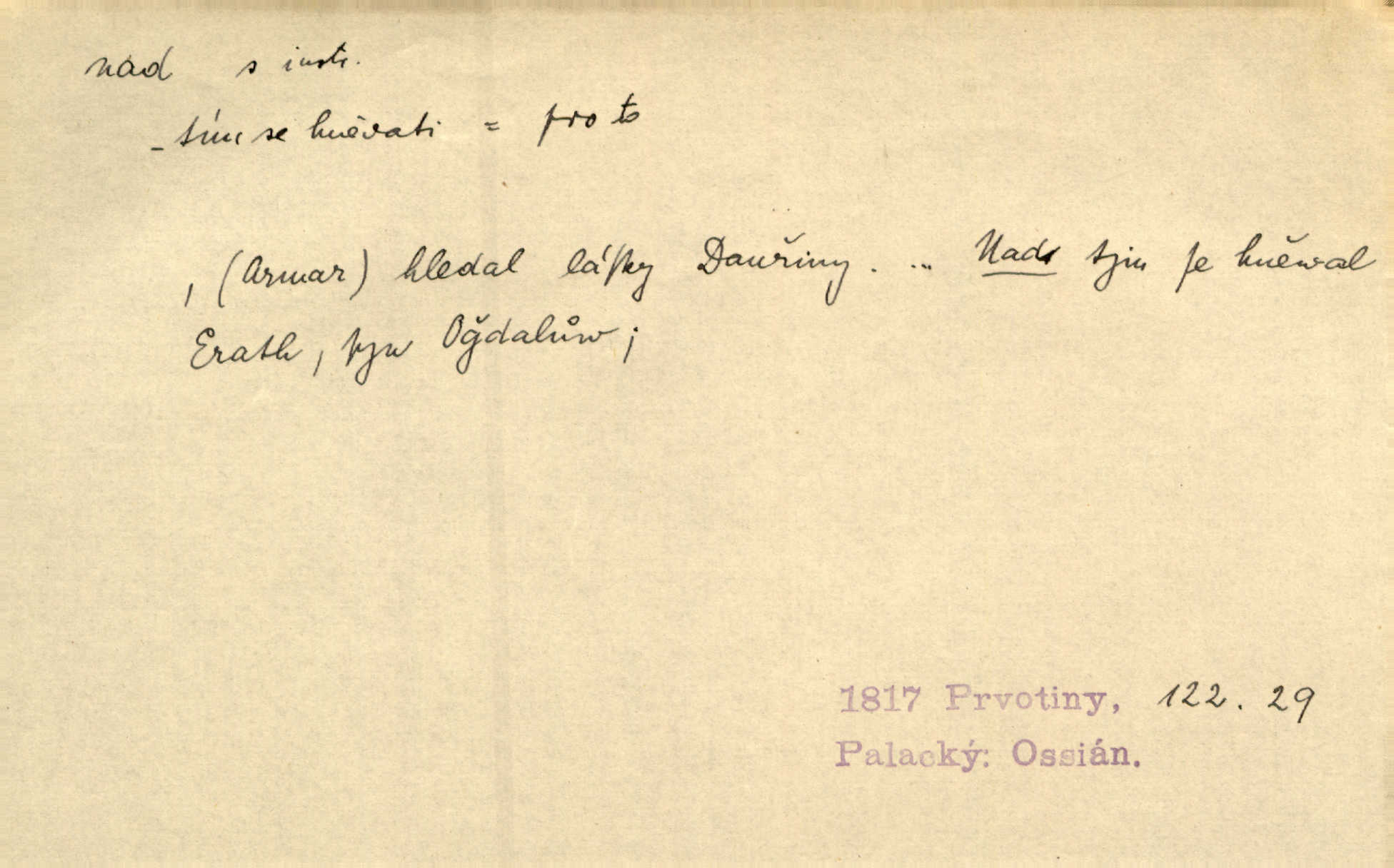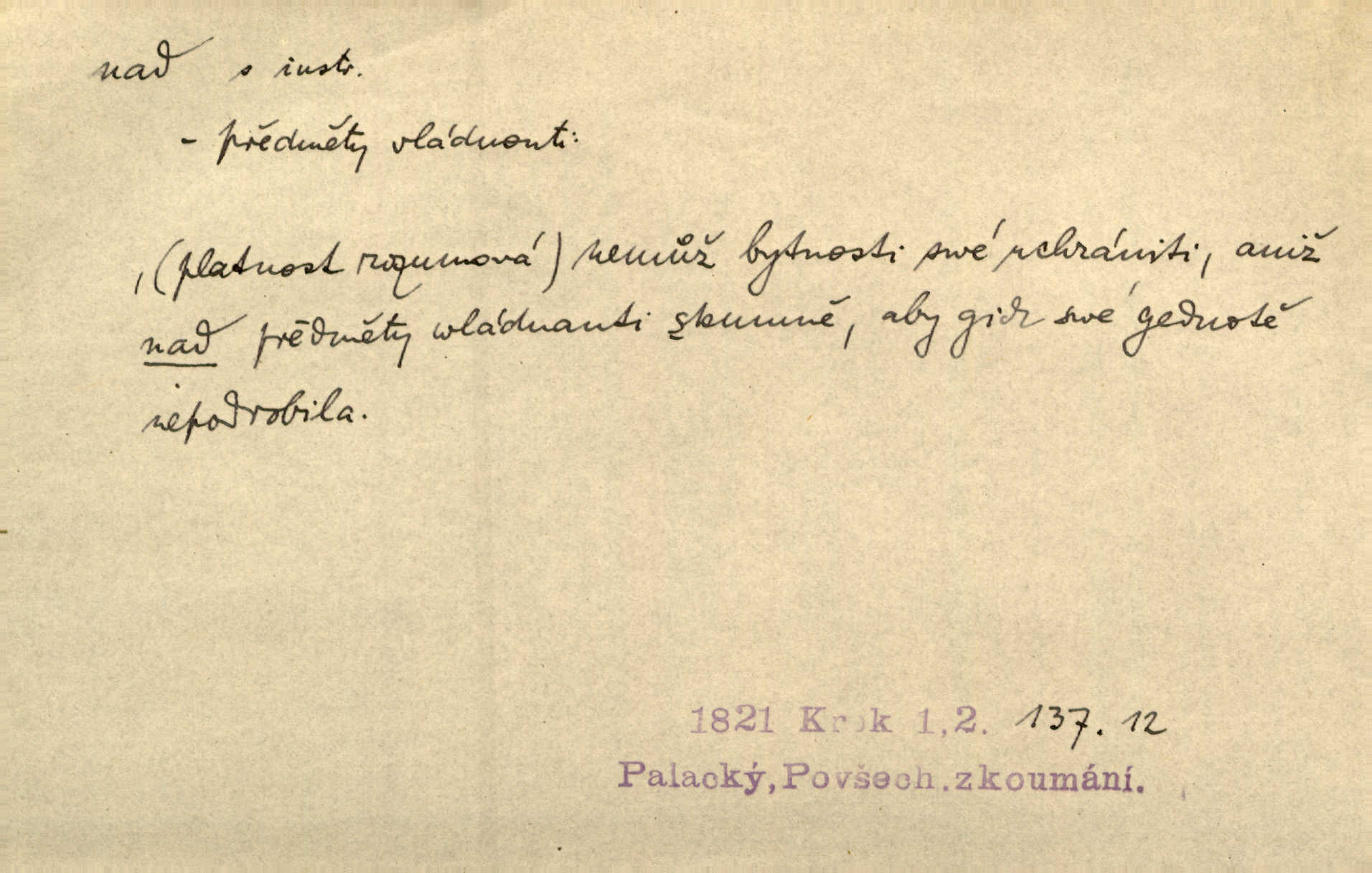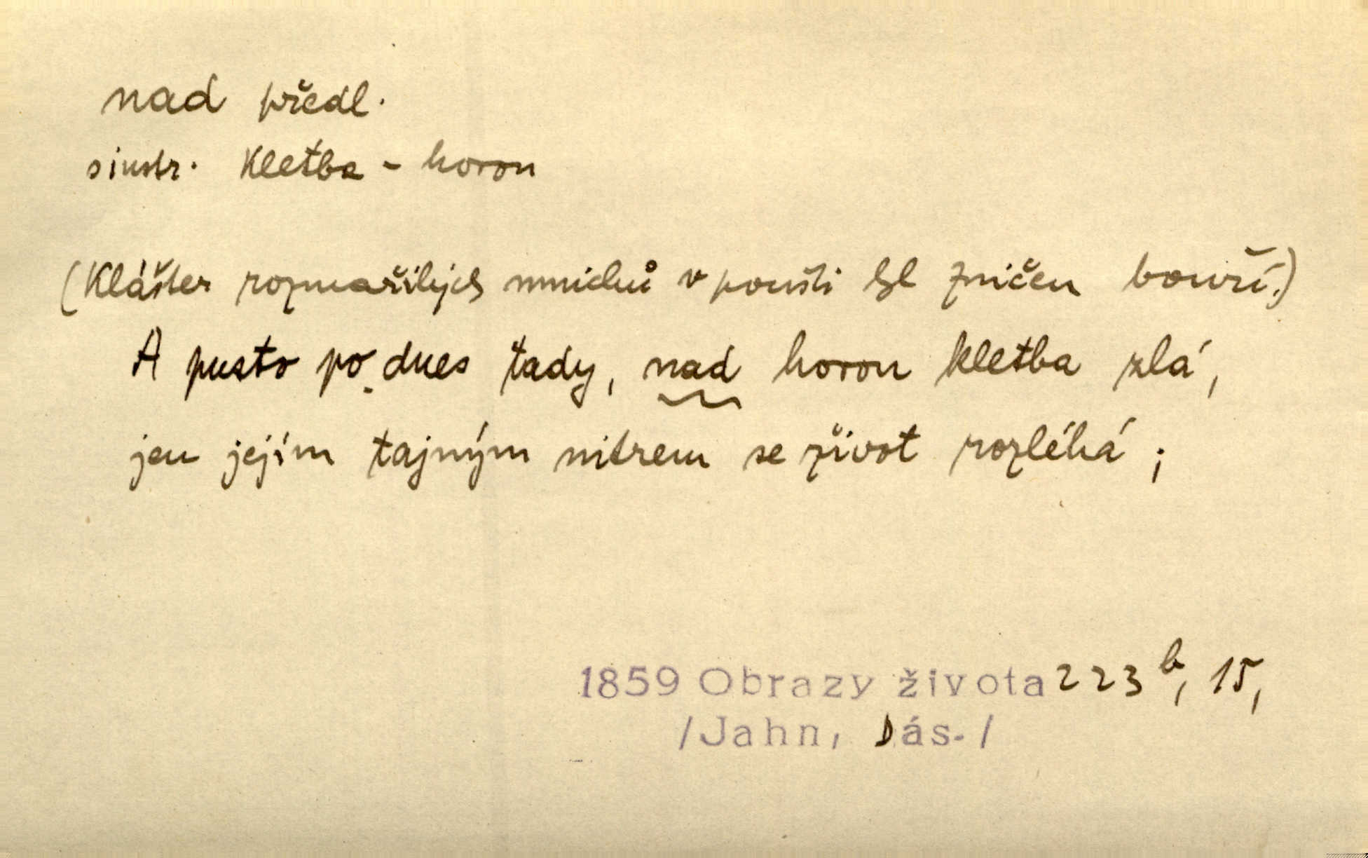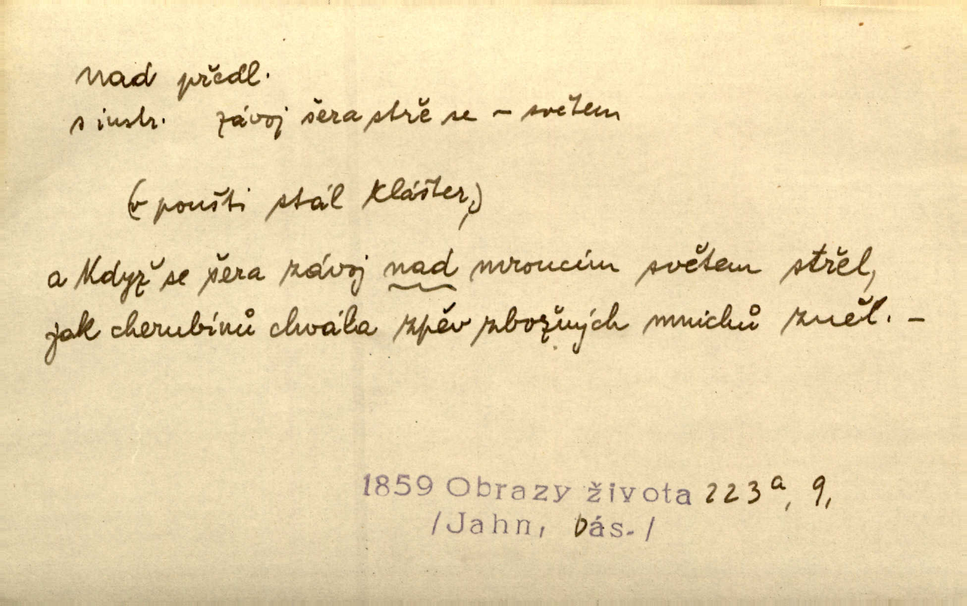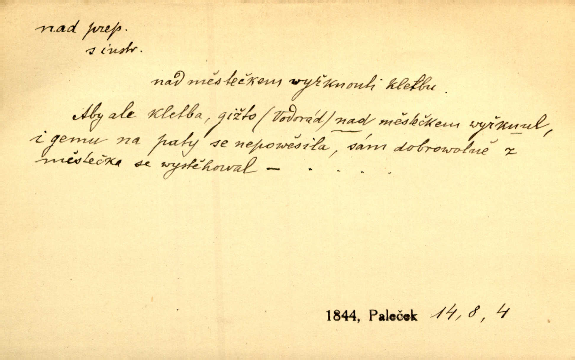 - nad předl. s akus. vyjadřuje místo položené výše než někdo n. něco, k němuž děj nějaký směřuje. Slunce vyšlo nad horu. Čel. Vynořila se nad houštinu hlava s mocnýma parohama. Jir. Jeho vysoká postava vyniká nad všechny ostatní. Něm. Nahnula se nad jeho obličej. Něm. Rybičky vyskakovaly nad vodu. Prav. Nad dědinu snášel se vlažný večer. Herb. Pod kolenama až nad lejtka leskly se mu bílé punčochy. Tyl. Venku je bláta nad kotníky! Rub. Ruce, až nad loket obnažené. Šim. Nenosil tak vysoké boty až nad kolena. Něm. Stárneme, děti nám rostou nad hlavu vymaňují se z našeho vlivu. Čap. Ch. Když ono, pane, je té práce u nás až nad hlavu přespříliš. Rais. D vyjadřuje to, co je n. není předstihováno, předstiženo, překonáno něčím jiným. Ujímati se vdov a sirotků — to je skutek nad všeliké dobré skutky. Baar. Dobrá rada nad zlato. Přísl. On je vám chytrý nad žida. Něm. Mijoval ji vášnivě, nad Márinku nebylo. Štol. Tvá žena že je nad mou, ty kluku? Kosm. Nad vás není, slečno Viki — v celé Praze by druhou takovou hospodyni nenašel. Šim. Básník byl v něm [Stendhalovi] nad psychologa. Šal. Říkávají, že nebývá nad lásku mateřskou a nad péči otcovskou! Třeb. Odvětila tónem, z něhož vyznívalo, že je daleko povýšena nad všechny narážky. Šim. Chleba tvrdší nad oblásky. Ner. Věci nad slunce jasnější nesměly být vyslovovány. Herb. Vám, dětí našich milé pěstitelky, dán úkol krásný a nad jiné velký. Ner. Není pod sluncem tvora podlejšího nad člověka. Bozd. Můj starý přítel, nade všechny milovaný. Us. Bývala [dcera] otci nade všecko drahá. Svět. [Domek] svým zevnějškem nad jiné vynikal. Jir. Nevypínali se jeden nad druhého. Prav. V trpělivosti předčí [lid český] i nad samy mravence. Šmil. Tvoje ústa malá voní nad jabloně květ. Čech. Křičel chraptivě nad síly svých hlasivek. R. Svob. Já musel pořád žít nad své poměry nákladněji, než postavení dovolovalo. Čap. Paní Johanka nad slušnosť a míru rozhazovala více, než se slušelo a patřilo. Šmil. Rány hojily se nad očekávání rychle nezvykle, neobyčejně. Jir. Nad pomyšlení rozveselen svolal všecku čeleď. Ehrenb. Ulice oživly již za té ranní doby nad obyčej neobyčejně. Jir. Že se řádně zmácháte, jest nade vši pochybnost nepochybné. Ehrenb. Častěji sem chodil a nad potřebu dlouho tu prodléval zbytečně. Vrba. D s opakovaným substantivem vyjadřuje zesilování, stupňování. Div nad div! Verunka pronesla jen několik slov, ale ta slova zaryla se mu do duše. Šmil. Zmatek nad zmatek vládne v jeho [lidstva] hlavách. Baar. Marnosť nad marnosť, všecko je marnosť. Vrch. No je to radost nad radost. Ner. Psávaly jsme nesmysly nad nesmysly. Krás. Jsem konečně i sobec nad sobce, který by rád se něčeho dobádal. Kos. D nad to připojuje (často s důrazem) k tomu, co již bylo řečeno, něco nového. Nestačil svou pravicí, aby odnesl těžkého muže ve zbroji a nad to bez vlády omdlelého. Jir. Vedl si vesele, miloval zábavy i společnost. Nad to byl postavy krásné. Jir. [Hoch] nemá schopností a je nad to ještě darebákem. Ner. D Dial. nad lidi mezi lidi, před lidmi. Všímám si jenom svého, nikam nad lidi nevyjdu. Rais. Nemusíme to snad o polednách nade všecky lidi odnášet, brousí to pak po člověku a pomlouvají. Rais. Já mu do ničeho mluvit nesmím, protože potom spustí nad lidi a je mi hanba. Rais. D předl. s instr. vyjadřuje místo položené směrem vzhůru od někoho n. od něčeho, na němž něco je n. se děje. A lampa ještě hořela, co nad klekadlem visela. Erb. Povstala, spráskla ruce nad hlavou. Čap. Ch. Konci prstů přejížděla po vlasech nad skráněmi. Šim. Mysli se nejvýš — a nad tebou hvězd jako vřesných zvonců. Ner. Obloha nad západem zeleněla. Mrš. Nad sněhem juž první skřivan zpíval. Vrch. Chef nad rozloženými plány vykládal o turbině. Čap. Ch. Protrhl se rybník, co byl výše nad vesnicí. Jir. Nad Otavou leží z větších měst také ještě Horažďovice, Sušice, Písek při Otavě. Šim. Geom. opsati kružnici nad průměrem tak ji nakresliti, že daná úsečka se stane průměrem kružnice. D vyjadřuje osobu n. věc podléhající vlivu, převaze, moci, právu někoho n. něčeho. Vždyť nemusí našinec nad sebou chefa trpěti. Krás. Klidně chci očekávat, jakkoli nebe nade mnou rozhodne. Zey. Odpoledne už zase stál nad lidmi v kamenných lomech dozíral. A. Mrš. Jak bůh nade mnou, čirou mluvím pravdu. Šmil. Vyniká [rek] nad ostatní silou. Durd. Ctibor silou svojí zvítězil nad jedním německým rytířem, nad kterým nikdo zvítězit nemohl. Něm. Nabyv ledové chladnosti, dovedl jí vládnouti nad jinými. Pfleg. Bystré oko lesníkovo nad lesy bdíti počalo. Lum. Nikdo nežárlil, že jemu nebylo svěřeno poručnictví nad Mařenkou. Podl. Nakupování, vaření, rozdělování — nad tím jsem já zas ministr to mám na péči, to mně přísluší. Šim. D s opakovaným substativem vyjadřuje zesilování, stupňování. Což dím, ó marnost nad marností! Jg. Máme místo konstituce zmatek nad zmatkem. Havl. D vyjadřuje příčinu duševního, zejm. citového rozpoložení. Radost nad shledáním dvou milých jí lidí popoháněla ji [babičku] tam. Něm. Otázal se hlasem, nad nímž jej sama zamrazilo. Čap. Ch. Utrápil se nad darebným synem. Ner. My nad ní [dcerou] starostí sešedivíme! R. Svob. Kdo se neslituje nad dítětem, není dětí hoden. Hál. Když je [lívanečky] přinášela, strnul jsem nad jejich množstvím. Šim. Obec se sama nad sebou zapomíná — a jako žebráci o almužnu se sváříte. Baar. Zadumal se nad tím slovem. Zey. Sám pánbůh blažen se nad námi usmíval. Ner.
